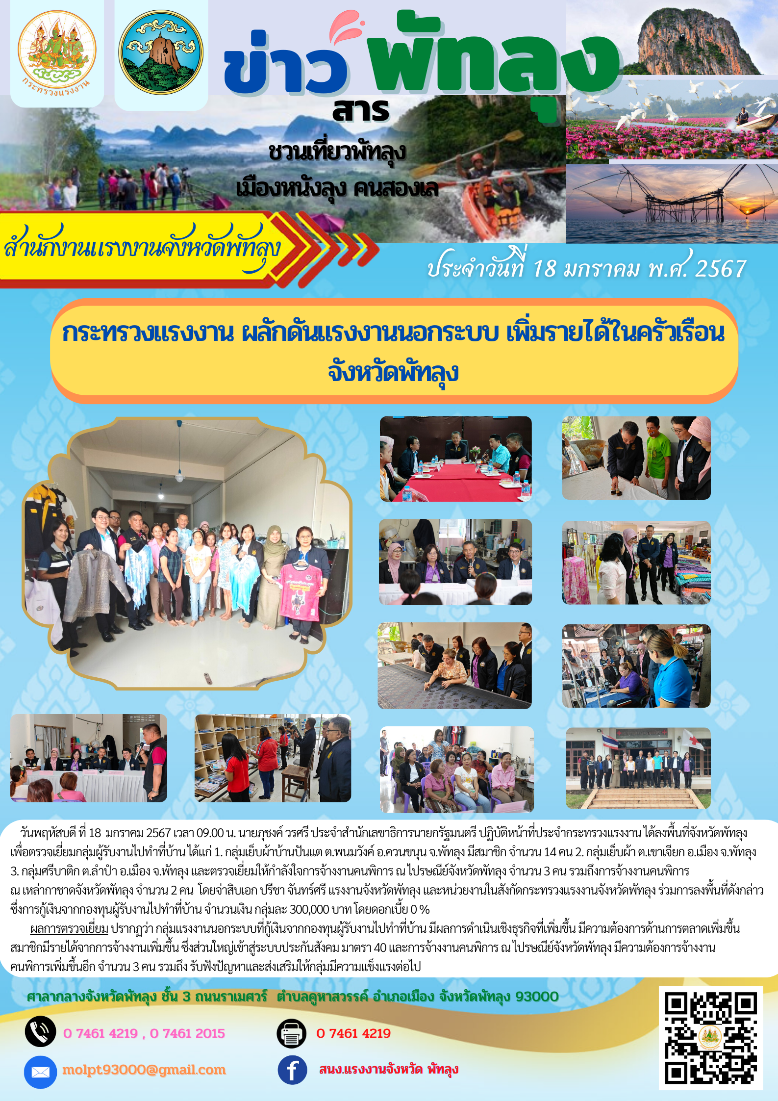 วันพฤหัสบดี ที่ 18 มกราคม 2567 เวลา 09.00 น. นายภุชงค์ วรศรี ประจำสำนักเลขาธิการนายกรัฐมนตรี ปฏิบัติหน้าที่ประจำกระทรวงแรงงาน ได้ลงพื้นที่จังหวัดพัทลุง เพื่อตรวจเยี่ยมกลุ่มผู้รับงานไปทำที่บ้าน ได้แก่ 1. กลุ่มเย็บผ้าบ้านปันแต ต.พนมวังค์ อ.ควนขนุน จ.พัทลุง มีสมาชิก จำนวน 14 คน 2. กลุ่มเย็บผ้า ต.เขาเจียก อ.เมือง จ.พัทลุง 3. กลุ่มศรีบาติก ต.ลำปำ อ.เมือง จ.พัทลุง และตรวจเยี่ยมให้กำลังใจการจ้างงานคนพิการ ณ ไปรษณีย์จังหวัดพัทลุง จำนวน 3 คน รวมถึงการจ้างงานคนพิการ ณ เหล่ากาชาดจังหวัดพัทลุง จำนวน 2 คน โดยจ่าสิบเอก ปรีชา จันทร์ศรี แรงงานจังหวัดพัทลุง และหน่วยงานในสังกัดกระทรวงแรงงานจังหวัดพัทลุง ร่วมการลงพื้นที่ดังกล่าว ซึ่งการกู้เงินจากกองทุนผู้รับงานไปทำที่บ้าน จำนวนเงิน กลุ่มละ 300,000 บาท โดยดอกเบี้ย 0 % ผลการตรวจเยี่ยม ปรากฏว่า กลุ่มแรงงานนอกระบบที่กู้เงินจากกองทุนผู้รับงานไปทำที่บ้าน มีผลการดำเนินเชิงธุรกิจที่เพิ่มขึ้น มีความต้องการด้านการตลาดเพิ่มขึ้น สมาชิกมีรายได้จากการจ้างงานเพิ่มขึ้น ซึ่งส่วนใหญ่เข้าสู่ระบบประกันสังคม มาตรา 40 และการจ้างงานคนพิการ ณ ไปรษณีย์จังหวัดพัทลุง มีความต้องการจ้างงาน คนพิการเพิ่มขึ้นอีก จำนวน 3 คน รวมถึง รับฟังปัญหาและส่งเสริมให้กลุ่มมีความแข็งแรงต่อไป