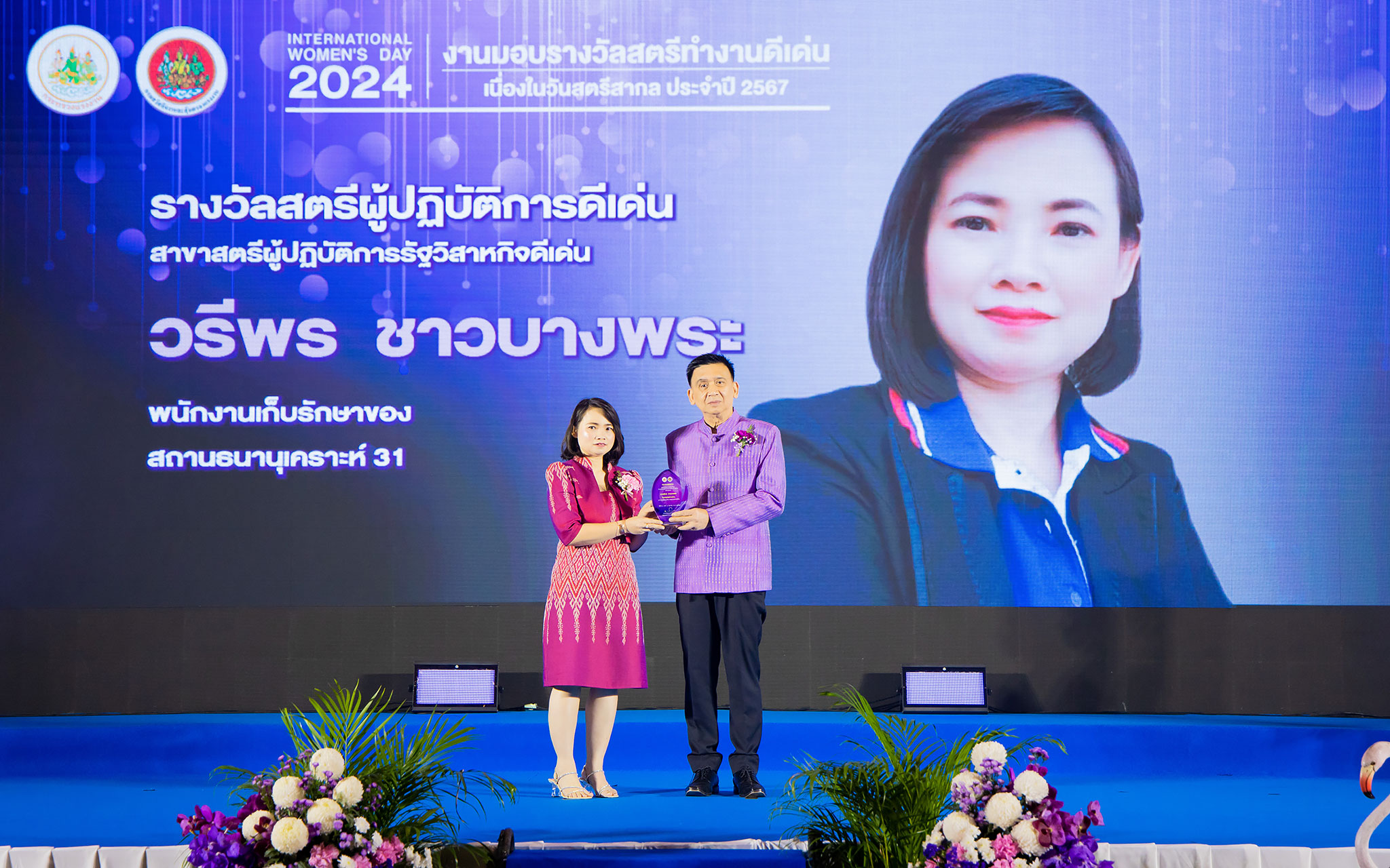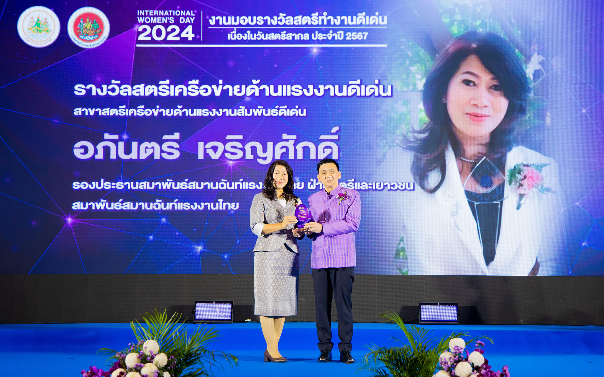 ด้านนางโสภา เกียรตินิรชา อธิบดีกรมสวัสดิการและคุ้มครองแรงงาน กล่าวเพิ่มเติมว่า งานมอบรางวัล สตรีทำงานดีเด่น เนื่องในวันสตรีสากล ประจำปี 2567 นี้ จัดขึ้นภายใต้แนวคิด “แรงงานสตรีสร้างความเสมอภาคและการทำงานที่มีคุณค่า พัฒนาเศรษฐกิจดิจิทัล” เพื่อกระตุ้นให้ทุกภาคส่วนตระหนักถึงความสำคัญของสตรีทำงาน และร่วมส่งเสริมให้สตรีได้รับการปฏิบัติอย่างเป็นธรรมและเท่าเทียม ได้รับสิทธิประโยชน์จากการจ้างงาน และสวัสดิการแรงงานที่เหมาะสม และเพื่อยกย่องเชิดชูเกียรติสตรีทำงานดีเด่น โดยในปีนี้มีสตรีได้รับการคัดเลือกให้เป็นสตรีทำงานดีเด่น จำนวน 31 คน จาก 8 ประเภทรางวัล อาทิ สตรีนักบริหารดีเด่น ได้แก่ แพทย์หญิงวันทนีย์ วัฒนะ ปลัดกรุงเทพมหานคร นางสาวธิดาพร มีกิ่งทอง รองกรรมการผู้จัดการ ธนาคารอาคารสงเคราะห์ นางสาวนิรมล พลพิพัฒนพงศ์ กรรมการผู้จัดการ บริษัท ปริ๊นเซส ฟูดส์ จำกัด รางวัลสตรีผู้ปฏิบัติการดีเด่น ได้แก่ นางสาวรีพร ชาวบางพระ พนักงานเก็บรักษาของ สถานธนานุเคราะห์ 31 รางวัลสตรีผู้ประกอบอาชีพอิสระดีเด่น ได้แก่ นางธาราพิมพ์ พิงทร ประธานกลุ่มพัฒนาสตรีตำบลประตูป่า จังหวัดลำพูน รางวัลศิลปินสตรีดีเด่น ได้แก่ นางสาวแอนโทเนีย โพซิ้ว และนางสาวพิชญทัฬห์ จันทร์พุฒ ผู้ประกาศข่าวช่อง 3 ได้รางวัลสื่อมวลชนสตรีดีเด่น