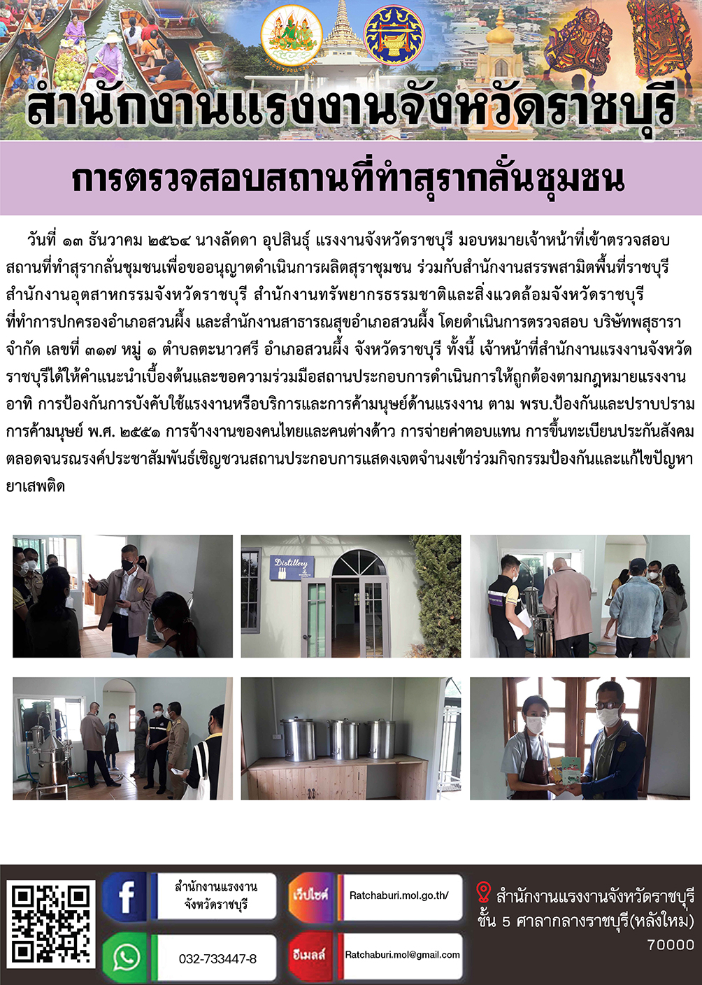 วันที่ ๑๓ ธันวาคม ๒๕๖๔ นางลัดดา อุปสินธุ์ แรงงานจังหวัดราชบุรี มอบหมายเจ้าหน้าที่เข้าตรวจสอบสถานที่ทำสุรากลั่นชุมชนเพื่อขออนุญาตดำเนินการผลิตสุราชุมชน ร่วมกับสำนักงานสรรพสามิตพื้นที่ราชบุรี สำนักงานอุตสาหกรรมจังหวัดราชบุรี สำนักงานทรัพยากรธรรมชาติและสิ่งแวดล้อมจังหวัดราชบุรี ที่ทำการปกครองอำเภอสวนผึ้ง และสำนักงานสาธารณสุขอำเภอสวนผึ้ง โดยดำเนินการตรวจสอบ บริษัทพสุธารา จำกัด เลขที่ ๓๑๗ หมู่ ๑ ตำบลตะนาวศรี อำเภอสวนผึ้ง จังหวัดราชบุรี ทั้งนี้ เจ้าหน้าที่สำนักงานแรงงานจังหวัดราชบุรีได้ให้คำแนะนำเบื้องต้นและขอความร่วมมือสถานประกอบการดำเนินการให้ถูกต้องตามกฎหมายแรงงาน อาทิ การป้องกันการบังคับใช้แรงงานหรือบริการและการค้ามนุษย์ด้านแรงงานตาม พรบ.ป้องกันและปราบปรามการค้ามนุษย์ พ.ศ. ๒๕๕๑ การจ้างงานของคนไทยและคนต่างด้าว การจ่ายค่าตอบแทนการขึ้นทะเบียนประกันสังคม ตลอดจนรณรงค์ประชาสัมพันธ์เชิญชวนสถานประกอบการแสดงเจตจำนงเข้าร่วมกิจกรรมป้องกันและแก้ไขปัญหายาเสพติด