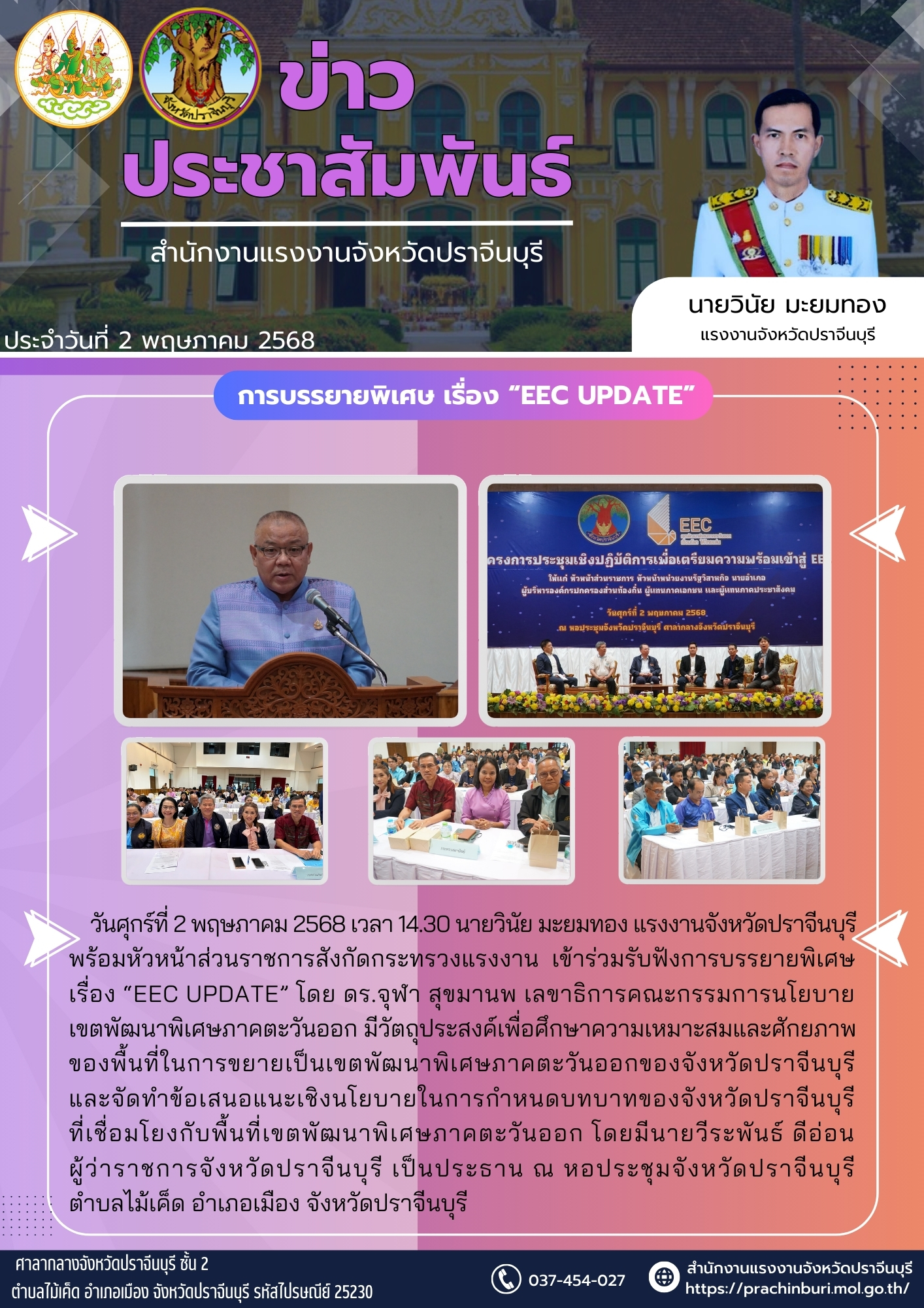 วันศุกร์ที่ 2 พฤษภาคม 2568 เวลา 14.30 นายวินัย มะยมทอง แรงงานจังหวัดปราจีนบุรี พร้อมหัวหน้าส่วนราชการสังกัดกระทรวงแรงงาน เข้าร่วมรับฟังการบรรยายพิเศษ