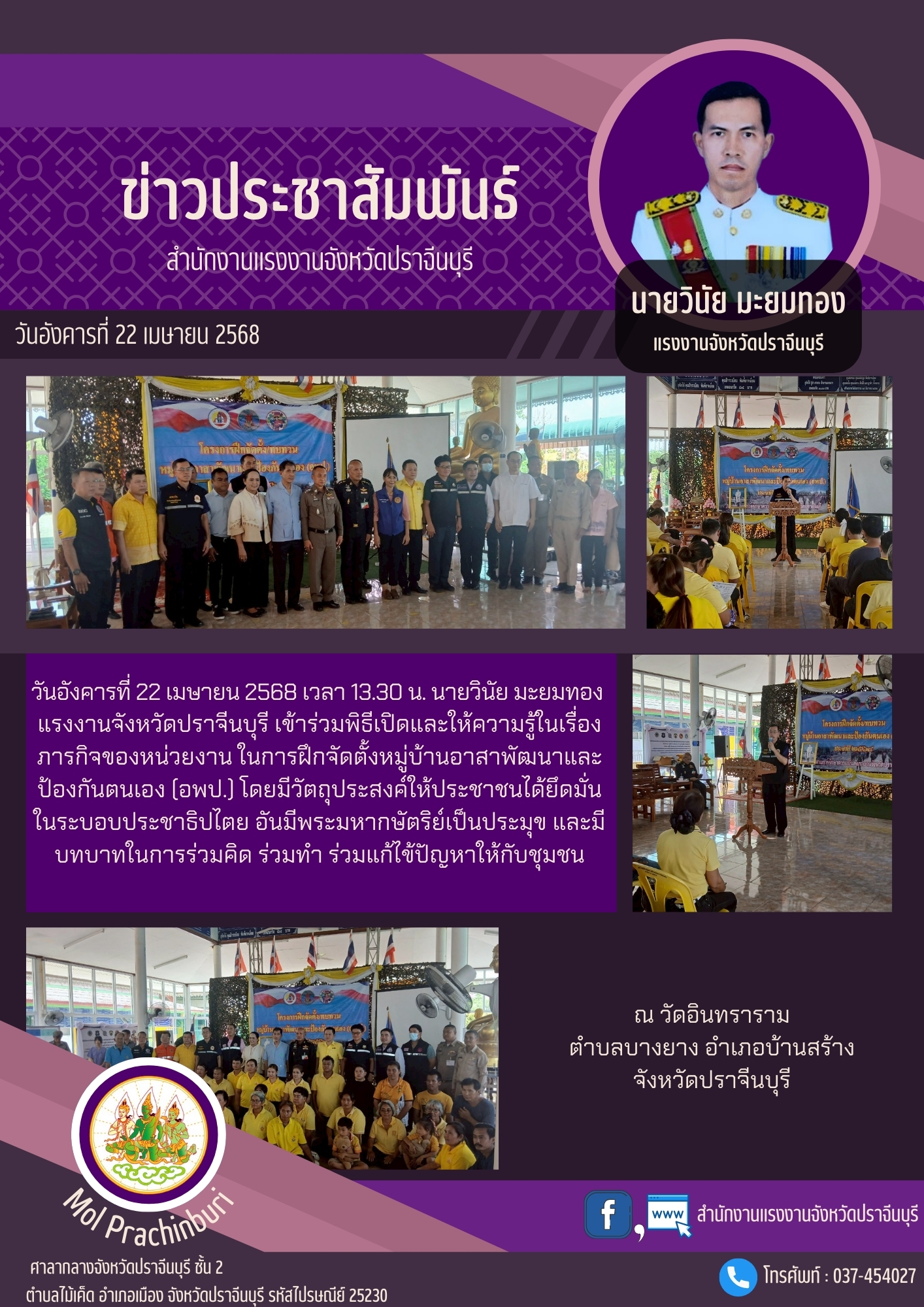 วันอังคารที่ 22 เมษายน 2568 เวลา 13.30 น. นายวินัย มะยมทอง แรงงานจังหวัดปราจีนบุรี เข้าร่วมพิธีเปิดและให้ความรู้ในเรื่อง ภารกิจของหน่วยงาน ในการฝึกจัดตั้งหมู่บ้านอาสาพัฒนาและป้องกันตนเอง (อพป.) โดยมีวัตถุประสงค์ให้ประชาชนได้ยึดมั่น ในระบอบประชาธิปไตย อันมีพระมหากษัตริย์เป็นประมุข และมีบทบาทในการร่วมคิด ร่วมทำ ร่วมแก้ไข้ปัญหาให้กับชุมชน ณ วัดอินทราราม ตำบลบางยาง อำเภอบ้านสร้าง จังหวัดปราจีนบุรี