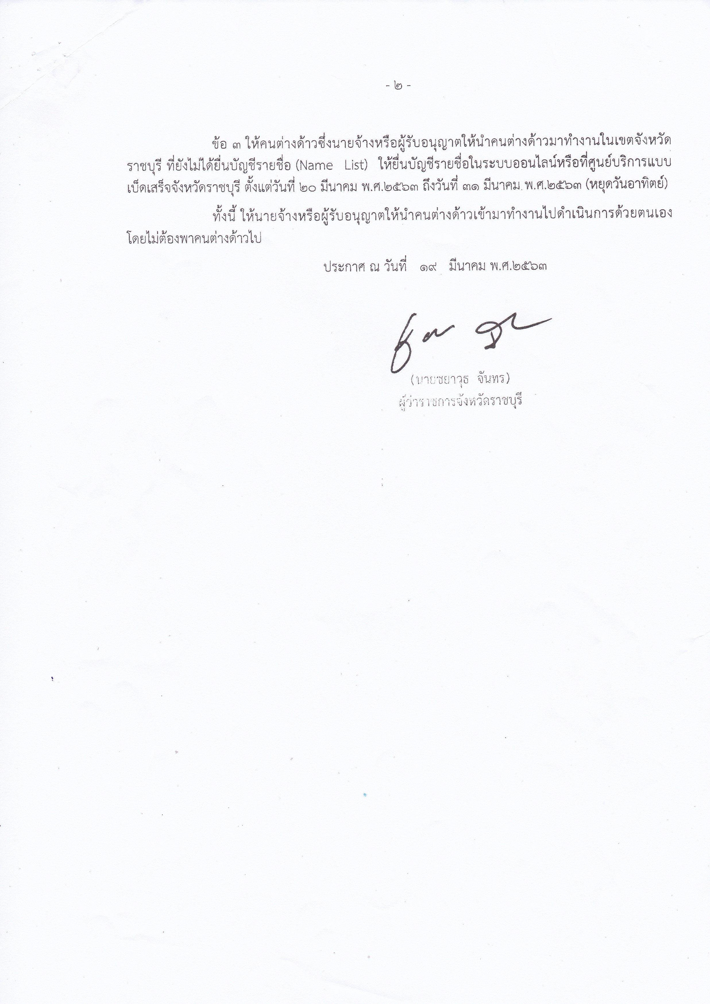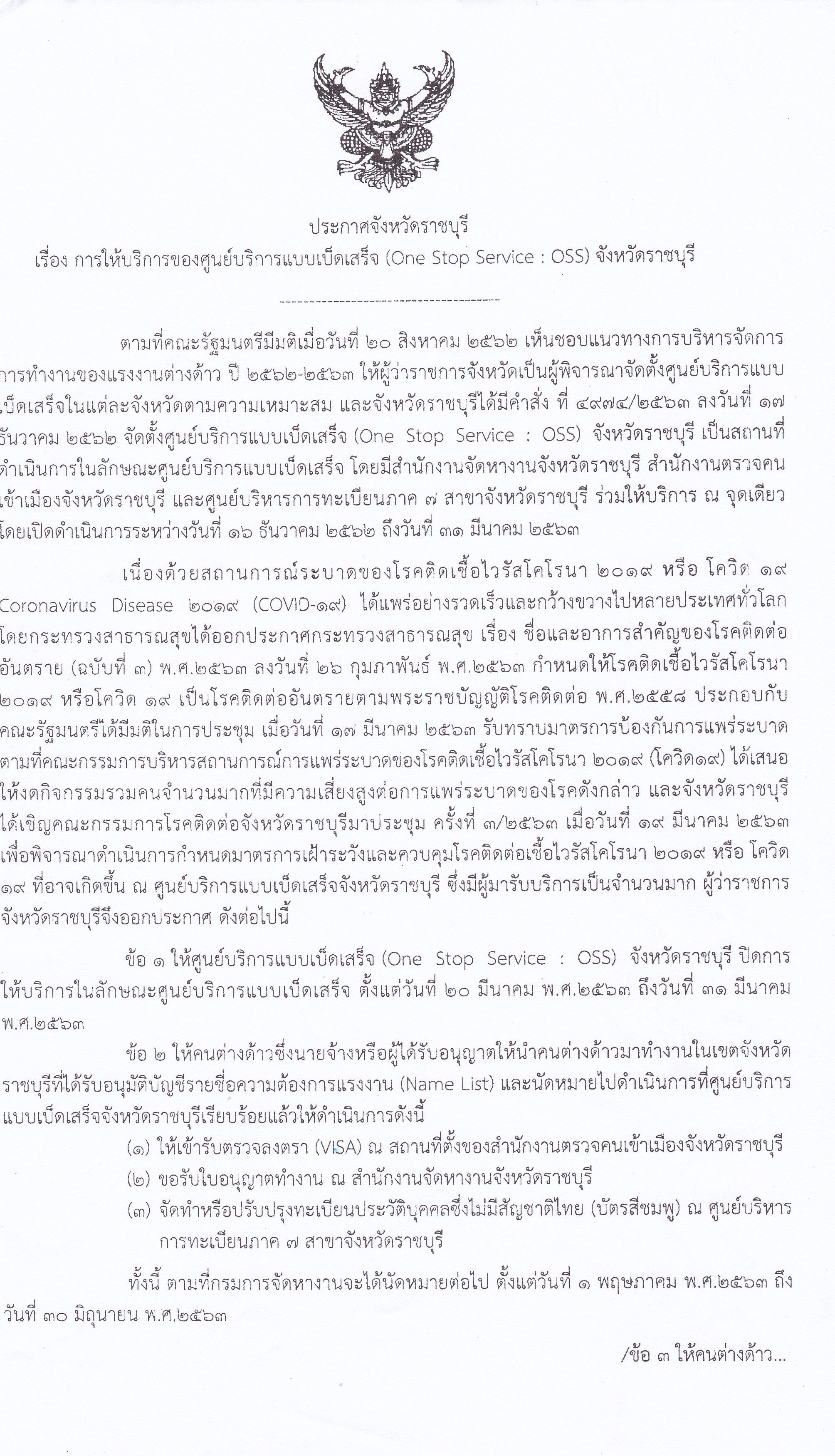 สำนักงานแรงงานจังหวัดราชบุรี ประกาศปิดการให้บริการ ของศูนย์บริการแบบเบ็ดเสร็จ (One Stop Service : OSS) จังหวัดราชบุรี โดยให้ปิดบริการในลักษณะศูนย์บริการแบบเบ็ดเสร็จ ตั้งแต่วันที่ ๒๐ มีนาคม พ.ศ. ๒๕๖๓ ถึงวันที่ ๓๑ มีนาคม พ.ศ. ๒๕๖๓