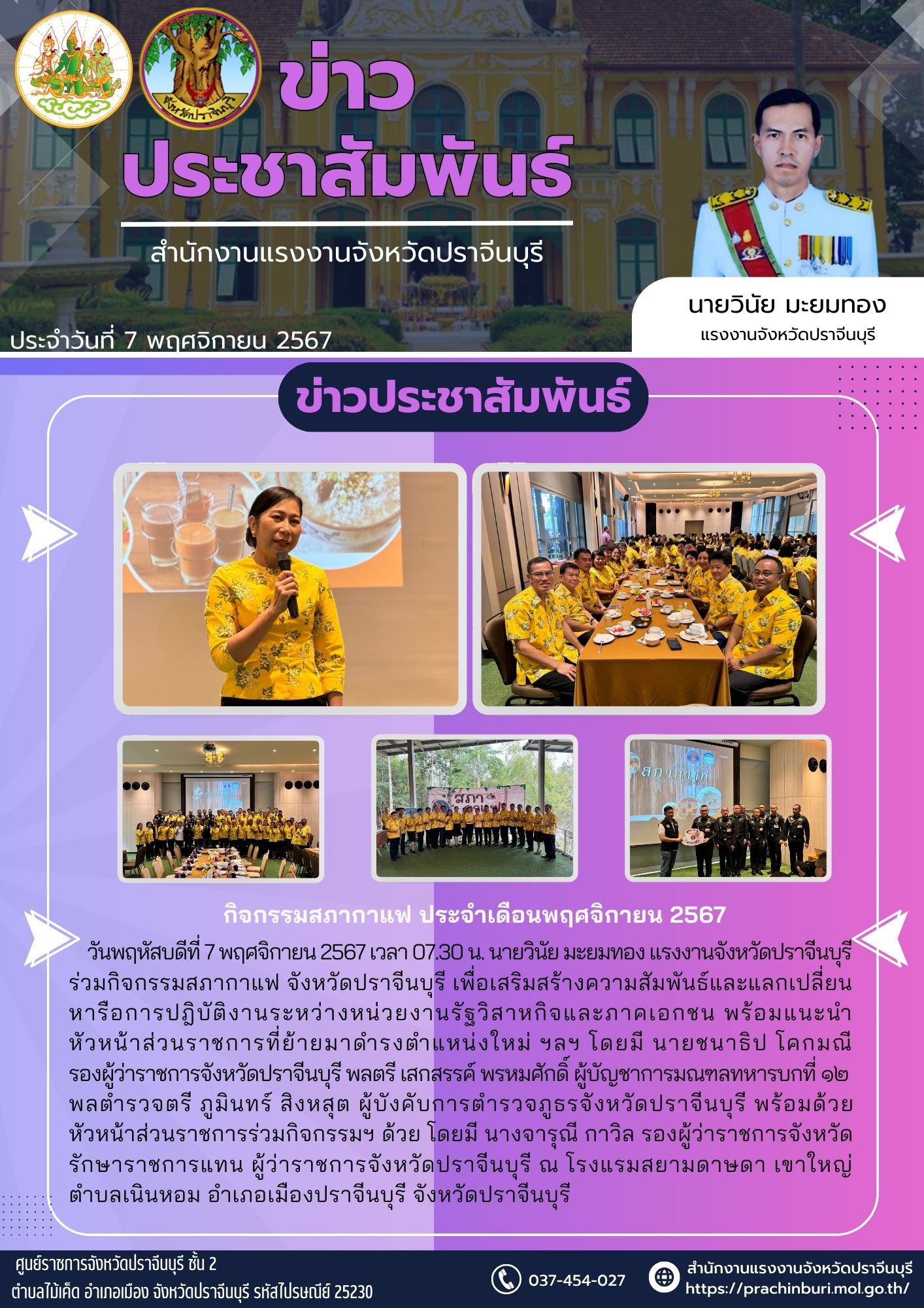 วันพฤหัสบดีที่ 7 พฤศจิกายน 2567 เวลา 07.30 น. นายวินัย มะยมทอง แรงงานจังหวัดปราจีนบุรี ร่วมกิจกรรมสภากาแฟ จังหวัดปราจีนบุรี เพื่อเสริมสร้างความสัมพันธ์และแลกเปลี่ยน
