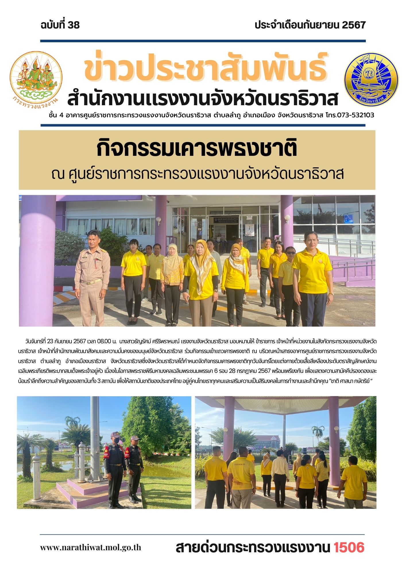 วันจันทร์ที่ 23 กันยายน 2567 เวลา 08.00 น. นางสาวธัญรัศม์ ศรีริพราหมณ์ แรงงานจังหวัดนราธิวาส มอบหมานให้ ข้าราชการ เจ้าหน้าที่หน่วยงานในสังกัดกระทรวงแรงงานจังหวัดนราธิวาส เจ้าหน้าที่สำนักงานพัฒนาสังคมและความมั่นคงของมนุษย์จังหวัดนราธิวาส ร่วมกิจกรรมเข้าแถวเคารพธงชาติ ณ บริเวณหน้าเสาธงอาคารศูนย์ราชการกระทรวงแรงงานจังหวัดนราธิวาส ตำบลลำภู อำเภอเมืองนราธิวาส จังหวัดนราธิวาสซึ่งจังหวัดนราธิวาสได้กำหนดจัดกิจกรรมเคารพธงชาติทุกวันจันทร์โดยแต่งกายด้วยเสื้อสีเหลืองประดับตราสัญลักษณ์งานเฉลิมพระเกียรติพระบาทสมเด็จพระเจ้าอยู่หัว เนื่องในโอกาสพระราชพิธีมหามงคลเฉลิมพระชนมพรรษา 6 รอบ 28 กรกฎาคม 2567 พร้อมเพรียงกัน เพื่อแสดงความสามัคคีปรองดองและน้อมรำลึกถึงความสำคัญของสถาบันทั้ง 3 สถาบัน เพื่อให้สถาบันชาติของประเทศไทย อยู่คู่คนไทยเราทุกคนและเสริมความเป็นสิริมงคลในการทำงานและสำนึกคุณ ”ชาติ ศาสนา กษัตริย์ “