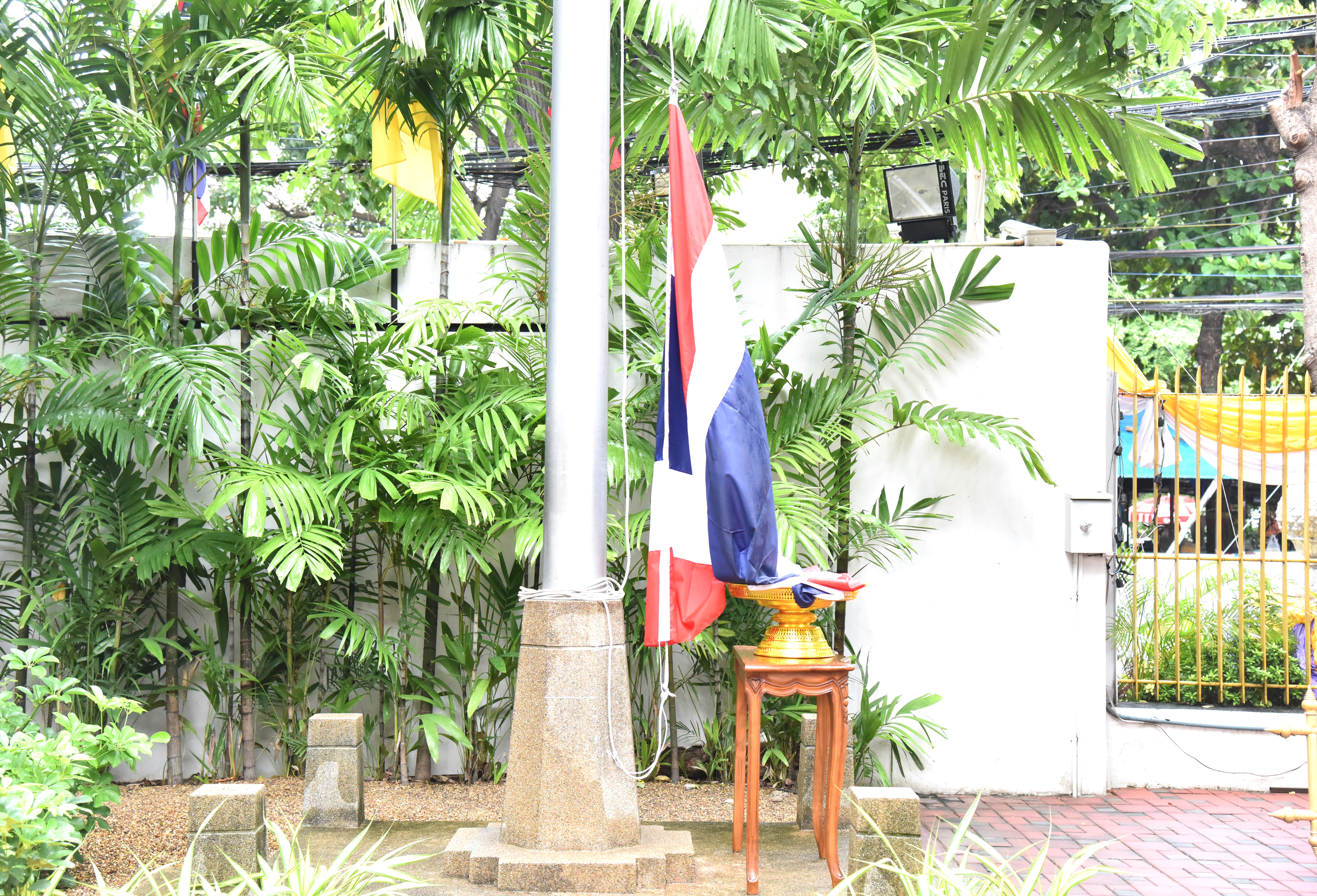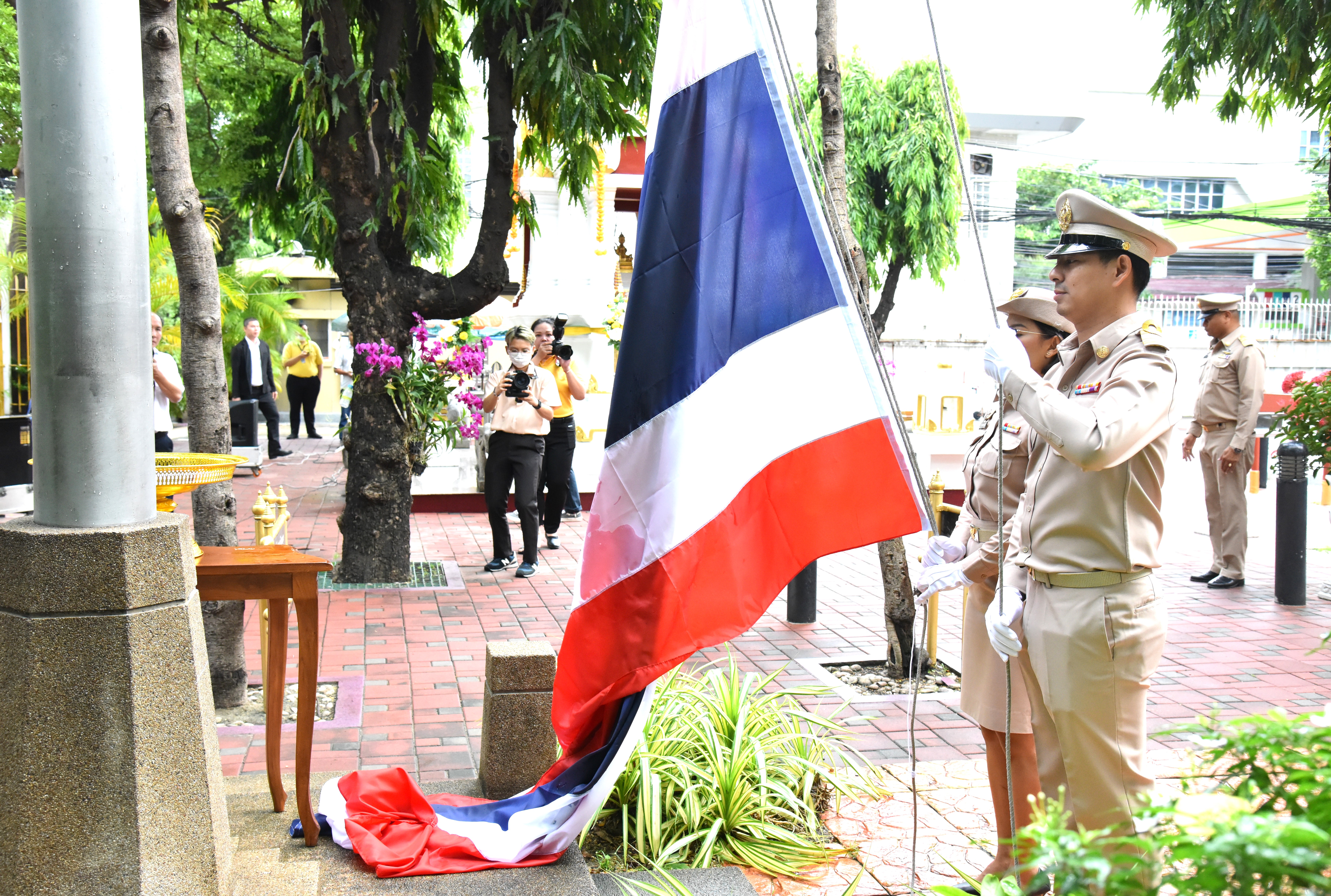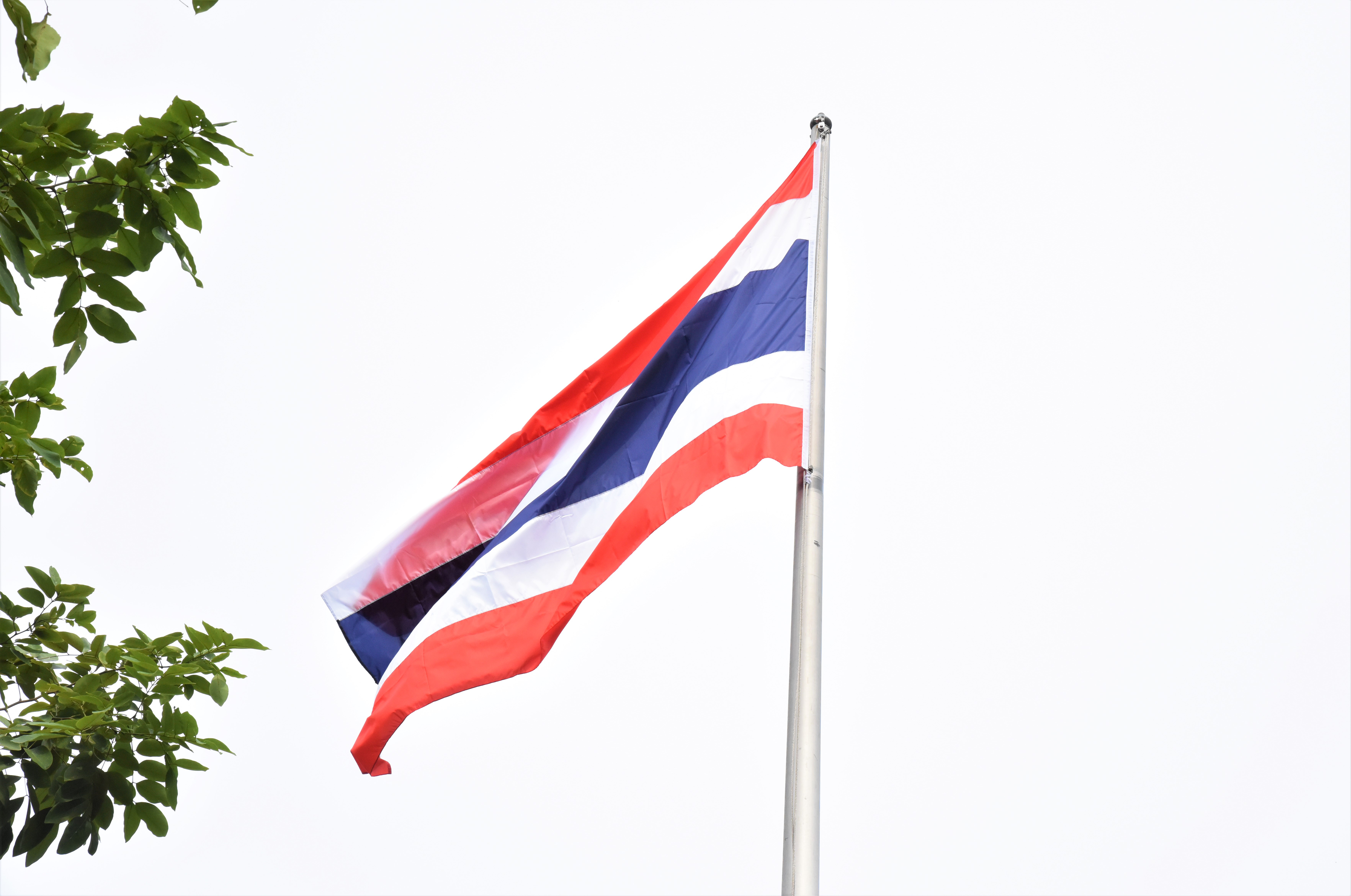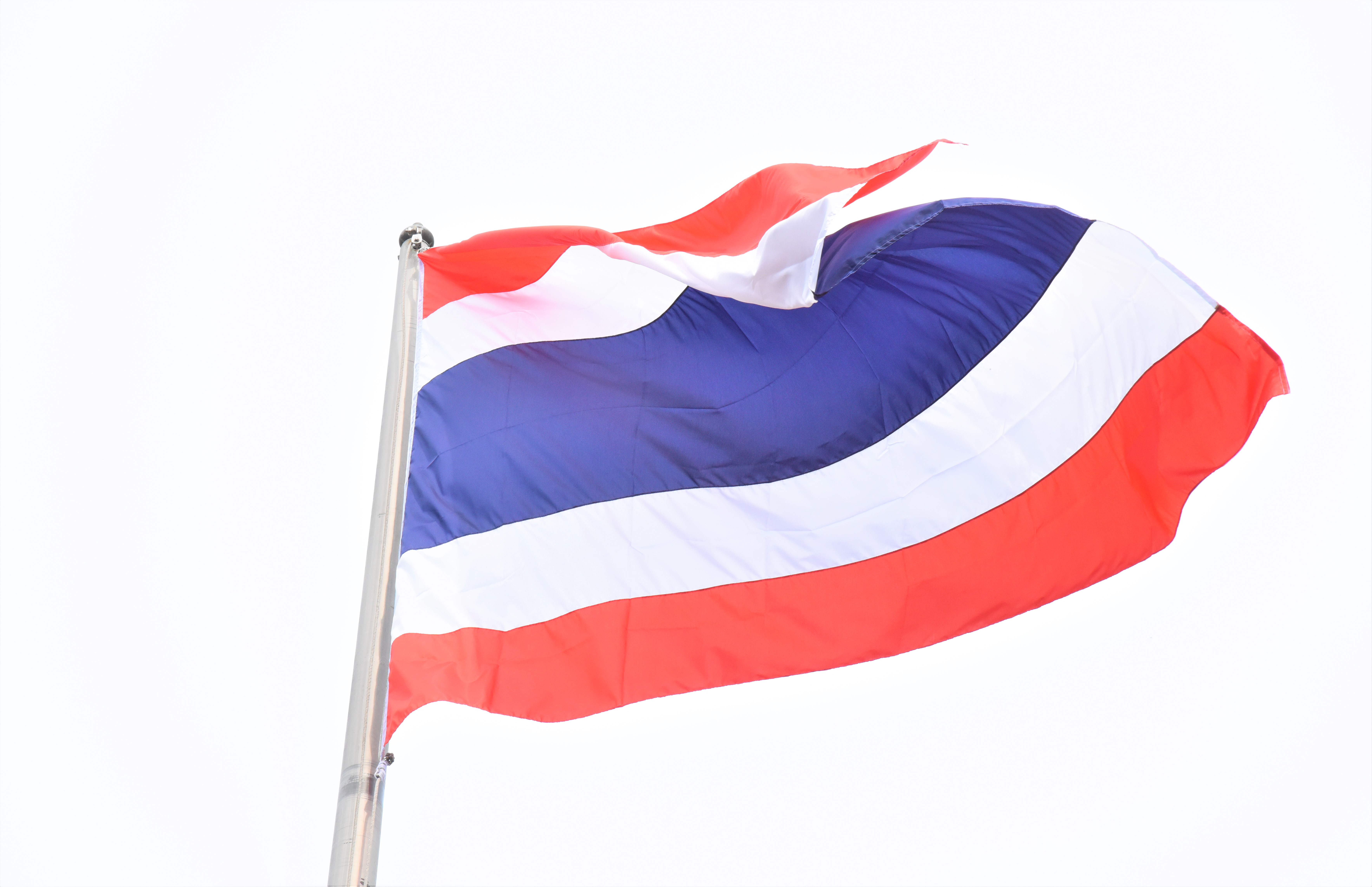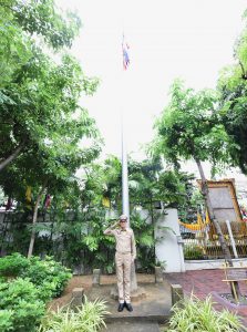 The Thai national flag is considered the highest symbol of the nation. The Thai flag had many forms in the past until the reign of His Majesty King Rama VI. His Majesty the King graciously ordered a new Flag Act enacted in 1917. His Majesty determined the meaning of the colours of the national flag, where red means the nation and the people, white means religion, and blue represents the King. The tricolour flag, or the Thai flag, is considered the highest symbol of the country. It is a reminder for the youths to remember the sacrifice of their ancestors in preserving the land and uniting the hearts of the entire nation, forging love and unity, promoting pride in being a country, and creating a great power in the development of the Thai nation.