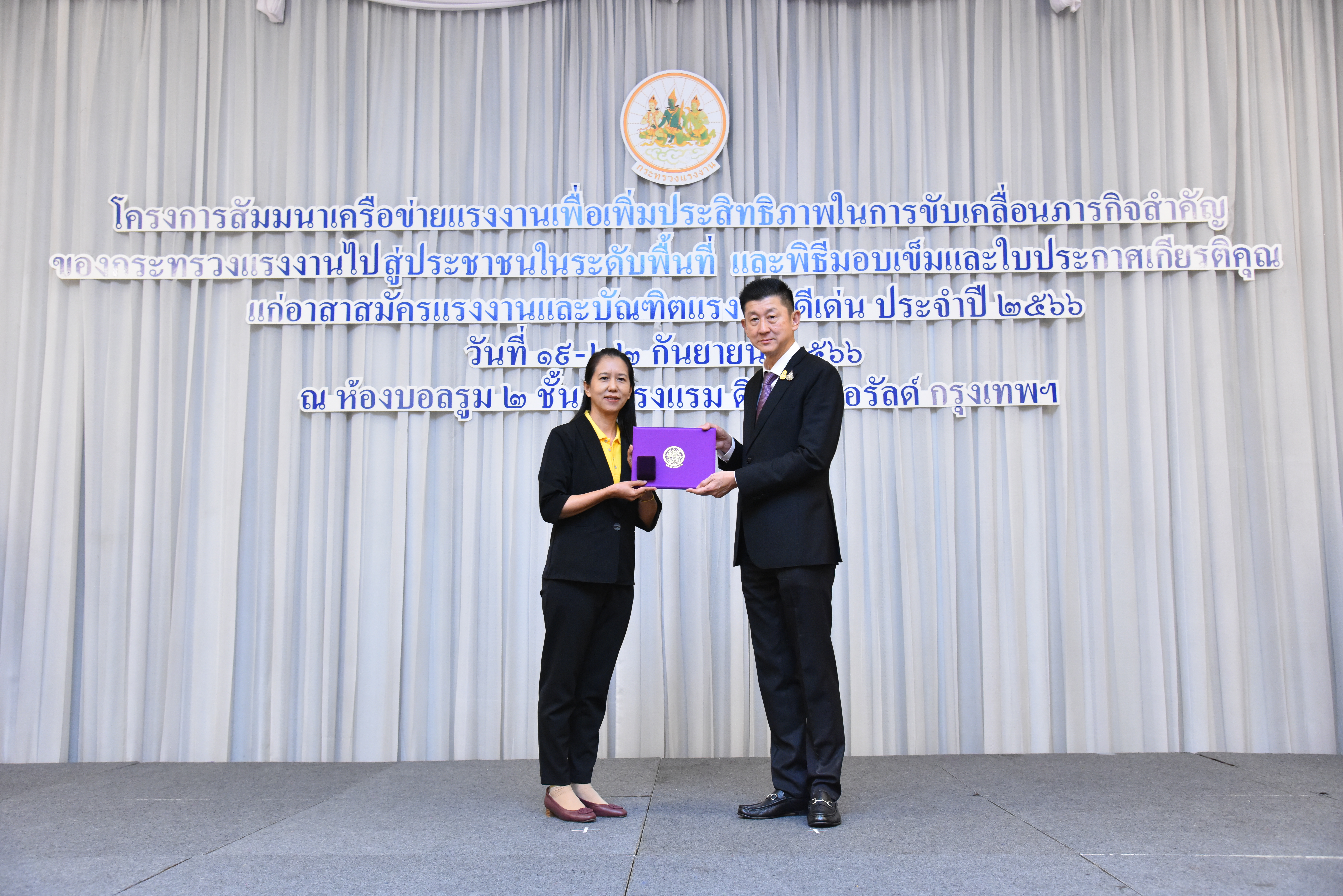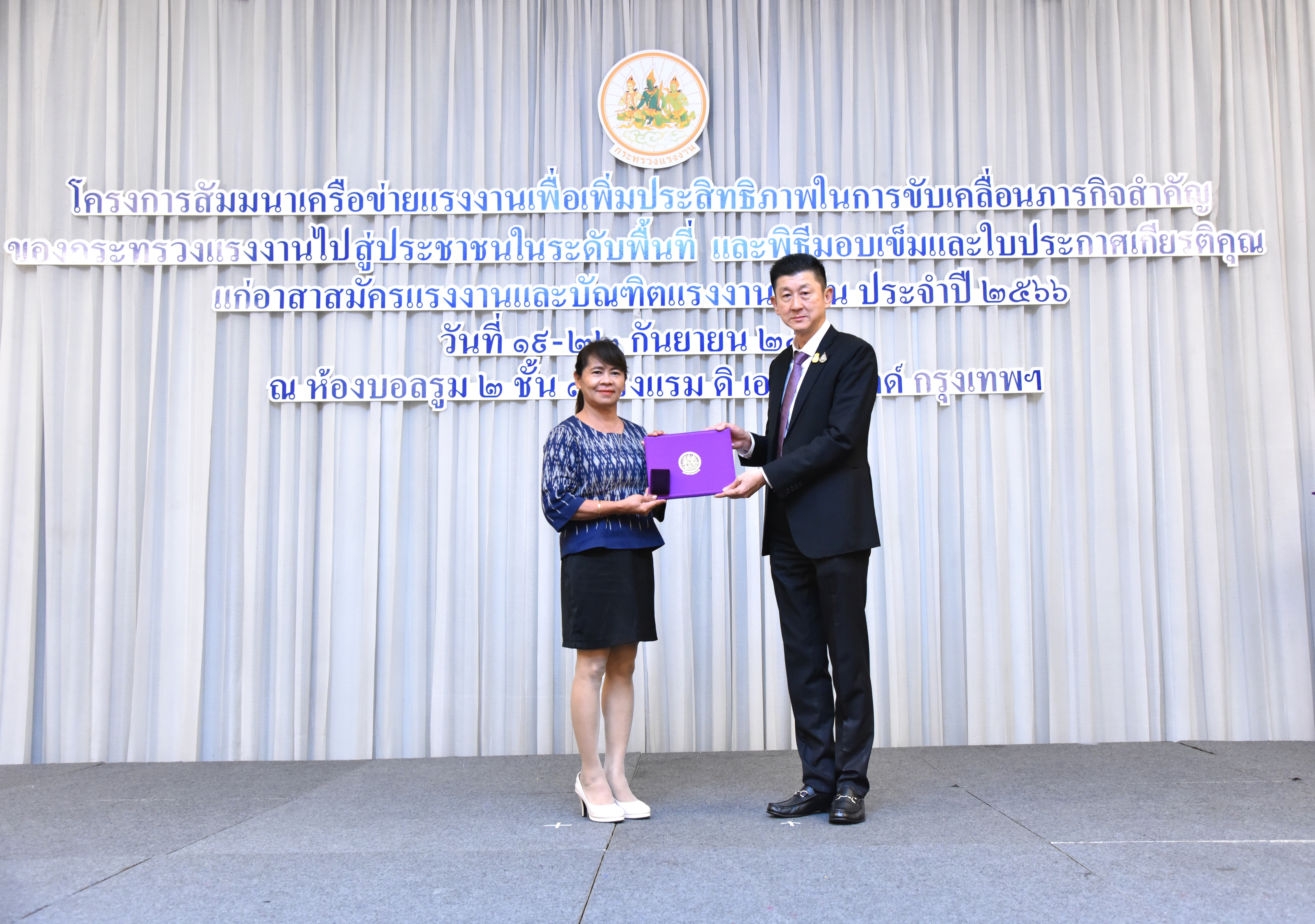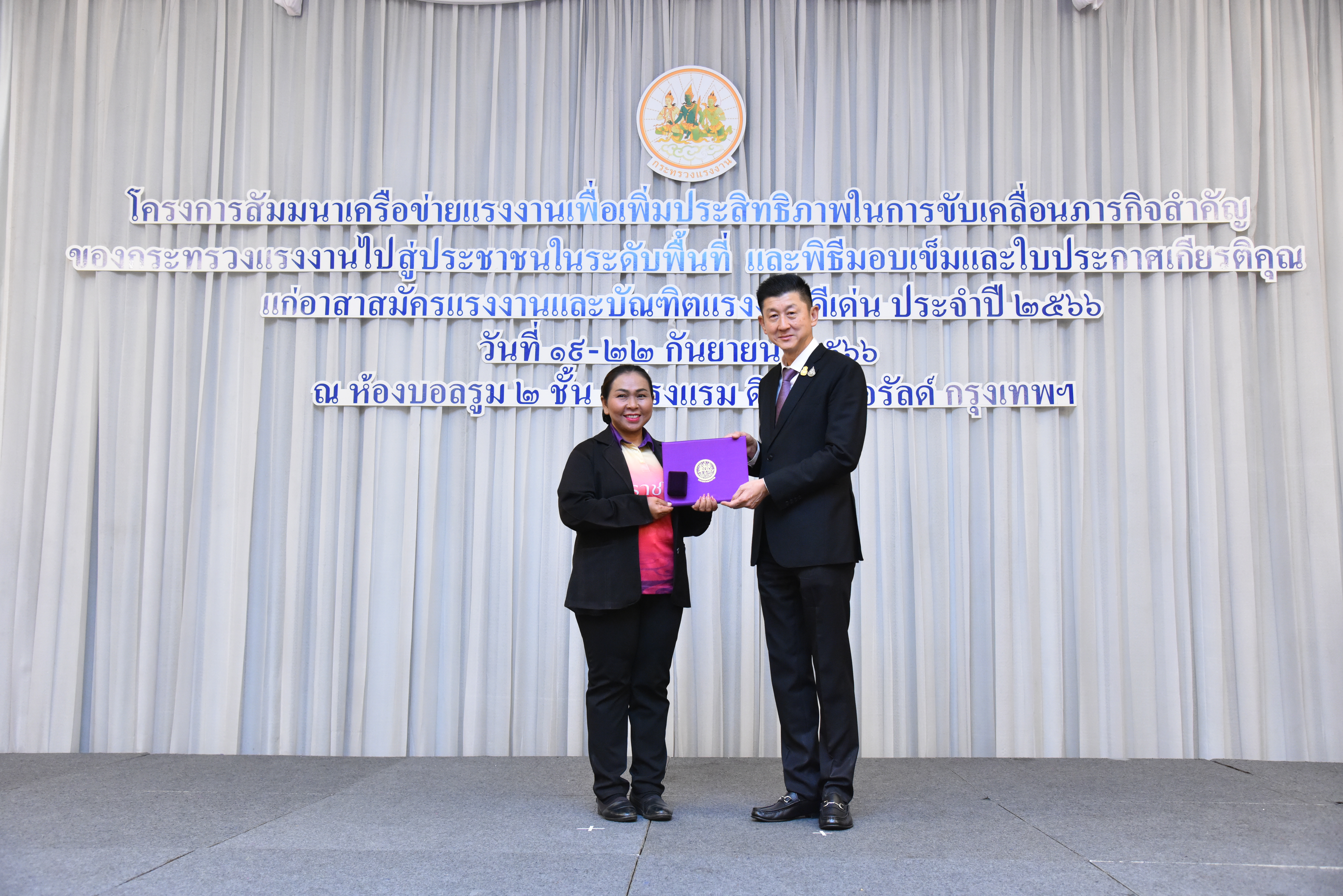 ปลัดแรงงาน เปิดสัมมนาเครือข่ายแรงงานเพื่อเพิ่มประสิทธิภาพในการขับเคลื่อนภารกิจสำคัญของกระทรวงแรงงาน ไปสู่ประชาชนในระดับพื้นที่ พร้อมมอบใบประกาศเกียรติคุณ และเข็มประกาศเกียรติคุณให้แก่อาสาสมัครแรงงานดีเด่นระดับจังหวัด ประจำปี 2566 จำนวน 79 คน