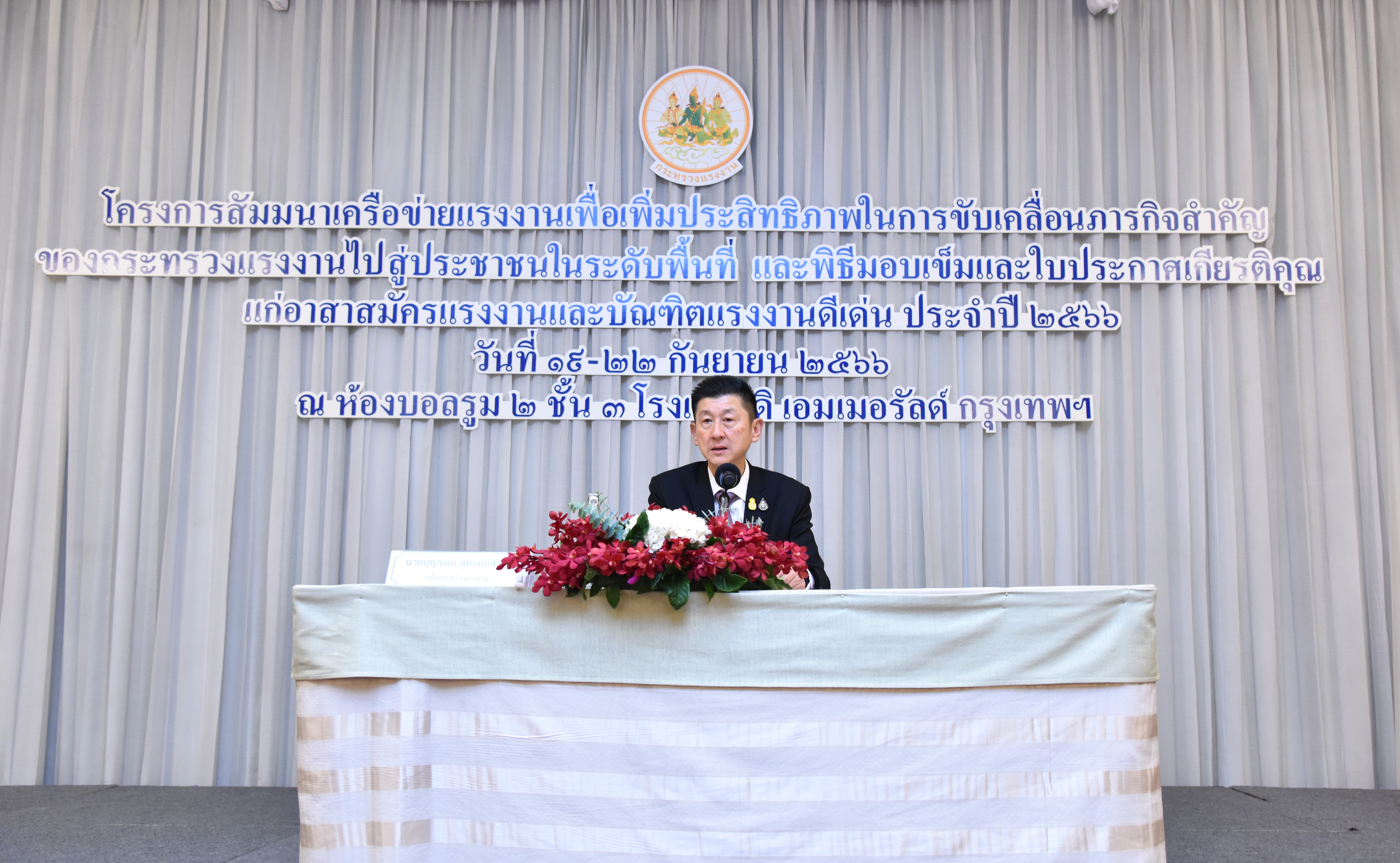 วันที่ 19 กันยายน 2566 เวลา 15.30 น. นายบุญชอบ สุทธมนัสวงษ์ ปลัดกระทรวงแรงงาน เป็นประธานพิธีเปิดโครงการสัมมนาเครือข่ายแรงงานเพื่อเพิ่มประสิทธิภาพในการขับเคลื่อนภารกิจสำคัญของกระทรวงแรงงาน ไปสู่ประชาชนในระดับพื้นที่ ณ ห้องบอลรูม 2 ชั้น 3 โรงแรม ดิ เอมเมอรัลด์ กรุงเทพฯ โดยกล่าวว่า การสัมมนาฯ ในครั้งนี้ เป็นความตั้งใจของกระทรวงแรงงาน ที่เล็งเห็นการพัฒนาเป็นสิ่งสำคัญ เพราะการพัฒนาจะส่งผลให้บุคลากรและเครือข่ายของกระทรวงแรงงาน มีองค์ความรู้ ประสบการณ์ มีศักยภาพและสามารถที่จะนำไปประยุกต์ใช้ในการขับเคลื่อนภารกิจสำคัญของกระทรวงแรงงาน ได้บรรลุตามเป้าหมายที่กำหนดและเกิดประโยชน์ต่อประชาชนโดยรวม ซึ่งได้มอบแนวทางในการจัดสัมมนาโดยให้มีการเรียนรู้ การศึกษาดูงาน การทำกิจกรรม และการแลกเปลี่ยนความคิดเห็น รวมถึงในโอกาสต่อไป กระทรวงแรงงาน จะผลักดันให้เครือข่ายของกระทรวงแรงงานได้รับสิทธิสวัสดิการและค่าตอบแทนที่สูงขึ้น เพื่อเป็นการสร้างขวัญและกำลังใจในการเข้าร่วมขับเคลื่อนภารกิจของกระทรวงแรงงานอย่างมีประสิทธิภาพ