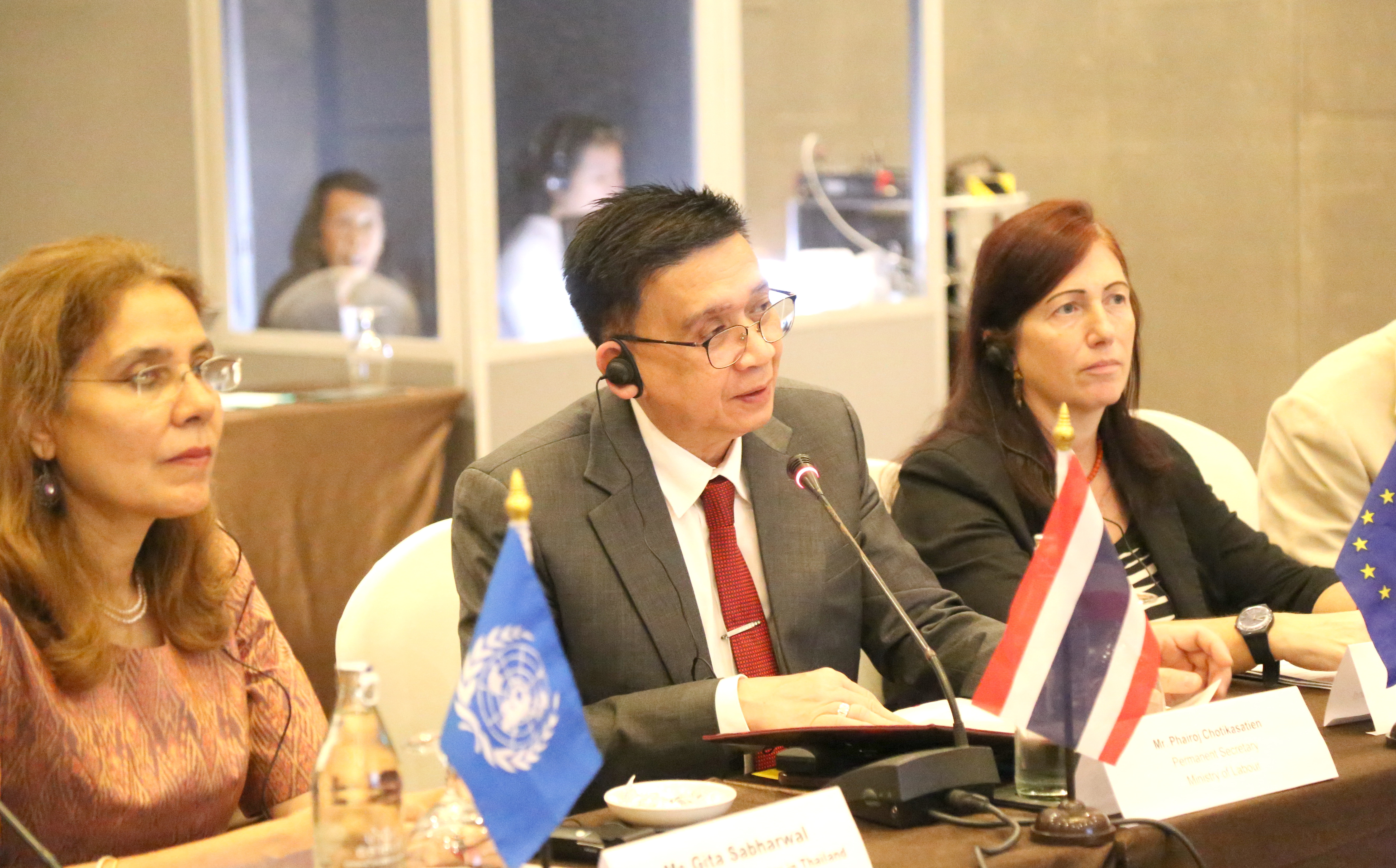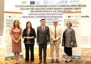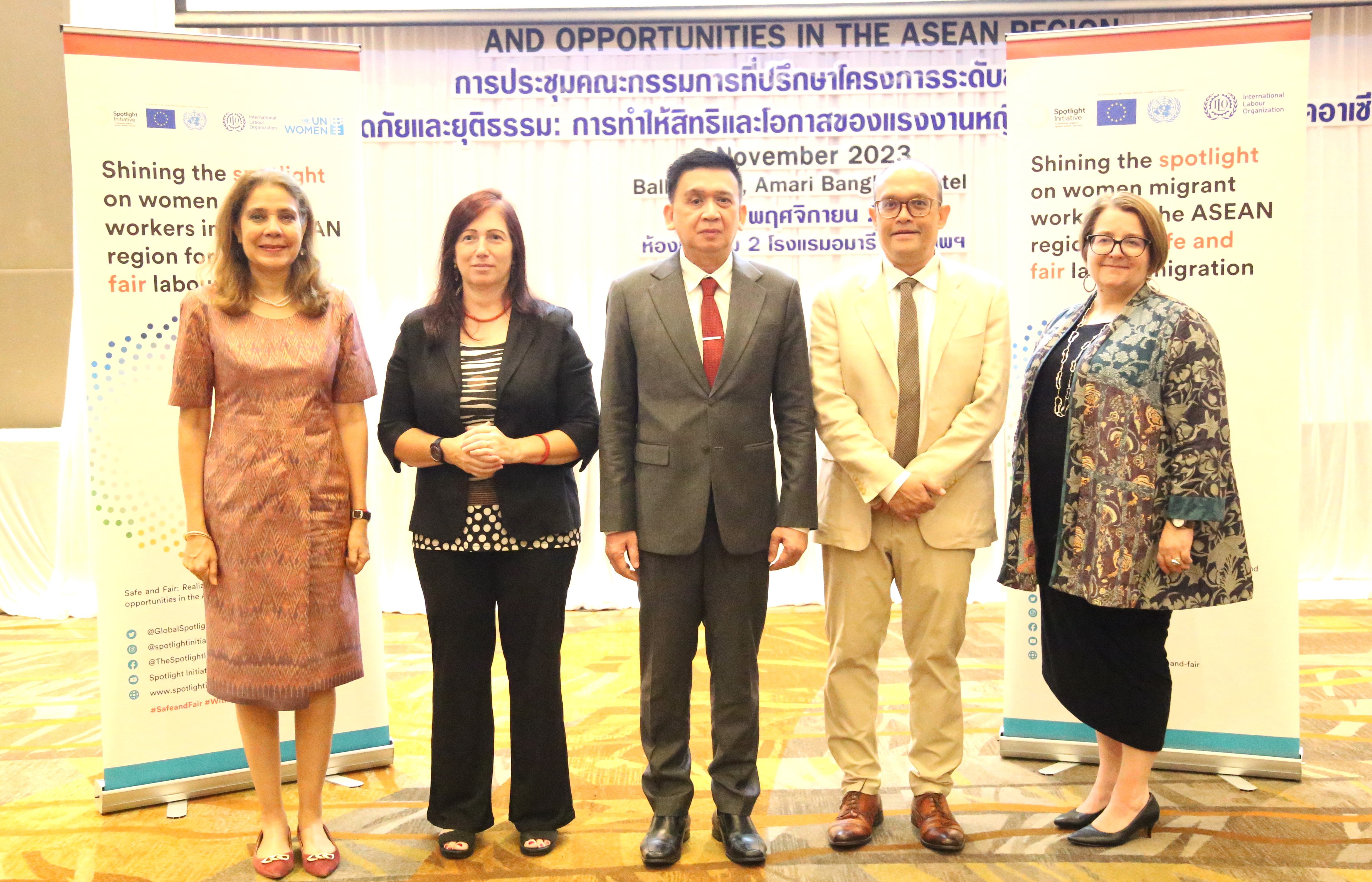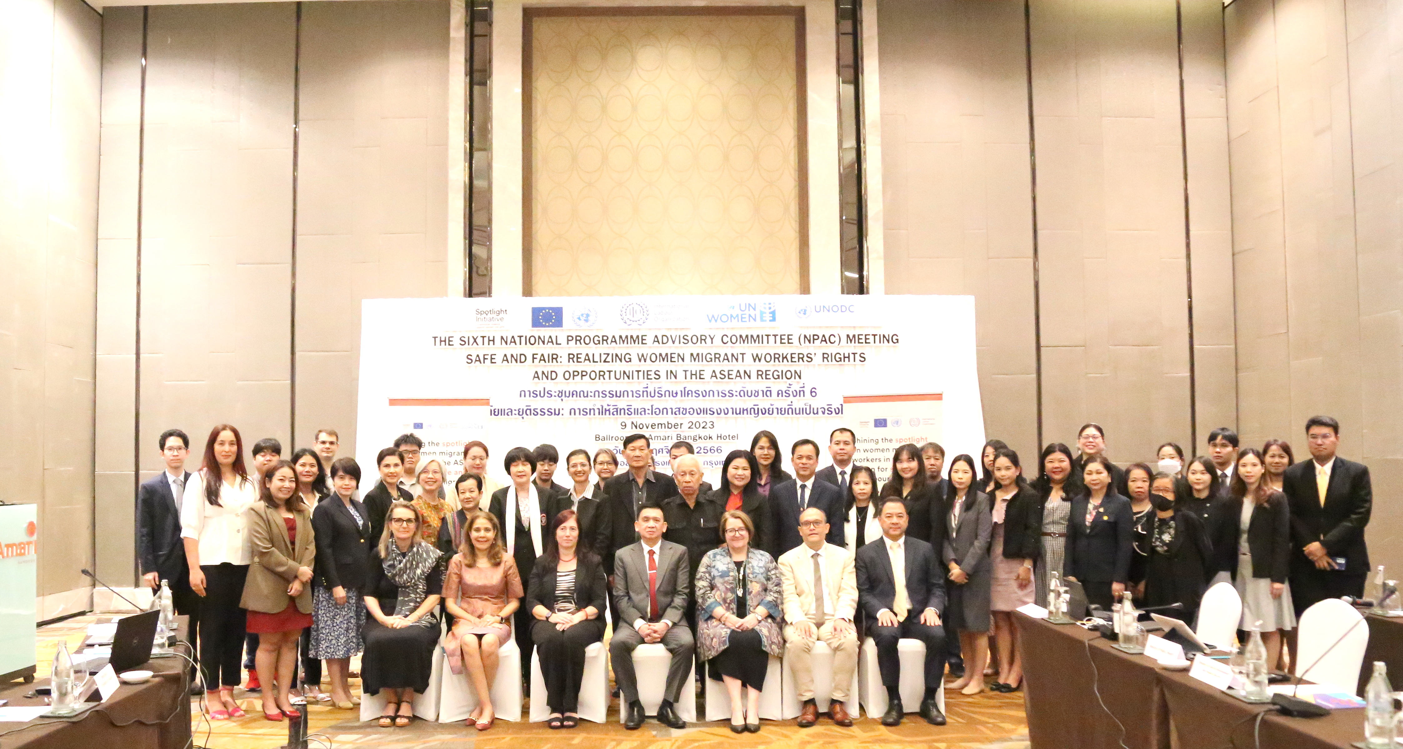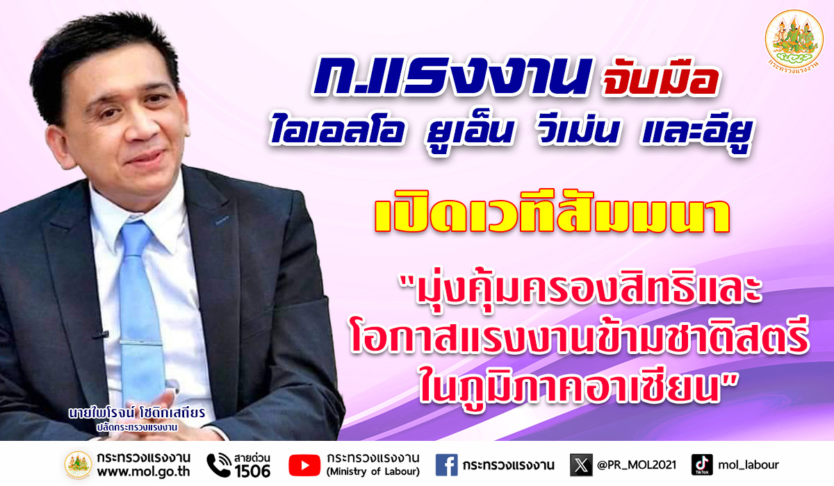วันที่ 9 พฤศจิกายน 2566 นายไพโรจน์ โชติกเสถียร ปลัดกระทรวงแรงงาน เป็นประธานการประชุมคณะกรรมการที่ปรึกษาระดับประเทศโครงการความปลอดภัยและยุติธรรม : สิทธิและโอกาสของแรงงานข้ามชาติสตรีในภูมิภาคอาเซียน ครั้งที่ 6 โดยมี นายสมาสภ์ ปัทมะสุคนธ์ ผู้ตรวจราชการกระทรวงแรงงาน คุณซารา เรโซอาลญิ รองหัวหน้าคณะผู้แทนสหภาพยุโรปประจำประเทศไทย คุณกีต้า ซับบระวาล ผู้ประสานงานสหประชาชาติประจำประเทศไทย คุณอ๊อคตาเวียนโต้ พาซาริบู รองผู้อำนวยการรักษาการผู้อำนวยการสำนักงานแรงงานระหว่างประเทศ ประจำประเทศไทย กัมพูชา และ สปป.ลาว คุณซาราห์ นิบส์ รักษาการผู้อำนวยการองค์การ UN Women ดร.ออดรี – อานนท์ โรเชเลมันยา เลขานุการเอก หัวหน้าทีมฝ่ายความร่วมมือสำนักงานคณะผู้แทนสหภาพยุโรปประจำประเทศไทย พร้อมด้วยผู้บริหารระดับสูงกระทรวงแรงงาน เข้าร่วม ณ ห้องบอลรูม 2 ชั้น 6 โรงแรมอมารี วอเตอร์เกท กรุงเทพฯ