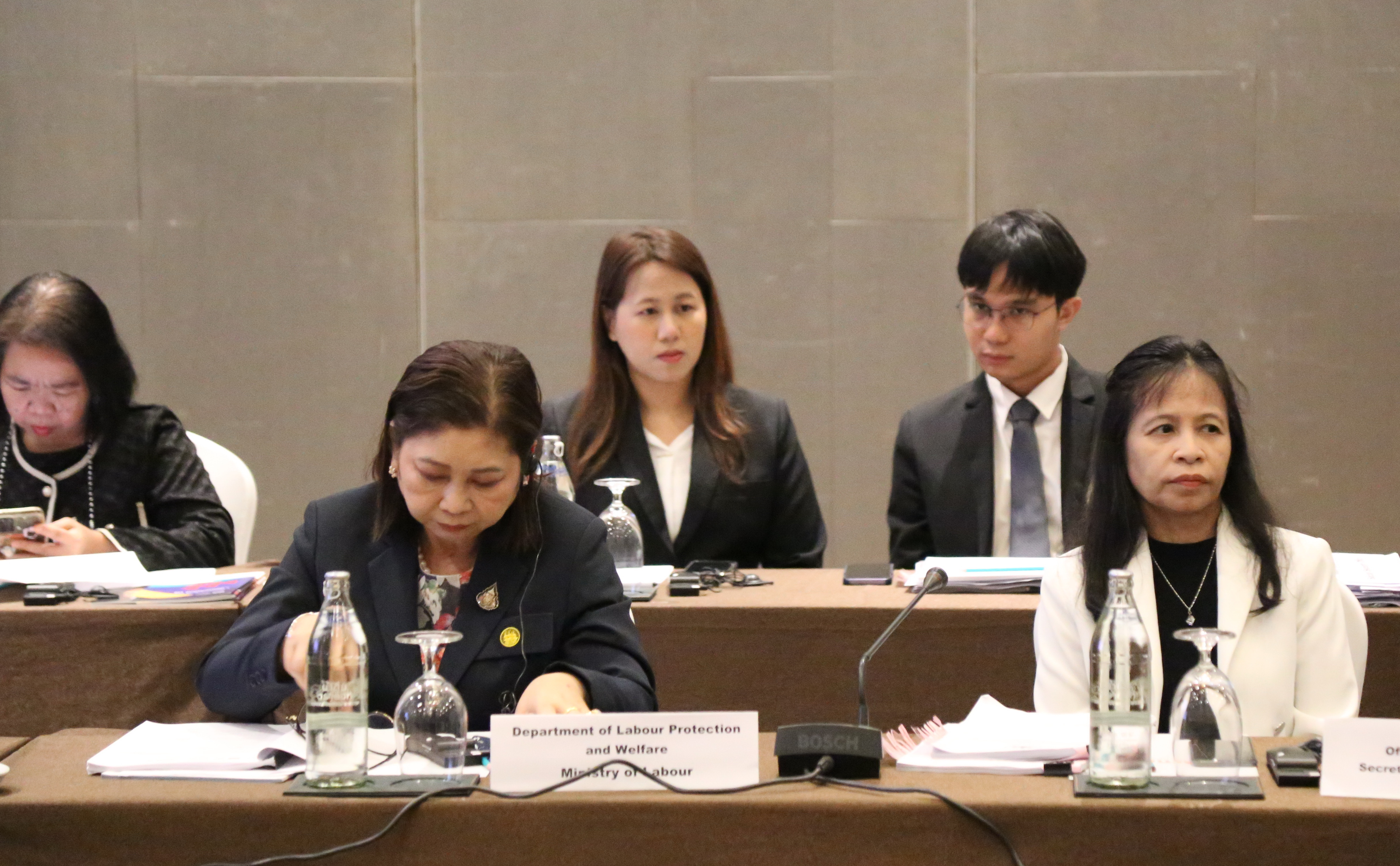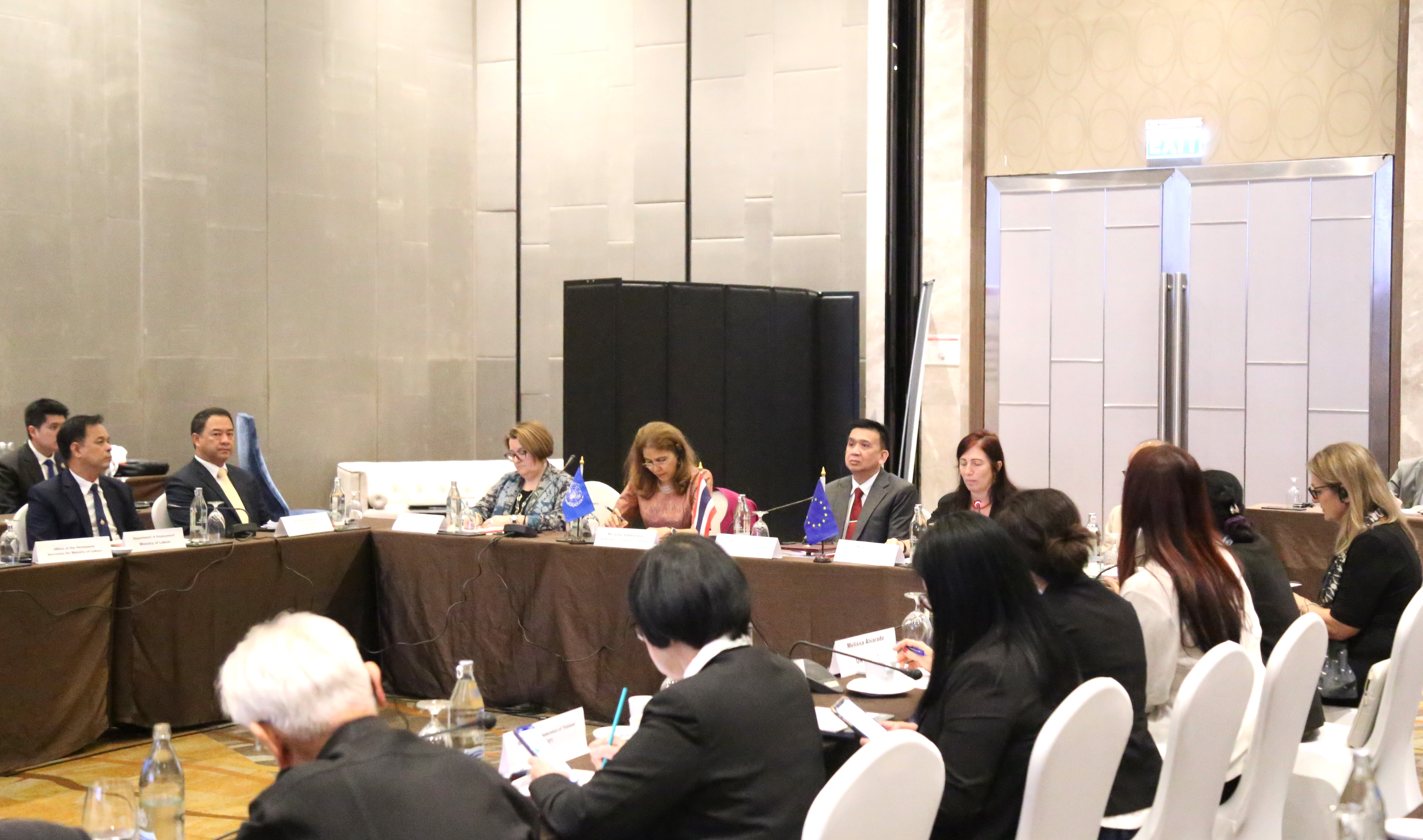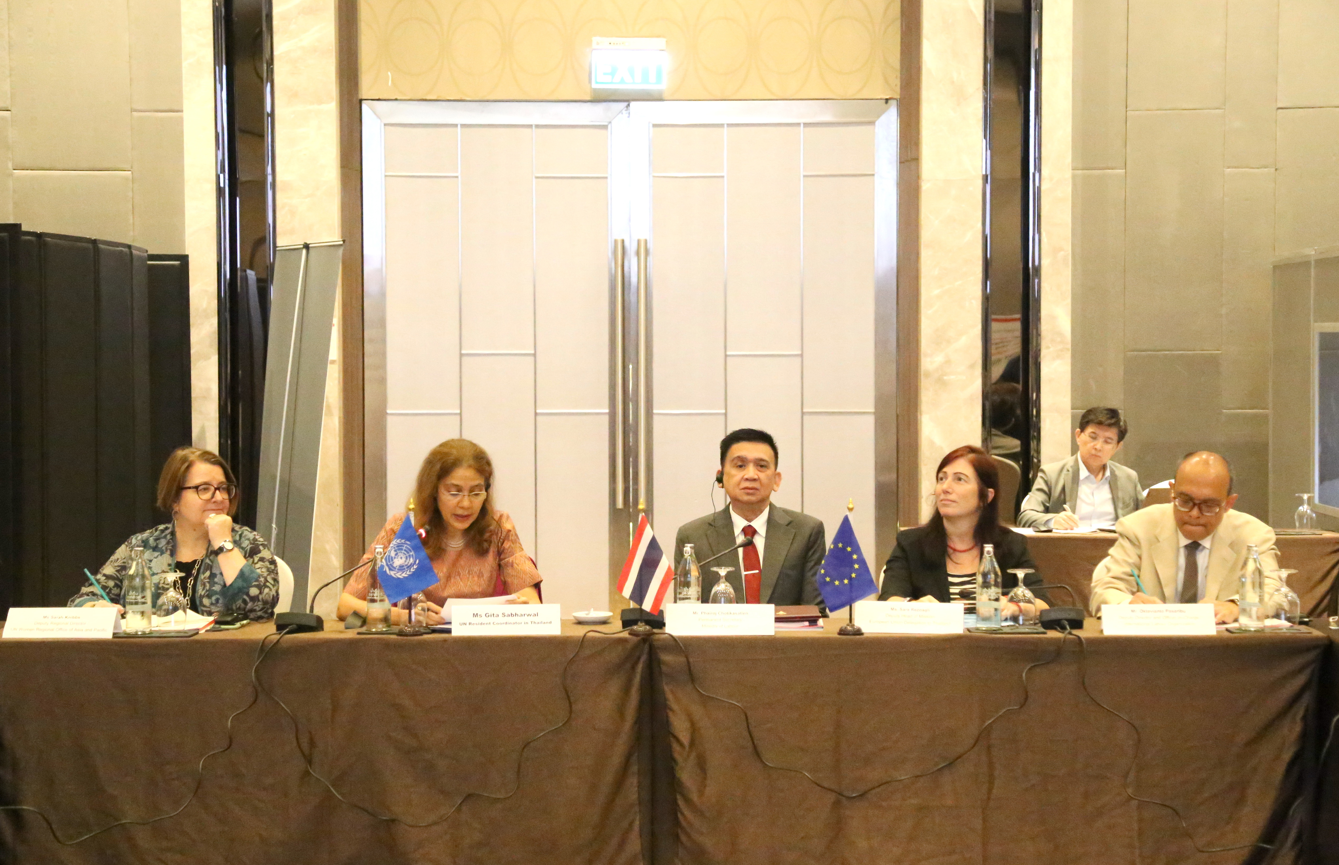 วันที่ 9 พฤศจิกายน 2566 นายไพโรจน์ โชติกเสถียร ปลัดกระทรวงแรงงาน เป็นประธานการประชุมคณะกรรมการที่ปรึกษาระดับประเทศโครงการความปลอดภัยและยุติธรรม : สิทธิและโอกาสของแรงงานข้ามชาติสตรีในภูมิภาคอาเซียน ครั้งที่ 6 โดยมี นายสมาสภ์ ปัทมะสุคนธ์ ผู้ตรวจราชการกระทรวงแรงงาน คุณซารา เรโซอาลญิ รองหัวหน้าคณะผู้แทนสหภาพยุโรปประจำประเทศไทย คุณกีต้า ซับบระวาล ผู้ประสานงานสหประชาชาติประจำประเทศไทย คุณอ๊อคตาเวียนโต้ พาซาริบู รองผู้อำนวยการรักษาการผู้อำนวยการสำนักงานแรงงานระหว่างประเทศ ประจำประเทศไทย กัมพูชา และ สปป.ลาว คุณซาราห์ นิบส์ รักษาการผู้อำนวยการองค์การ UN Women ดร.ออดรี – อานนท์ โรเชเลมันยา เลขานุการเอก หัวหน้าทีมฝ่ายความร่วมมือสำนักงานคณะผู้แทนสหภาพยุโรปประจำประเทศไทย พร้อมด้วยผู้บริหารระดับสูงกระทรวงแรงงาน เข้าร่วม ณ ห้องบอลรูม 2 ชั้น 6 โรงแรมอมารี วอเตอร์เกท กรุงเทพฯ