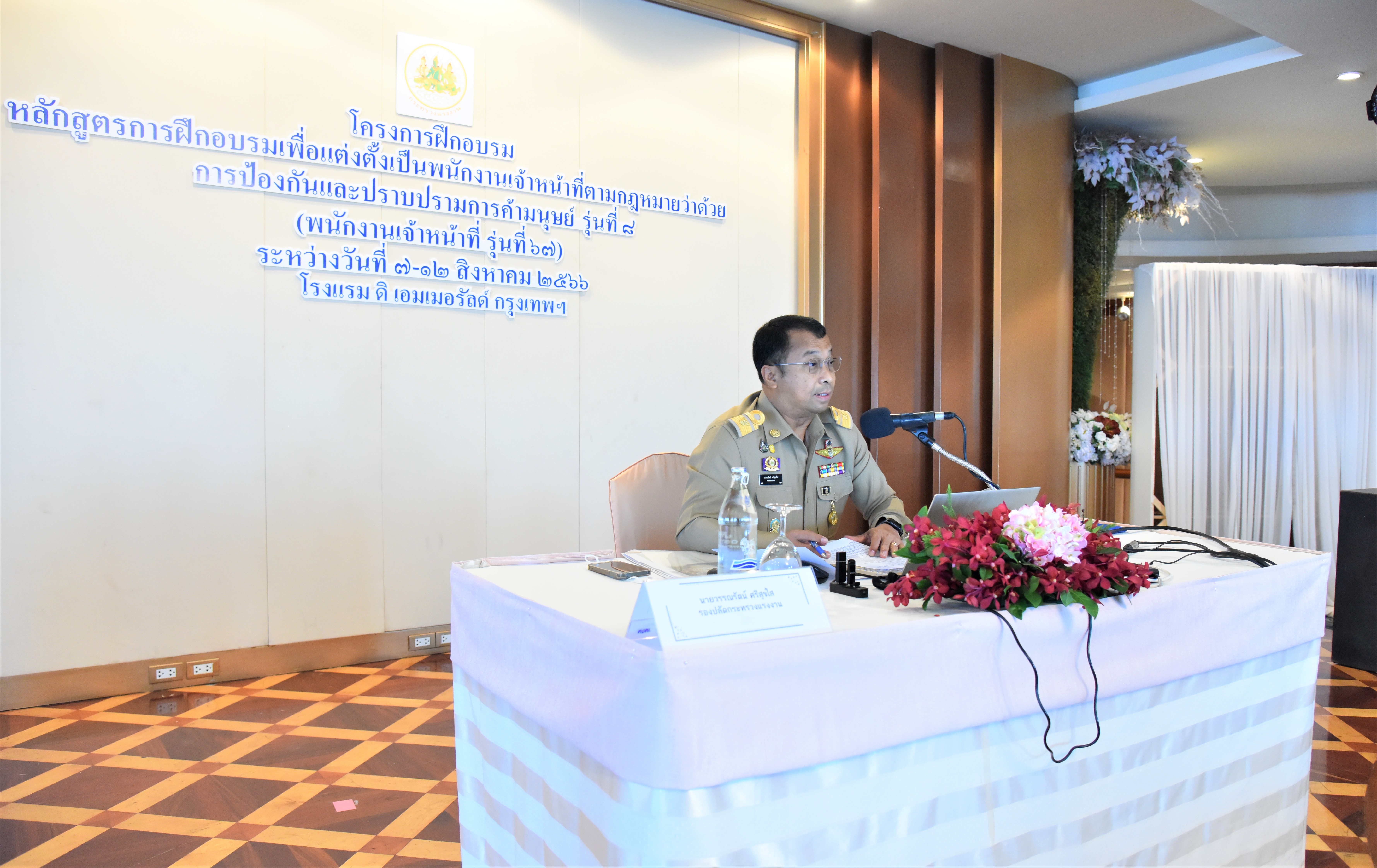 On August 7, 2023, at 09.30 hours, the Permanent Secretary of Labour, Mr. Boonchob Suttamanaswong, assigned the Deputy Permanent Secretary of Labour, Mr. Wannarat Srisuksai, to preside over the opening ceremony of the training on the Appointment of Competent Officials under Human Trafficking Prevention and Suppression Laws (2022 version), Class 8 (Competent Officer Class 67) and to speak on the policies for the prevention and remediation of forced labour. The training is from August 7 to 12, 2023. The Ministry of Labour’s executives also joined the occasion. Ms. Funyok Bunsuaykwan, a Policy and Planning Analyst Specialist from the Office of the Secretariat of the Labour Trafficking Prevention Command Center, reported the training’s objectives. The occasion took place at the Grand Panorama room, 14th floor, The Emerald Hotel Ratchadaphisek Road, Din Daeng, Bangkok.