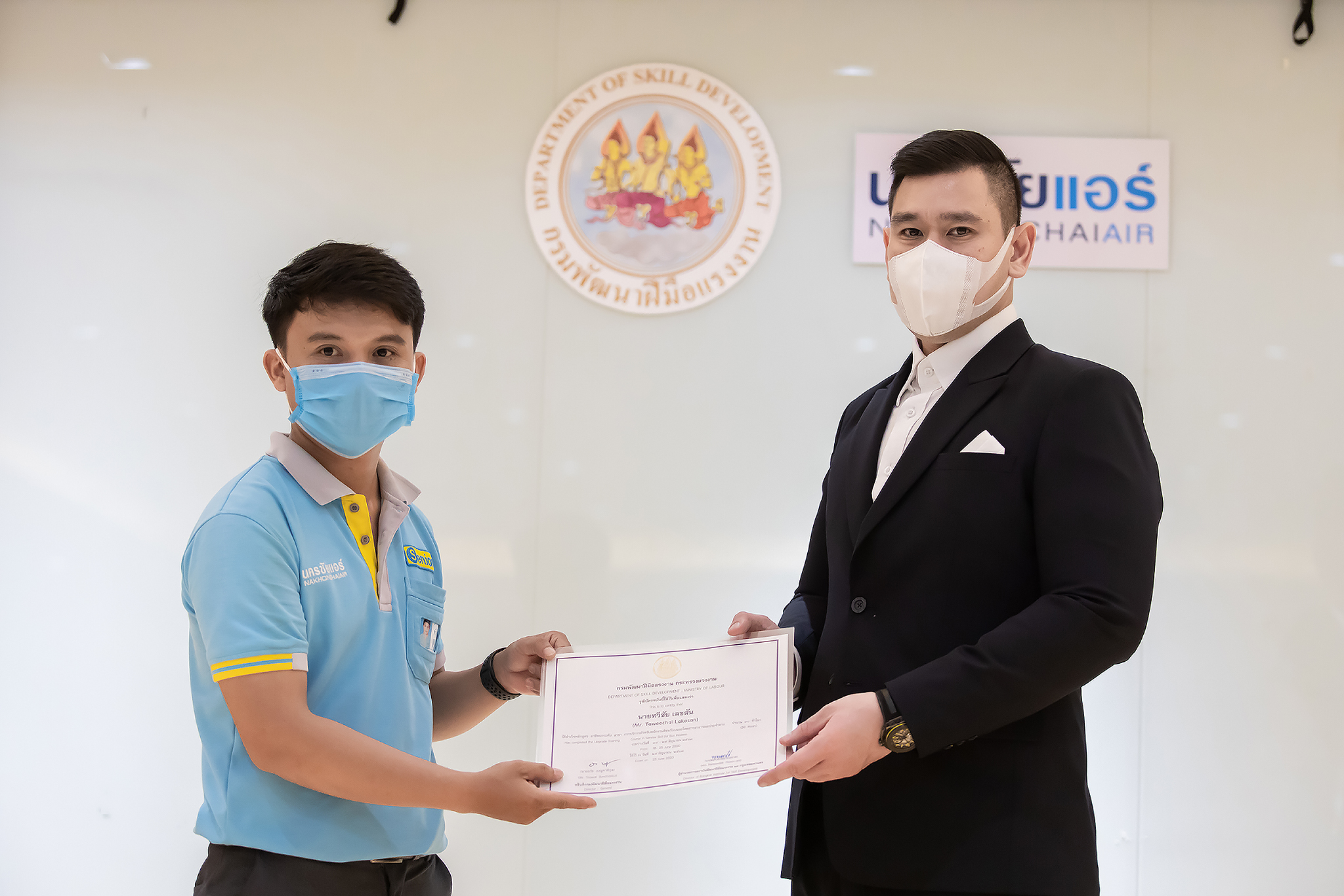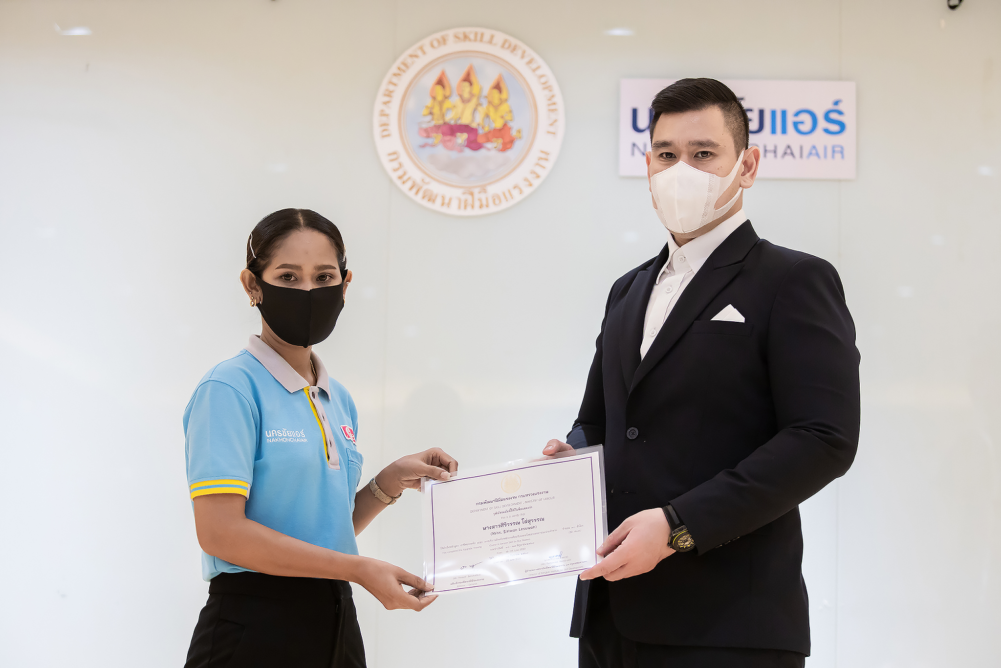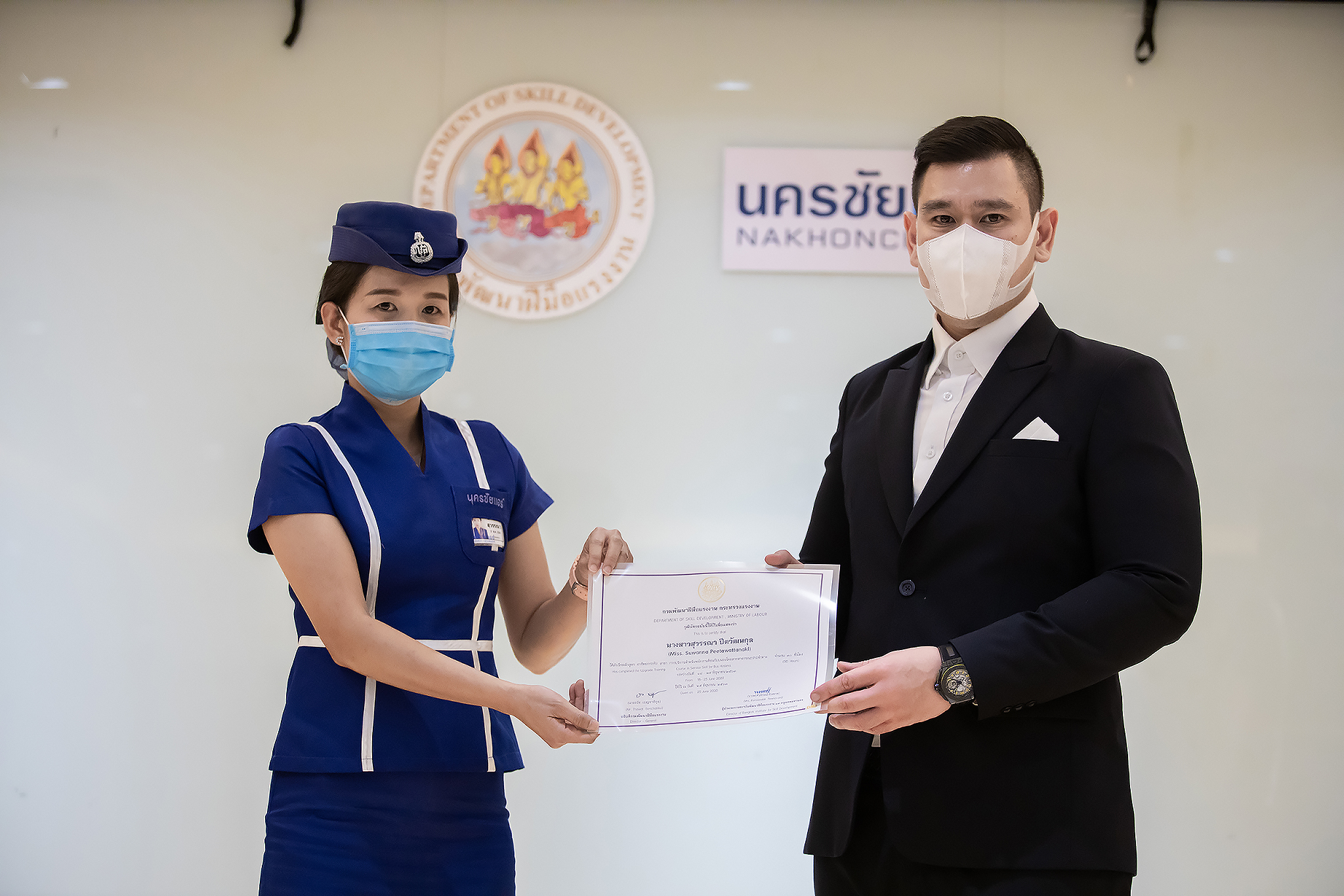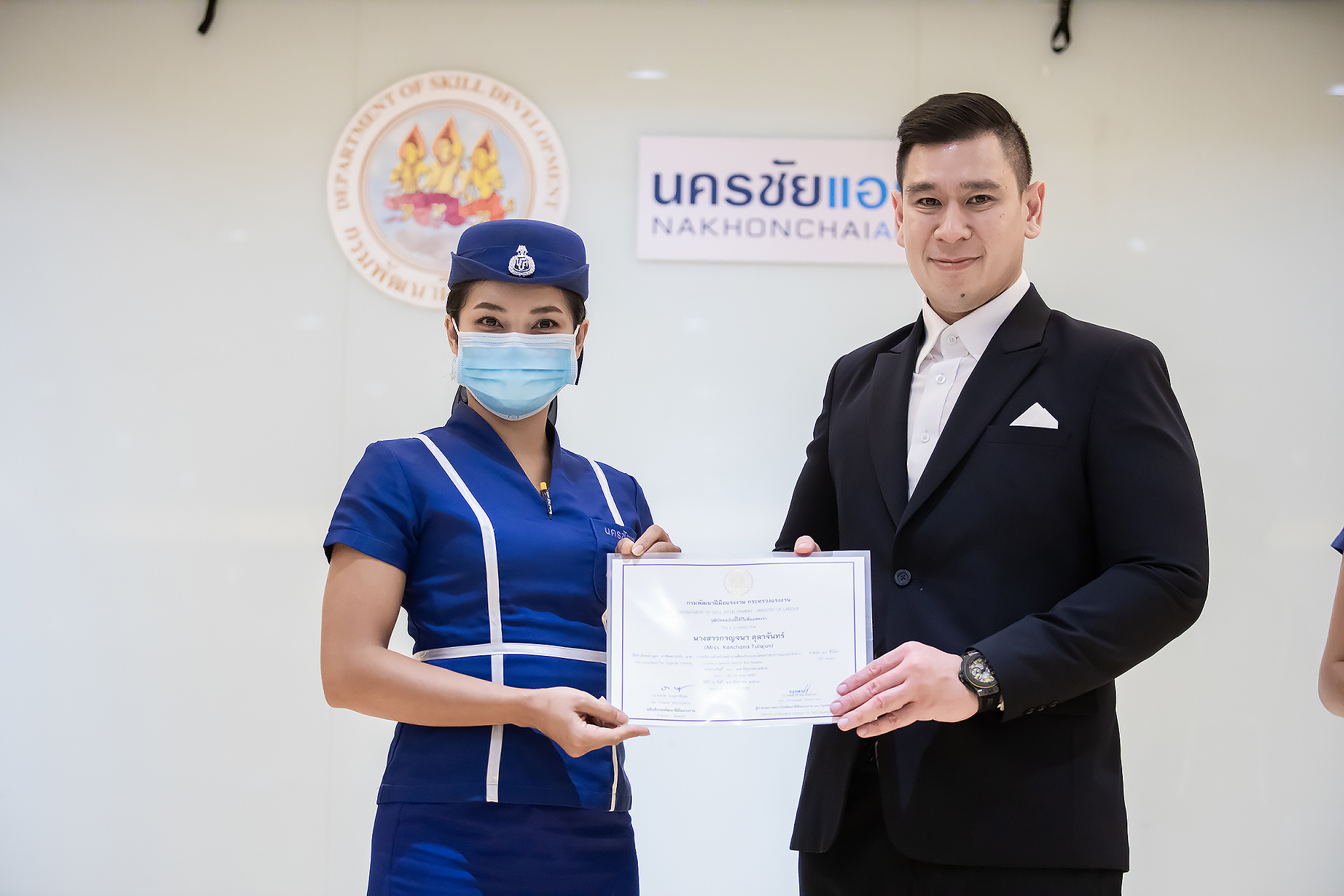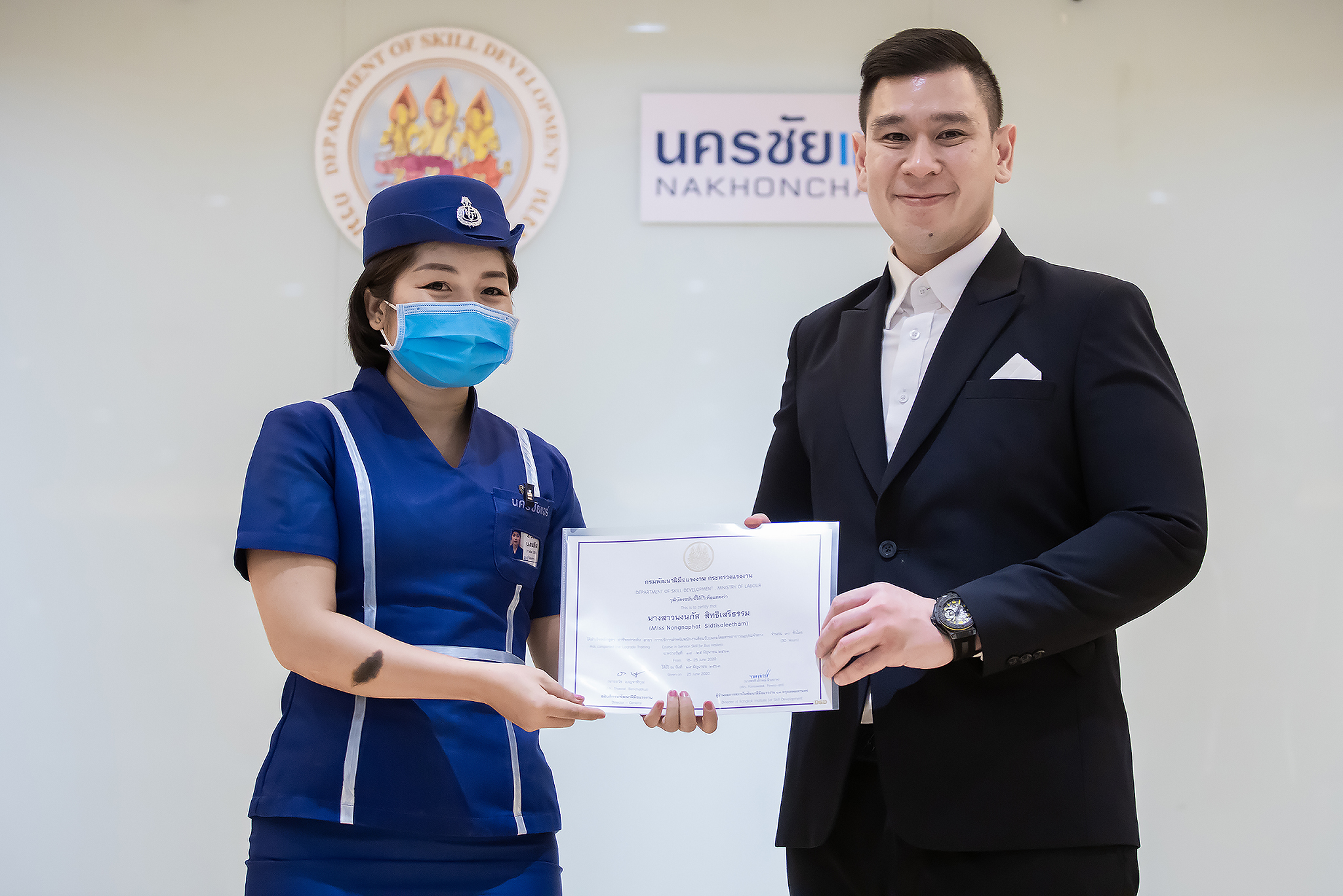 วันนี้ (25 มิ.ย. 63) เวลา 15.00 น. ดร.ดวงฤทธิ์ เบ็ญจาธิกุล ชัยรุ่งเรือง ผู้ช่วยรัฐมนตรีประจำกระทรวงแรงงาน เป็นประธานมอบวุฒิบัตรและปิดโครงการพัฒนาทักษะแรงงานด้านการท่องเที่ยวและบริการหลักสูตรยกระดับฝีมือ สาขาการบริการสำหรับพนักงานต้อนรับบนรถโดยสารสาธารณะประจำทาง ให้แก่พนักงานบริษัท นครชัยแอร์ จำกัด ซึ่งมีผู้เข้าร่วมการอบรมจำนวน 49 คน รวมระยะเวลาการฝึกอบรม 30 ชั่วโมง โดยมี นางเธียรรัตน์ นะวะมะวัฒน์ รองปลัดกระทรวงแรงงาน นายวิชัย ผิวสอาด รองอธิบดีกรมพัฒนาฝีมือแรงงาน และคณะผู้บริหาร ให้เกียรติเข้าร่วมพิธีปิดโครงการ ณ อาคาร 1 ชั้น 3 ห้องจักรินทร์-หฤทัย บริษัทนครชัยแอร์ จำกัด เขตจตุจักร กรุงเทพมหานคร