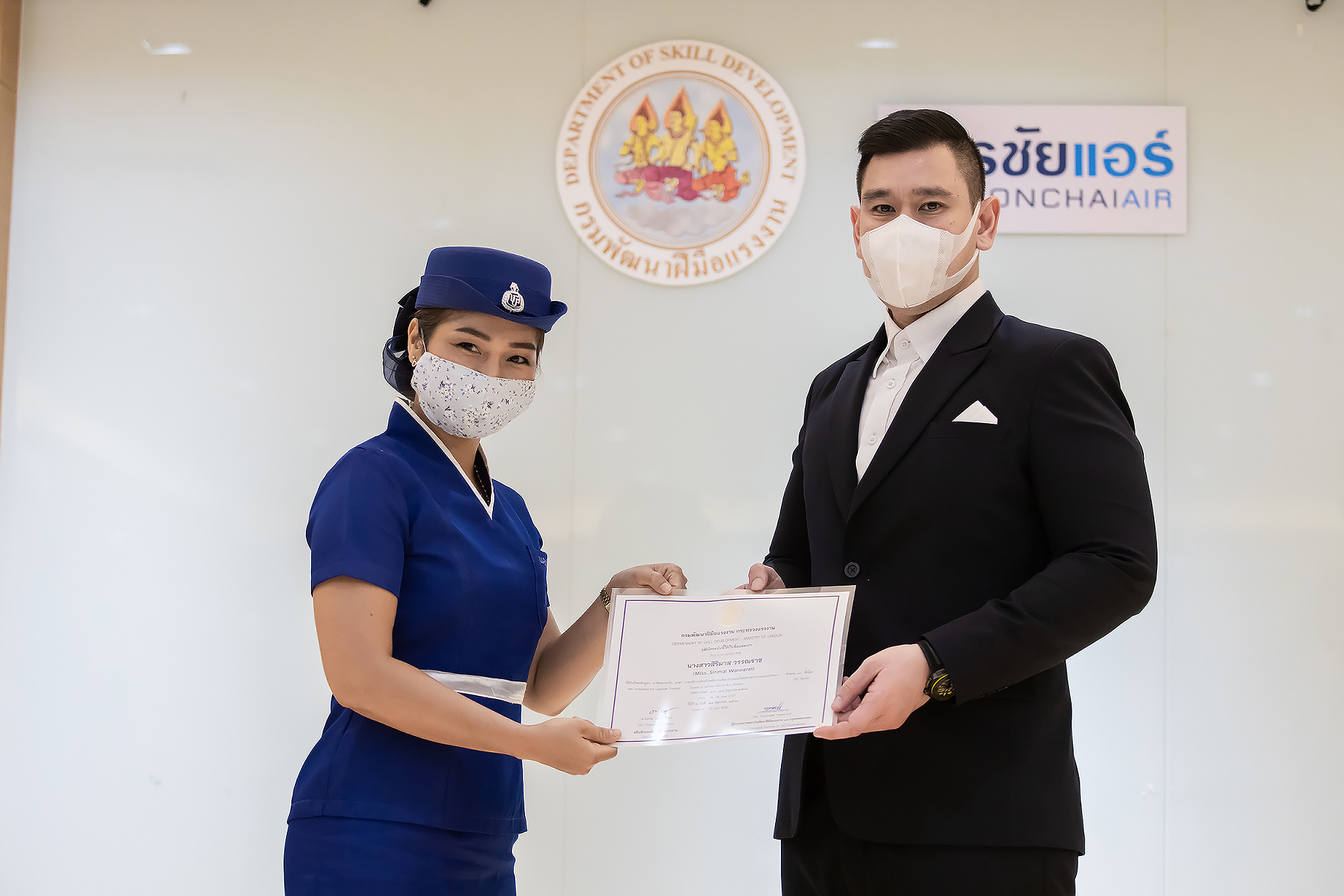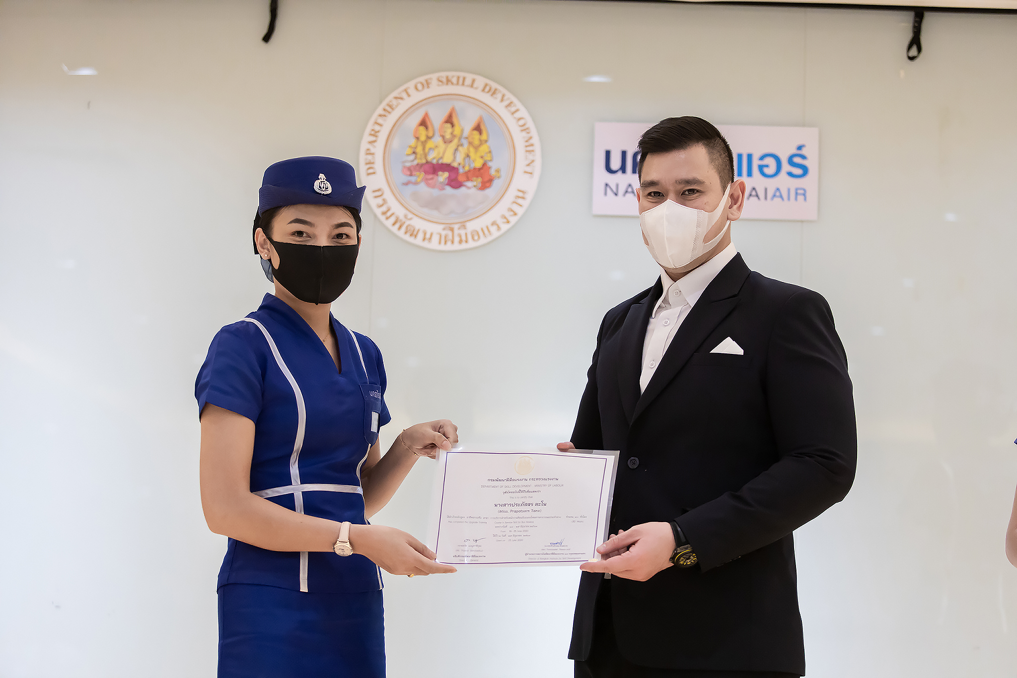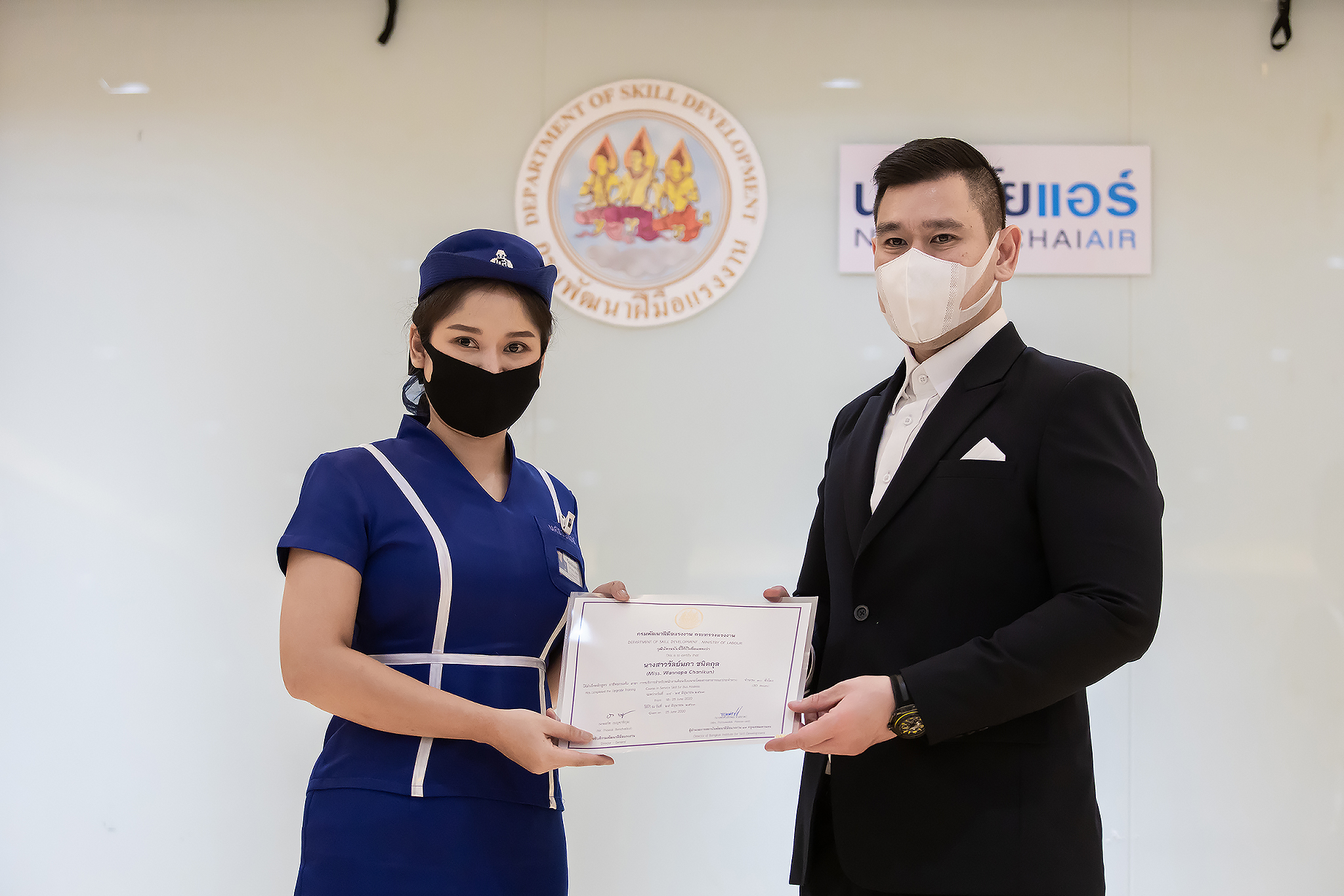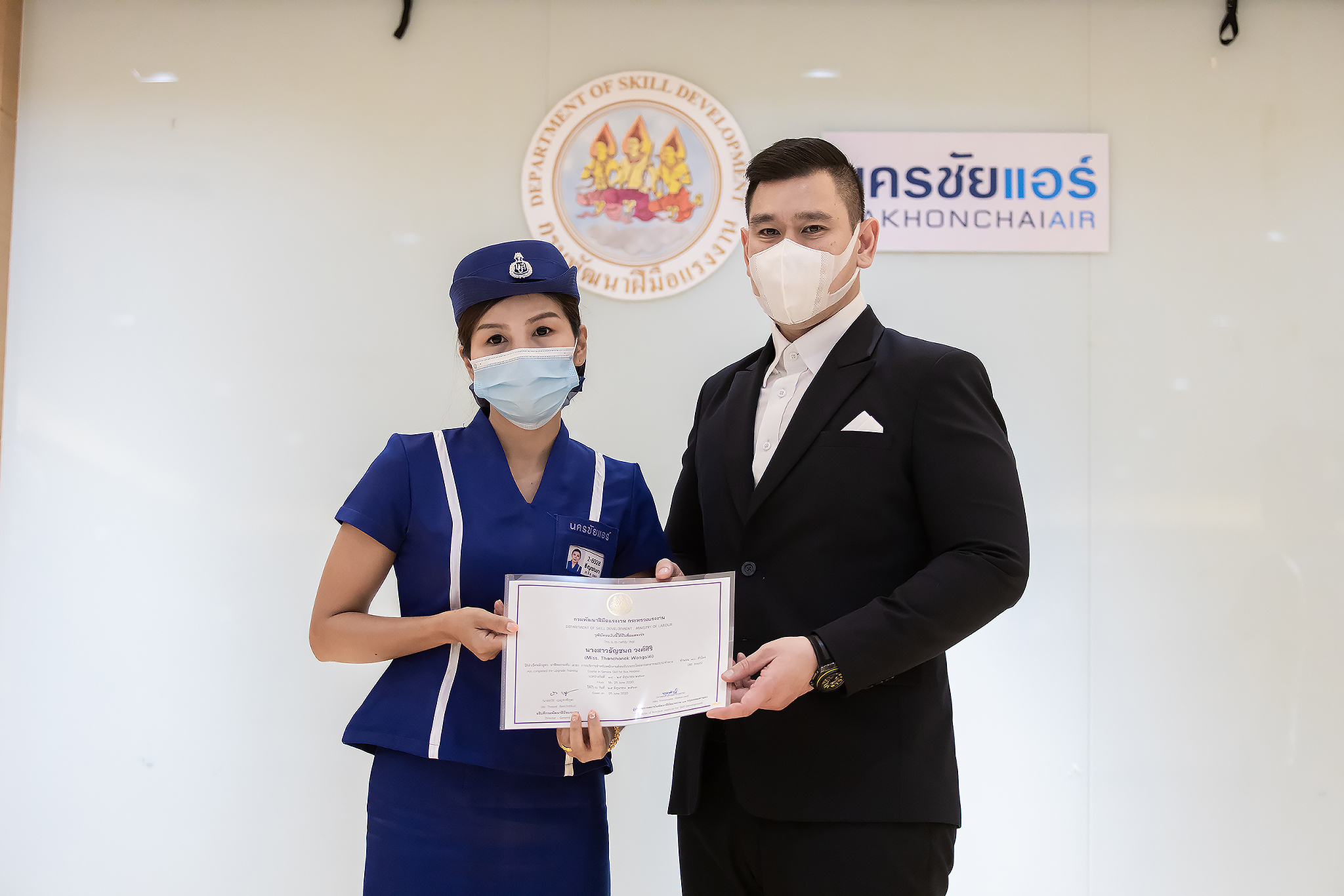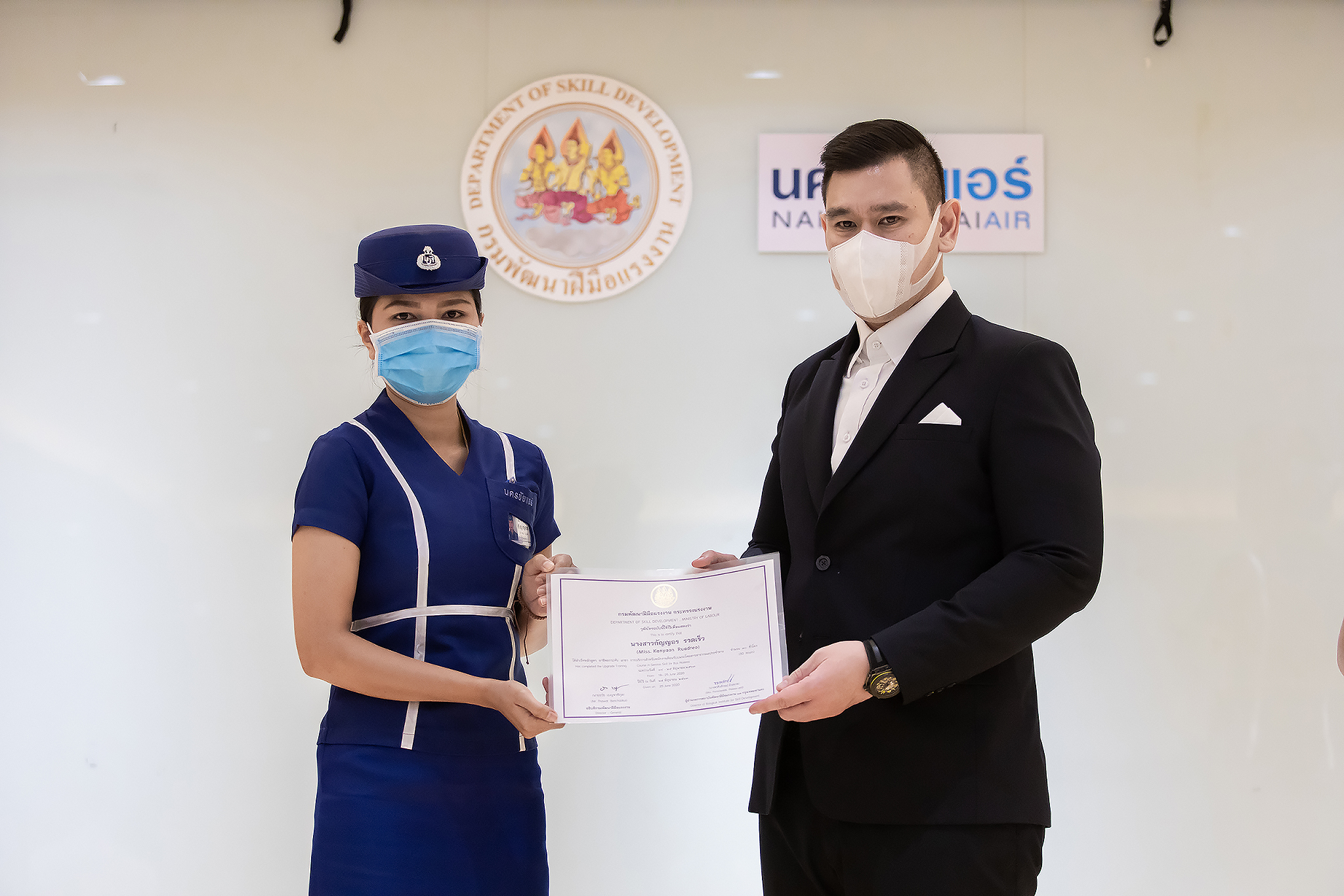 วันนี้ (25 มิ.ย. 63) เวลา 15.00 น. ดร.ดวงฤทธิ์ เบ็ญจาธิกุล ชัยรุ่งเรือง ผู้ช่วยรัฐมนตรีประจำกระทรวงแรงงาน เป็นประธานมอบวุฒิบัตรและปิดโครงการพัฒนาทักษะแรงงานด้านการท่องเที่ยวและบริการหลักสูตรยกระดับฝีมือ สาขาการบริการสำหรับพนักงานต้อนรับบนรถโดยสารสาธารณะประจำทาง ให้แก่พนักงานบริษัท นครชัยแอร์ จำกัด ซึ่งมีผู้เข้าร่วมการอบรมจำนวน 49 คน รวมระยะเวลาการฝึกอบรม 30 ชั่วโมง โดยมี นางเธียรรัตน์ นะวะมะวัฒน์ รองปลัดกระทรวงแรงงาน นายวิชัย ผิวสอาด รองอธิบดีกรมพัฒนาฝีมือแรงงาน และคณะผู้บริหาร ให้เกียรติเข้าร่วมพิธีปิดโครงการ ณ อาคาร 1 ชั้น 3 ห้องจักรินทร์-หฤทัย บริษัทนครชัยแอร์ จำกัด เขตจตุจักร กรุงเทพมหานคร