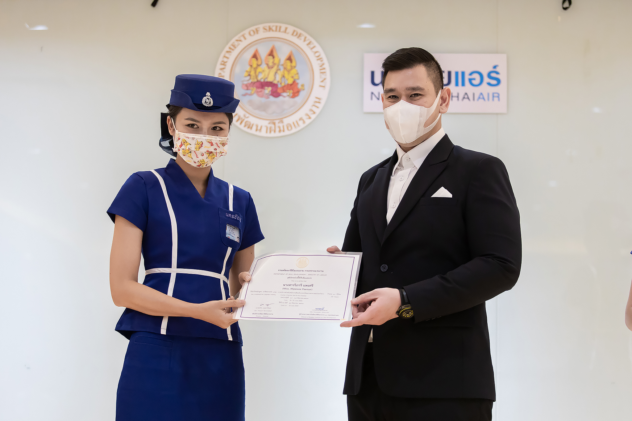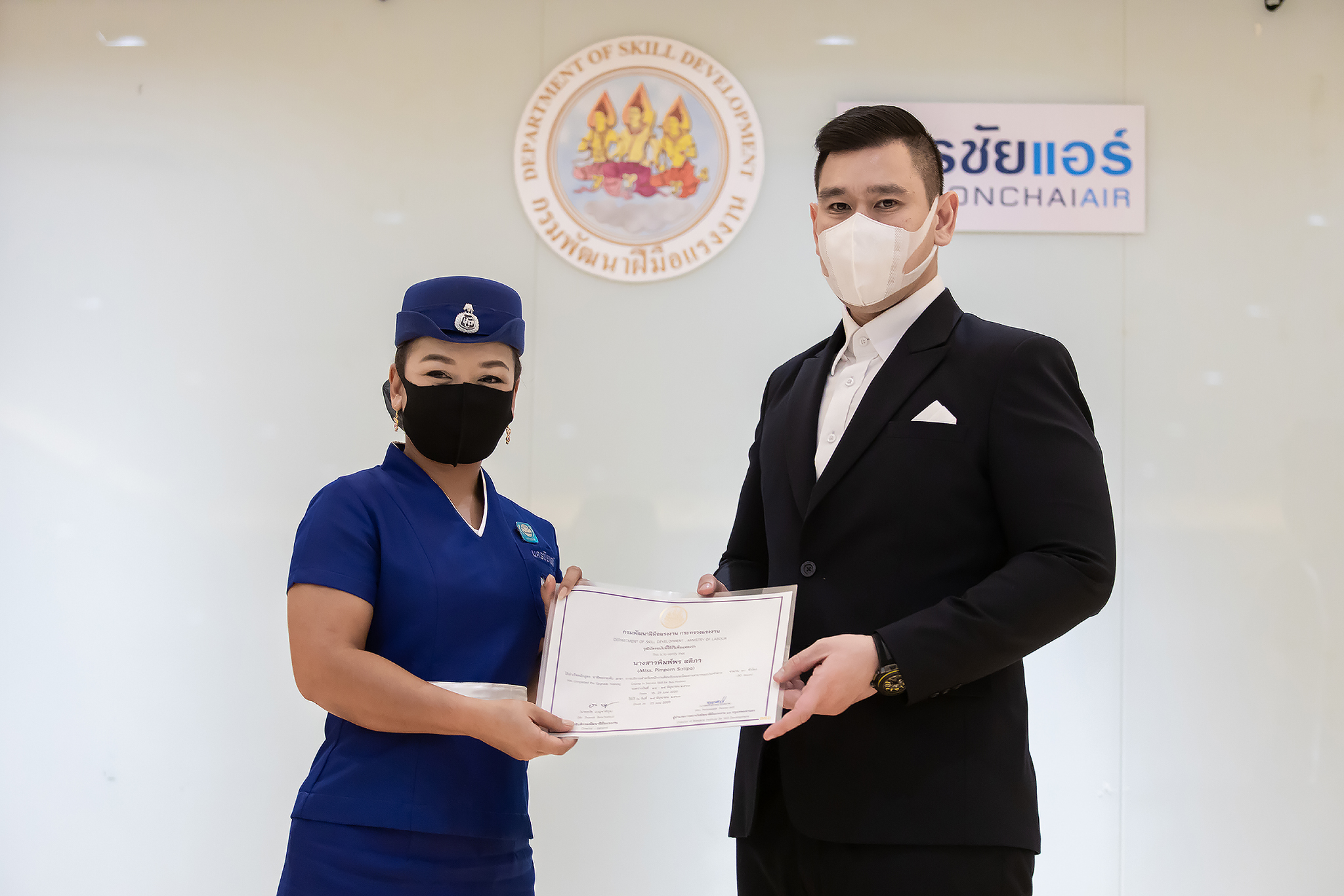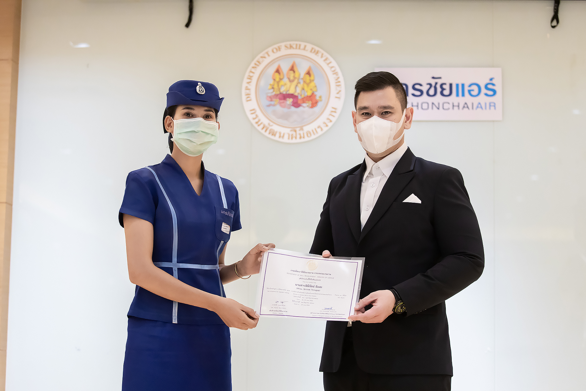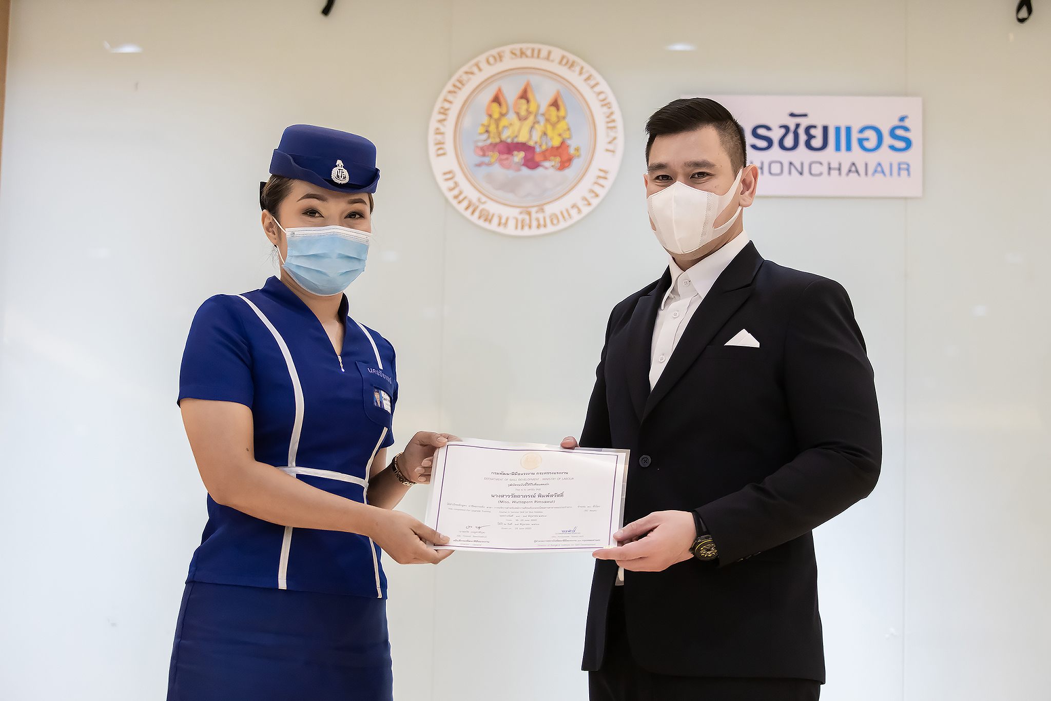 วันนี้ (25 มิ.ย. 63) เวลา 15.00 น. ดร.ดวงฤทธิ์ เบ็ญจาธิกุล ชัยรุ่งเรือง ผู้ช่วยรัฐมนตรีประจำกระทรวงแรงงาน เป็นประธานมอบวุฒิบัตรและปิดโครงการพัฒนาทักษะแรงงานด้านการท่องเที่ยวและบริการหลักสูตรยกระดับฝีมือ สาขาการบริการสำหรับพนักงานต้อนรับบนรถโดยสารสาธารณะประจำทาง ให้แก่พนักงานบริษัท นครชัยแอร์ จำกัด ซึ่งมีผู้เข้าร่วมการอบรมจำนวน 49 คน รวมระยะเวลาการฝึกอบรม 30 ชั่วโมง โดยมี นางเธียรรัตน์ นะวะมะวัฒน์ รองปลัดกระทรวงแรงงาน นายวิชัย ผิวสอาด รองอธิบดีกรมพัฒนาฝีมือแรงงาน และคณะผู้บริหาร ให้เกียรติเข้าร่วมพิธีปิดโครงการ ณ อาคาร 1 ชั้น 3 ห้องจักรินทร์-หฤทัย บริษัทนครชัยแอร์ จำกัด เขตจตุจักร กรุงเทพมหานคร