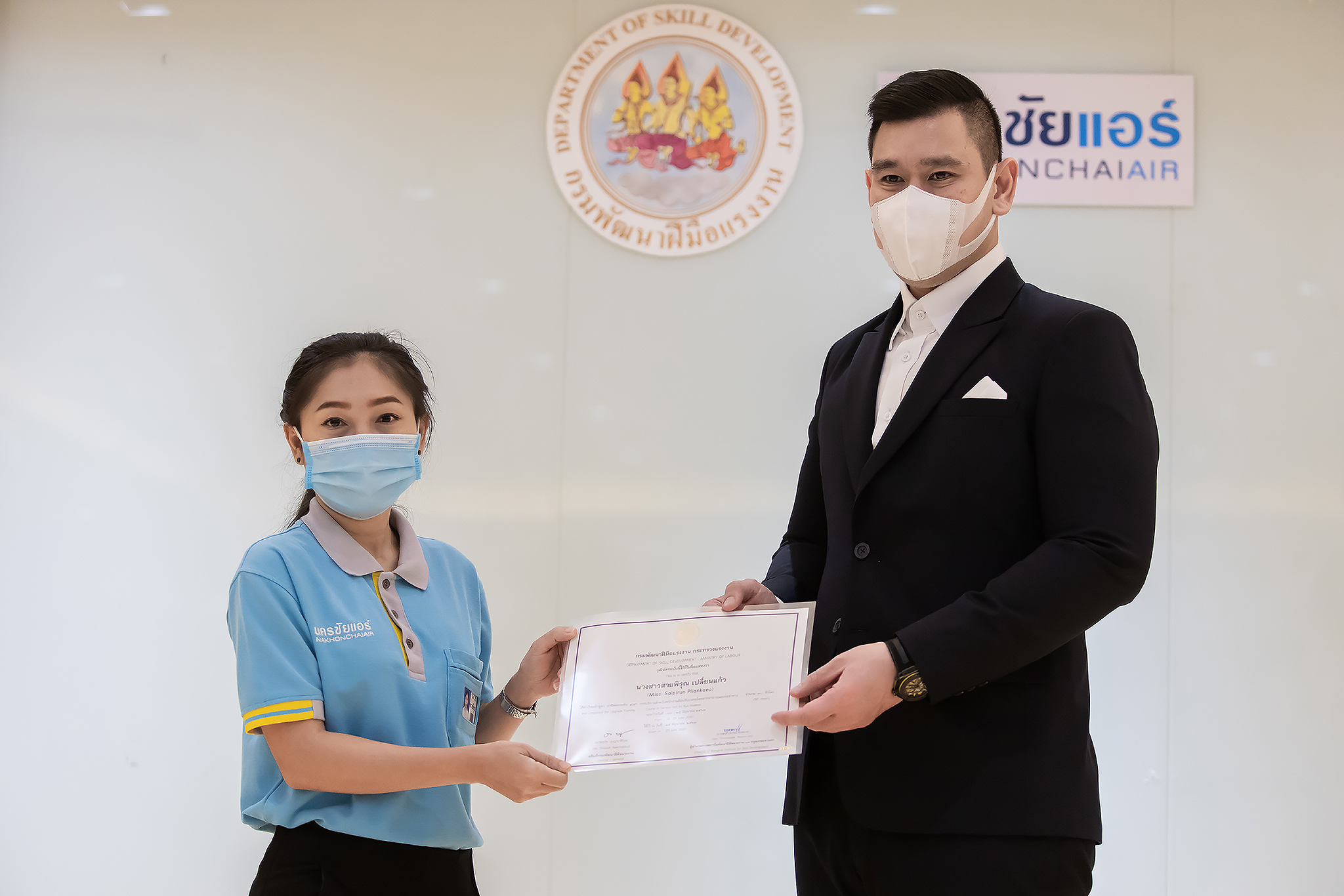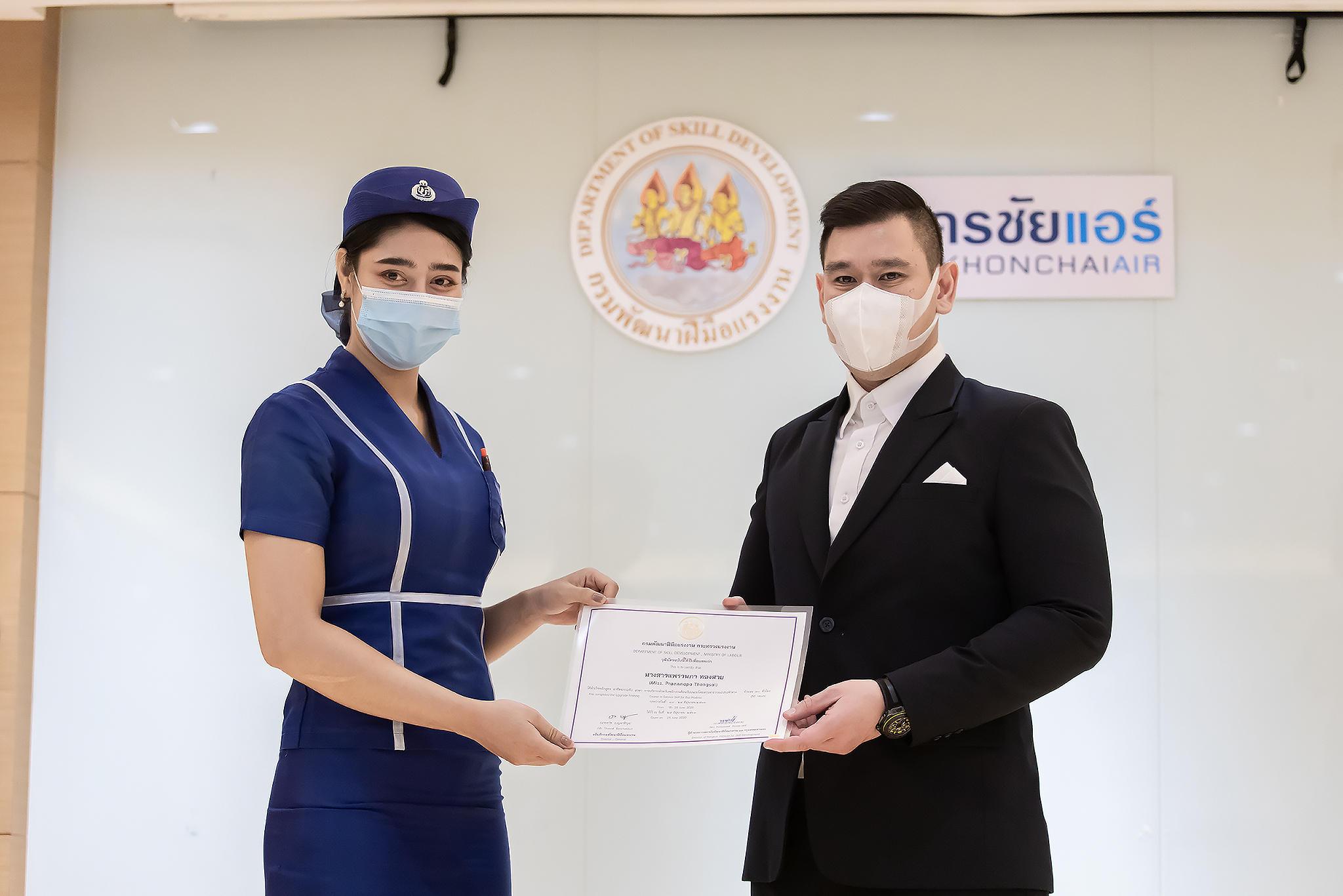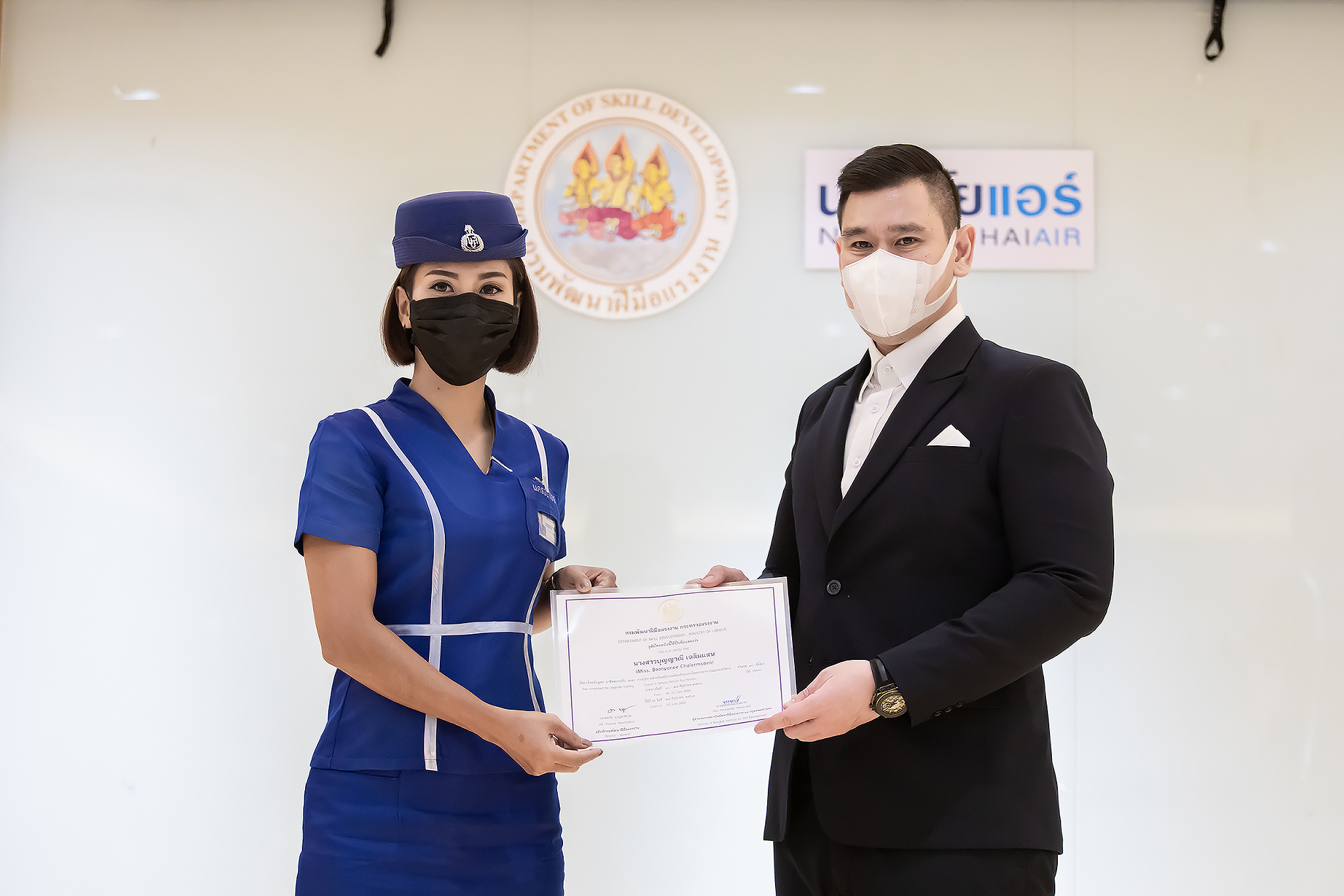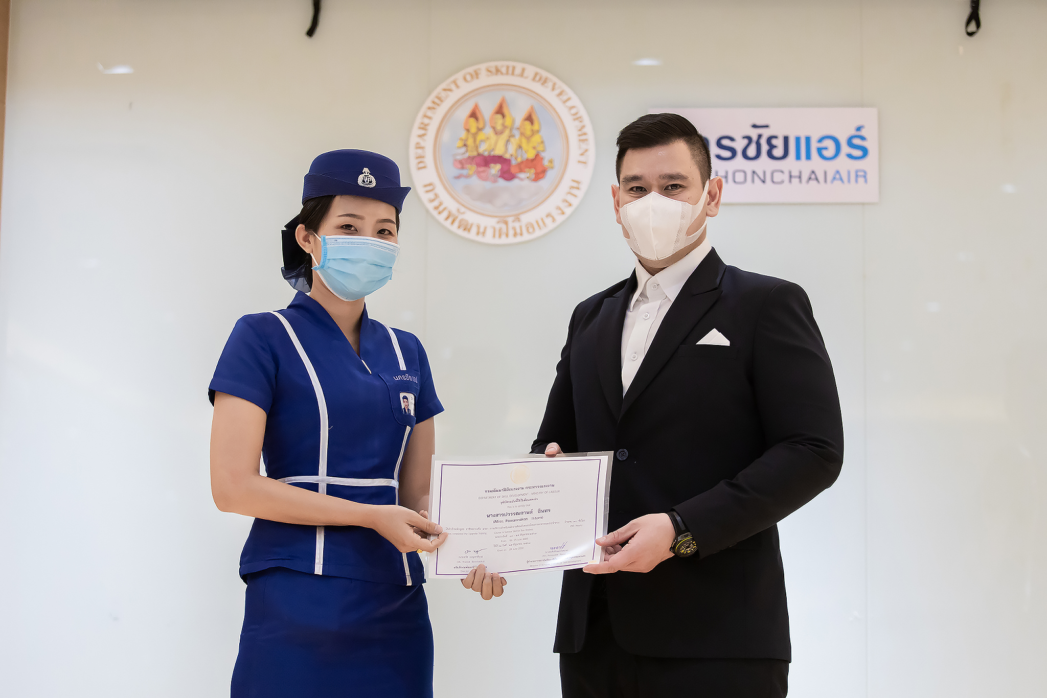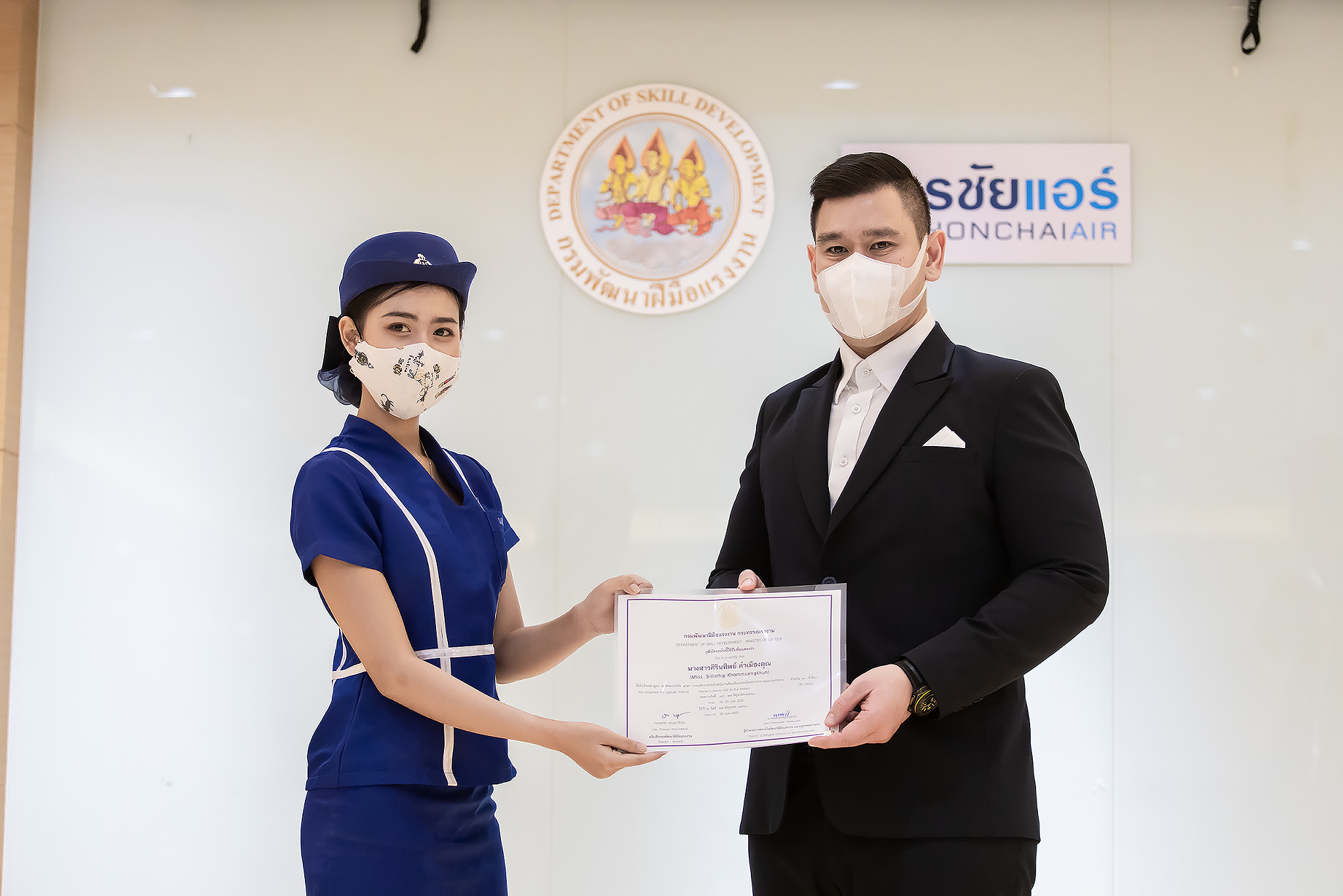 วันนี้ (25 มิ.ย. 63) เวลา 15.00 น. ดร.ดวงฤทธิ์ เบ็ญจาธิกุล ชัยรุ่งเรือง ผู้ช่วยรัฐมนตรีประจำกระทรวงแรงงาน เป็นประธานมอบวุฒิบัตรและปิดโครงการพัฒนาทักษะแรงงานด้านการท่องเที่ยวและบริการหลักสูตรยกระดับฝีมือ สาขาการบริการสำหรับพนักงานต้อนรับบนรถโดยสารสาธารณะประจำทาง ให้แก่พนักงานบริษัท นครชัยแอร์ จำกัด ซึ่งมีผู้เข้าร่วมการอบรมจำนวน 49 คน รวมระยะเวลาการฝึกอบรม 30 ชั่วโมง โดยมี นางเธียรรัตน์ นะวะมะวัฒน์ รองปลัดกระทรวงแรงงาน นายวิชัย ผิวสอาด รองอธิบดีกรมพัฒนาฝีมือแรงงาน และคณะผู้บริหาร ให้เกียรติเข้าร่วมพิธีปิดโครงการ ณ อาคาร 1 ชั้น 3 ห้องจักรินทร์-หฤทัย บริษัทนครชัยแอร์ จำกัด เขตจตุจักร กรุงเทพมหานคร