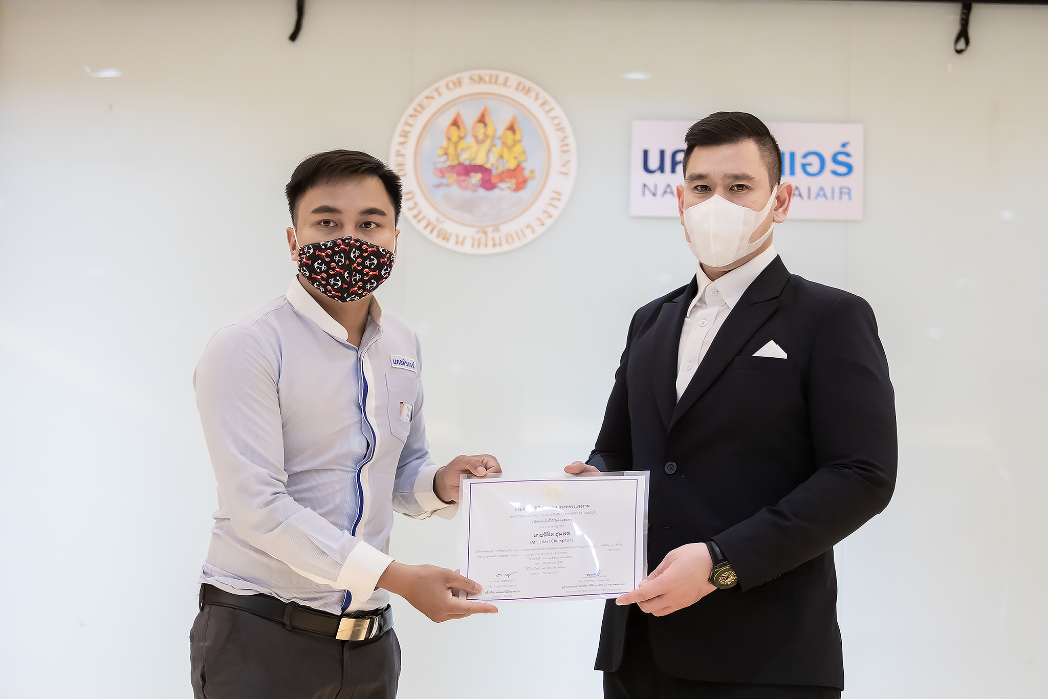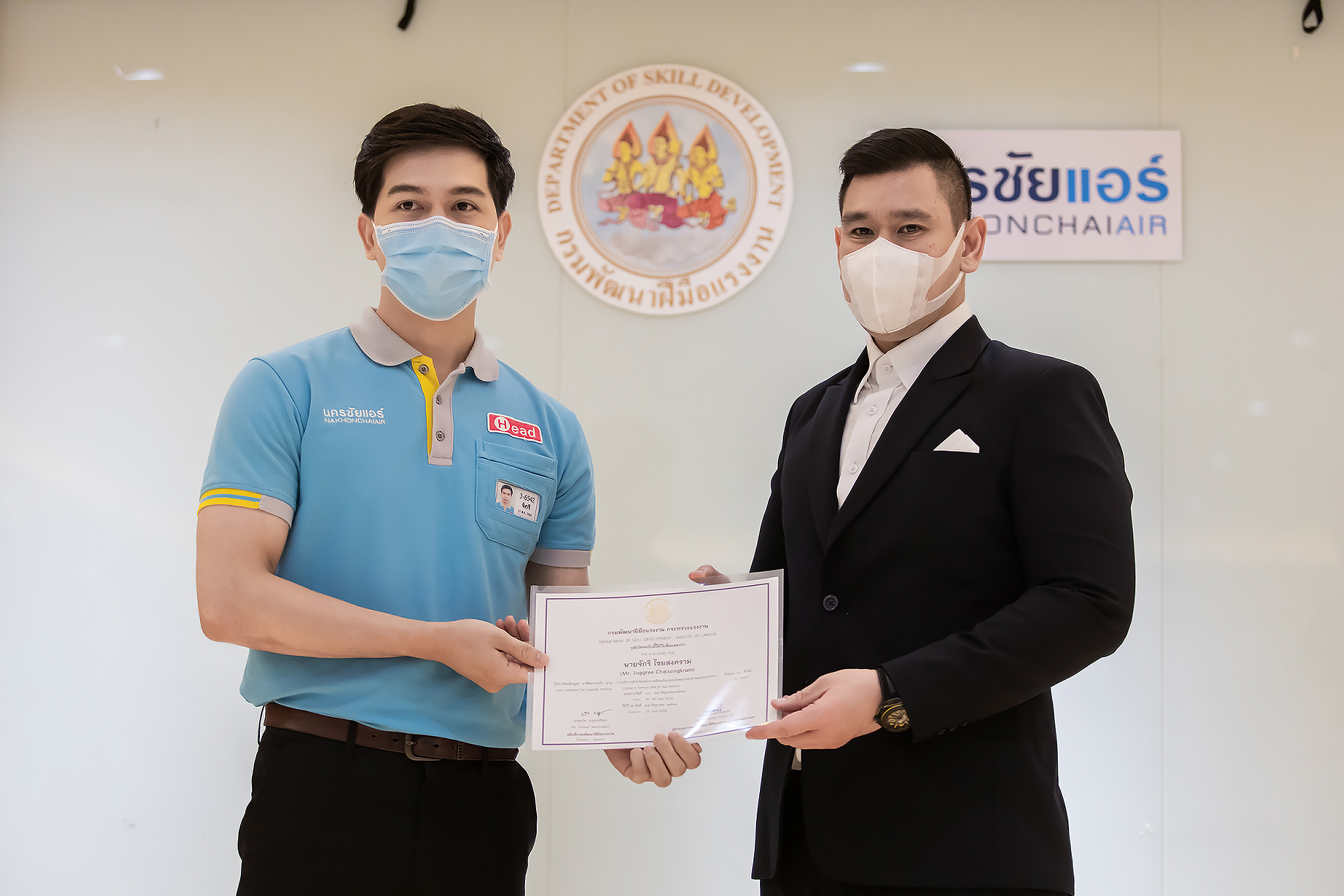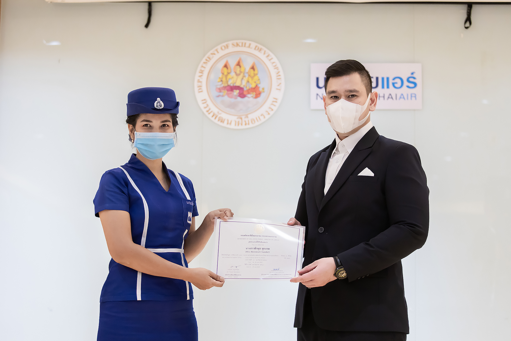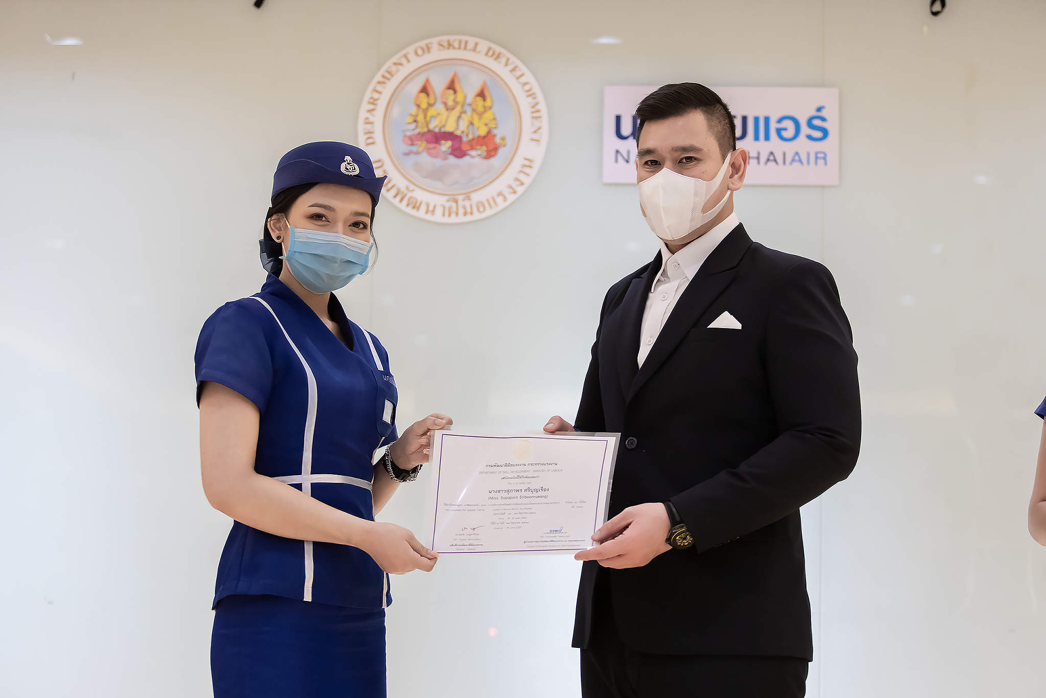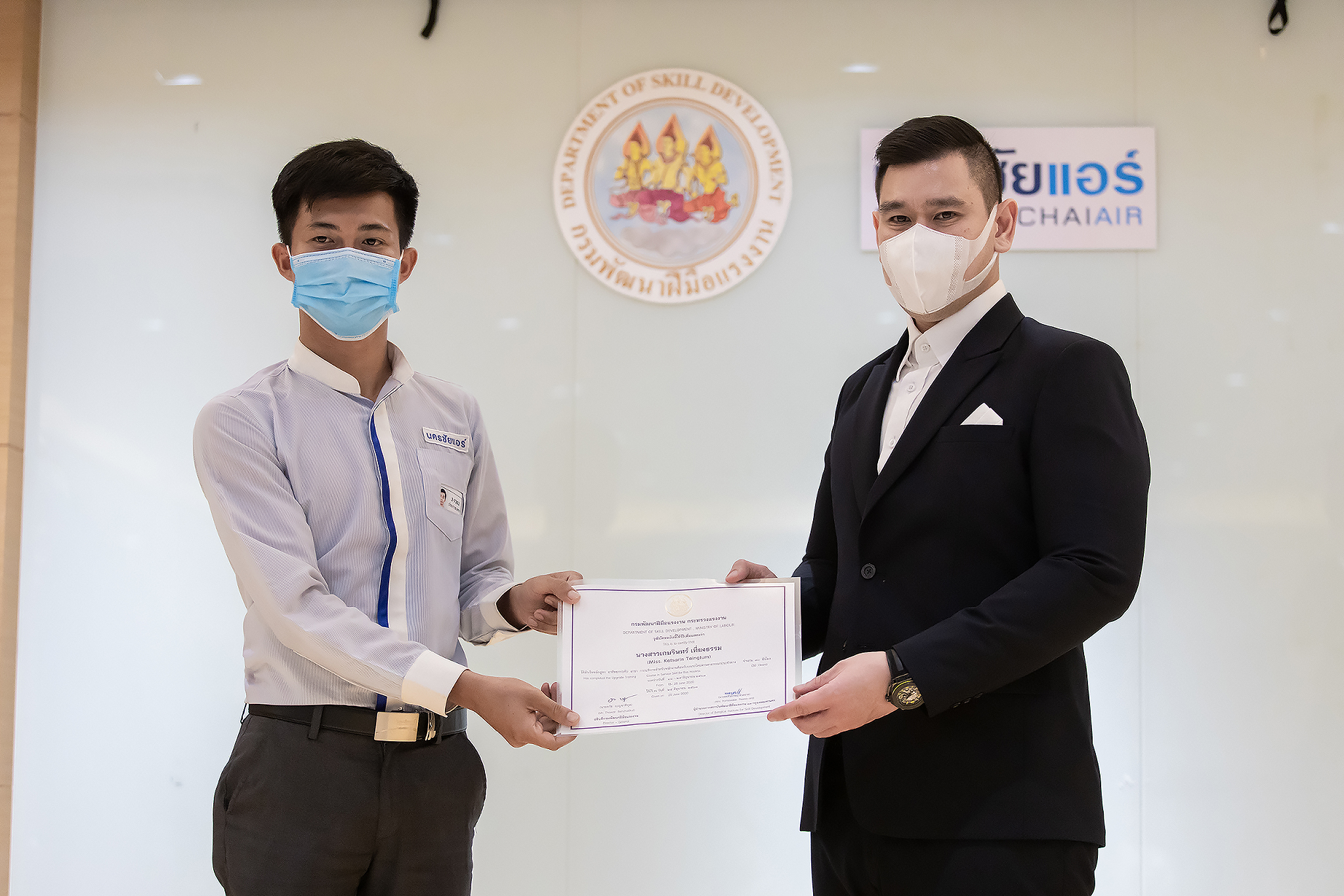 วันนี้ (25 มิ.ย. 63) เวลา 15.00 น. ดร.ดวงฤทธิ์ เบ็ญจาธิกุล ชัยรุ่งเรือง ผู้ช่วยรัฐมนตรีประจำกระทรวงแรงงาน เป็นประธานมอบวุฒิบัตรและปิดโครงการพัฒนาทักษะแรงงานด้านการท่องเที่ยวและบริการหลักสูตรยกระดับฝีมือ สาขาการบริการสำหรับพนักงานต้อนรับบนรถโดยสารสาธารณะประจำทาง ให้แก่พนักงานบริษัท นครชัยแอร์ จำกัด ซึ่งมีผู้เข้าร่วมการอบรมจำนวน 49 คน รวมระยะเวลาการฝึกอบรม 30 ชั่วโมง โดยมี นางเธียรรัตน์ นะวะมะวัฒน์ รองปลัดกระทรวงแรงงาน นายวิชัย ผิวสอาด รองอธิบดีกรมพัฒนาฝีมือแรงงาน และคณะผู้บริหาร ให้เกียรติเข้าร่วมพิธีปิดโครงการ ณ อาคาร 1 ชั้น 3 ห้องจักรินทร์-หฤทัย บริษัทนครชัยแอร์ จำกัด เขตจตุจักร กรุงเทพมหานคร