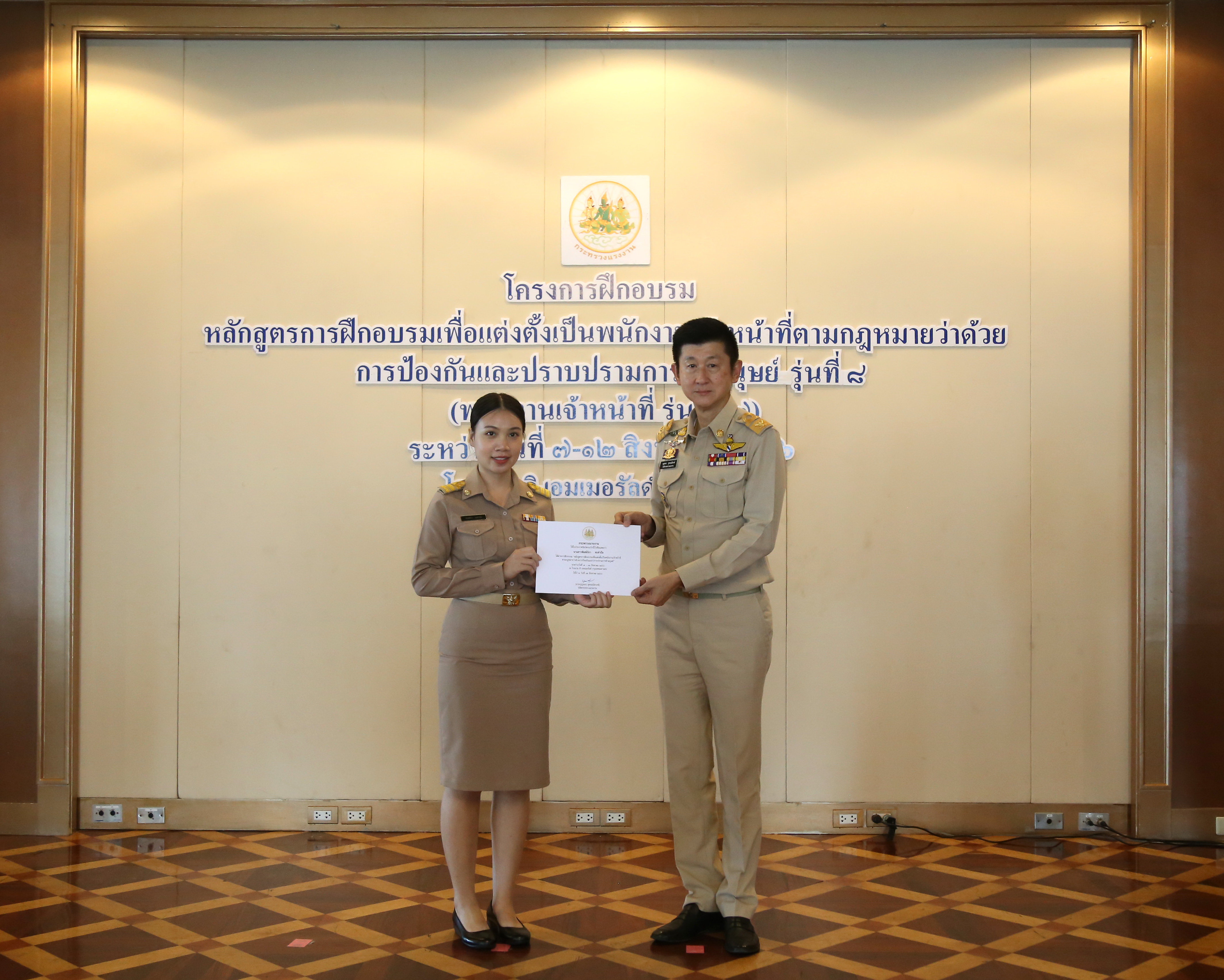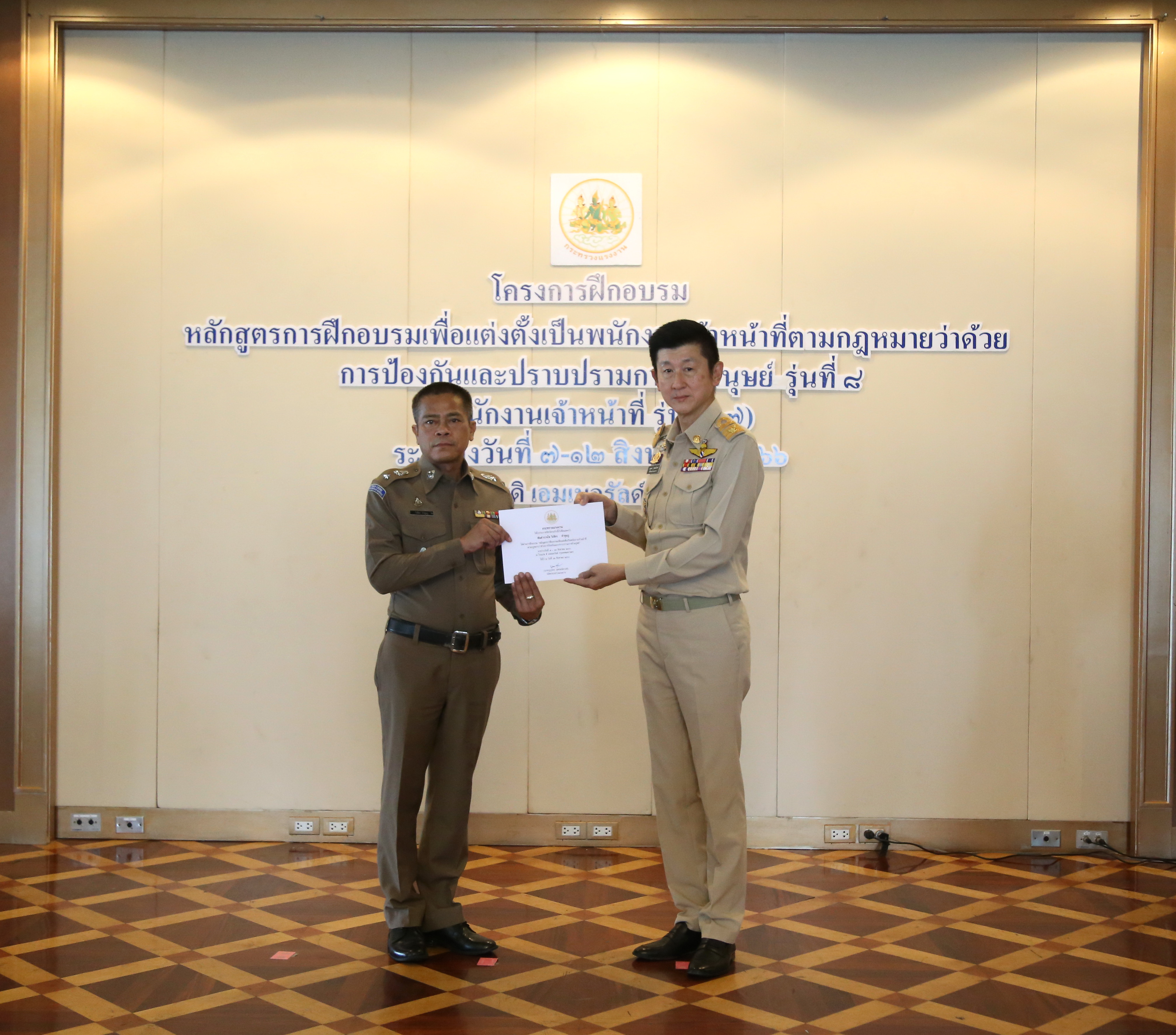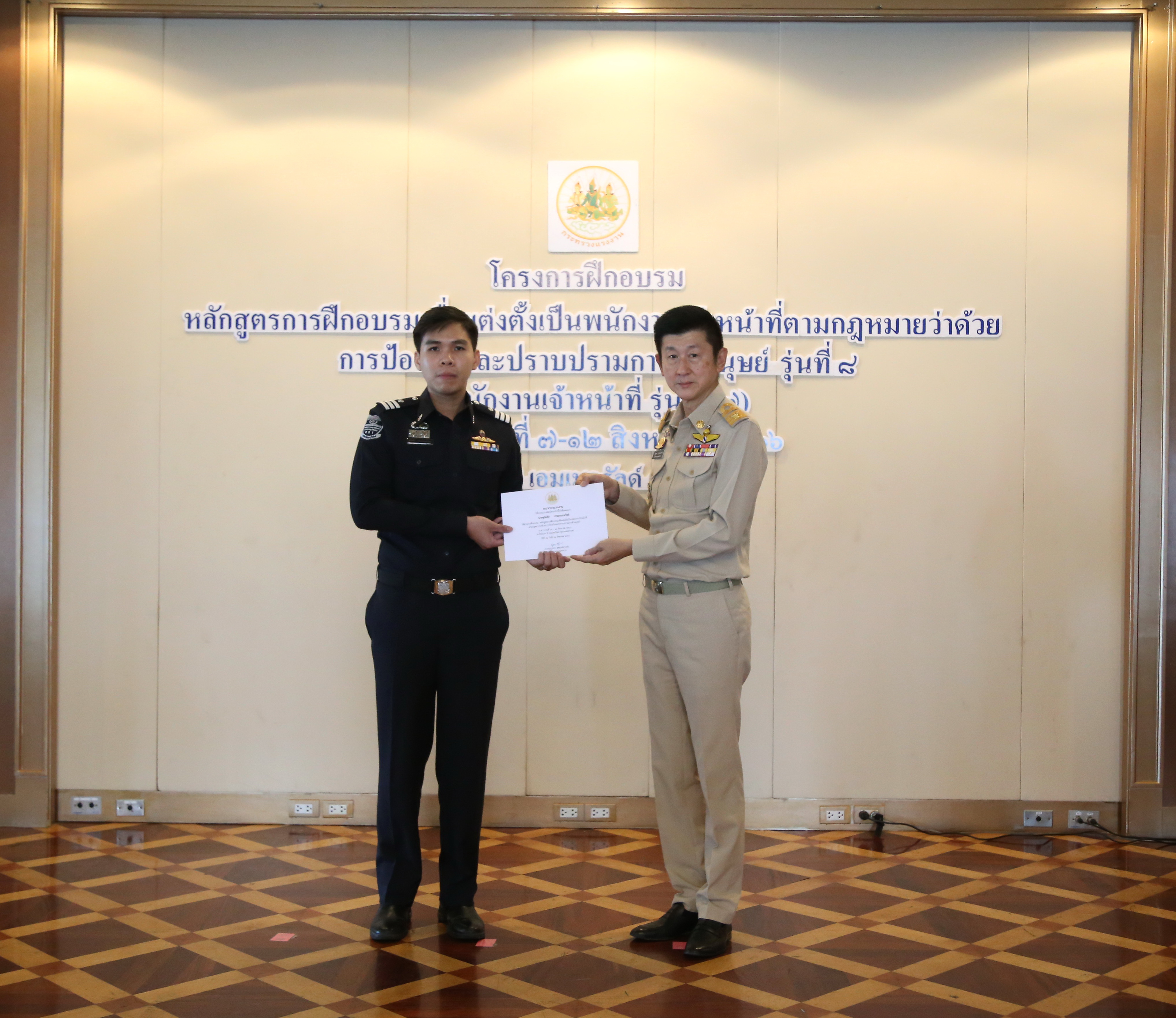 ทั้งนี้ ผู้เข้ารับการฝึกอบรมที่ได้รับมอบใบประกาศนียบัตรโครงการฝึกอบรมหลักสูตรการฝึกอบรมฯ เป็นเจ้าหน้าที่จากสำนักงานปลัดกระทรวงแรงงาน กรมสวัสดิการและคุ้มครองแรงงาน กรมการจัดหางาน กองอำนวยการรักษาความมั่นคงภายในราชอาณาจักร กรมสอบสวนคดีพิเศษ กรมการปกครอง และสำนักงานตำรวจแห่งชาติ ทั้งส่วนกลางและส่วนภูมิภาค รวมทั้งสิ้น 41 คน