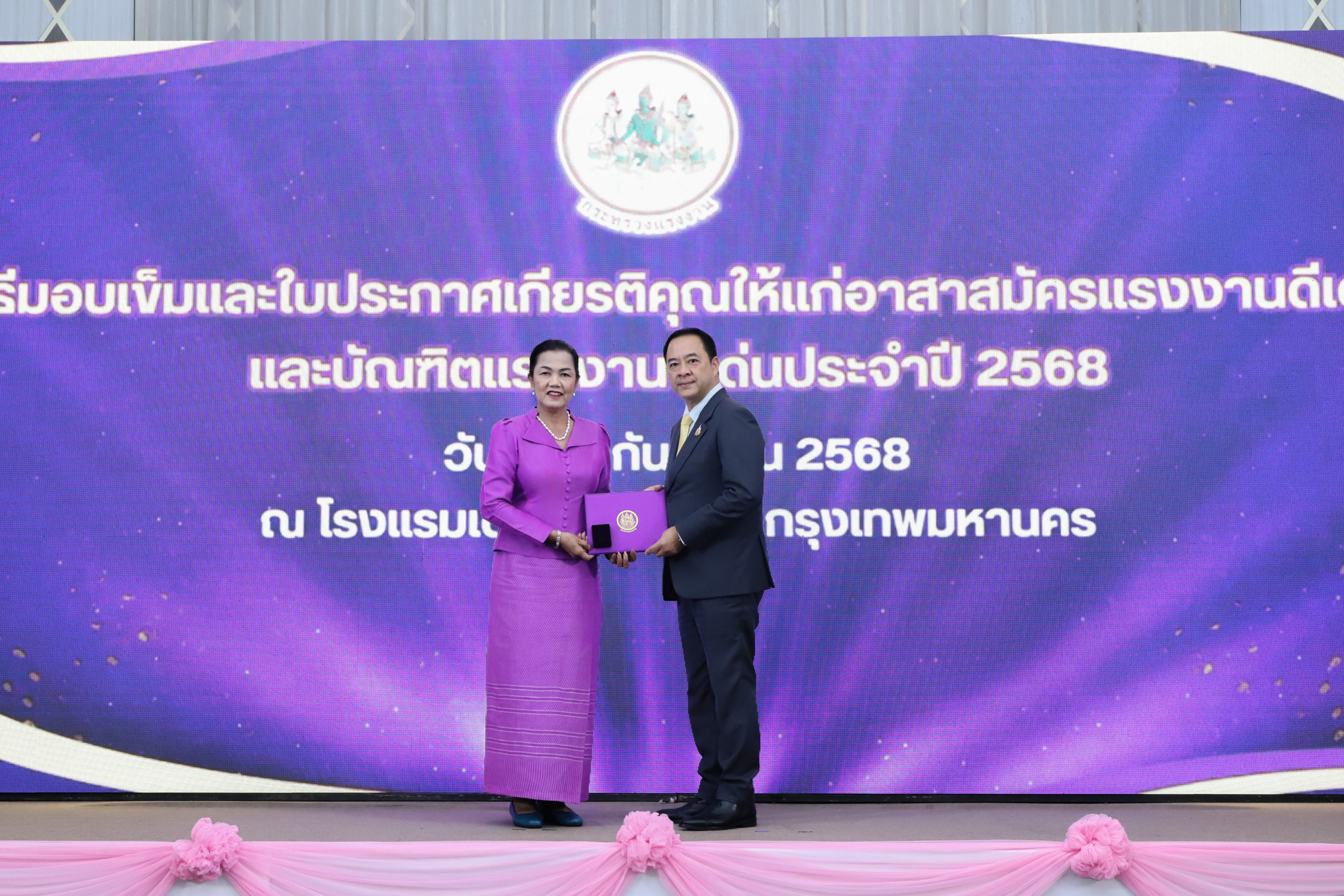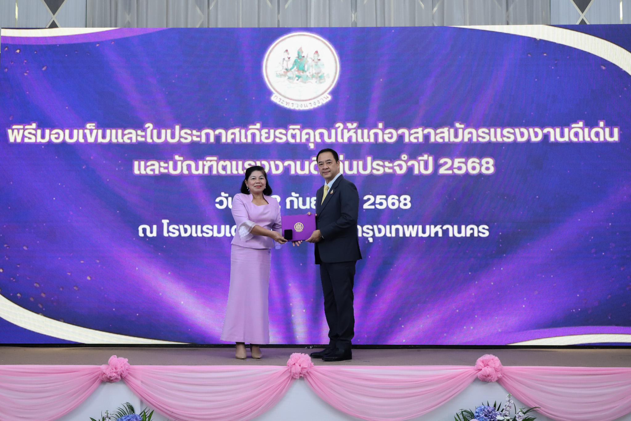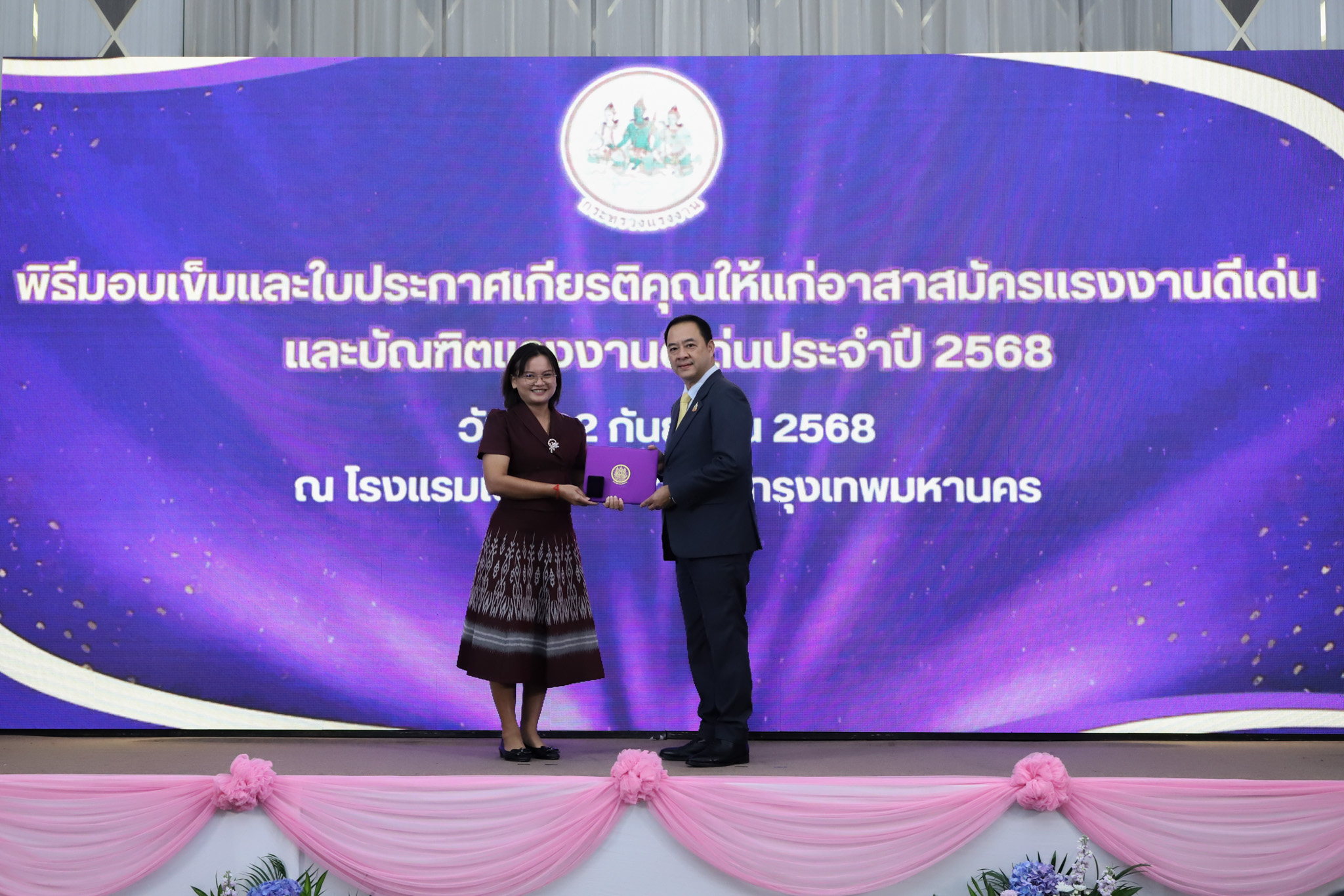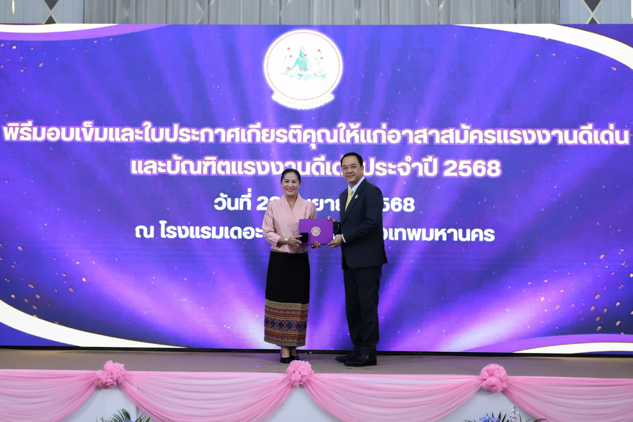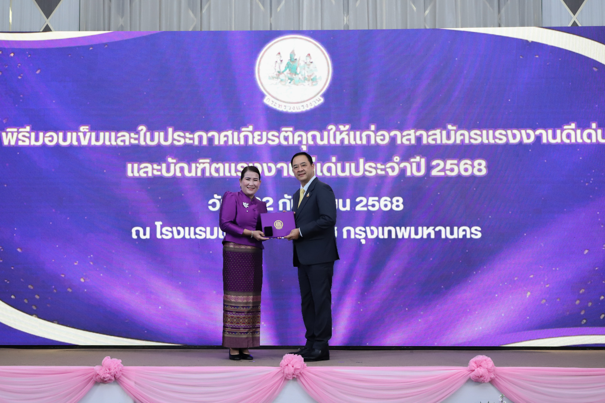 วันที่ 22 กันยายน 2568 เวลา 16.00 น. นายสมาสภ์ ปัทมะสุคนธ์ รองปลัดกระทรวงแรงงาน มอบเข็ม และใบประกาศเกียรติคุณให้แก่อาสาสมัครแรงงานดีเด่น และบัณฑิตแรงงานดีเด่น ประจำปี พ.ศ. 2568 โดยมี นายสิบหมื่นชัย โพธิสินธุ์ ผู้ตรวจราชการกระทรวงแรงงาน นายเกริกไกร นาสมยนต์ ที่ปรึกษากฎหมาย นายศักดินาถ สนธิศักดิ์โยธิน ผู้ช่วยปลัดกระทรวงแรงงาน และผู้บริหารกระทรวงแรงงาน ร่วมด้วย ณ ห้องแกรนด์พาลาสโซ ชั้น 7 โรงแรมพาลาสโซ ถนนรัชดาภิเษก เขตดินแดง กรุงเทพมหานคร