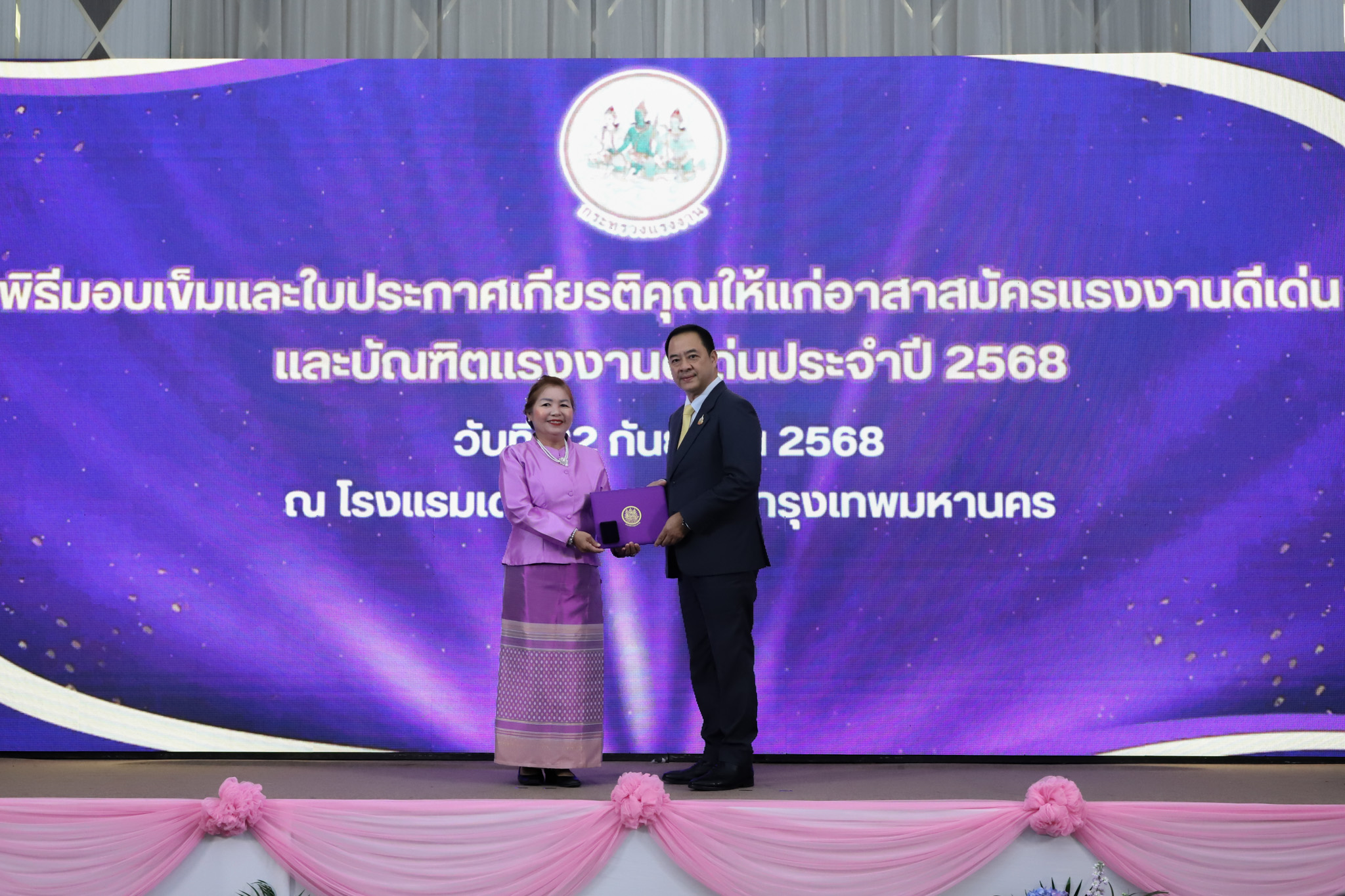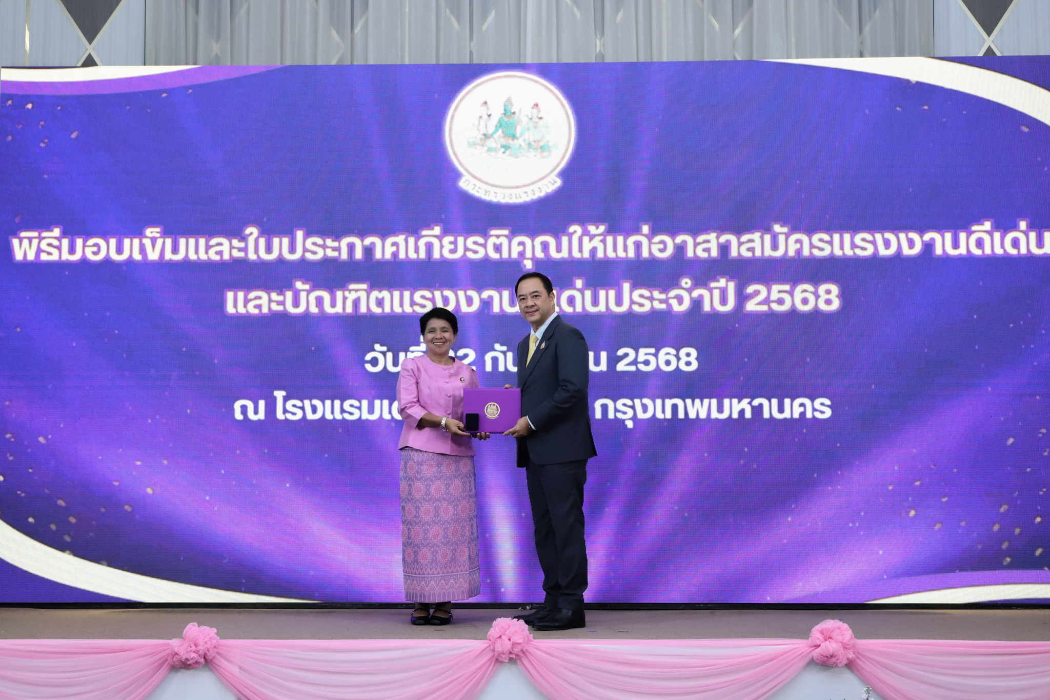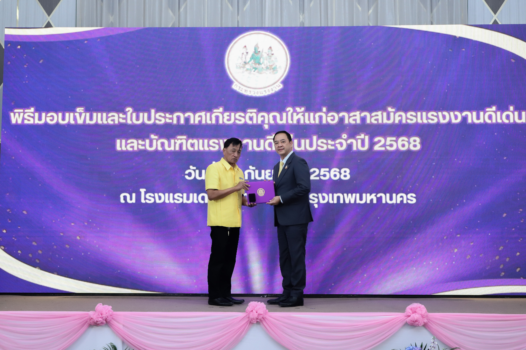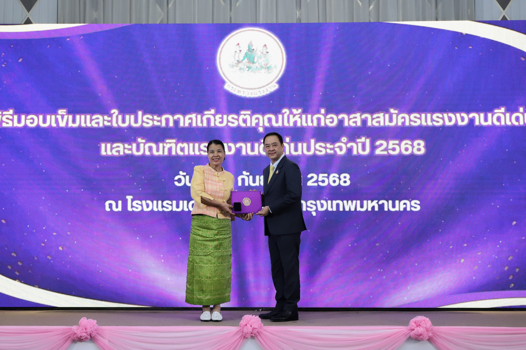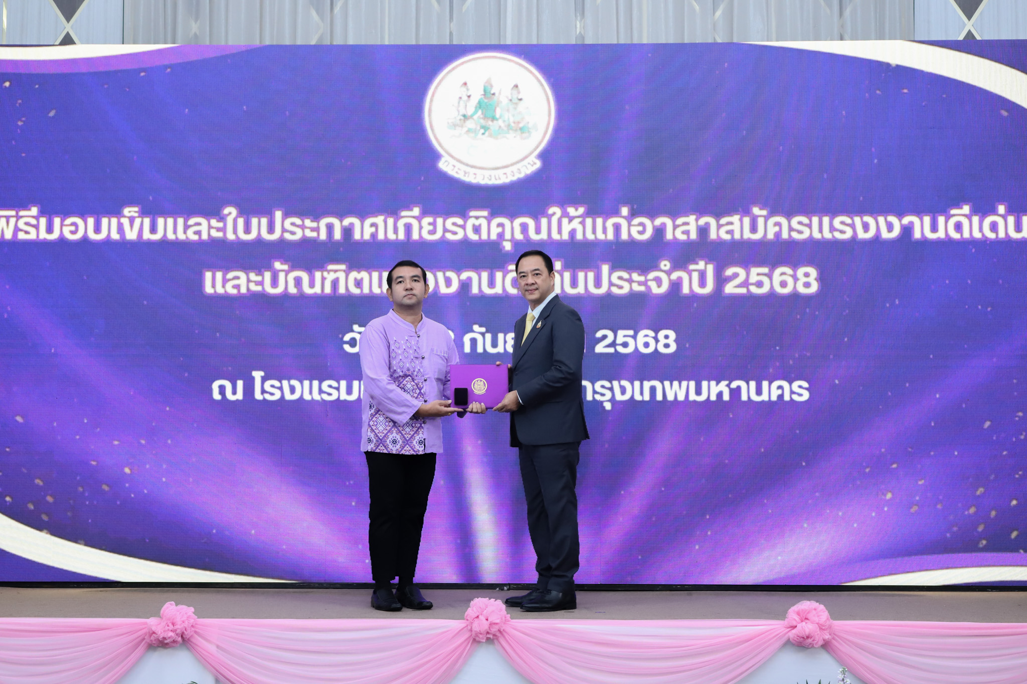 วันที่ 22 กันยายน 2568 เวลา 16.00 น. นายสมาสภ์ ปัทมะสุคนธ์ รองปลัดกระทรวงแรงงาน มอบเข็ม และใบประกาศเกียรติคุณให้แก่อาสาสมัครแรงงานดีเด่น และบัณฑิตแรงงานดีเด่น ประจำปี พ.ศ. 2568 โดยมี นายสิบหมื่นชัย โพธิสินธุ์ ผู้ตรวจราชการกระทรวงแรงงาน นายเกริกไกร นาสมยนต์ ที่ปรึกษากฎหมาย นายศักดินาถ สนธิศักดิ์โยธิน ผู้ช่วยปลัดกระทรวงแรงงาน และผู้บริหารกระทรวงแรงงาน ร่วมด้วย ณ ห้องแกรนด์พาลาสโซ ชั้น 7 โรงแรมพาลาสโซ ถนนรัชดาภิเษก เขตดินแดง กรุงเทพมหานคร