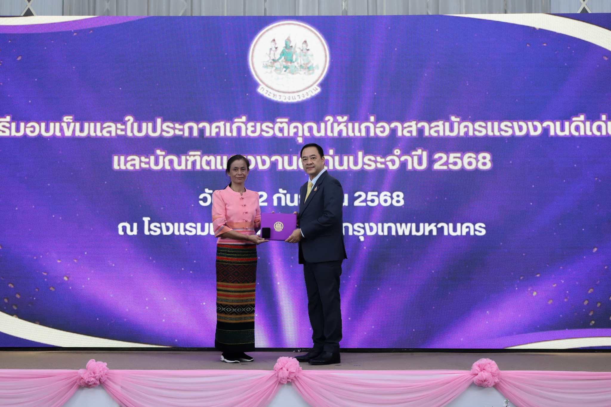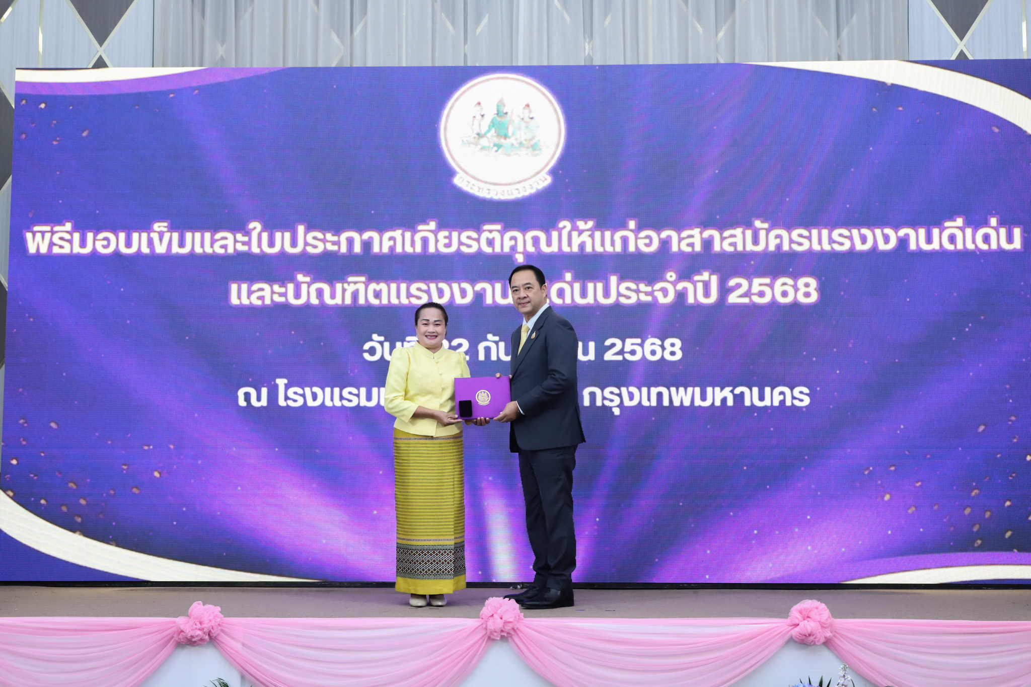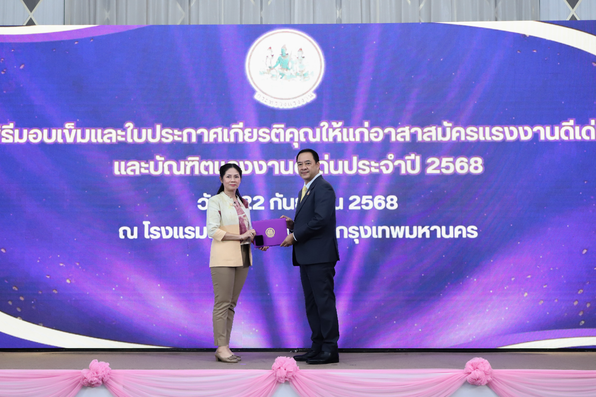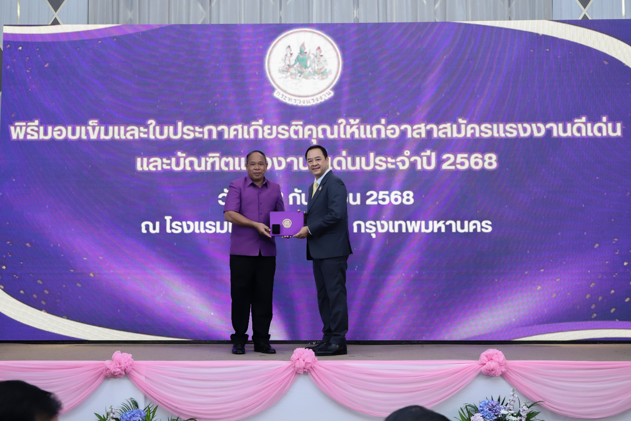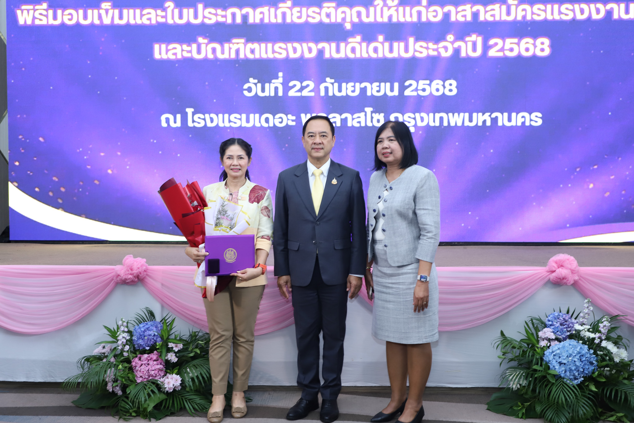 วันที่ 22 กันยายน 2568 เวลา 16.00 น. นายสมาสภ์ ปัทมะสุคนธ์ รองปลัดกระทรวงแรงงาน มอบเข็ม และใบประกาศเกียรติคุณให้แก่อาสาสมัครแรงงานดีเด่น และบัณฑิตแรงงานดีเด่น ประจำปี พ.ศ. 2568 โดยมี นายสิบหมื่นชัย โพธิสินธุ์ ผู้ตรวจราชการกระทรวงแรงงาน นายเกริกไกร นาสมยนต์ ที่ปรึกษากฎหมาย นายศักดินาถ สนธิศักดิ์โยธิน ผู้ช่วยปลัดกระทรวงแรงงาน และผู้บริหารกระทรวงแรงงาน ร่วมด้วย ณ ห้องแกรนด์พาลาสโซ ชั้น 7 โรงแรมพาลาสโซ ถนนรัชดาภิเษก เขตดินแดง กรุงเทพมหานคร