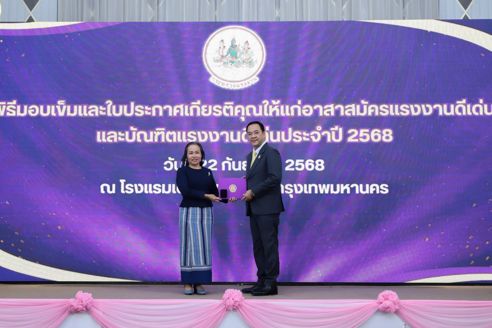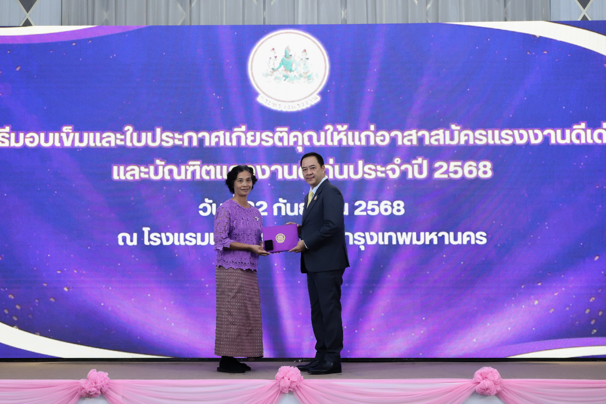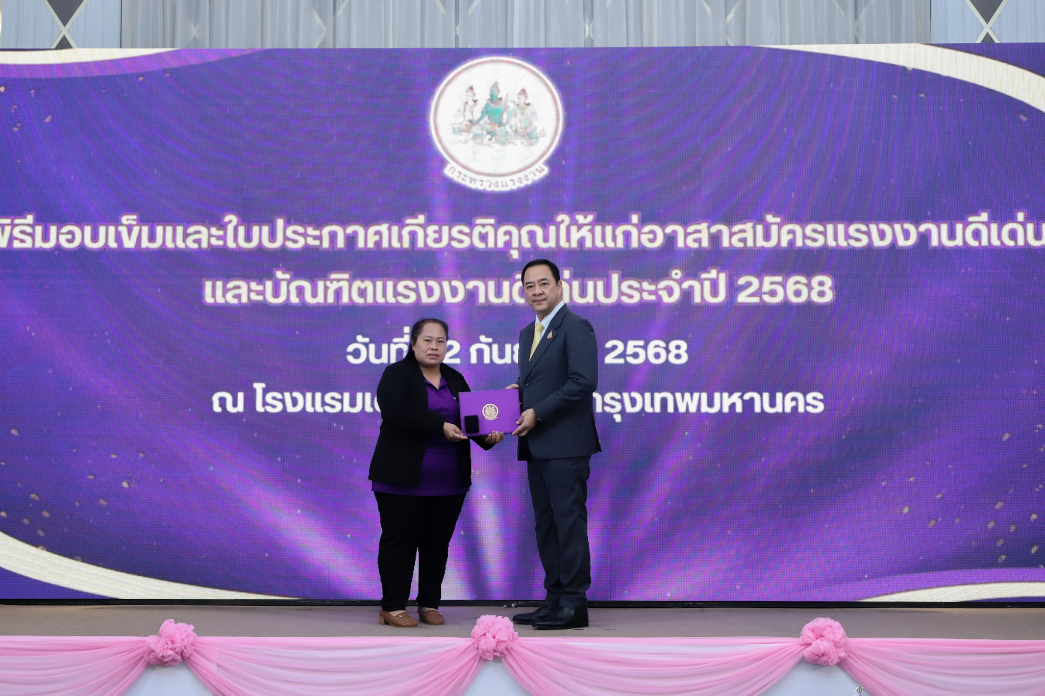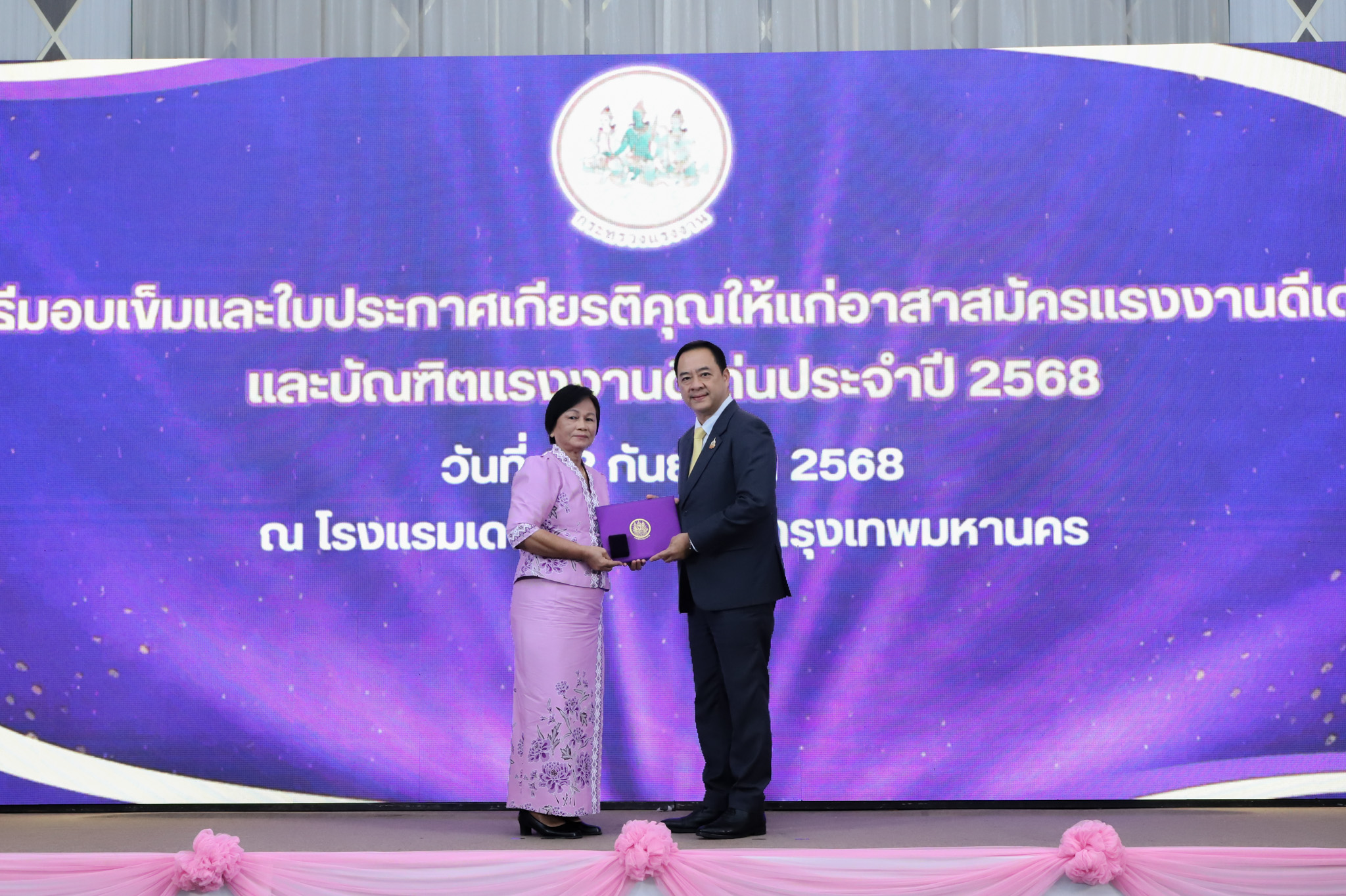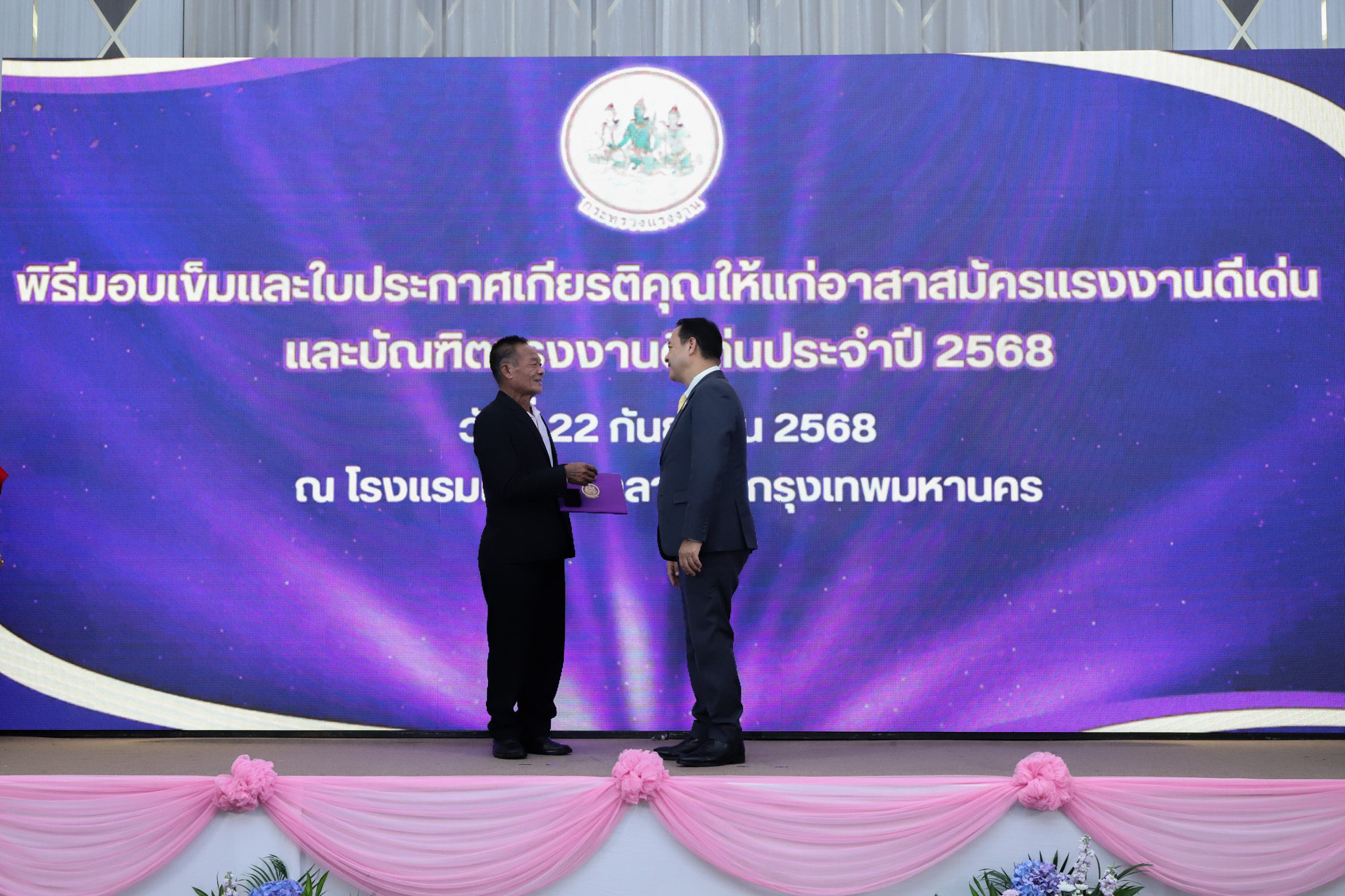 วันที่ 22 กันยายน 2568 เวลา 16.00 น. นายสมาสภ์ ปัทมะสุคนธ์ รองปลัดกระทรวงแรงงาน มอบเข็ม และใบประกาศเกียรติคุณให้แก่อาสาสมัครแรงงานดีเด่น และบัณฑิตแรงงานดีเด่น ประจำปี พ.ศ. 2568 โดยมี นายสิบหมื่นชัย โพธิสินธุ์ ผู้ตรวจราชการกระทรวงแรงงาน นายเกริกไกร นาสมยนต์ ที่ปรึกษากฎหมาย นายศักดินาถ สนธิศักดิ์โยธิน ผู้ช่วยปลัดกระทรวงแรงงาน และผู้บริหารกระทรวงแรงงาน ร่วมด้วย ณ ห้องแกรนด์พาลาสโซ ชั้น 7 โรงแรมพาลาสโซ ถนนรัชดาภิเษก เขตดินแดง กรุงเทพมหานคร