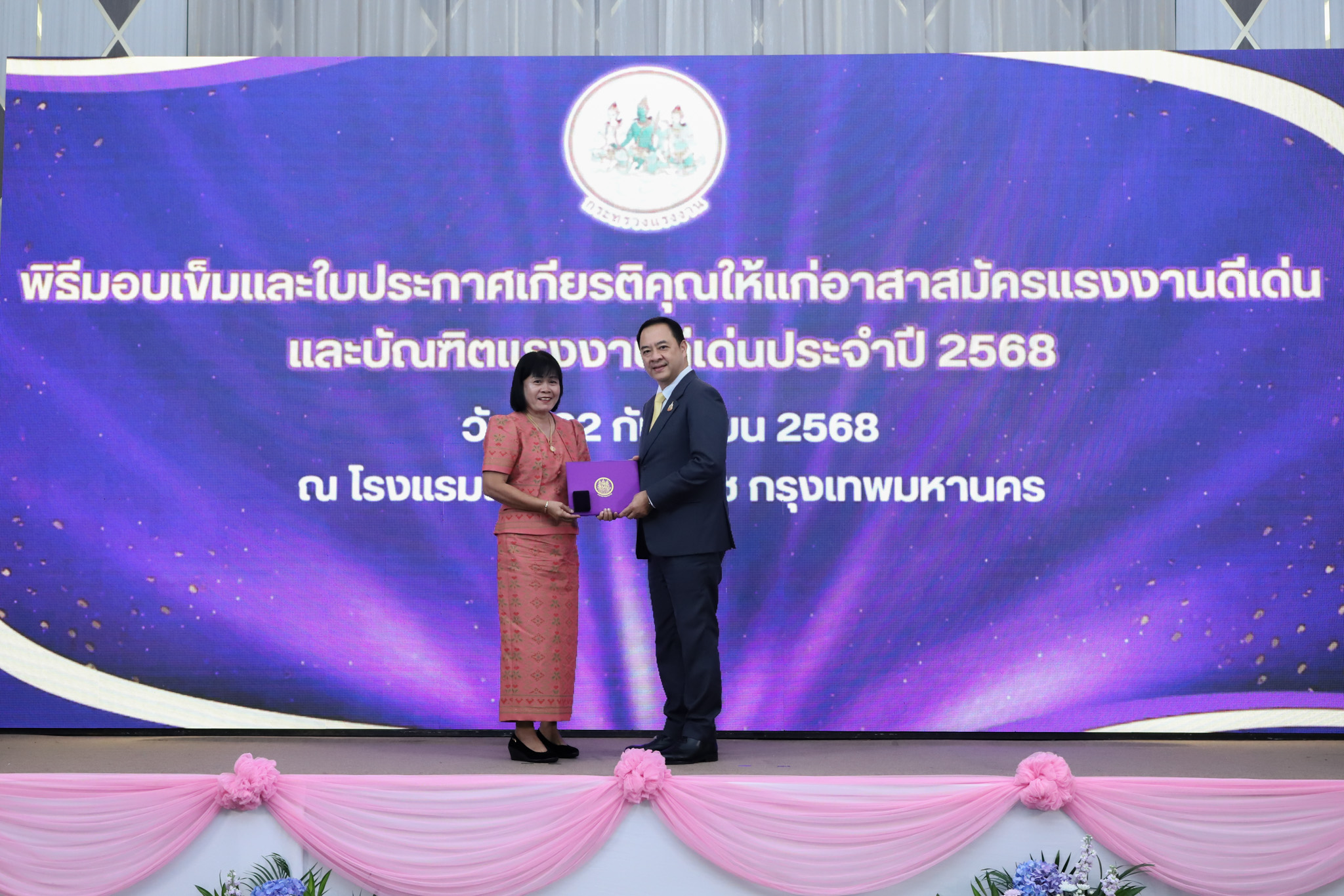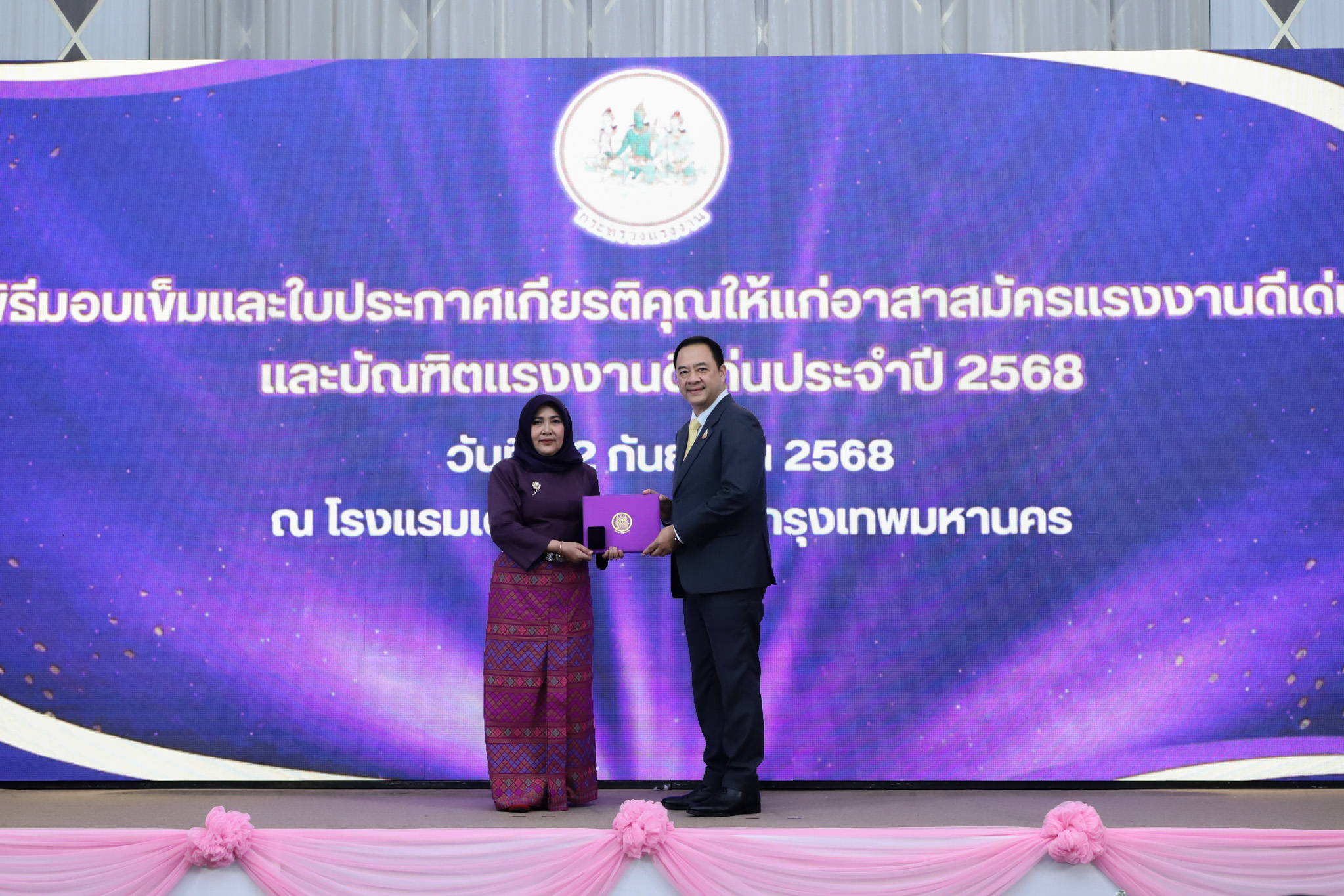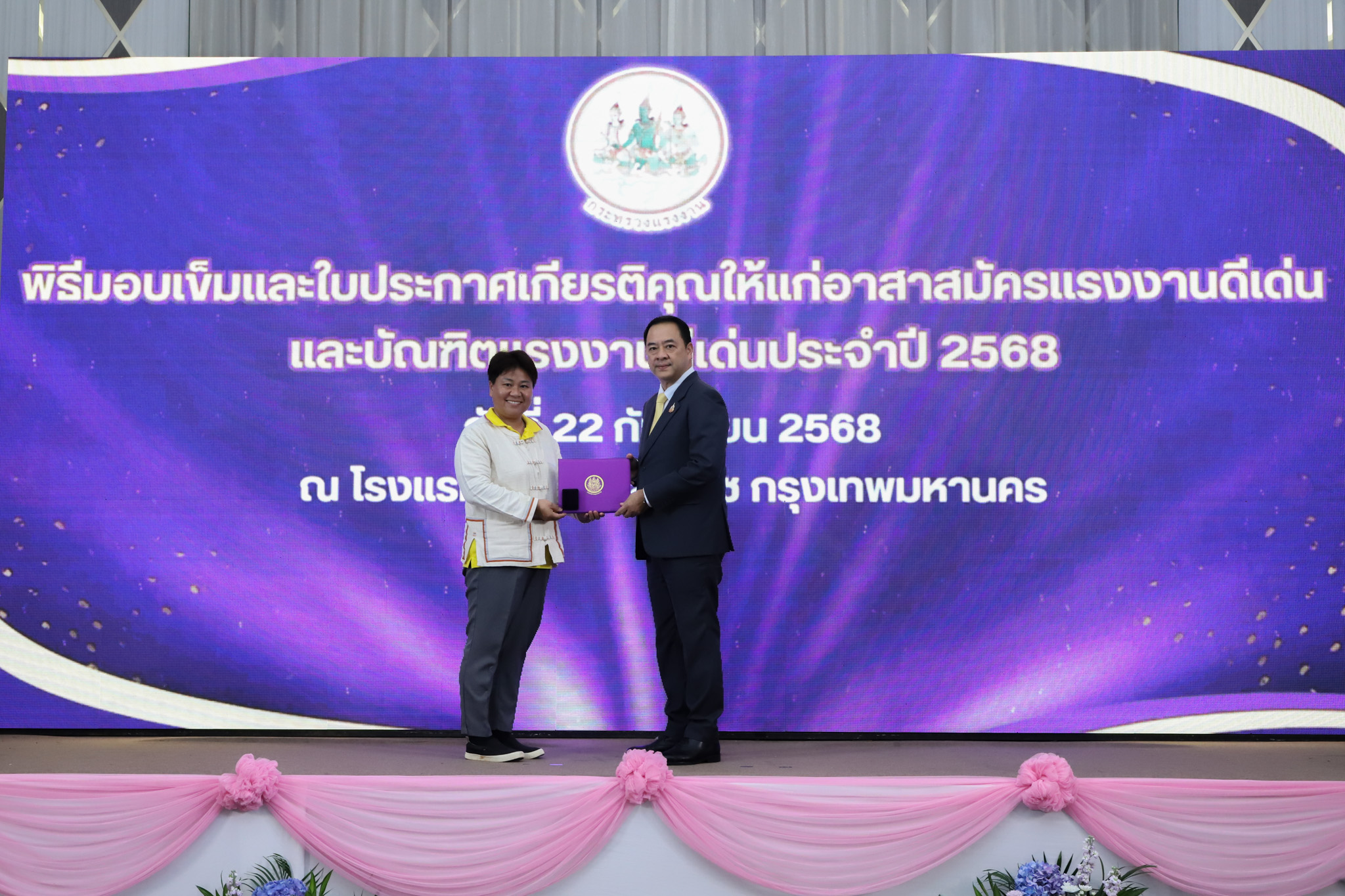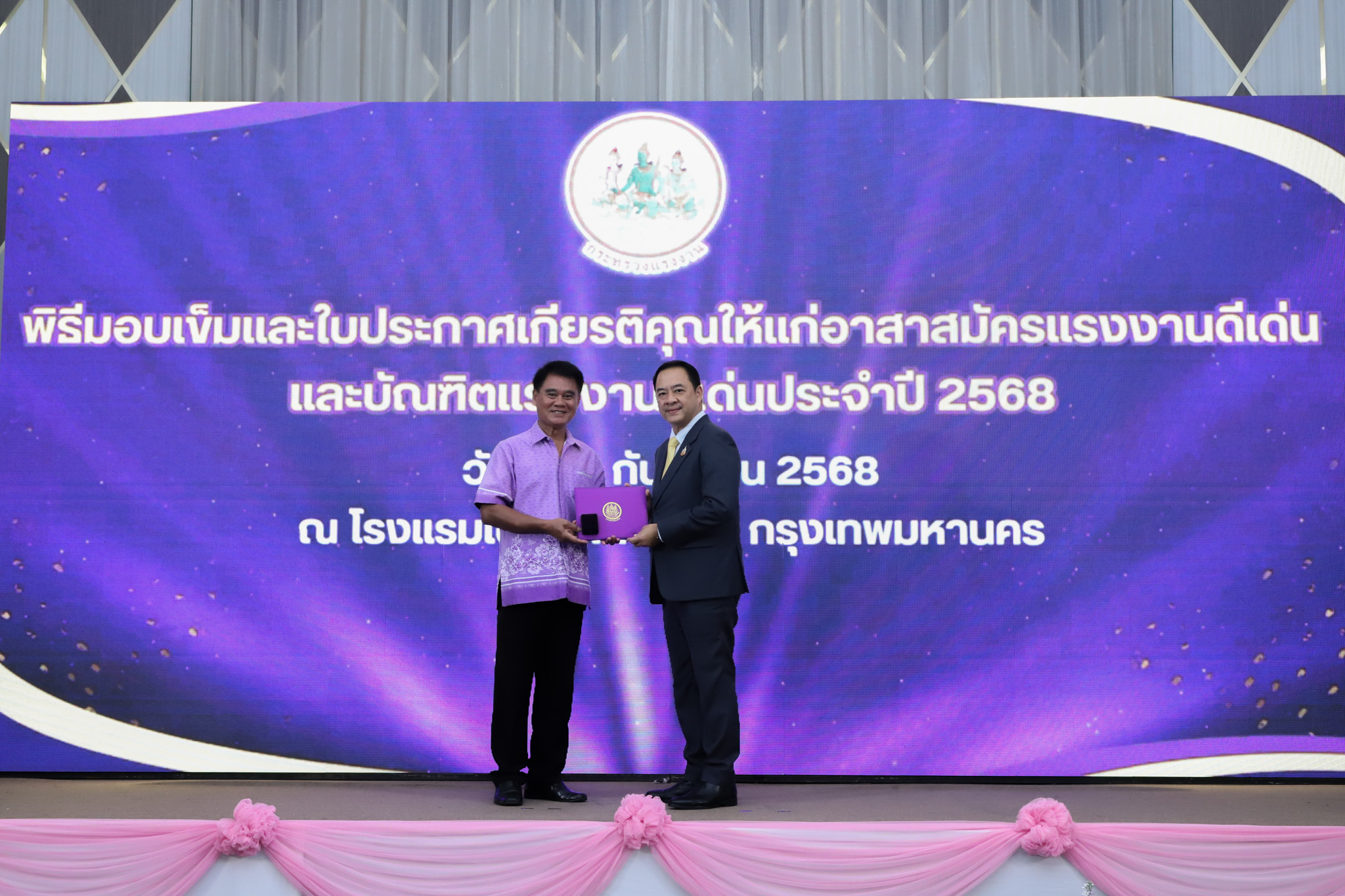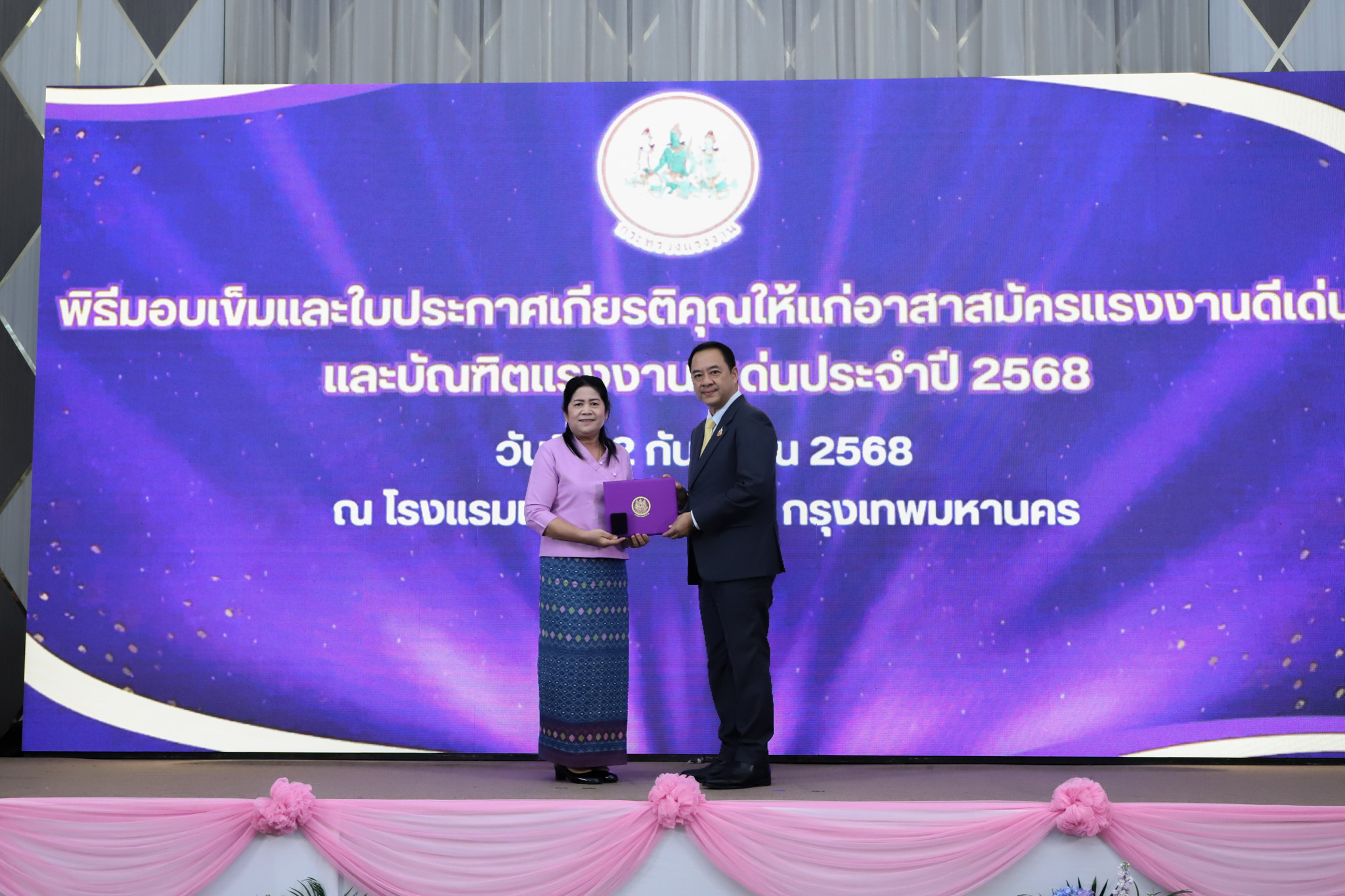 วันที่ 22 กันยายน 2568 เวลา 16.00 น. นายสมาสภ์ ปัทมะสุคนธ์ รองปลัดกระทรวงแรงงาน มอบเข็ม และใบประกาศเกียรติคุณให้แก่อาสาสมัครแรงงานดีเด่น และบัณฑิตแรงงานดีเด่น ประจำปี พ.ศ. 2568 โดยมี นายสิบหมื่นชัย โพธิสินธุ์ ผู้ตรวจราชการกระทรวงแรงงาน นายเกริกไกร นาสมยนต์ ที่ปรึกษากฎหมาย นายศักดินาถ สนธิศักดิ์โยธิน ผู้ช่วยปลัดกระทรวงแรงงาน และผู้บริหารกระทรวงแรงงาน ร่วมด้วย ณ ห้องแกรนด์พาลาสโซ ชั้น 7 โรงแรมพาลาสโซ ถนนรัชดาภิเษก เขตดินแดง กรุงเทพมหานคร