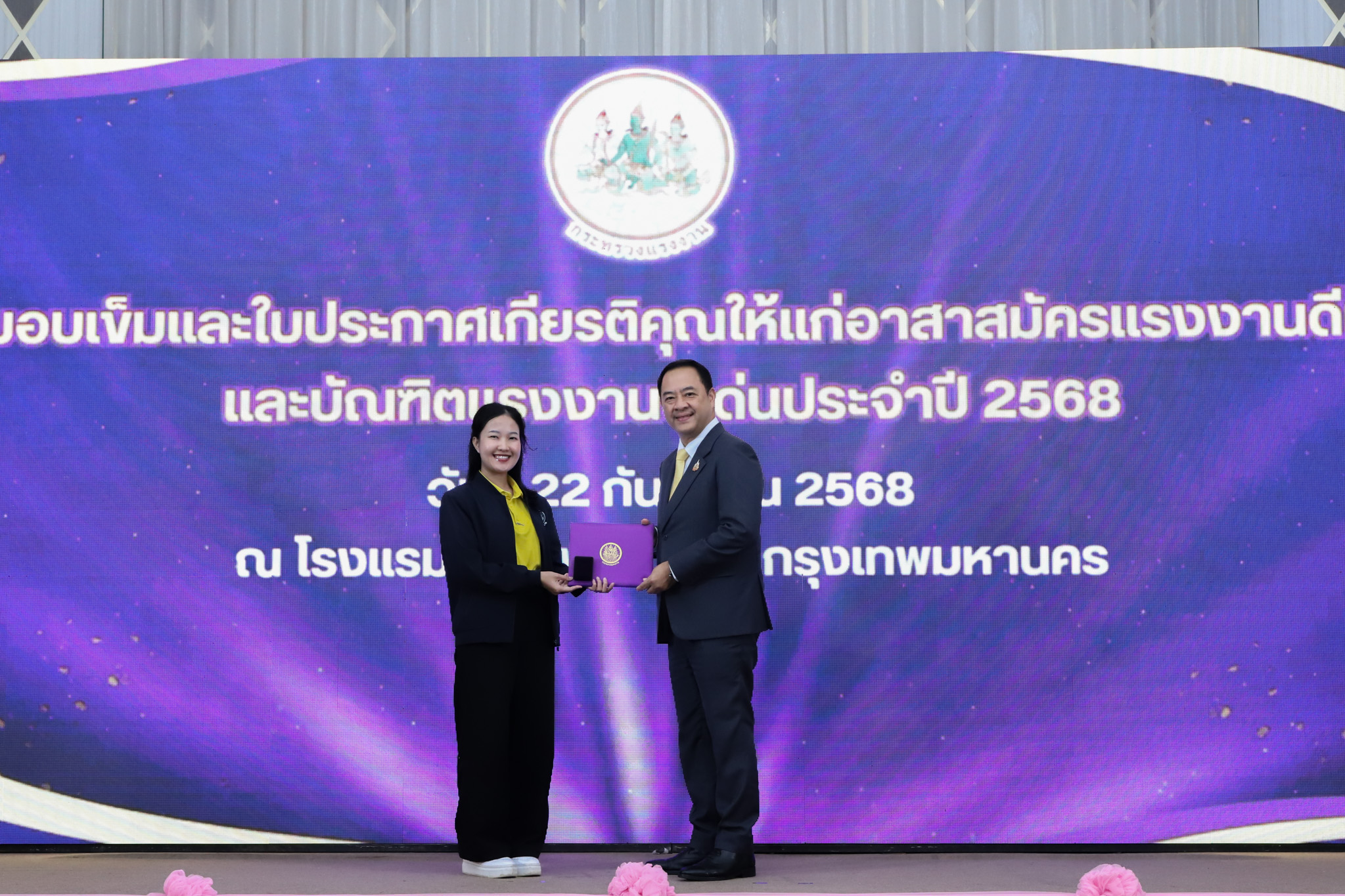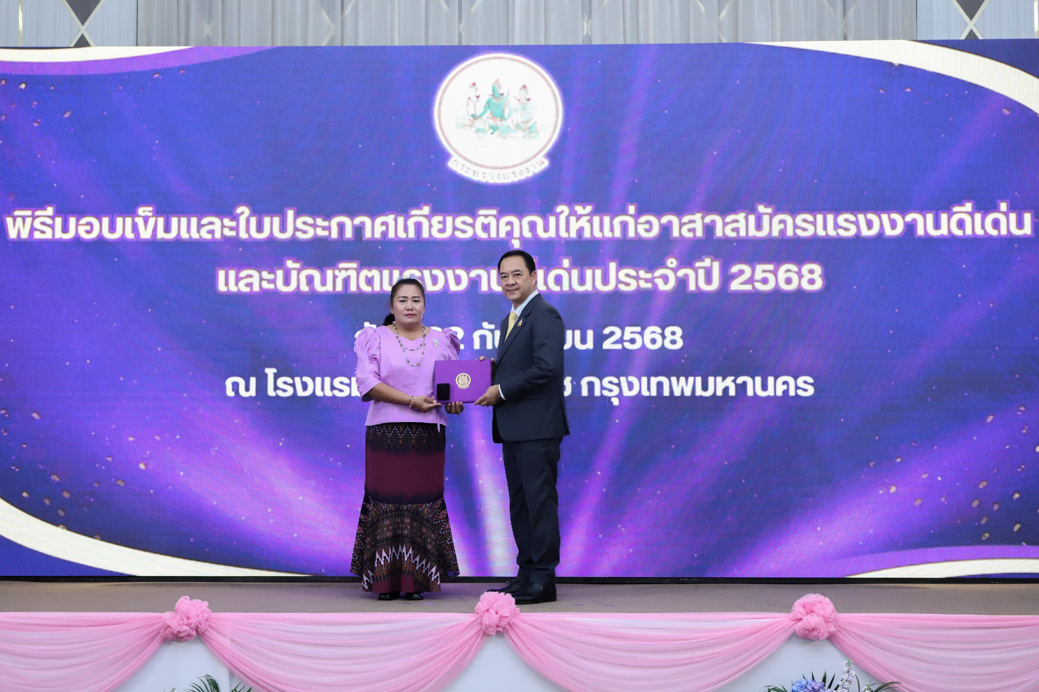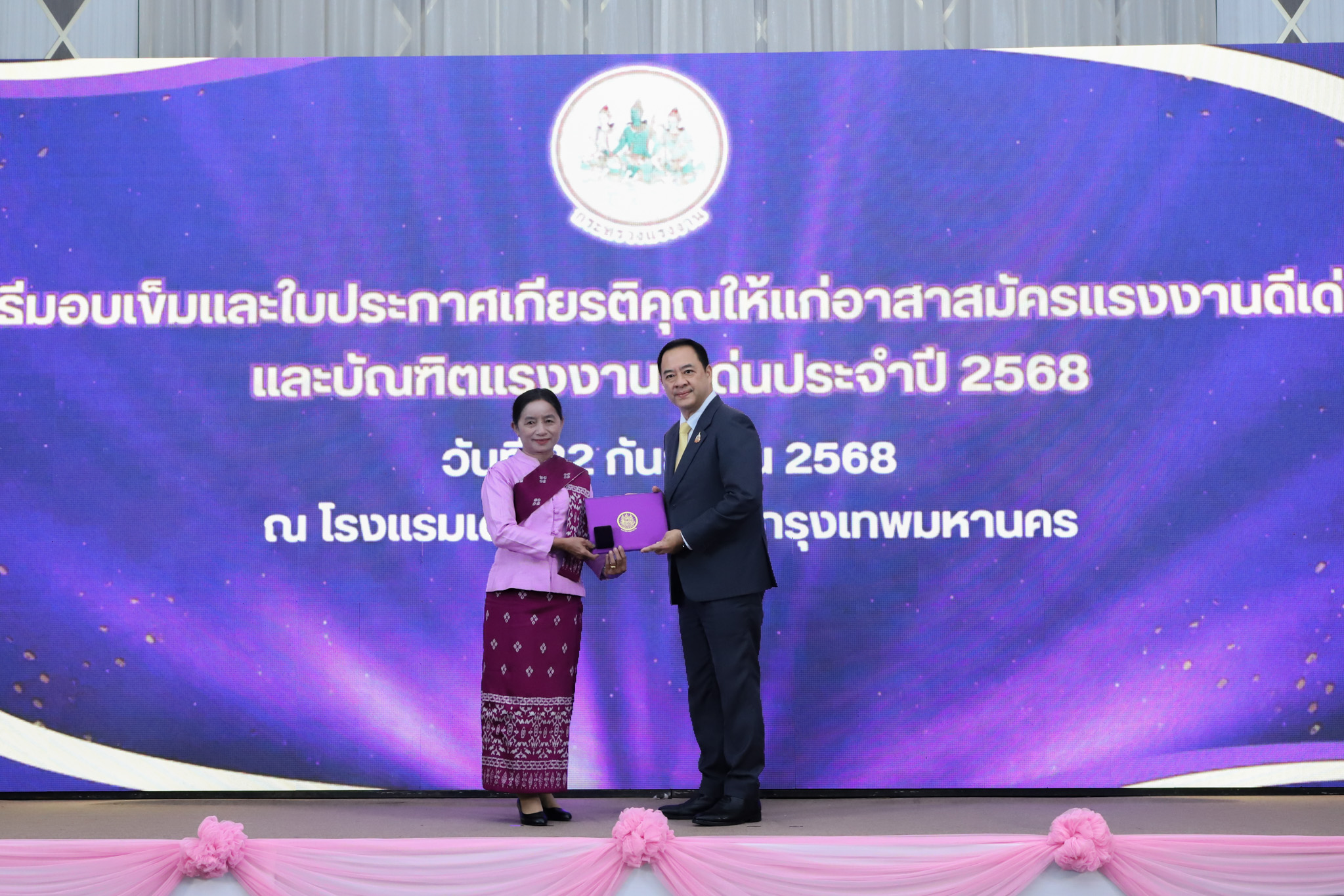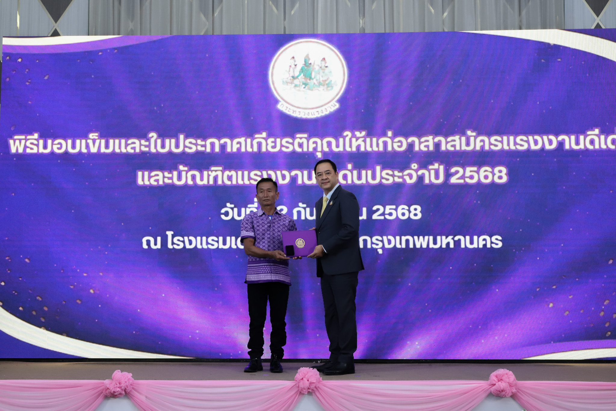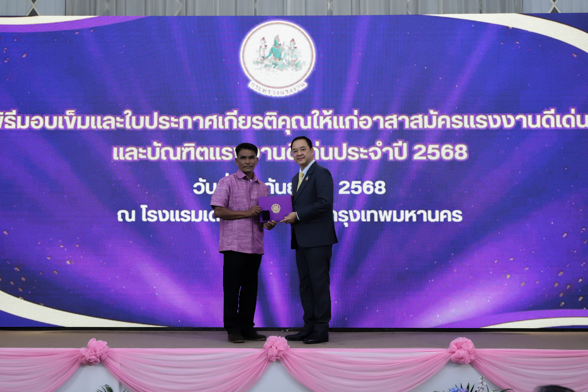 วันที่ 22 กันยายน 2568 เวลา 16.00 น. นายสมาสภ์ ปัทมะสุคนธ์ รองปลัดกระทรวงแรงงาน มอบเข็ม และใบประกาศเกียรติคุณให้แก่อาสาสมัครแรงงานดีเด่น และบัณฑิตแรงงานดีเด่น ประจำปี พ.ศ. 2568 โดยมี นายสิบหมื่นชัย โพธิสินธุ์ ผู้ตรวจราชการกระทรวงแรงงาน นายเกริกไกร นาสมยนต์ ที่ปรึกษากฎหมาย นายศักดินาถ สนธิศักดิ์โยธิน ผู้ช่วยปลัดกระทรวงแรงงาน และผู้บริหารกระทรวงแรงงาน ร่วมด้วย ณ ห้องแกรนด์พาลาสโซ ชั้น 7 โรงแรมพาลาสโซ ถนนรัชดาภิเษก เขตดินแดง กรุงเทพมหานคร