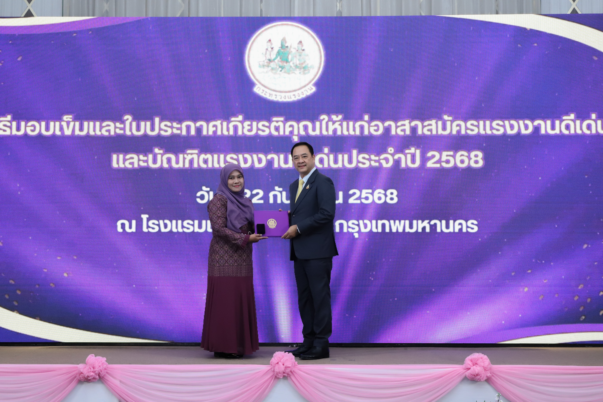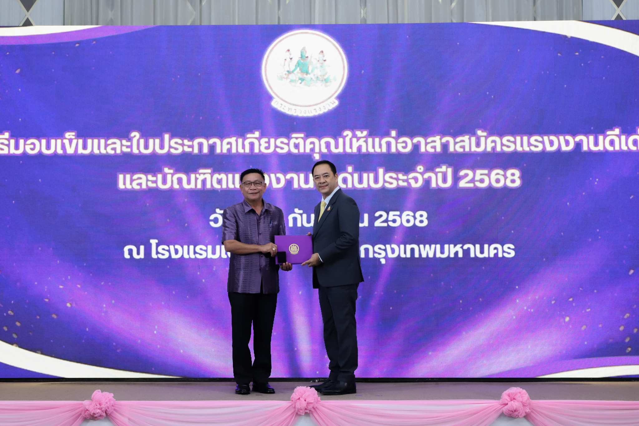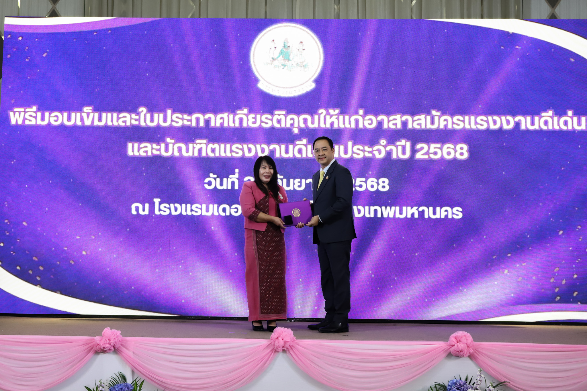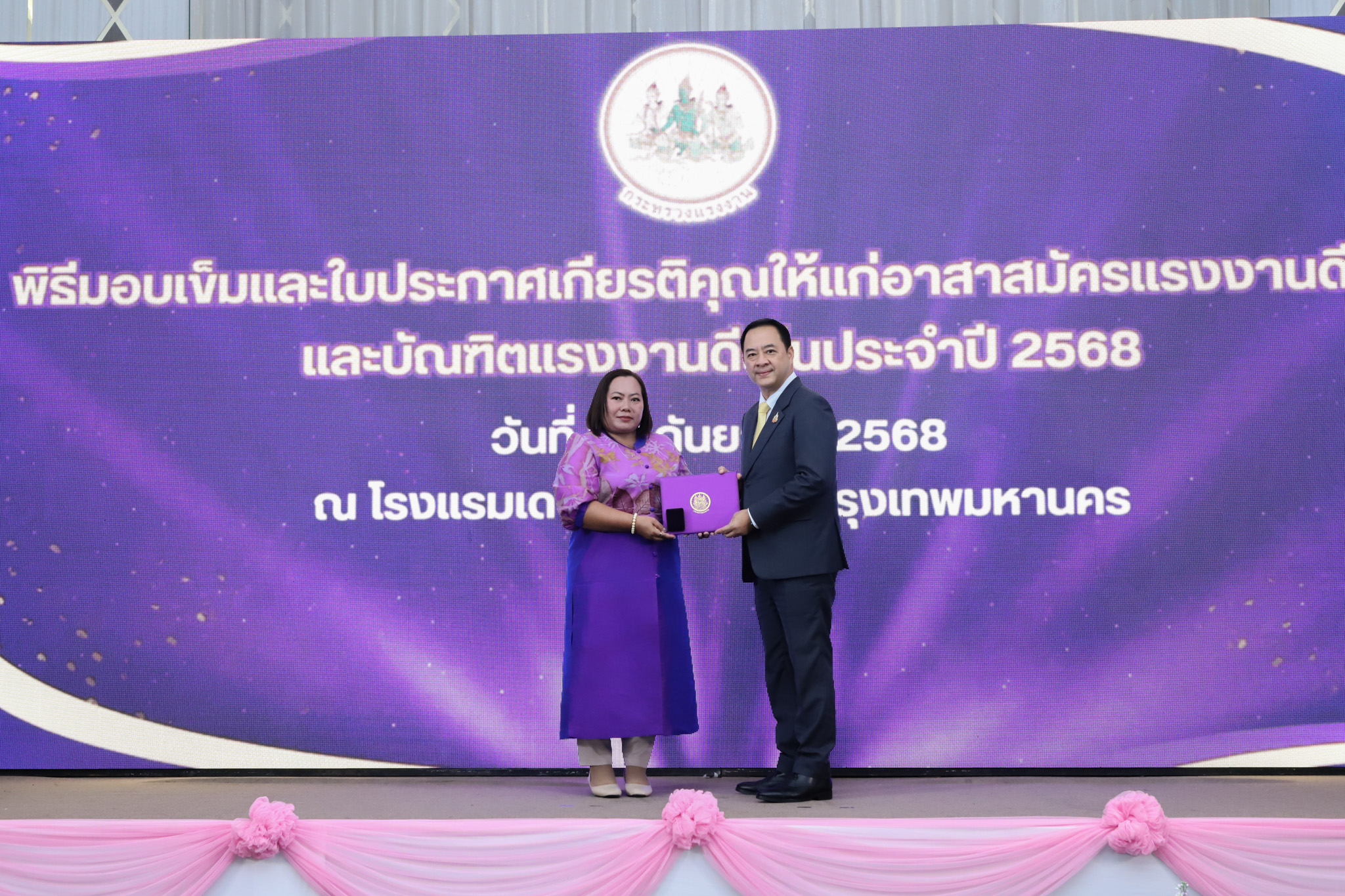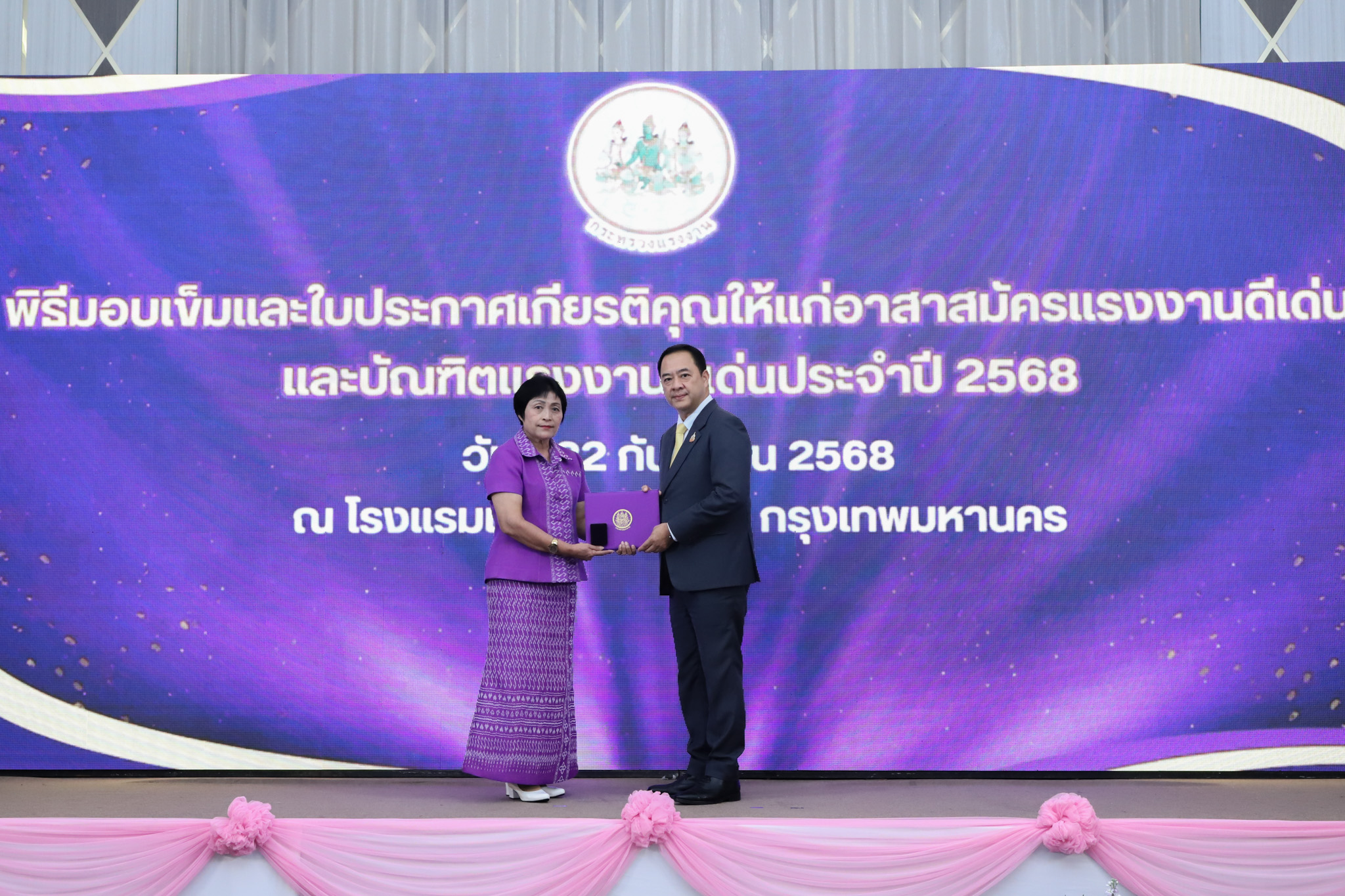 วันที่ 22 กันยายน 2568 เวลา 16.00 น. นายสมาสภ์ ปัทมะสุคนธ์ รองปลัดกระทรวงแรงงาน มอบเข็ม และใบประกาศเกียรติคุณให้แก่อาสาสมัครแรงงานดีเด่น และบัณฑิตแรงงานดีเด่น ประจำปี พ.ศ. 2568 โดยมี นายสิบหมื่นชัย โพธิสินธุ์ ผู้ตรวจราชการกระทรวงแรงงาน นายเกริกไกร นาสมยนต์ ที่ปรึกษากฎหมาย นายศักดินาถ สนธิศักดิ์โยธิน ผู้ช่วยปลัดกระทรวงแรงงาน และผู้บริหารกระทรวงแรงงาน ร่วมด้วย ณ ห้องแกรนด์พาลาสโซ ชั้น 7 โรงแรมพาลาสโซ ถนนรัชดาภิเษก เขตดินแดง กรุงเทพมหานคร