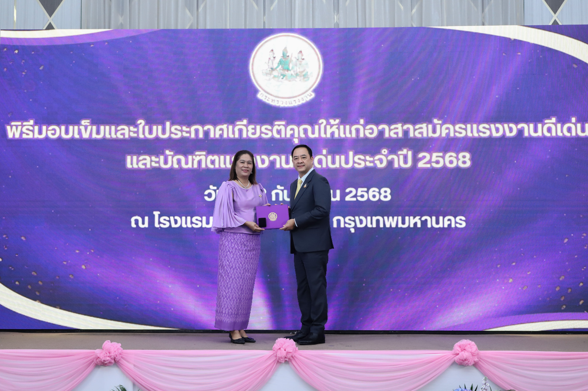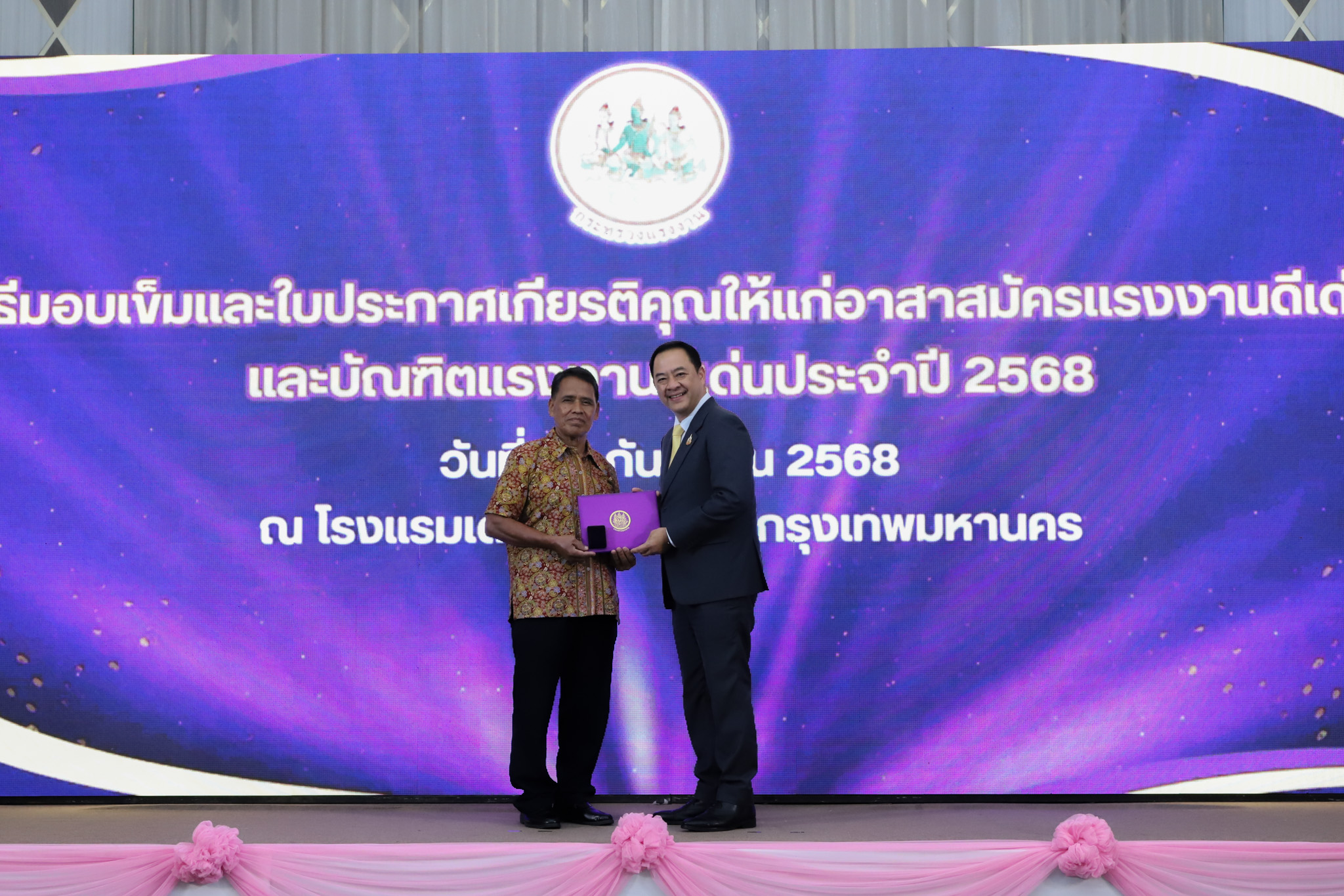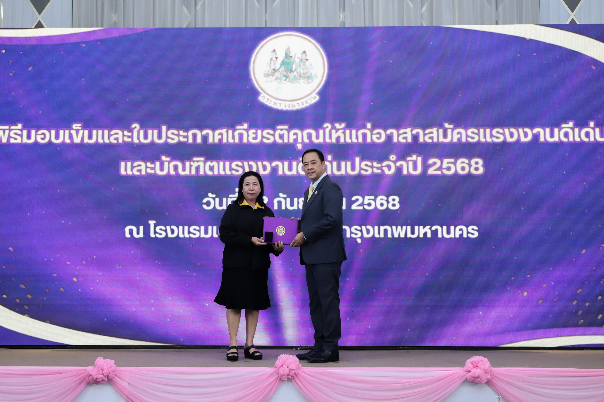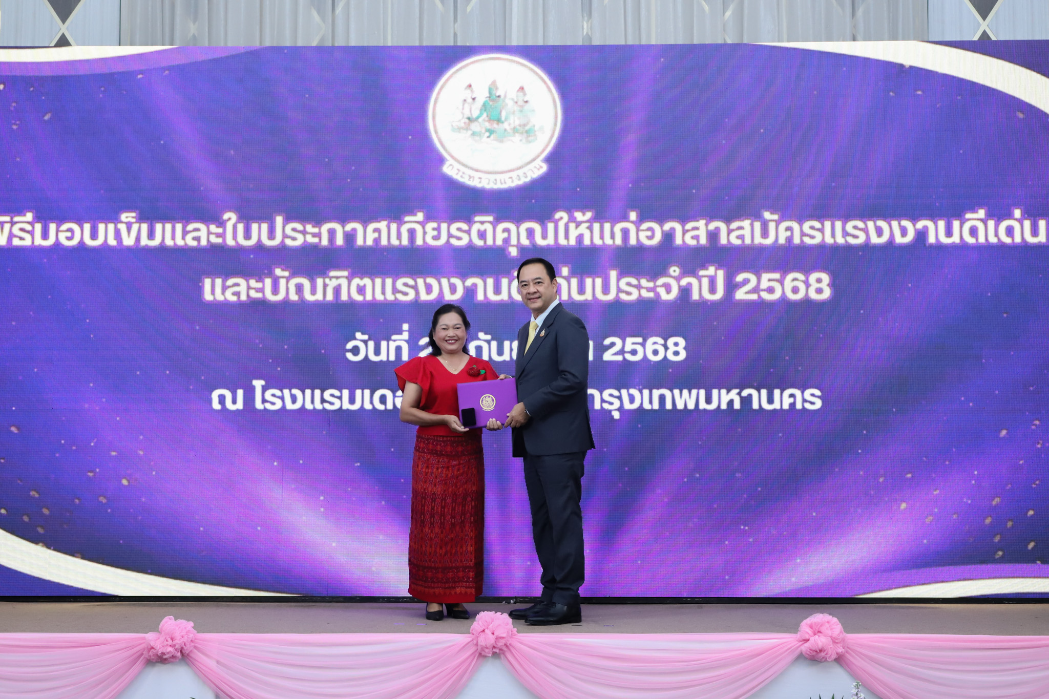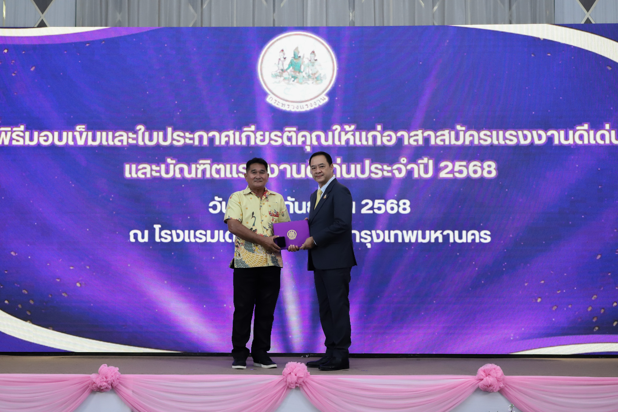 วันที่ 22 กันยายน 2568 เวลา 16.00 น. นายสมาสภ์ ปัทมะสุคนธ์ รองปลัดกระทรวงแรงงาน มอบเข็ม และใบประกาศเกียรติคุณให้แก่อาสาสมัครแรงงานดีเด่น และบัณฑิตแรงงานดีเด่น ประจำปี พ.ศ. 2568 โดยมี นายสิบหมื่นชัย โพธิสินธุ์ ผู้ตรวจราชการกระทรวงแรงงาน นายเกริกไกร นาสมยนต์ ที่ปรึกษากฎหมาย นายศักดินาถ สนธิศักดิ์โยธิน ผู้ช่วยปลัดกระทรวงแรงงาน และผู้บริหารกระทรวงแรงงาน ร่วมด้วย ณ ห้องแกรนด์พาลาสโซ ชั้น 7 โรงแรมพาลาสโซ ถนนรัชดาภิเษก เขตดินแดง กรุงเทพมหานคร