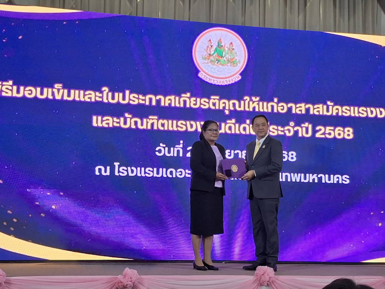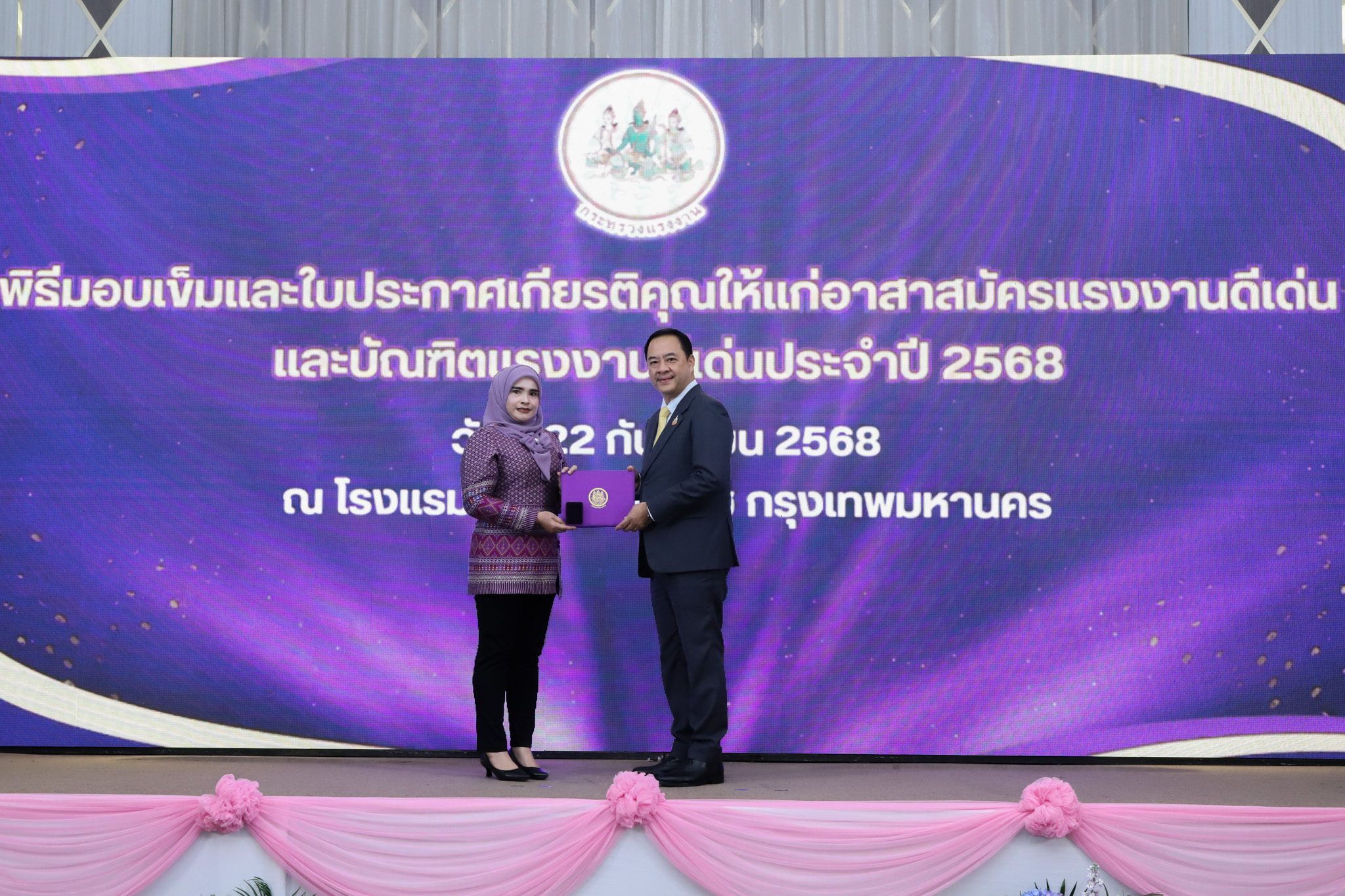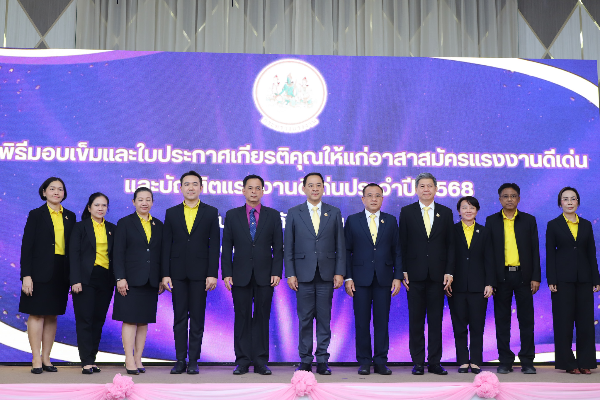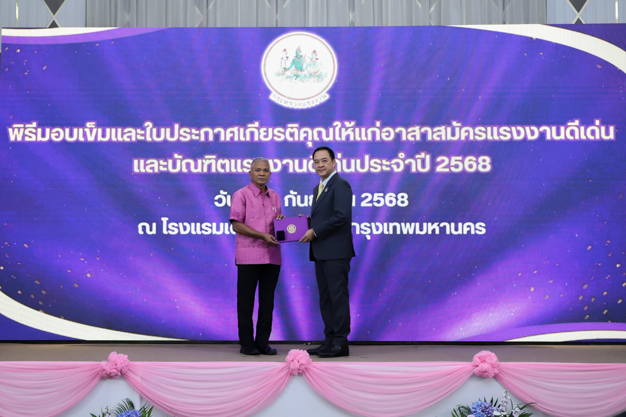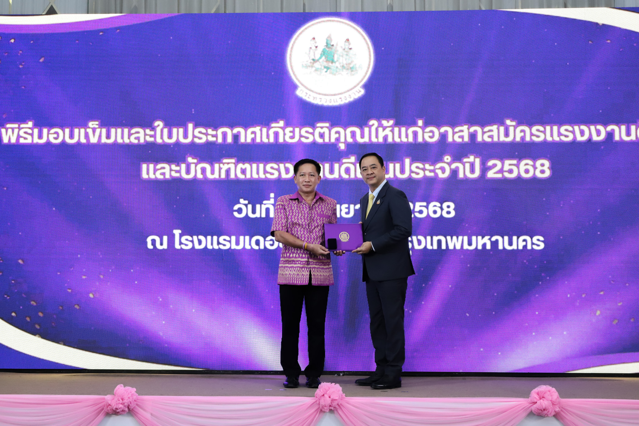 วันที่ 22 กันยายน 2568 เวลา 16.00 น. นายสมาสภ์ ปัทมะสุคนธ์ รองปลัดกระทรวงแรงงาน มอบเข็ม และใบประกาศเกียรติคุณให้แก่อาสาสมัครแรงงานดีเด่น และบัณฑิตแรงงานดีเด่น ประจำปี พ.ศ. 2568 โดยมี นายสิบหมื่นชัย โพธิสินธุ์ ผู้ตรวจราชการกระทรวงแรงงาน นายเกริกไกร นาสมยนต์ ที่ปรึกษากฎหมาย นายศักดินาถ สนธิศักดิ์โยธิน ผู้ช่วยปลัดกระทรวงแรงงาน และผู้บริหารกระทรวงแรงงาน ร่วมด้วย ณ ห้องแกรนด์พาลาสโซ ชั้น 7 โรงแรมพาลาสโซ ถนนรัชดาภิเษก เขตดินแดง กรุงเทพมหานคร