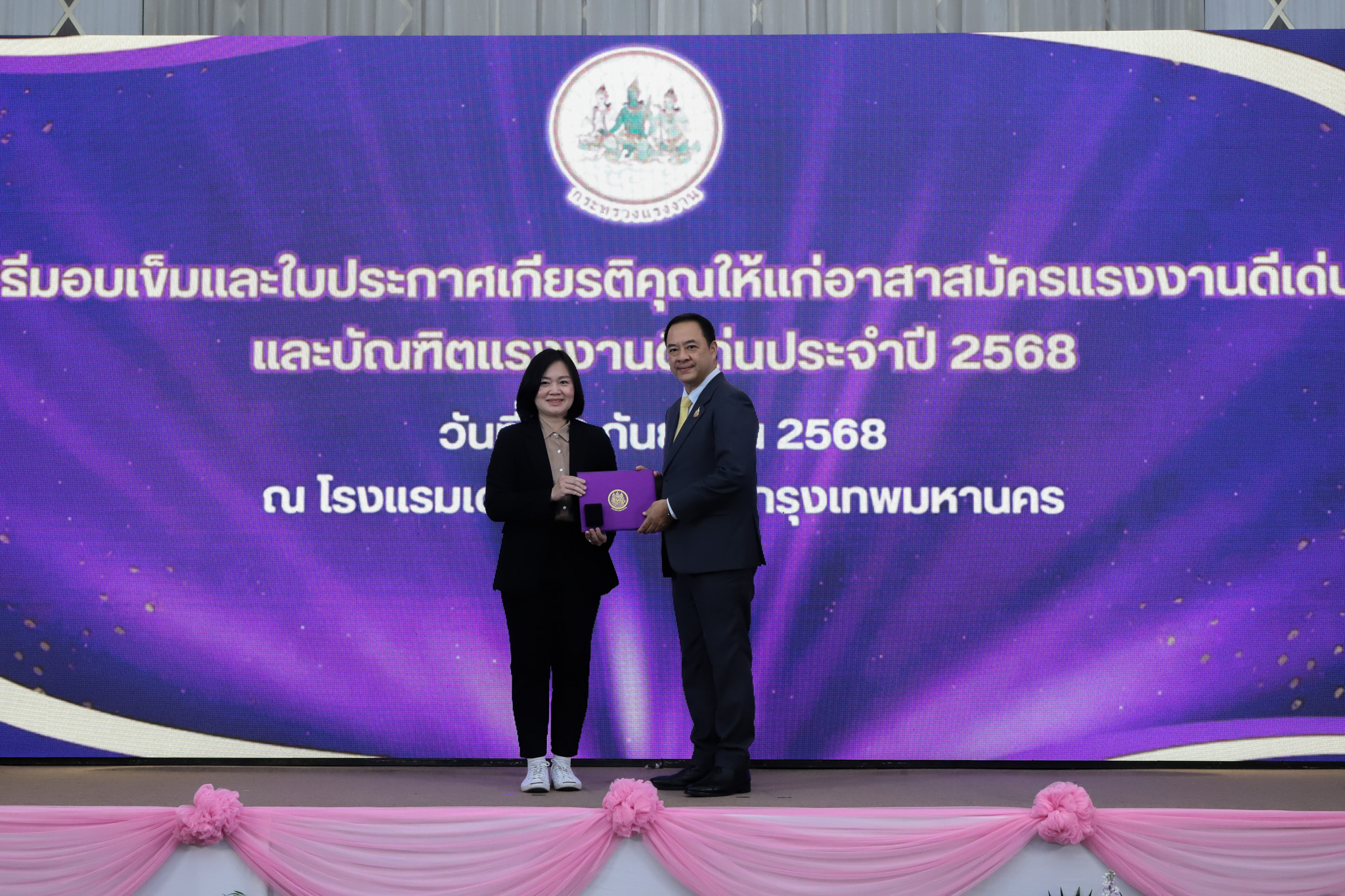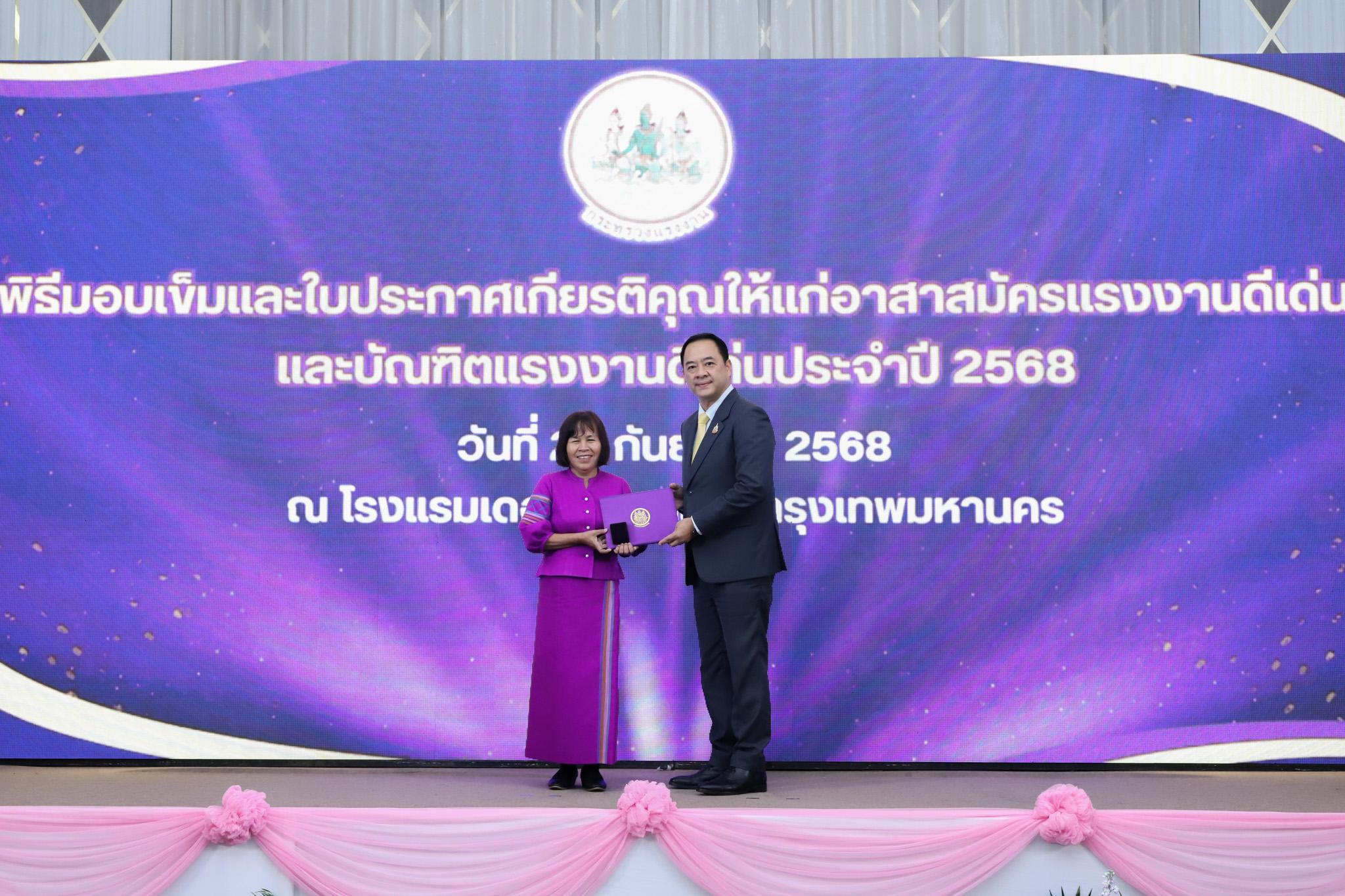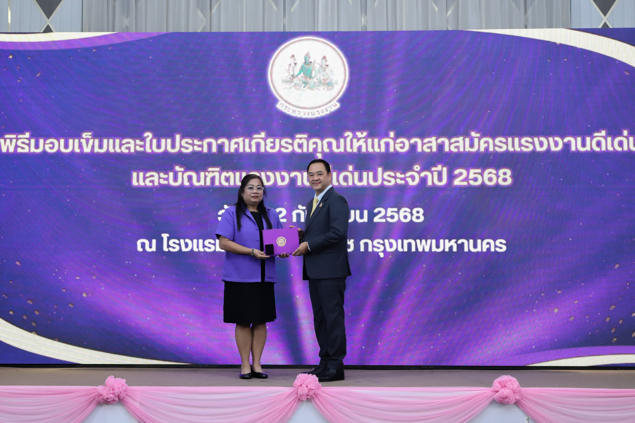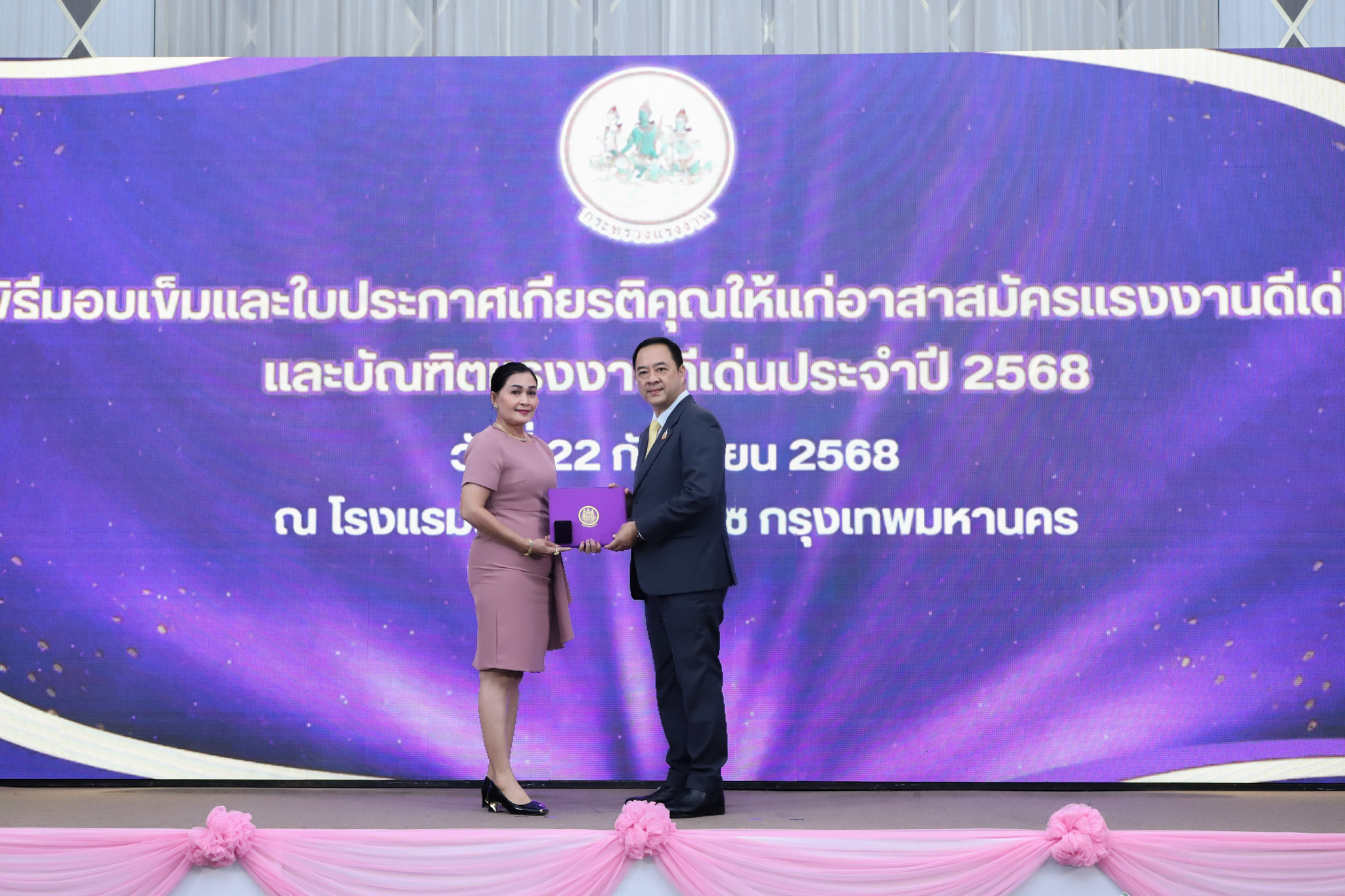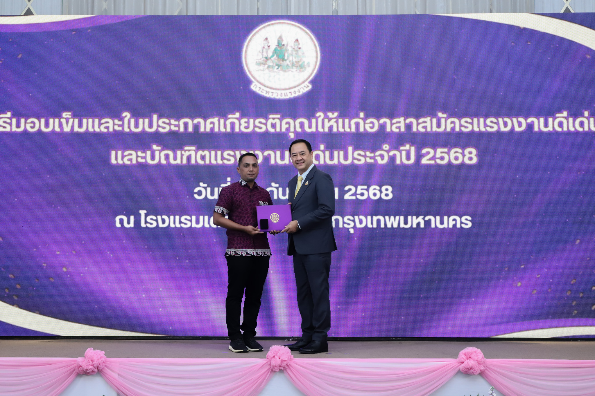 วันที่ 22 กันยายน 2568 เวลา 16.00 น. นายสมาสภ์ ปัทมะสุคนธ์ รองปลัดกระทรวงแรงงาน มอบเข็ม และใบประกาศเกียรติคุณให้แก่อาสาสมัครแรงงานดีเด่น และบัณฑิตแรงงานดีเด่น ประจำปี พ.ศ. 2568 โดยมี นายสิบหมื่นชัย โพธิสินธุ์ ผู้ตรวจราชการกระทรวงแรงงาน นายเกริกไกร นาสมยนต์ ที่ปรึกษากฎหมาย นายศักดินาถ สนธิศักดิ์โยธิน ผู้ช่วยปลัดกระทรวงแรงงาน และผู้บริหารกระทรวงแรงงาน ร่วมด้วย ณ ห้องแกรนด์พาลาสโซ ชั้น 7 โรงแรมพาลาสโซ ถนนรัชดาภิเษก เขตดินแดง กรุงเทพมหานคร