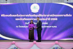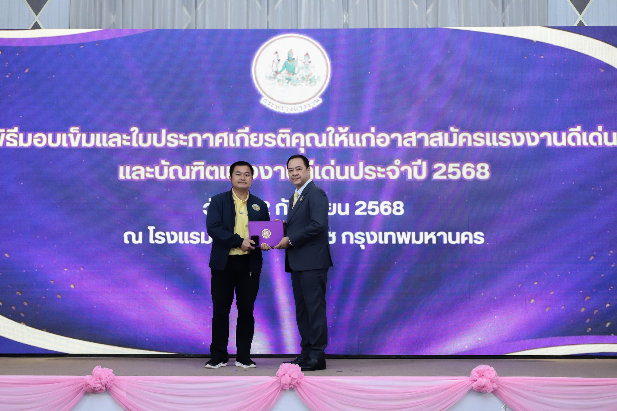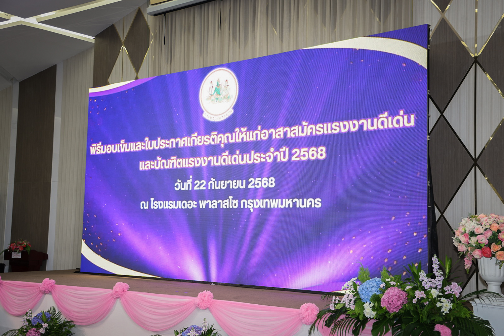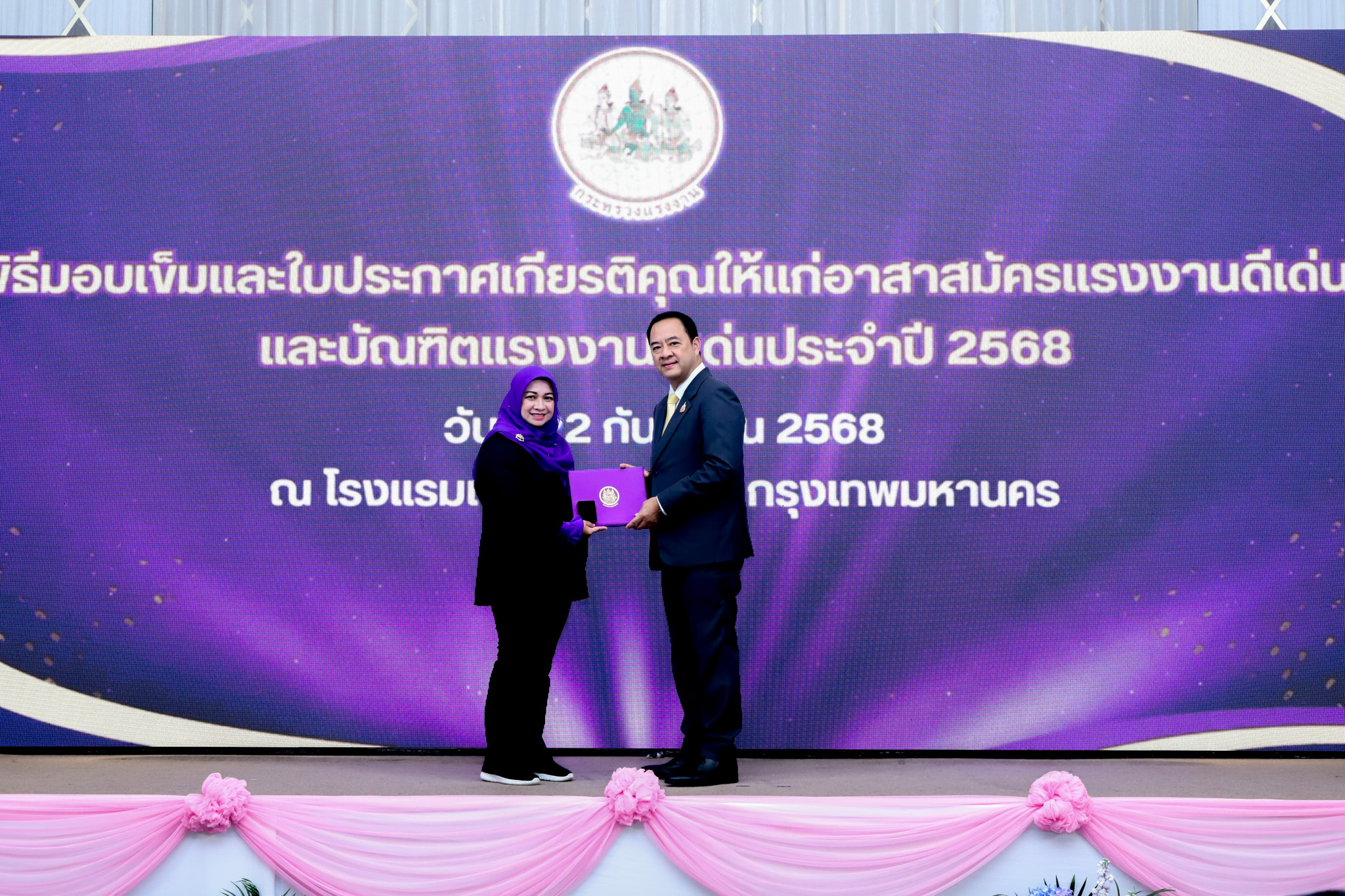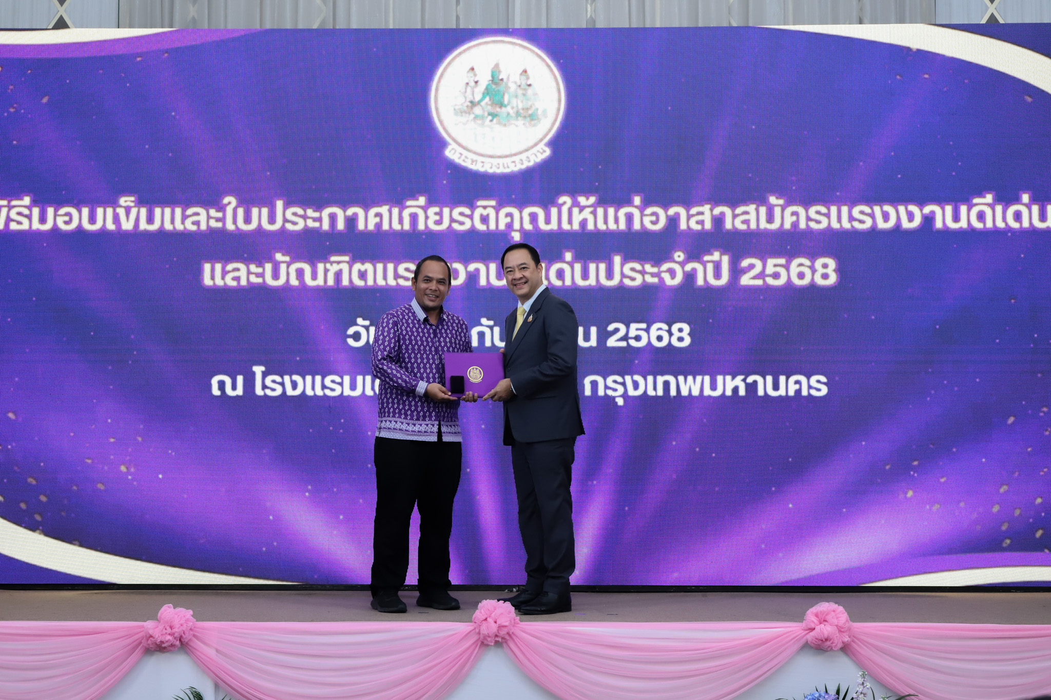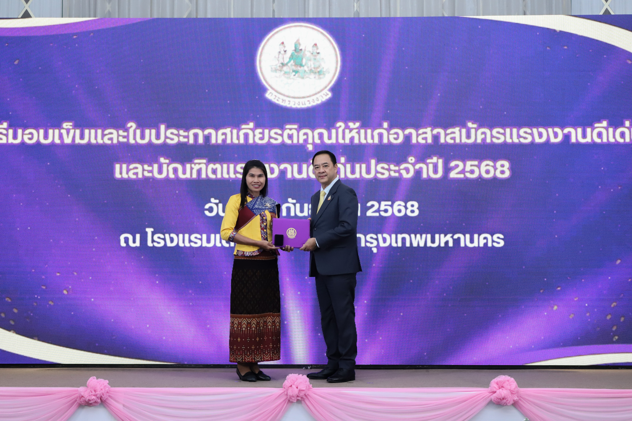 วันที่ 22 กันยายน 2568 เวลา 16.00 น. นายสมาสภ์ ปัทมะสุคนธ์ รองปลัดกระทรวงแรงงาน มอบเข็ม และใบประกาศเกียรติคุณให้แก่อาสาสมัครแรงงานดีเด่น และบัณฑิตแรงงานดีเด่น ประจำปี พ.ศ. 2568 โดยมี นายสิบหมื่นชัย โพธิสินธุ์ ผู้ตรวจราชการกระทรวงแรงงาน นายเกริกไกร นาสมยนต์ ที่ปรึกษากฎหมาย นายศักดินาถ สนธิศักดิ์โยธิน ผู้ช่วยปลัดกระทรวงแรงงาน และผู้บริหารกระทรวงแรงงาน ร่วมด้วย ณ ห้องแกรนด์พาลาสโซ ชั้น 7 โรงแรมพาลาสโซ ถนนรัชดาภิเษก เขตดินแดง กรุงเทพมหานคร