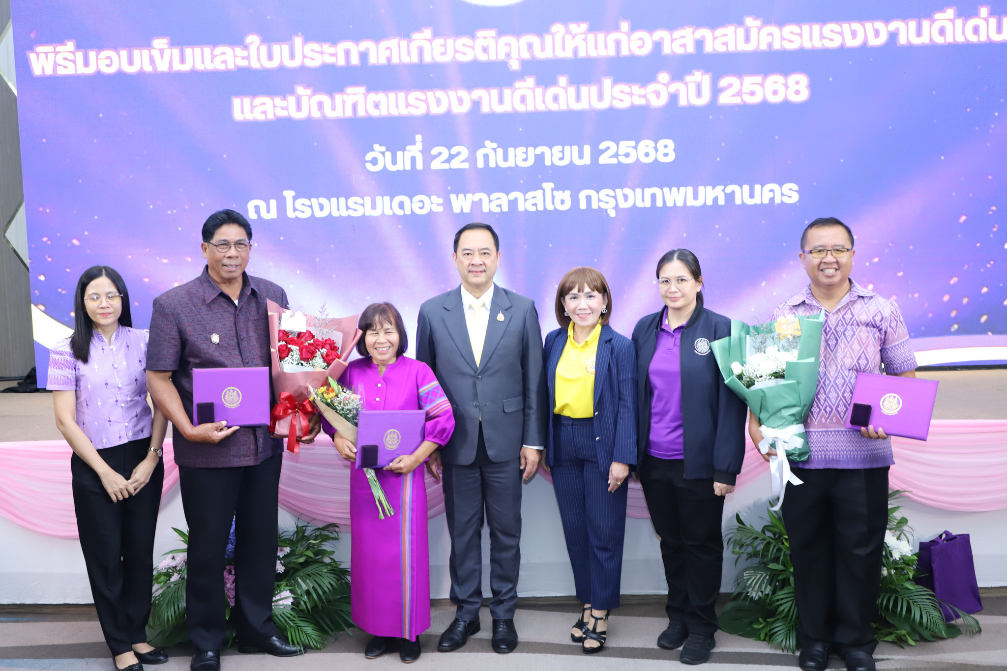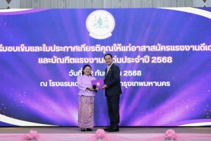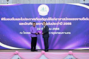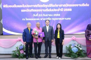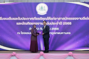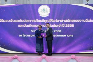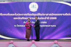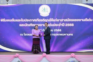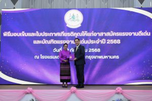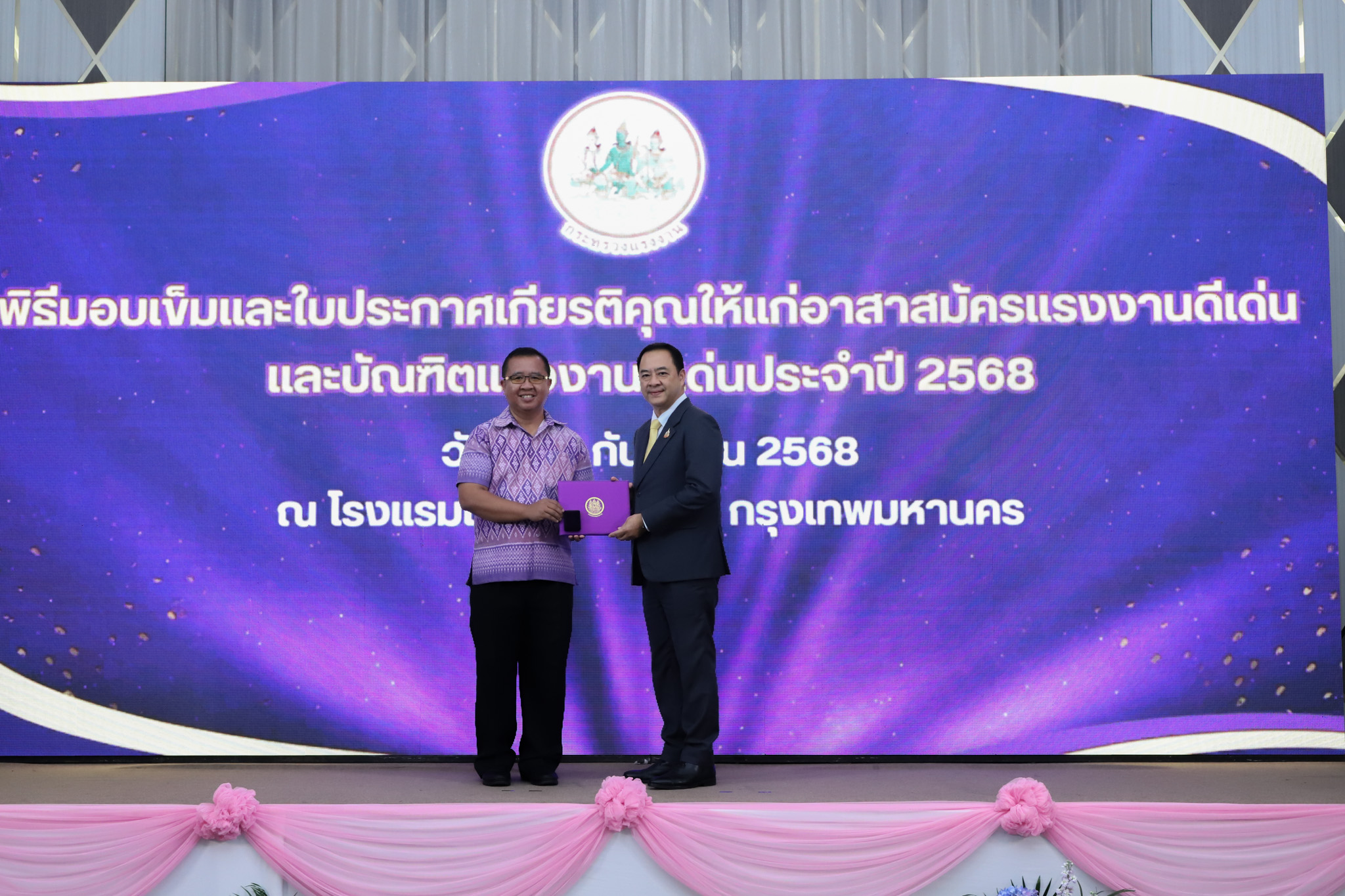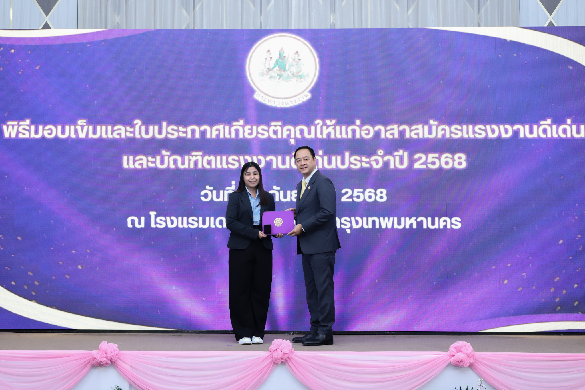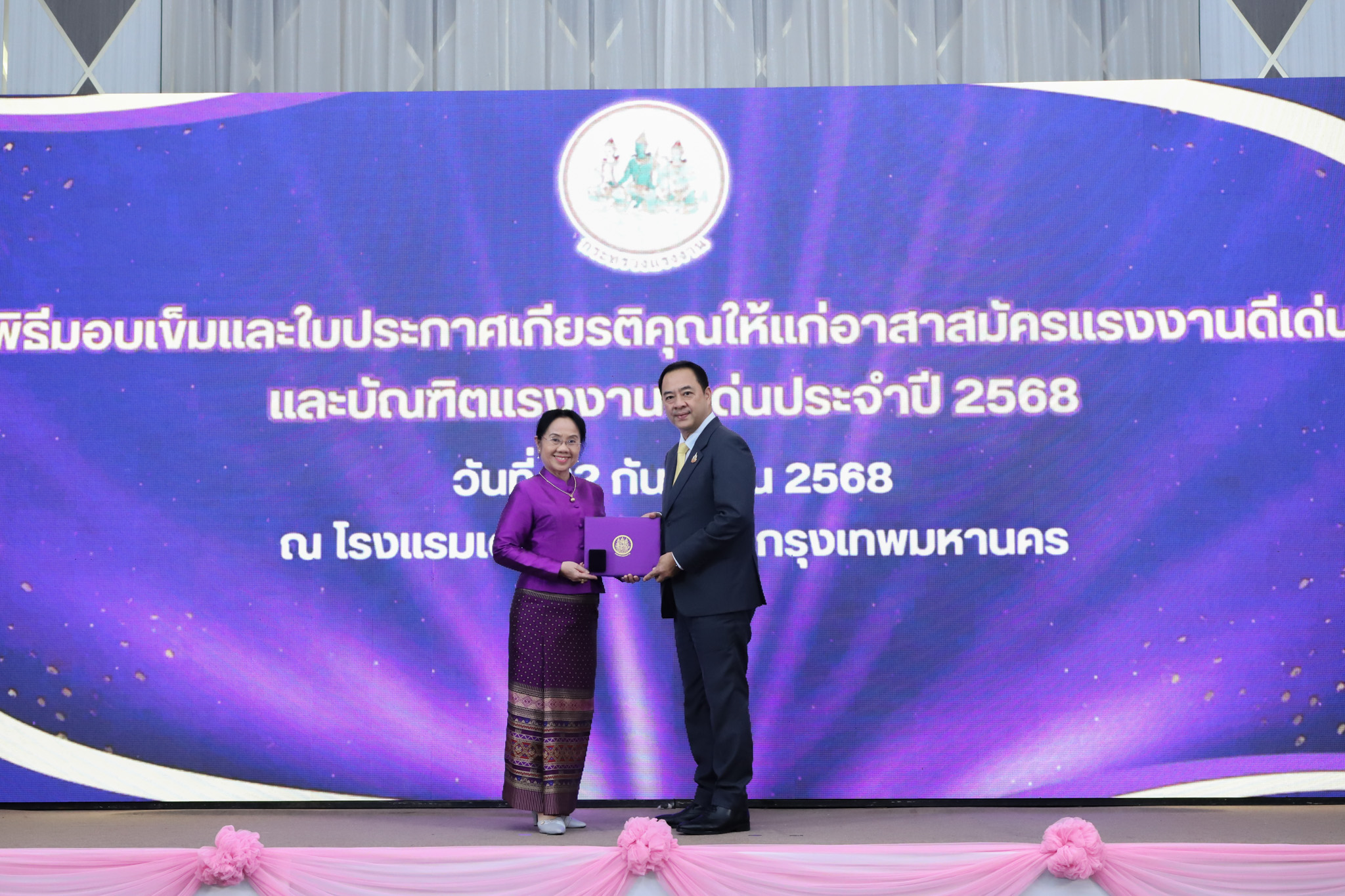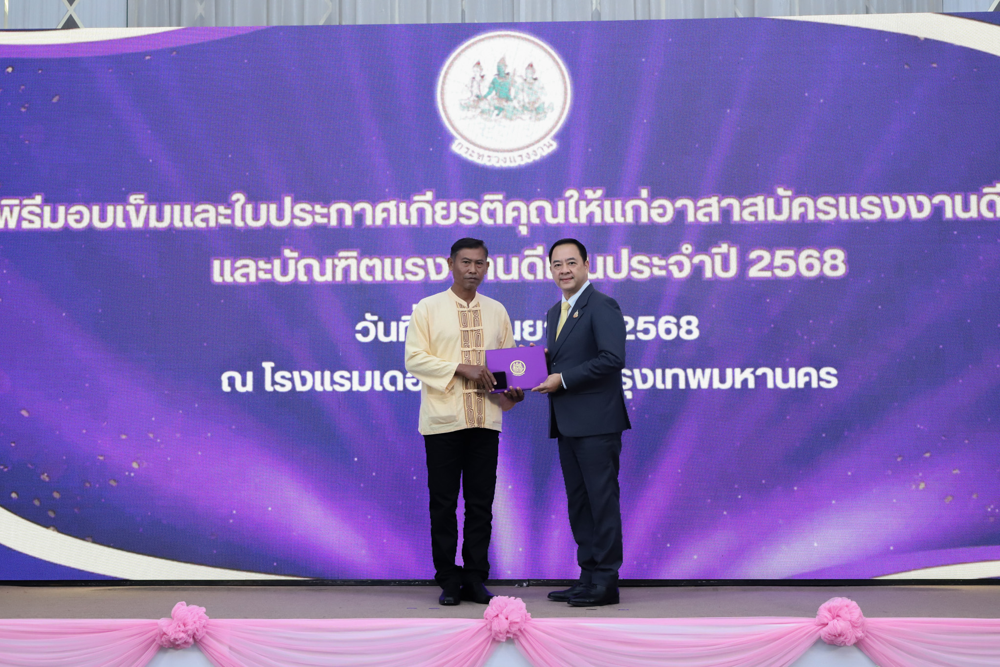 วันที่ 22 กันยายน 2568 เวลา 16.00 น. นายสมาสภ์ ปัทมะสุคนธ์ รองปลัดกระทรวงแรงงาน มอบเข็ม และใบประกาศเกียรติคุณให้แก่อาสาสมัครแรงงานดีเด่น และบัณฑิตแรงงานดีเด่น ประจำปี พ.ศ. 2568 โดยมี นายสิบหมื่นชัย โพธิสินธุ์ ผู้ตรวจราชการกระทรวงแรงงาน นายเกริกไกร นาสมยนต์ ที่ปรึกษากฎหมาย นายศักดินาถ สนธิศักดิ์โยธิน ผู้ช่วยปลัดกระทรวงแรงงาน และผู้บริหารกระทรวงแรงงาน ร่วมด้วย ณ ห้องแกรนด์พาลาสโซ ชั้น 7 โรงแรมพาลาสโซ ถนนรัชดาภิเษก เขตดินแดง กรุงเทพมหานคร