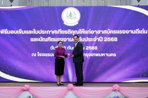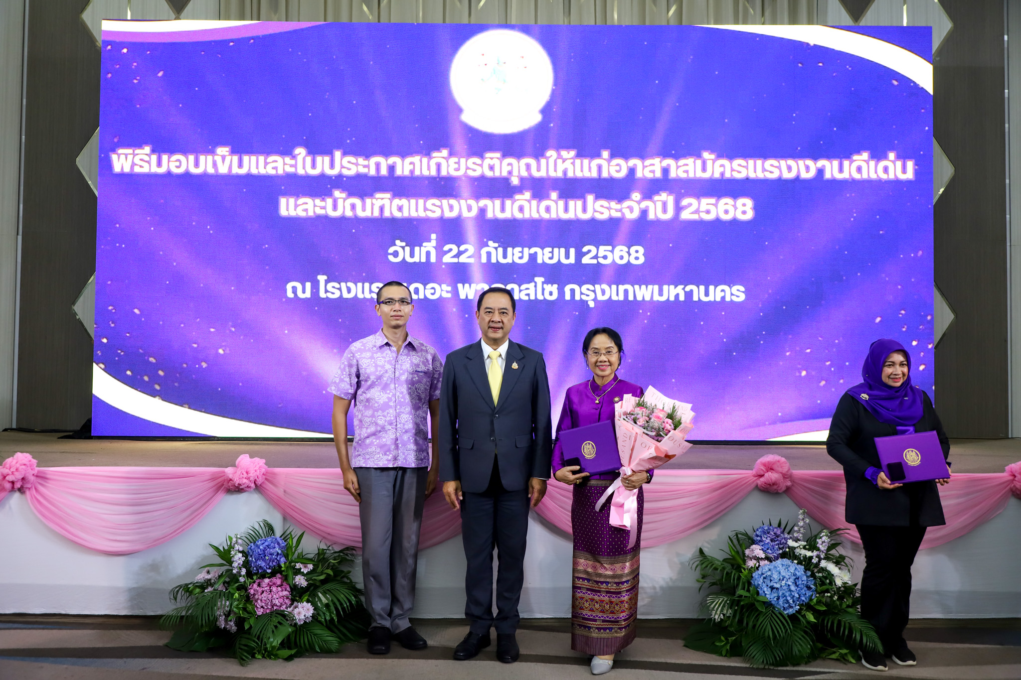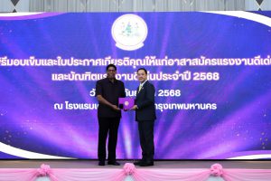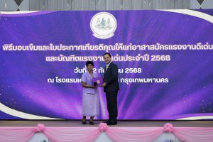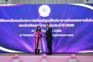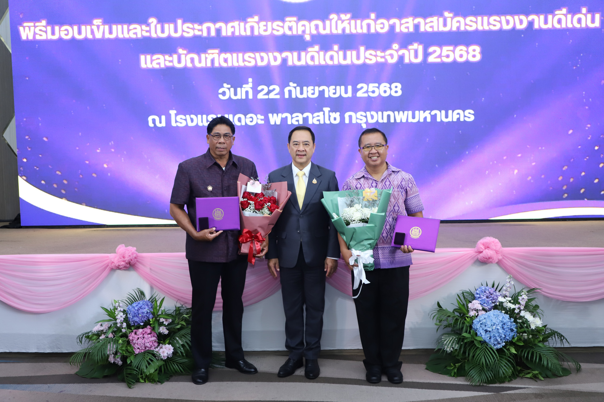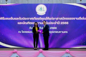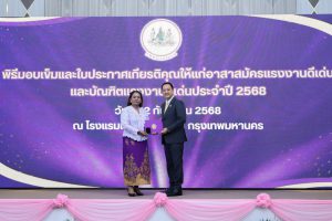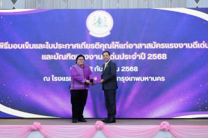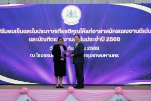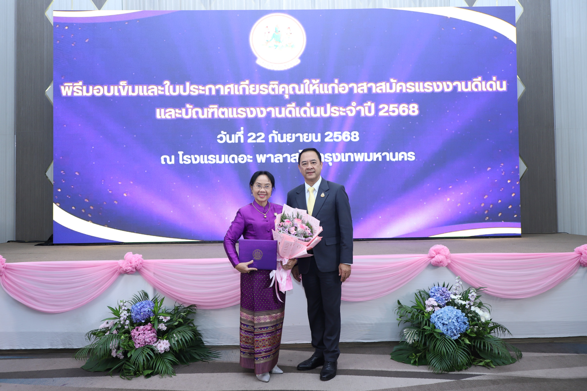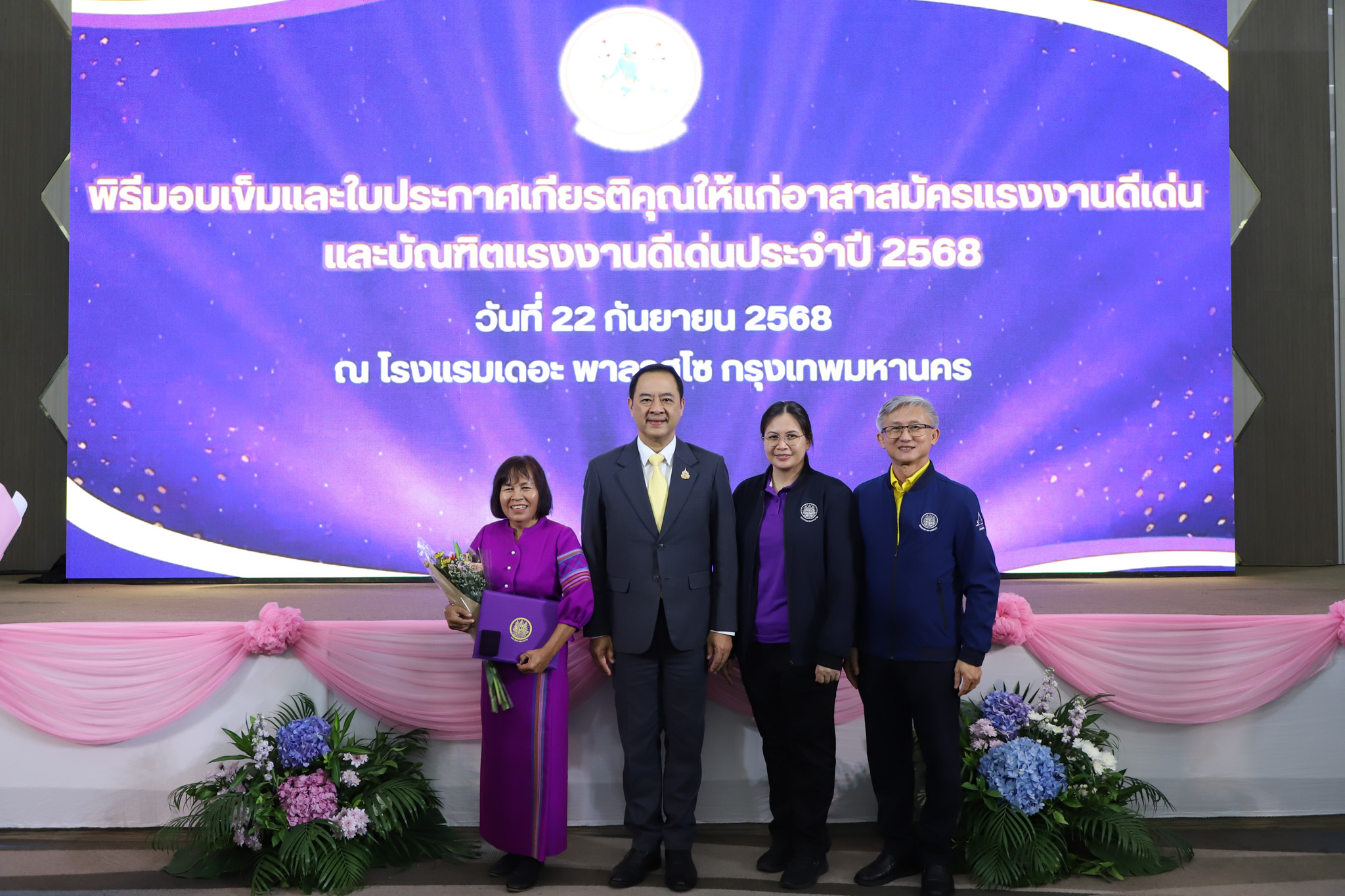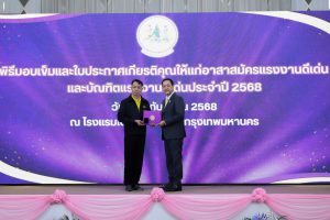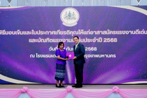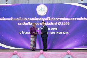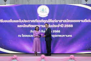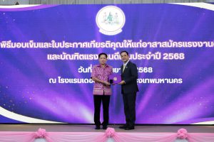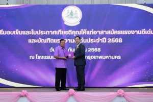 วันที่ 22 กันยายน 2568 เวลา 16.00 น. นายสมาสภ์ ปัทมะสุคนธ์ รองปลัดกระทรวงแรงงาน มอบเข็ม และใบประกาศเกียรติคุณให้แก่อาสาสมัครแรงงานดีเด่น และบัณฑิตแรงงานดีเด่น ประจำปี พ.ศ. 2568 โดยมี นายสิบหมื่นชัย โพธิสินธุ์ ผู้ตรวจราชการกระทรวงแรงงาน นายเกริกไกร นาสมยนต์ ที่ปรึกษากฎหมาย นายศักดินาถ สนธิศักดิ์โยธิน ผู้ช่วยปลัดกระทรวงแรงงาน และผู้บริหารกระทรวงแรงงาน ร่วมด้วย ณ ห้องแกรนด์พาลาสโซ ชั้น 7 โรงแรมพาลาสโซ ถนนรัชดาภิเษก เขตดินแดง กรุงเทพมหานคร