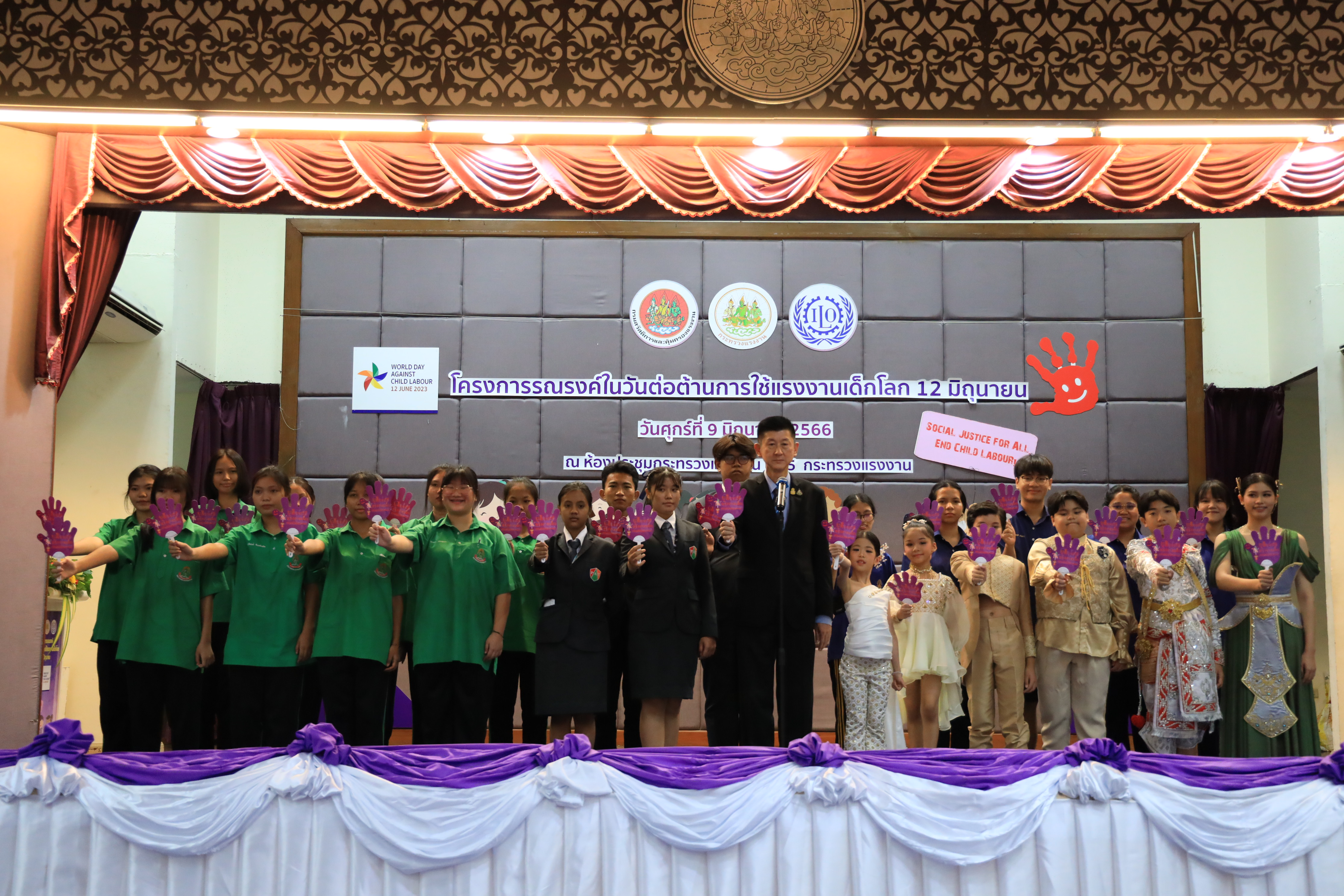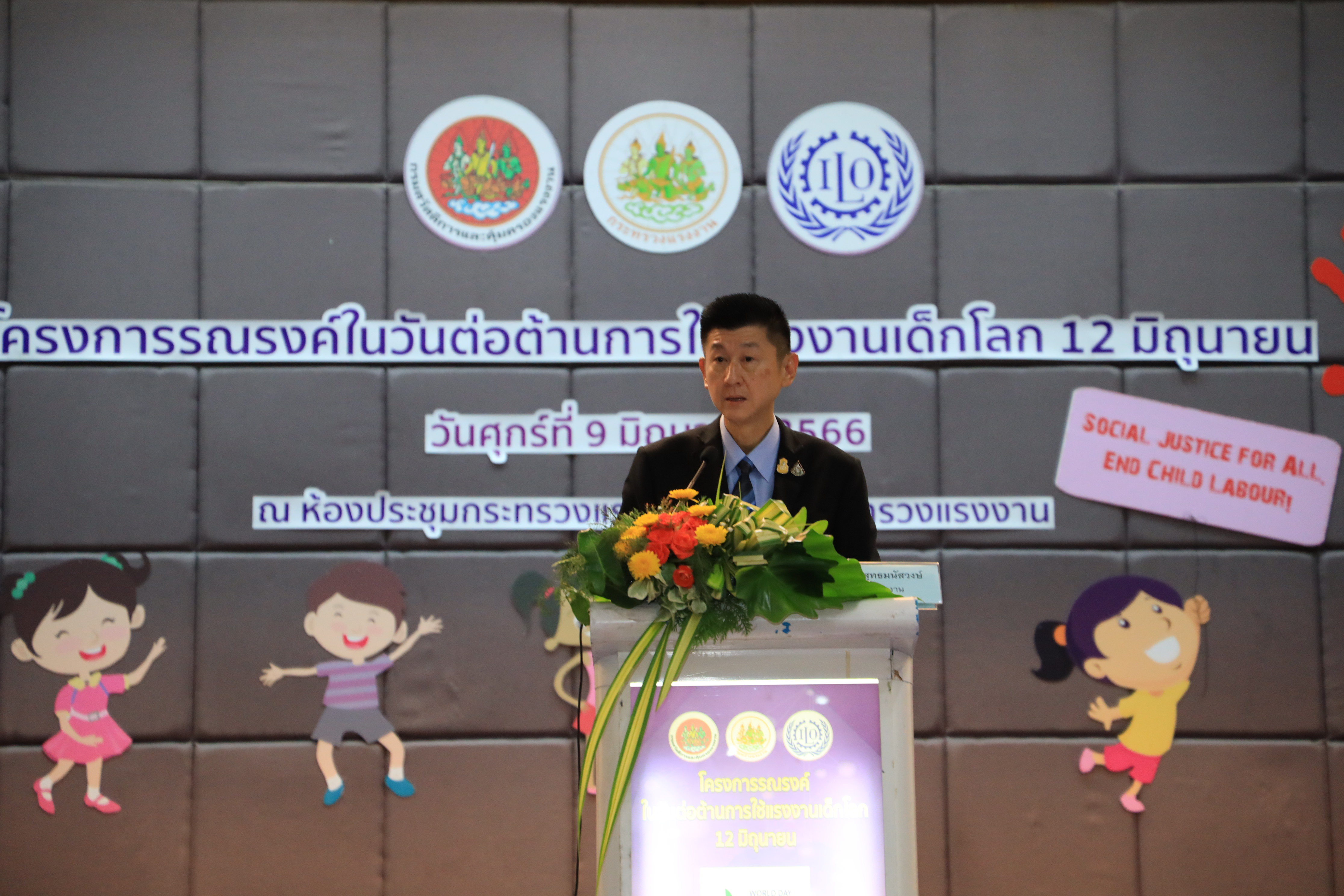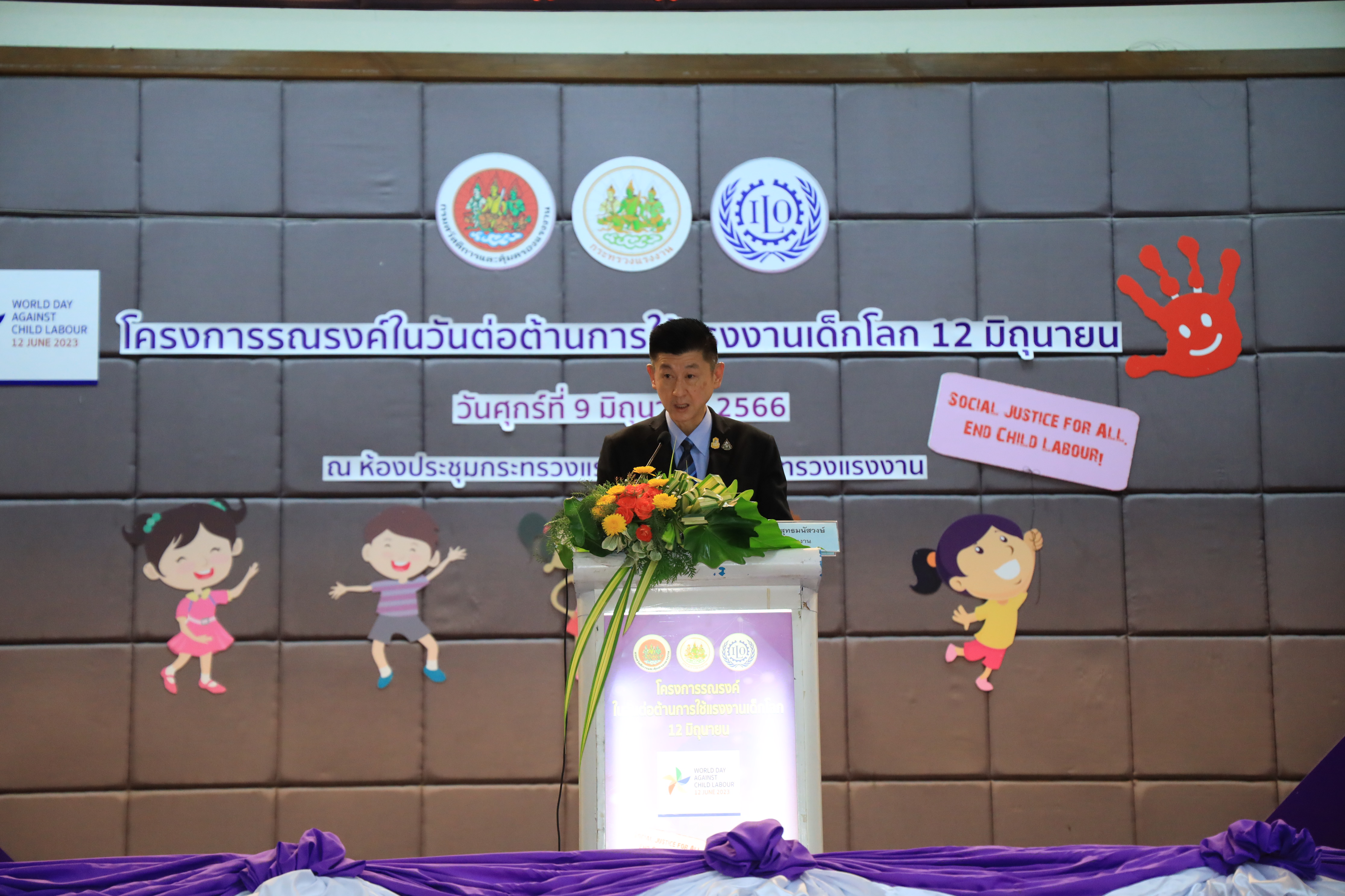 วันที่ 9 มิถุนายน 2566 เวลา 09.00 น. นายบุญชอบ สุทธมนัสวงษ์ ปลัดกระทรวงแรงงาน เป็นประธานในพิธีเปิดงานวันต่อต้านการใช้แรงงานเด็กโลก 12 มิถุนายน ประจำปี 2566 พร้อมด้วยคณะผู้บริหารระดับสูง มุ่งขจัดปัญหาการใช้แรงงานเด็กในรูปแบบเลวร้ายทุกรูปแบบให้หมดสิ้นไป ภายใต้การดำเนินการตามแผนปฏิบัติการด้านการขจัดการใช้แรงงานเด็กในรูปแบบที่เลวร้าย ปีงบประมาณ พ.ศ. 2566 – 2570 ณ ห้องประชุมกระทรวงแรงงาน ชั้น 5 กระทรวงแรงงาน