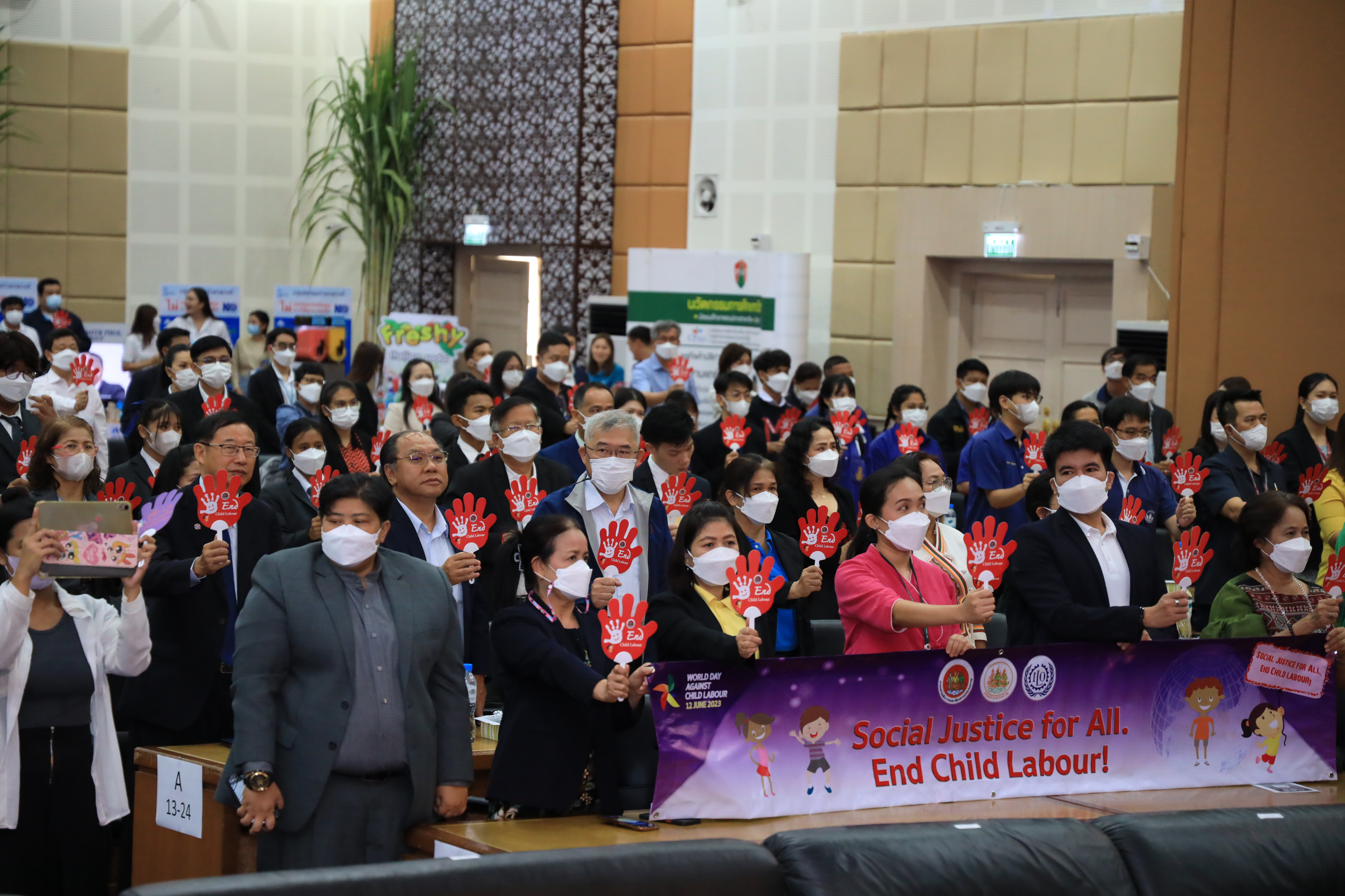 Mr. Boonchob gave a speech after chairing the World Day Against Child Labour opening ceremony on June 12, 2023. He said that the International Labour Organization (ILO) had designated June 12 of each year as the World Day Against Child Labour to encourage society to recognize the importance of taking action to prevent and eliminate child labour. This year, the ILO has set its main theme: Social Justice for All. End Child Labour. It focuses on all sectors working together against child labour in various dimensions so that every child has a good quality of life. It is an important force in driving the country. Today’s event had participants, including government agencies, employers, employees, non-governmental organizations, representatives of the embassies in Thailand, students, and the general public, totaling over 300 people. The occasion took place both in the meeting room and via electronic media (Zoom), in which the participants displayed anti-child labour symbols to convey the cooperation from all sectors in eliminating the worst forms of child labour.