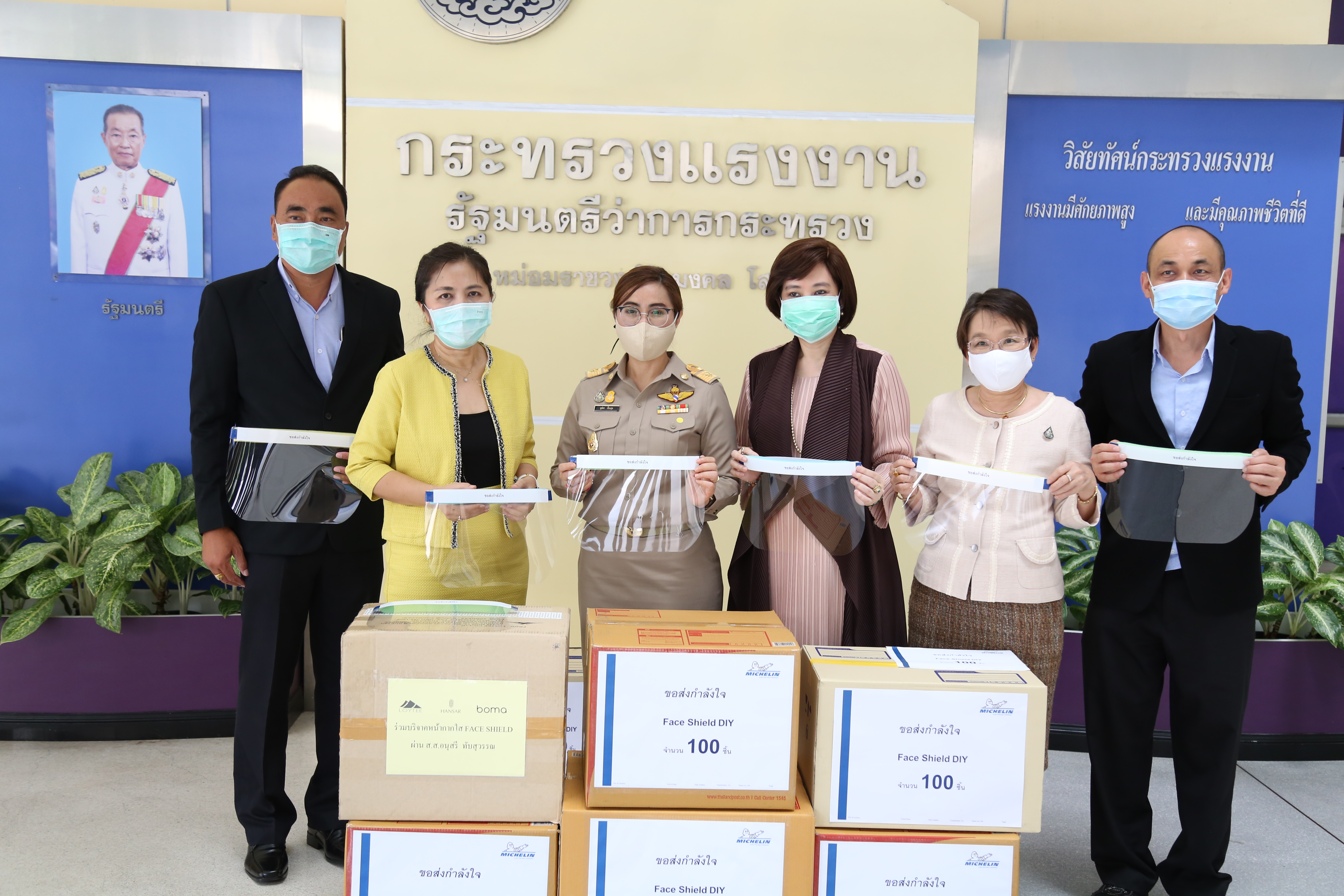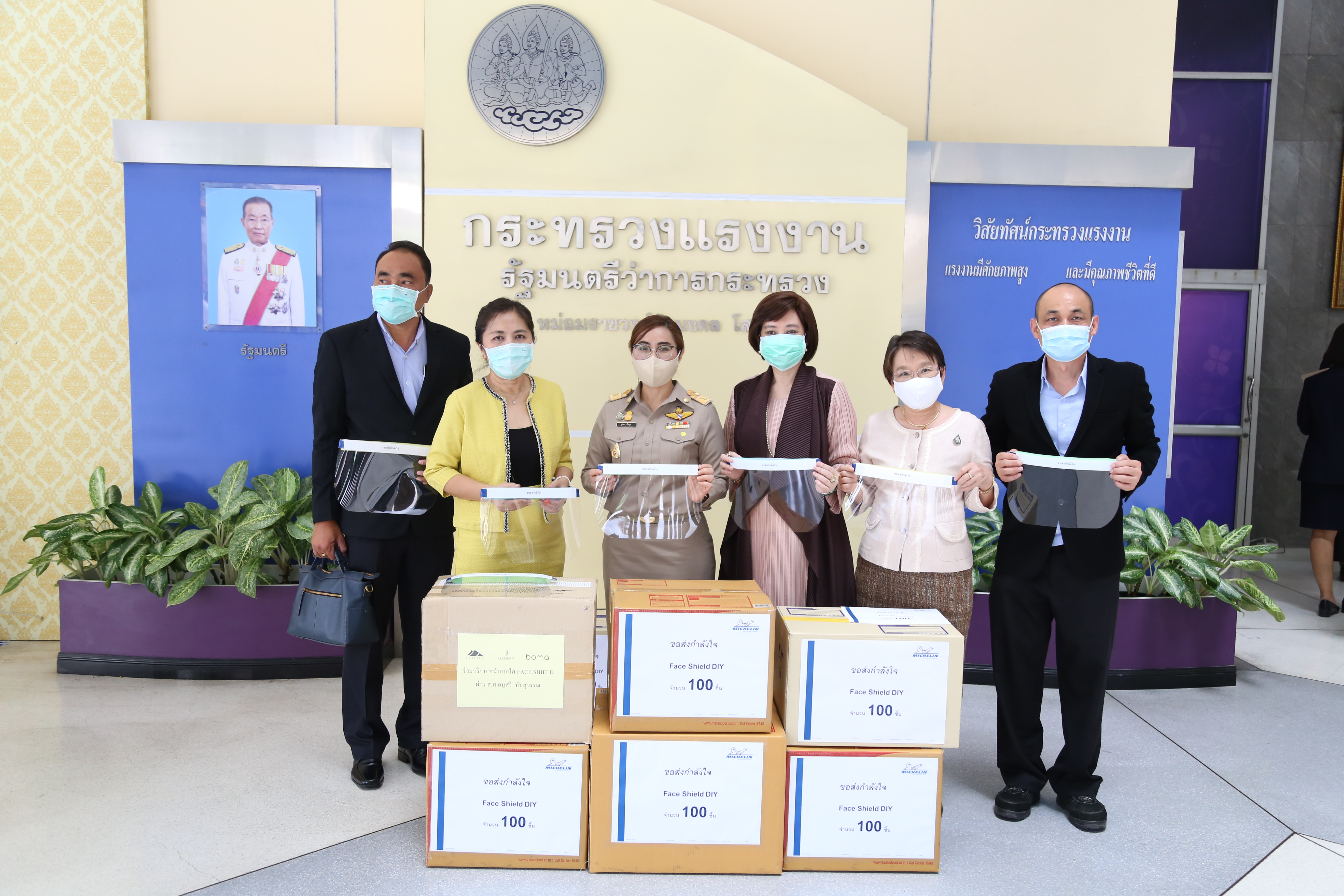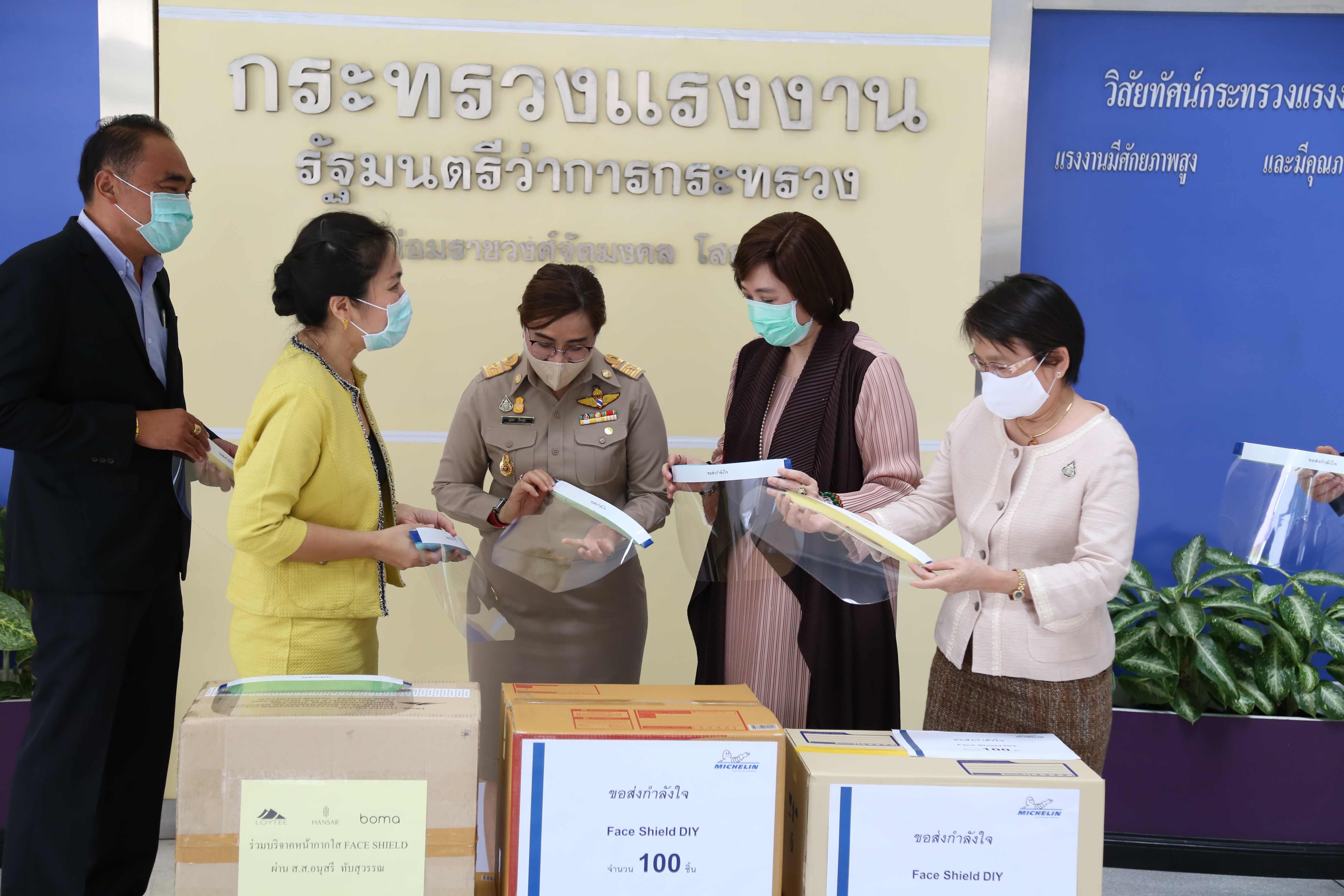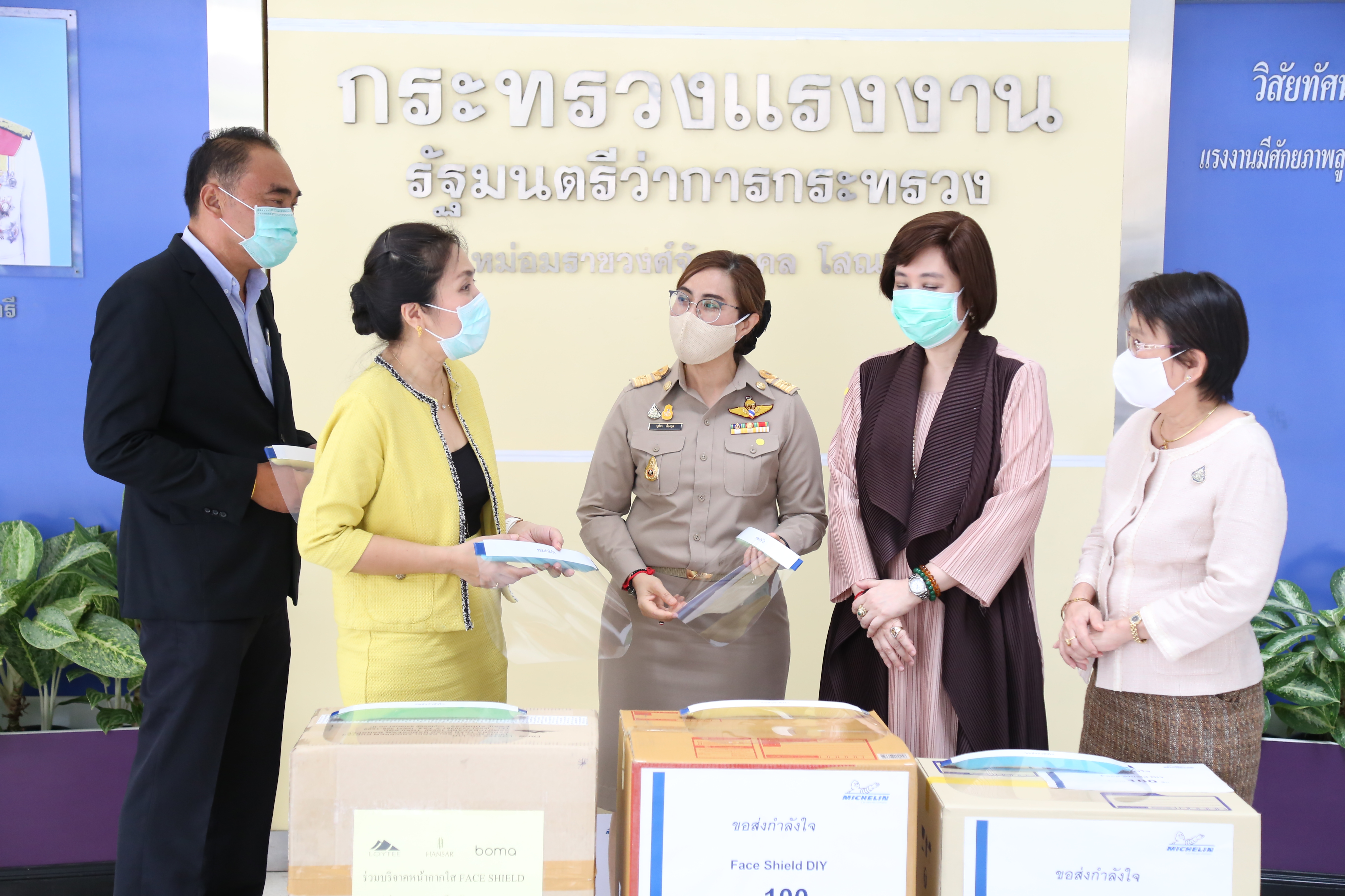 วันที่ ๑๓ เมษายน ๒๕๖๓ เวลา ๑๓.๐๐ น. นางสาวอนุสรี ทับสุวรรณ สมาชิกสภาผู้แทนราษฎร คณะกรรมาธิการแรงงาน และที่ปรึกษารัฐมนตรีว่าการกระทรวงแรงงาน นางเธียรรัตน์ นะวะมะวัฒน์ รองปลัดกระทรวงแรงงาน และนางสาวบุปผา เรืองสุด รองเลขาธิการสำนักงานประกันสังคม รับมอบหน้ากากใส Face Shield จากคุณปาริชาติ ประจันพาณิชย์ ผู้อำนวยการฝ่ายบุคคล สยามมิชลิน ประเทศไทย และคุณนลิน พิพิธวรรณ ผู้จัดการพัฒนาบุคคล สยามมิชลิน โรงงานแหลมฉบัง จำนวน ๖๐๐ ชิ้น เพื่อนำไปแจกจ่ายให้กับเจ้าหน้าที่ของสำนักงานประกันสังคมใช้ในการป้องกันแพร่การระบาดของเชื้อไวรัสโควิด-๑๙ รวมถึงเป็นการแสดงออกถึงความร่วมมือของทุกภาคส่วน ที่ต้องการมีส่วนร่วมป้องกันการแพร่ระบาดของเชื้อไวรัสโควิด-๑๙ ณ บริเวณชั้นล่างตึก ๑๕ ชั้น อาคารกระทรวงแรงงาน