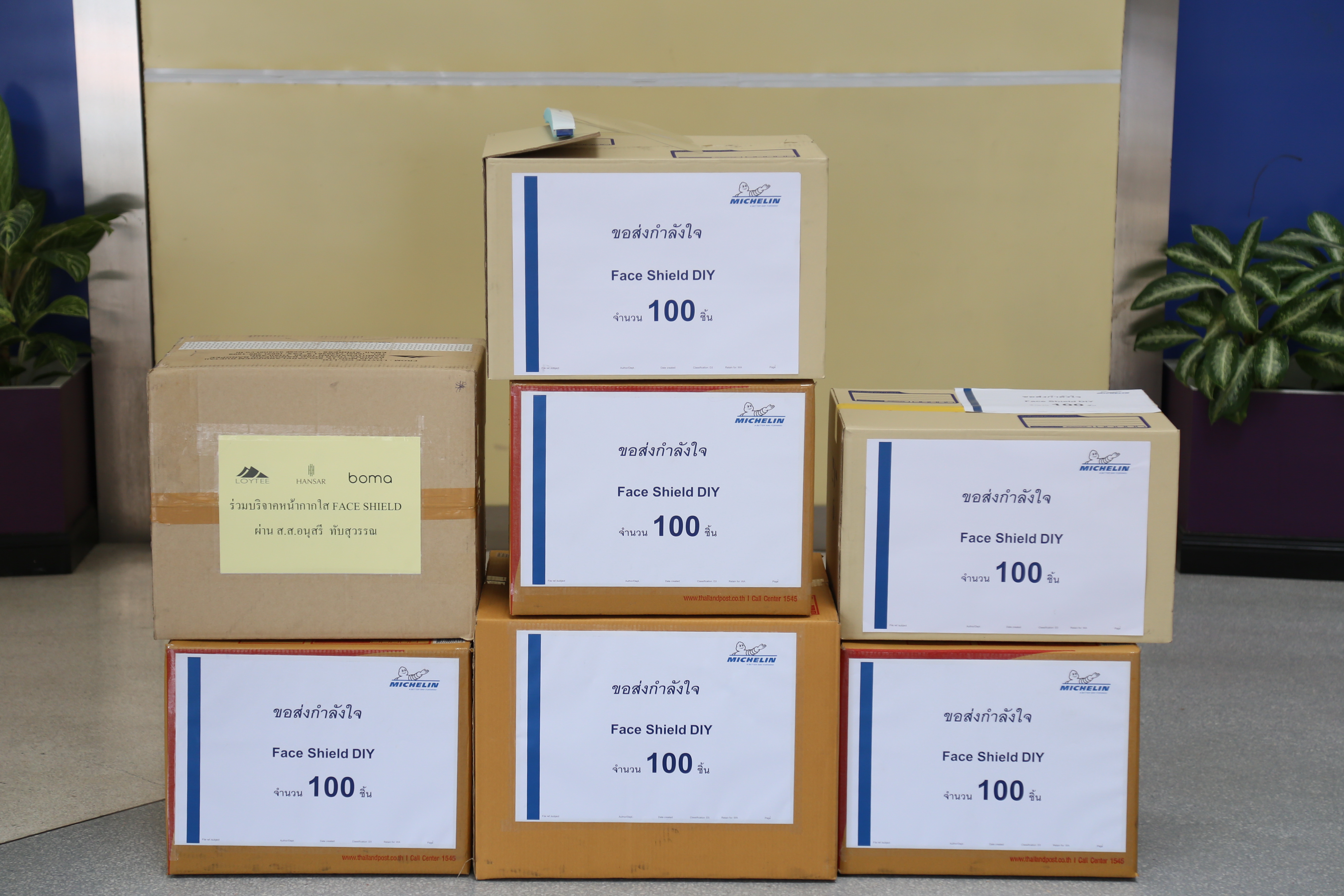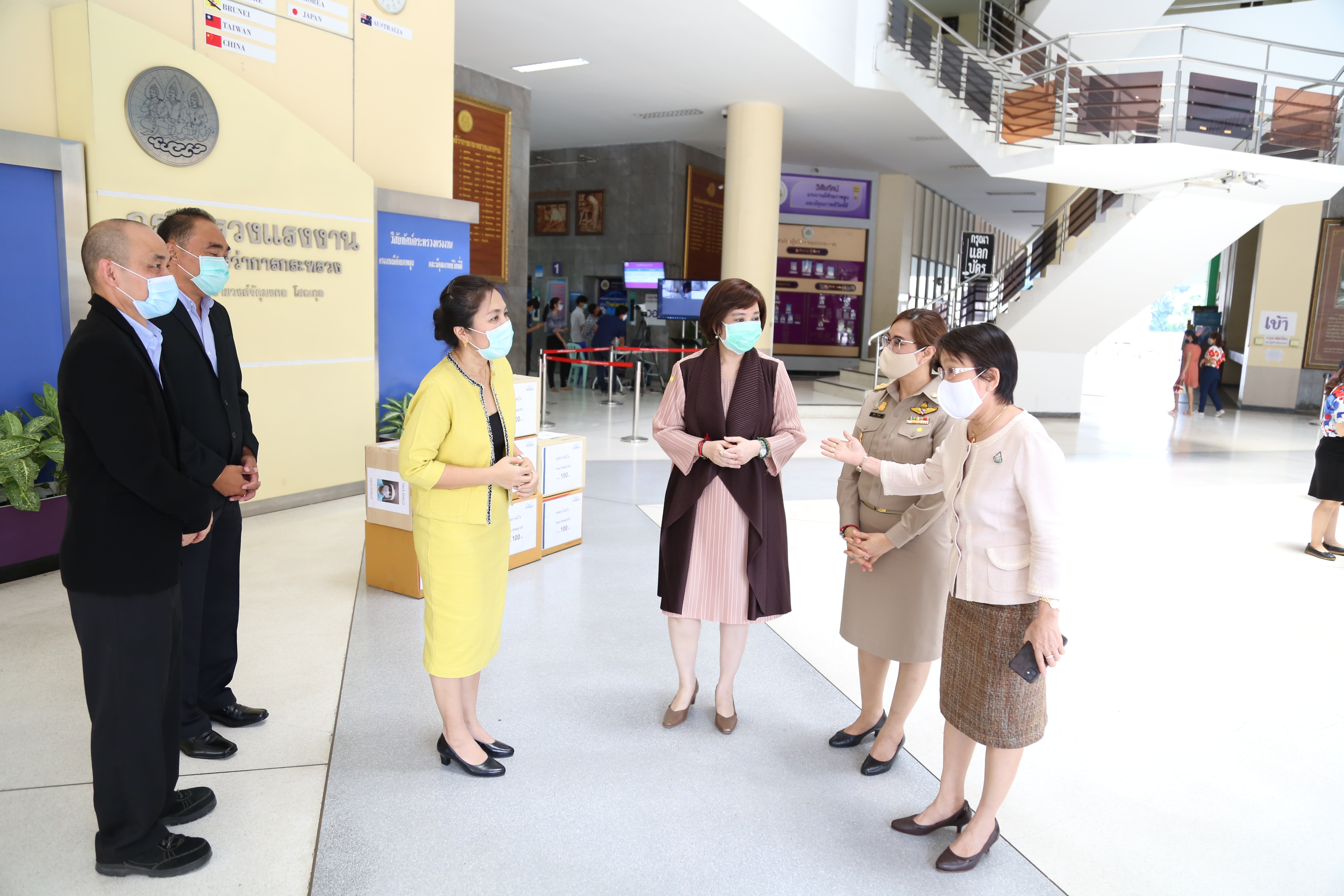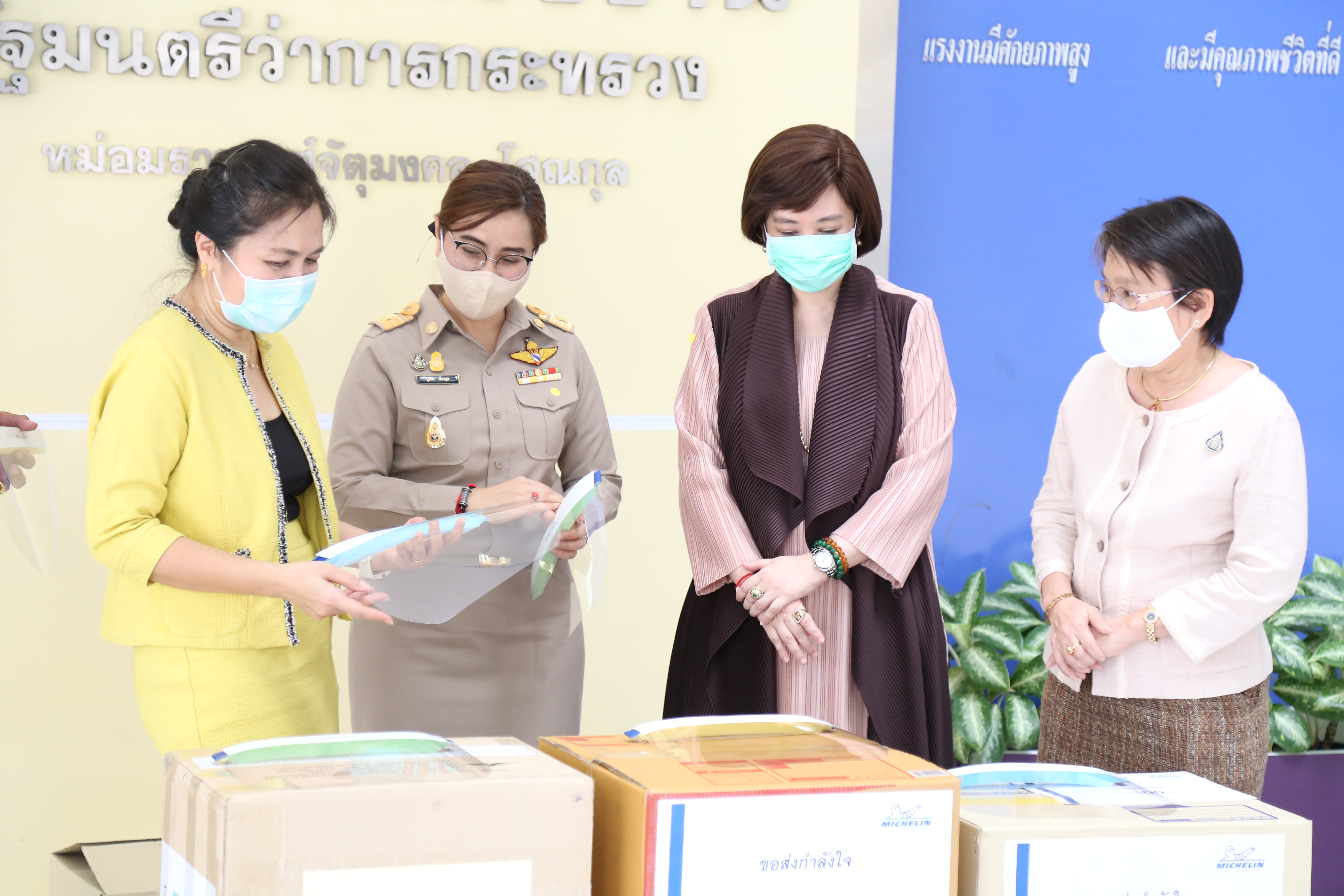 วันที่ ๑๓ เมษายน ๒๕๖๓ เวลา ๑๓.๐๐ น. นางสาวอนุสรี ทับสุวรรณ สมาชิกสภาผู้แทนราษฎร คณะกรรมาธิการแรงงาน และที่ปรึกษารัฐมนตรีว่าการกระทรวงแรงงาน นางเธียรรัตน์ นะวะมะวัฒน์ รองปลัดกระทรวงแรงงาน และนางสาวบุปผา เรืองสุด รองเลขาธิการสำนักงานประกันสังคม รับมอบหน้ากากใส Face Shield จากคุณปาริชาติ ประจันพาณิชย์ ผู้อำนวยการฝ่ายบุคคล สยามมิชลิน ประเทศไทย และคุณนลิน พิพิธวรรณ ผู้จัดการพัฒนาบุคคล สยามมิชลิน โรงงานแหลมฉบัง จำนวน ๖๐๐ ชิ้น เพื่อนำไปแจกจ่ายให้กับเจ้าหน้าที่ของสำนักงานประกันสังคมใช้ในการป้องกันแพร่การระบาดของเชื้อไวรัสโควิด-๑๙ รวมถึงเป็นการแสดงออกถึงความร่วมมือของทุกภาคส่วน ที่ต้องการมีส่วนร่วมป้องกันการแพร่ระบาดของเชื้อไวรัสโควิด-๑๙ ณ บริเวณชั้นล่างตึก ๑๕ ชั้น อาคารกระทรวงแรงงาน