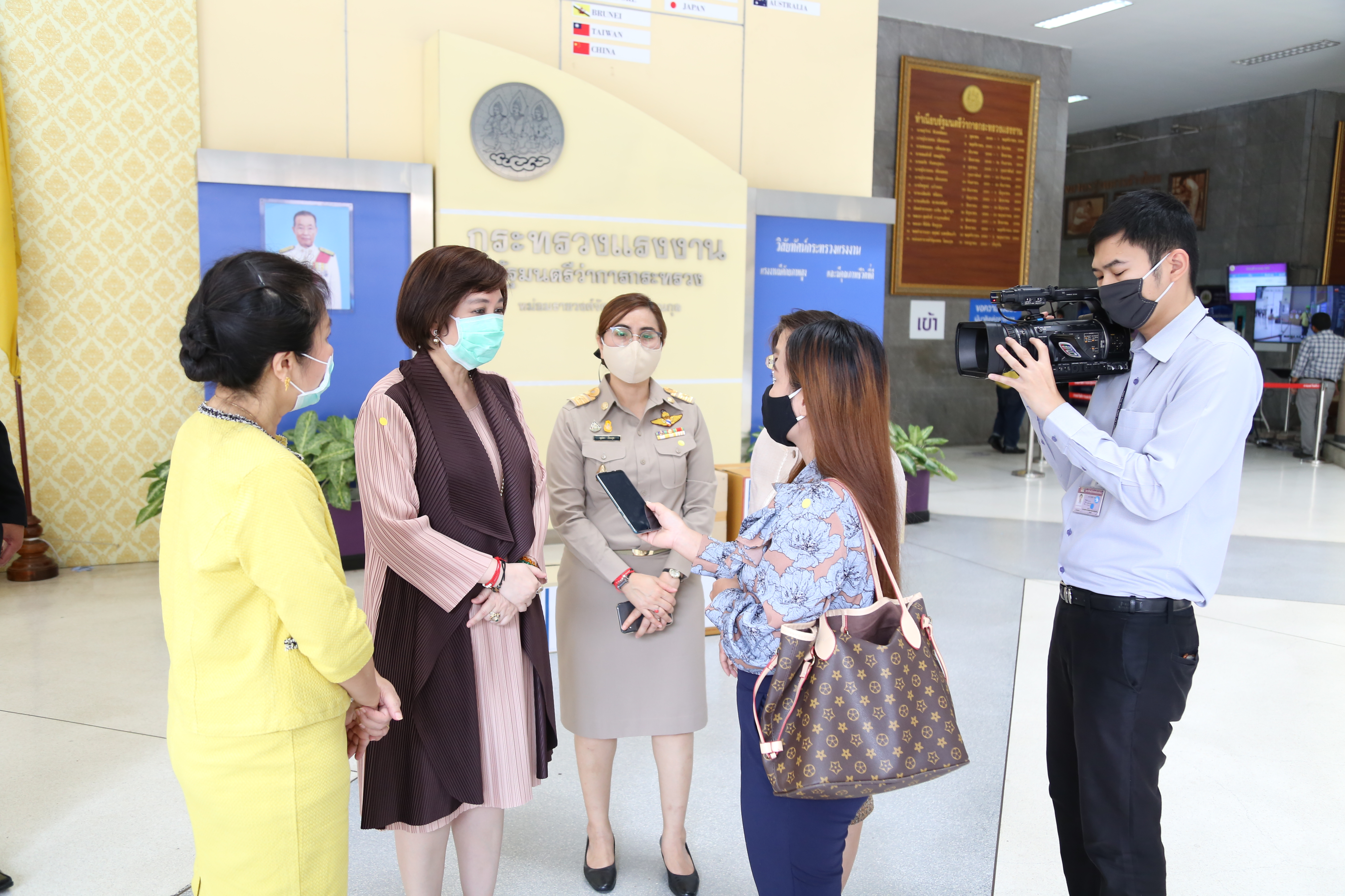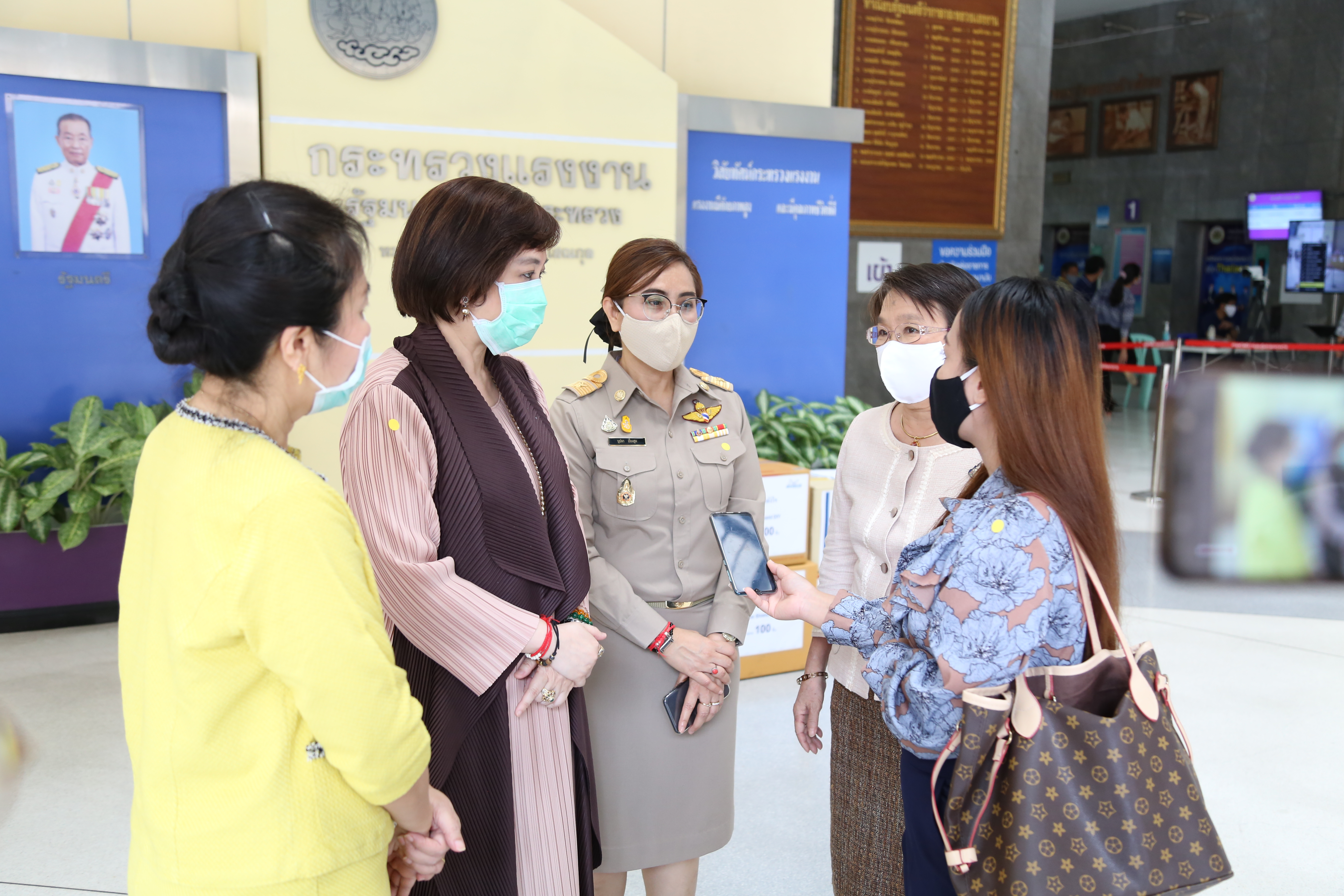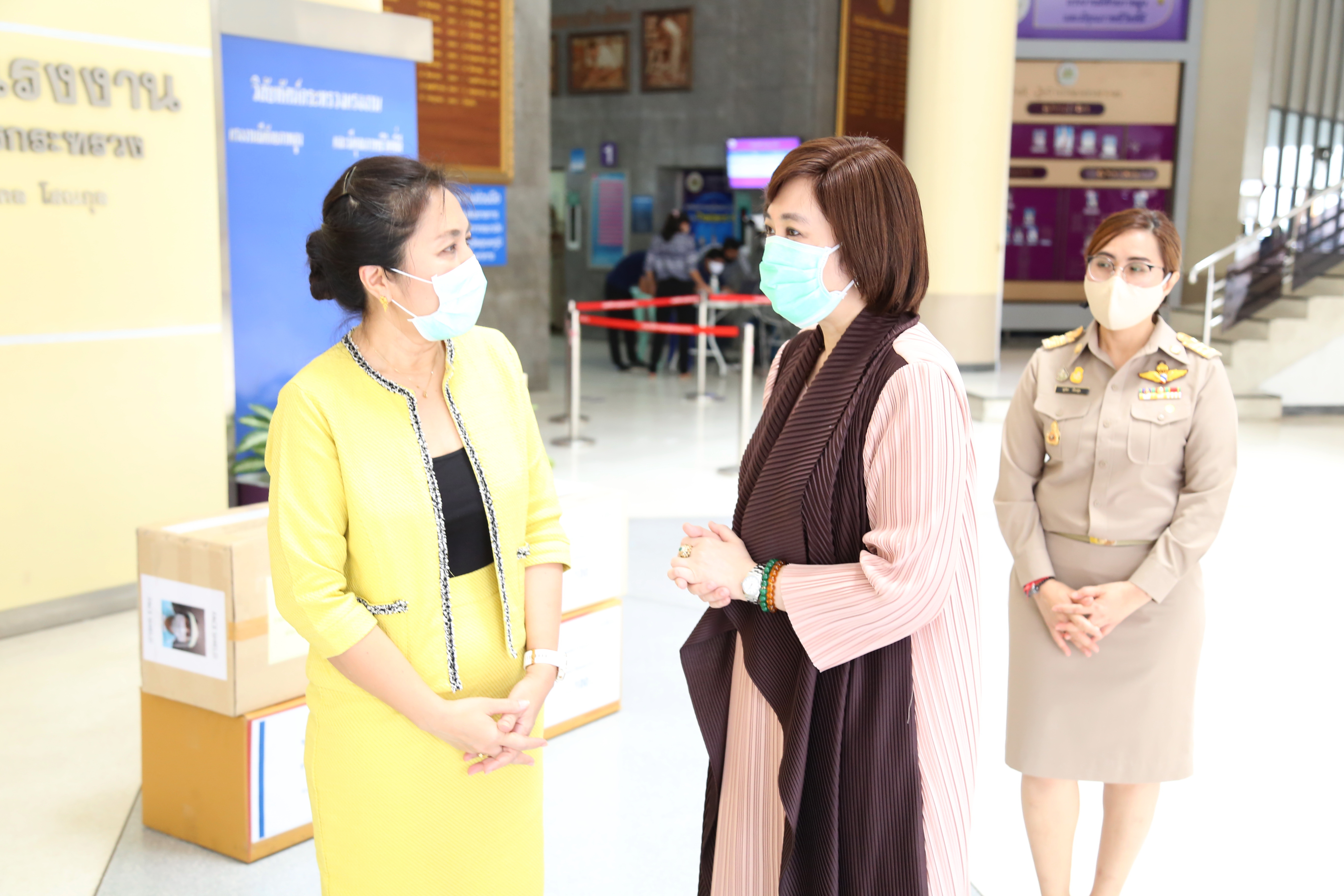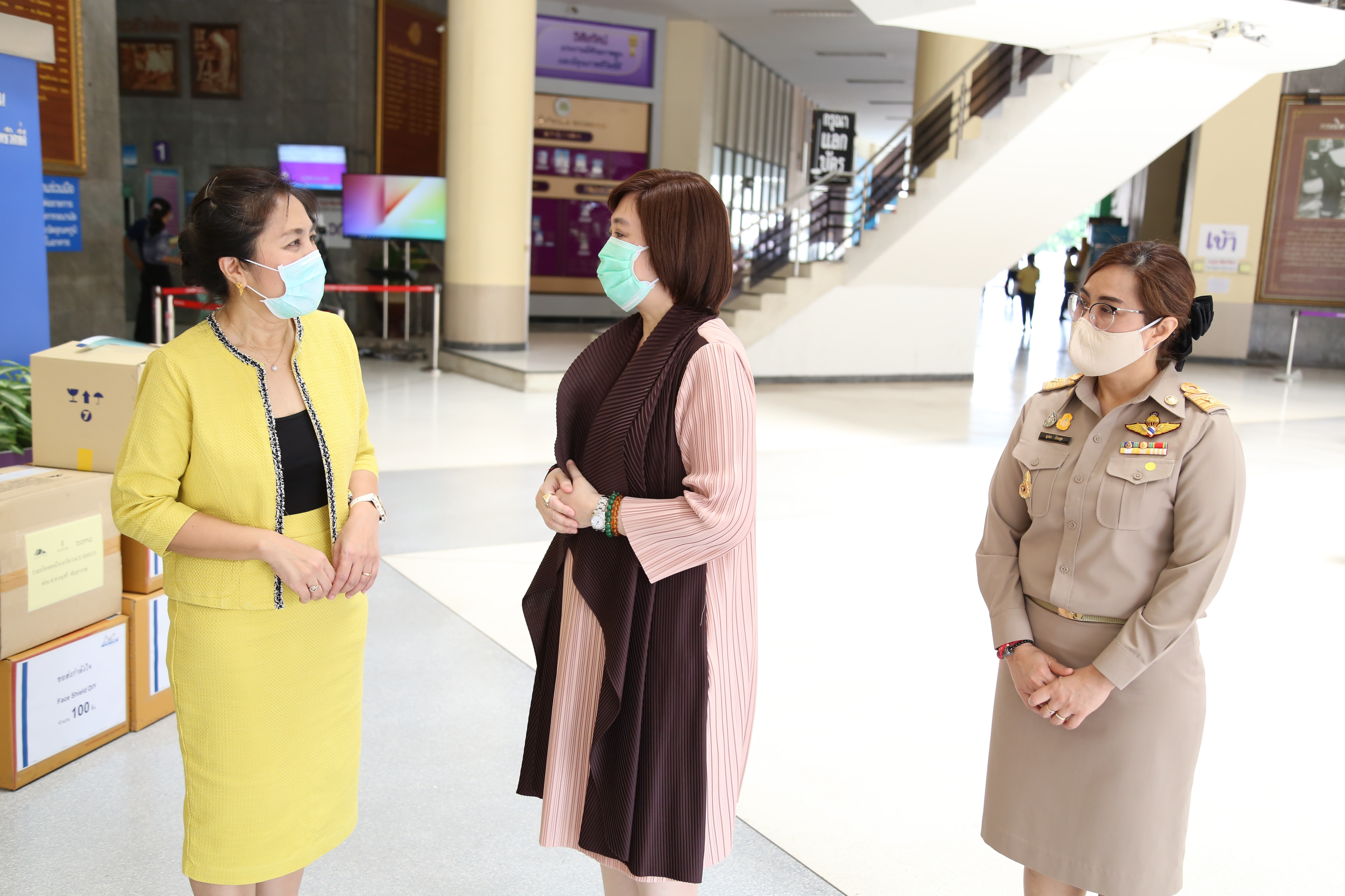วันที่ ๑๓ เมษายน ๒๕๖๓ เวลา ๑๓.๐๐ น. นางสาวอนุสรี ทับสุวรรณ สมาชิกสภาผู้แทนราษฎร คณะกรรมาธิการแรงงาน และที่ปรึกษารัฐมนตรีว่าการกระทรวงแรงงาน นางเธียรรัตน์ นะวะมะวัฒน์ รองปลัดกระทรวงแรงงาน และนางสาวบุปผา เรืองสุด รองเลขาธิการสำนักงานประกันสังคม รับมอบหน้ากากใส Face Shield จากคุณปาริชาติ ประจันพาณิชย์ ผู้อำนวยการฝ่ายบุคคล สยามมิชลิน ประเทศไทย และคุณนลิน พิพิธวรรณ ผู้จัดการพัฒนาบุคคล สยามมิชลิน โรงงานแหลมฉบัง จำนวน ๖๐๐ ชิ้น เพื่อนำไปแจกจ่ายให้กับเจ้าหน้าที่ของสำนักงานประกันสังคมใช้ในการป้องกันแพร่การระบาดของเชื้อไวรัสโควิด-๑๙ รวมถึงเป็นการแสดงออกถึงความร่วมมือของทุกภาคส่วน ที่ต้องการมีส่วนร่วมป้องกันการแพร่ระบาดของเชื้อไวรัสโควิด-๑๙ ณ บริเวณชั้นล่างตึก ๑๕ ชั้น อาคารกระทรวงแรงงาน