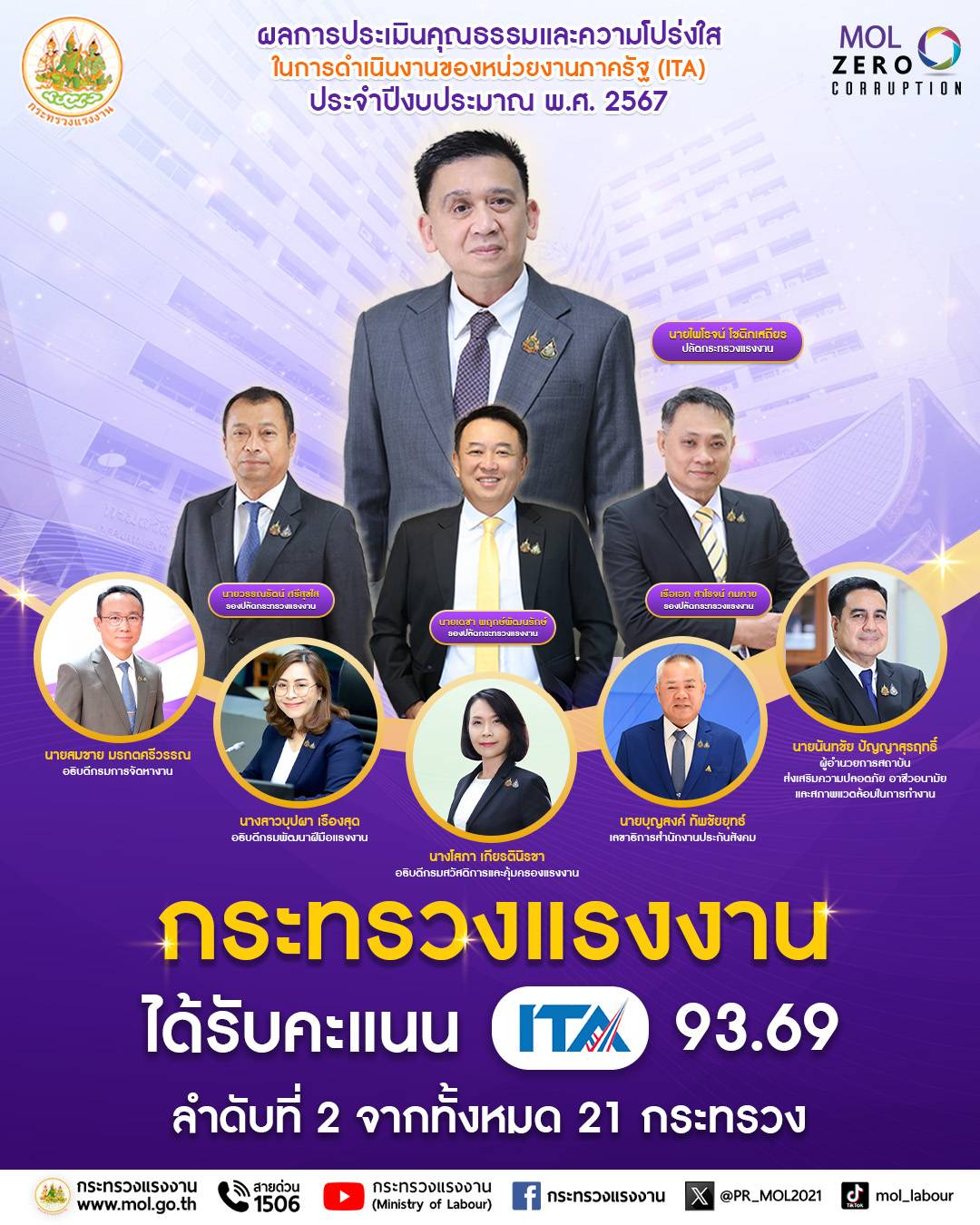 วันที่ 2 สิงหาคม 2567 นายไพโรจน์ โชติกเสถียร ปลัดกระทรวงแรงงาน เปิดเผยว่า เมื่อวันที่ 30 กรกฎาคมที่ผ่านมา สำนักงานคณะกรรมการป้องกันและปราบปรามการทุจริตแห่งชาติ (ป.ป.ช.) ได้ประกาศผลการประเมินคุณธรรมและความโปร่งใสในการดำเนินงานของหน่วยงานภาครัฐ (Integrity and Transparency Assessment : ITA) ประจำปีงบประมาณ พ.ศ.2567 (ITA DAY & ITA AWARDS 2024) ภายใต้แนวคิด Transparency with Quality : โปร่งใสอย่างมีคุณภาพ โดยในปีนี้ กระทรวงแรงงาน ได้คะแนนเฉลี่ยรวมจากทุกกรม 93.69 จากคะแนนเต็ม 100 คะแนน อยู่อันดับที่ 2 ของประเทศ จากทั้งหมด 21 กระทรวง ในผลการประเมินรายกระทรวง ได้คะแนน ซึ่งเป็นคะแนน ดีขึ้นกว่าในปี 2566 ที่ได้อันดับที่ 5 ส่วนอันดับที่ 1 ได้แก่ กระทรวงอุตสาหกรรม ได้รับผลการประเมินที่ 93.85 คะแนน อันดับ 3 กระทรวงการคลัง ได้คะแนน 93.29 คะแนน