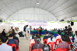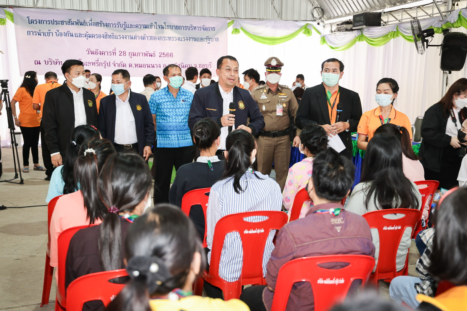 On February 28, 2023, at 14.00 hours, the Deputy Permanent Secretary of Labour as the Ministry of Labour’s Spokesperson, Mr. Wannarat Srisuksai, presided over the closing ceremony of the Ministry of Labour’s road show to create awareness and understanding of the Ministry of Labour and governments policies for administration, importation, and protection of foreign workers’ rights. The roadshow aimed to raise awareness of the rights of migrant workers under the concept of “foreign workers and Thai workers treated equally” to encourage employers and business operators to employ foreign workers legally. The Director of Public Relations from the Office of the Permanent Secretary of Labour, Mr. Arkhom Koommoo, reported the event’s objectives. Heads of government agencies under the Ministry of Labour in Chonburi Province, the HR Manager of Panus Poultry Group Co., Ltd., and foreign workers joined to give a welcome at Phanat Poultry Group Co., Ltd., Mon Nang Subdistrict, Phanat Nikhom District, Chonburi Province. The company is in the agro-industry business, processing frozen foods and chicken for export to foreign countries. It currently employs 6,500 Myanmar and Cambodian workers and about 1,000 Thais.