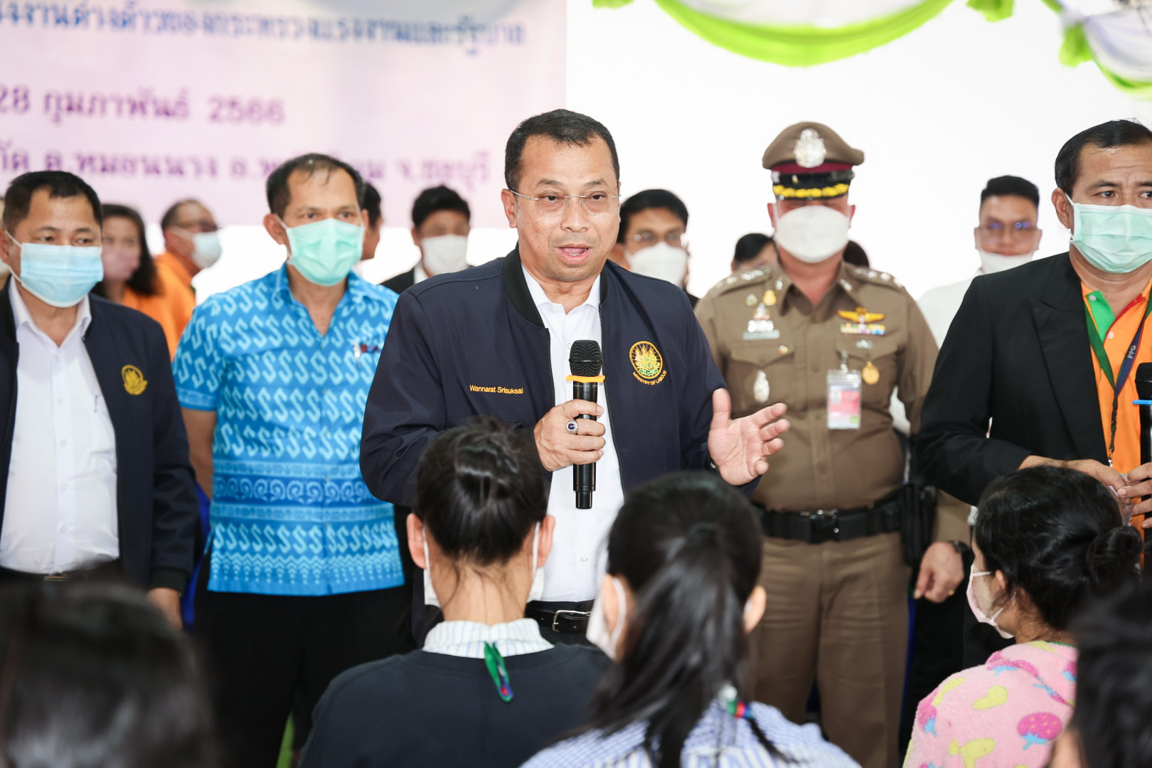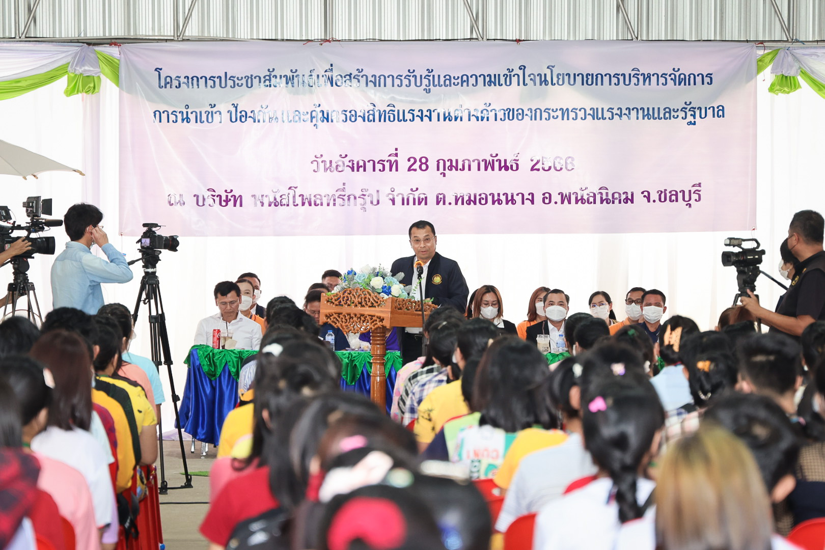 วันที่ 28 กุมภาพันธ์ 2566 เวลา 14.00 น. นายวรรณรัตน์ ศรีสุขใส รองปลัดกระทรวงแรงงานและโฆษกกระทรวงแรงงาน เป็นประธานกล่าวเปิดกิจกรรมออกหน่วยประชาสัมพันธ์เคลื่อนที่(Road Show) ของกระทรวงแรงงาน ตามโครงการประชาสัมพันธ์เพื่อสร้างการรับรู้ และความเข้าใจนโยบายการบริหารจัดการ การนำเข้า ป้องกันและคุ้มครองสิทธิแรงงานต่างด้าวของกระทรวงแรงงานและรัฐบาล เพื่อสร้างการรับรู้เรื่องสิทธิของแรงงานต่างด้าว ภายใต้กรอบแนวคิด “แรงงานต่างด้าวและแรงงานไทยได้รับการดูแลอย่างเท่าเทียม” เพื่อส่งเสริมให้นายจ้างสถานประกอบการจ้างแรงงานต่างด้าวถูกกฎหมาย โดยมี นายอาคม คุ้มหมู่ ผู้อำนวยการกองเผยแพร่และประชาสัมพันธ์ สำนักงานปลัดกระทรวงแรงงาน กล่าวรายงานวัตถุประสงค์การจัดงาน พร้อมด้วยหัวหน้าส่วนราชการหน่วยงานสังกัดกระทรวงแรงงานจังหวัดชลบุรี ผู้จัดการฝ่ายบุคคลบริษัท พนัสโพลทรี่ กรุ๊ป จำกัด และลูกจ้างแรงงานต่างด้าว ร่วมให้การต้อนรับ ณ บริษัท พนัสโพลทรี่ กรุ๊ป จำกัด ต.หมอนนาง อ.พนัสนิคม จ.ชลบุรี ซึ่งเป็นสถานประกอบกิจการประกอบธุรกิจอุตสาหกรรมการเกษตร ประเภทแปรรูปอาหารแช่แข็ง ไก่ เพื่อการส่งออกไปต่างประเทศ ปัจจุบันมีลูกจ้าง แรงงานต่างด้าวสัญชาติเมียนมา และกัมพูชาจำนวนประมาณ 6,500 คน เป็นคนไทยประมาณ 1,000 คน