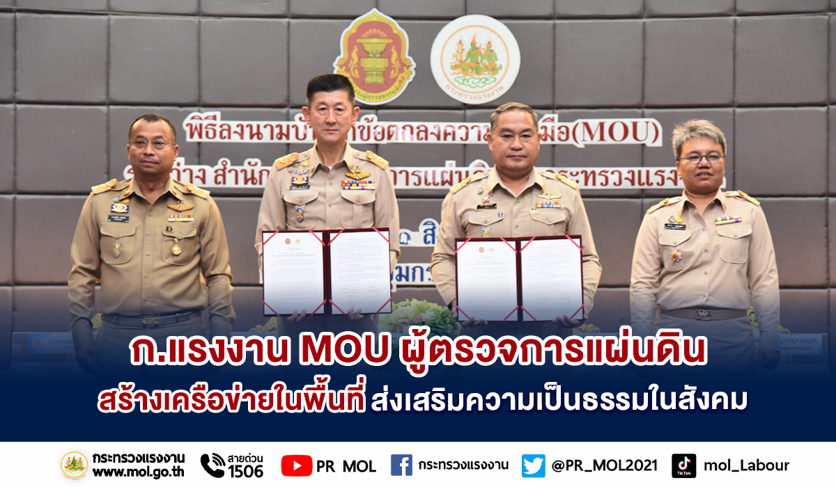 วันที่ 21 สิงหาคม 2566 นายบุญชอบ สุทธมนัสวงษ์ ปลัดกระทรวงแรงงาน เป็นประธานในพิธีลงนามบันทึกข้อตกลงความร่วมมือระหว่าง สำนักงานผู้ตรวจการแผ่นดิน กับ กระทรวงแรงงาน เรื่อง การประสานความร่วมมือการทำงานผ่านเครือข่ายระดับพื้นที่ และการร่วมมือด้านวิชาการ โดยมี พันตำรวจโท กีรป กฤตธีรานนท์ เลขาธิการสำนักงานผู้ตรวจการแผ่นดิน ร่วมลงนาม นายวรรณรัตน์ ศรีสุขใส รองปลัดกระทรวงแรงงาน นางสาวคมขวัญ กาญจนกุญชร รองเลขาธิการสำนักงานผู้ตรวจการแผ่นดิน เป็นสักขีพยาน นายสมศักดิ์ สุวรรณสุจริต ประธานผู้ตรวจการแผ่นดิน นายทรงศักดิ์ สายเชื้อ ผู้ตรวจการแผ่นดิน พร้อมด้วยผู้บริหารระดับสูงกระทรวงแรงงานและสำนักงานผู้ตรวจการแผ่นดิน ร่วมเป็นเกียรติในพิธีดังกล่าวด้วย ณ ห้องประชุมกระทรวงแรงงาน ชั้น 5 อาคารกระทรวงแรงงาน
