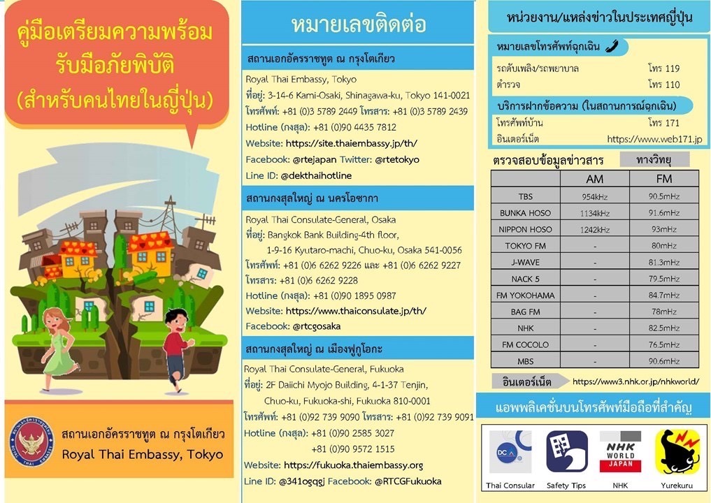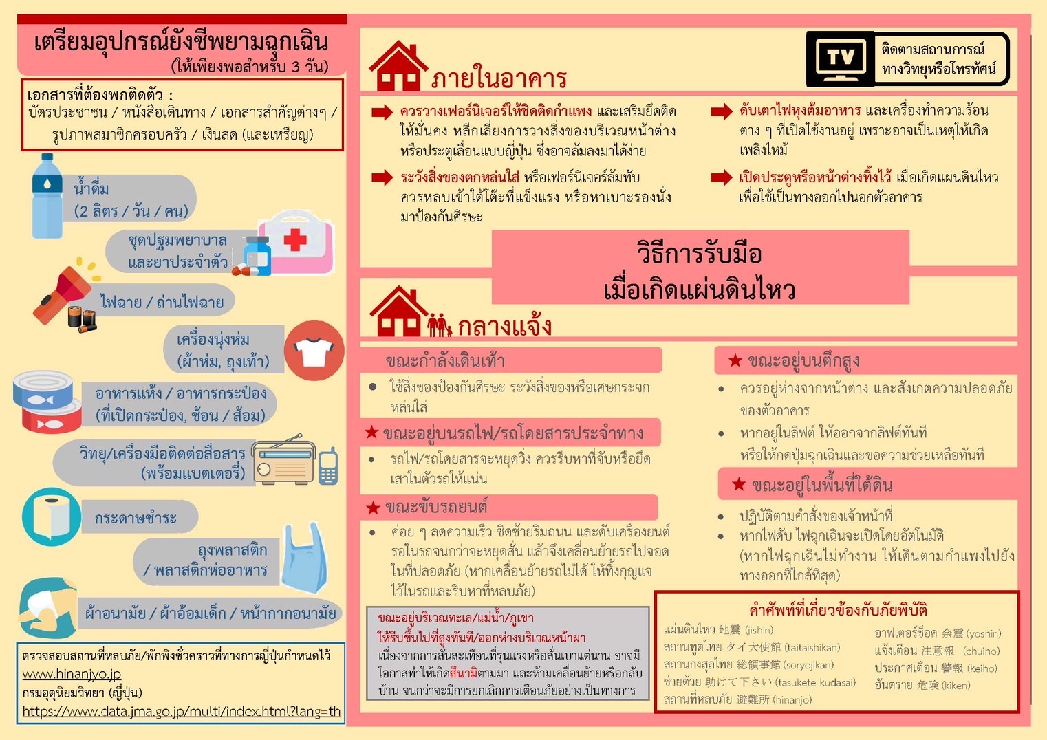 คู่มือเตรียมความพร้อมรับมือภัยพิบัติ (สำหรับคนไทยในญี่ปุ่น) จัดทำโดยสถานเอกอัครราชทูต ณ กรุงโตเกียว ปรากฏตาม