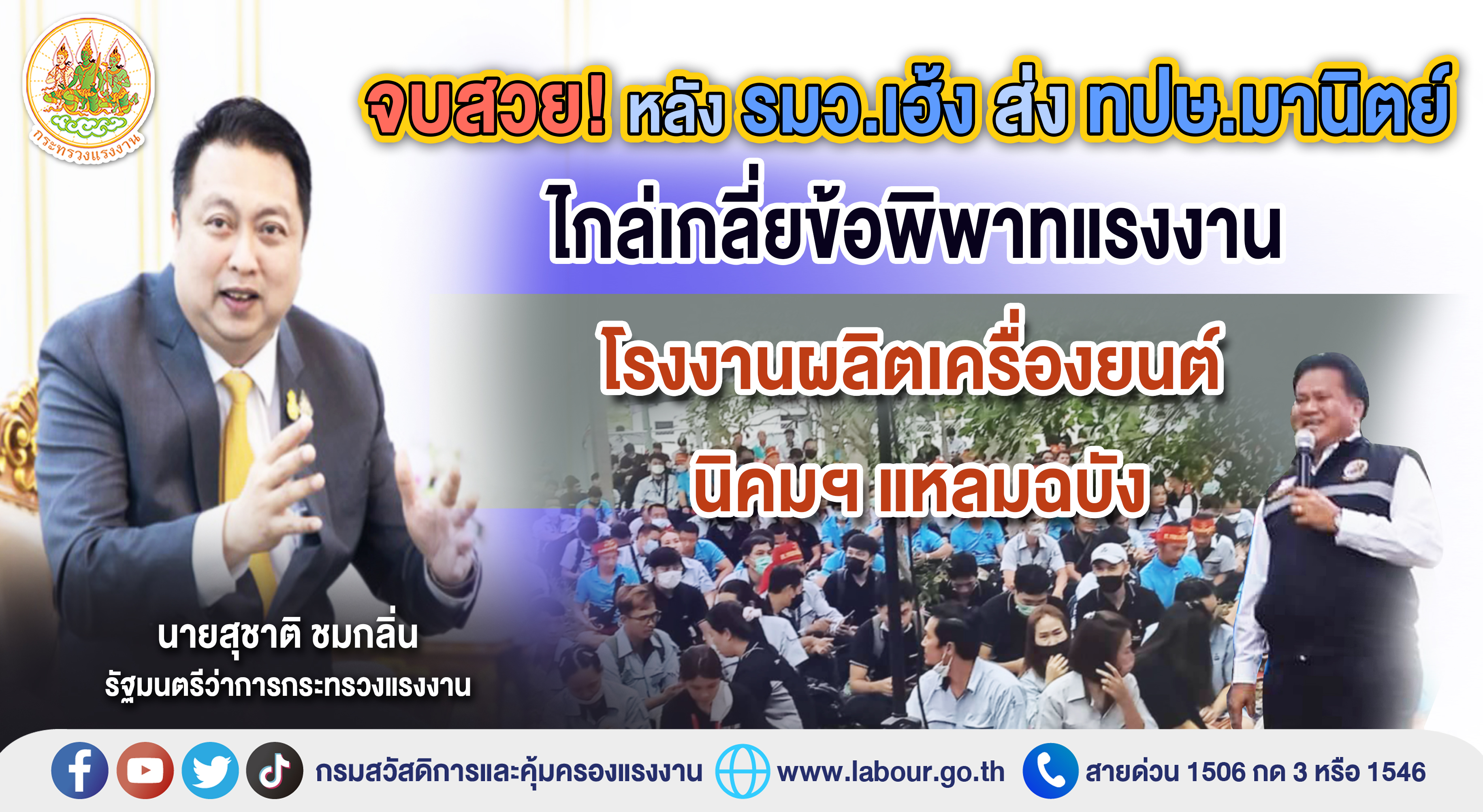 รมว. สุชาติ ส่งที่ปรึกษา รมว.แรงงาน แก้ไขปัญหาข้อพิพาทแรงงาน อ.แหลมฉบัง จ.ชลบุรี สำเร็จ ภายหลังลงพื้นที่ร่วมกับพนักงานประนอมฯ กสร.เพื่อร่วมแก้ไขปัญหาอย่างต่อเนื่อง แนะนายจ้างลูกจ้างต้องใช้หลักสุจริตใจและแรงงานสัมพันธ์ที่ดี