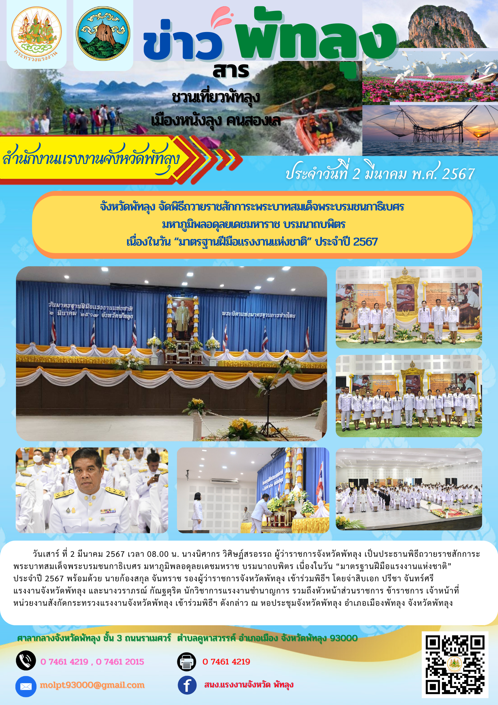 วันเสาร์ ที่ 2 มีนาคม 2567 เวลา 08.00 น. นางนิศากร วิศิษฏ์สรอรรถ ผู้ว่าราชการจังหวัดพัทลุง เป็นประธานพิธีถวายราชสักการะพระบาทสมเด็จพระบรมชนกาธิเบศร มหาภูมิพลอดุลยเดชมหราช บรมนาถบพิตร เนื่องในวัน “มาตรฐานฝีมือแรงงานแห่งชาติ” ประจำปี 2567 พร้อมด้วย นายก้องสกุล จันทราช รองผู้ว่าราชการจังหวัดพัทลุง เข้าร่วมพิธีฯ โดยจ่าสิบเอก ปรีชา จันทร์ศรี แรงงานจังหวัดพัทลุง และนางวราภรณ์ กัณฐตุริต นักวิชาการแรงงานชำนาญการ รวมถึงหัวหน้าส่วนราชการ ข้าราชการ เจ้าหน้าที่ หน่วยงานสังกัดกระทรวงแรงงานจังหวัดพัทลุง เข้าร่วมพิธีฯ ดังกล่าว ณ หอประชุมจังหวัดพัทลุง อำเภอเมืองพัทลุง จังหวัดพัทลุง