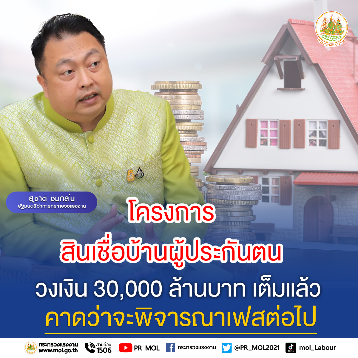 วันที่ 21 ธันวาคม 2565 นายสุชาติ ชมกลิ่น รัฐมนตรีว่าการกระทรวงแรงงาน เปิดเผยว่า ตามที่กระทรวงแรงงาน โดยสำนักงานประกันสังคม ได้ลงนามบันทึกข้อตกลงความร่วมมือกับธนาคารอาคารสงเคราะห์(ธอส.) ดำเนินโครงการสินเชื่อที่อยู่อาศัยเพื่อผู้ประกันตนภายในวงเงินจำนวนไม่เกิน 30,000 ล้านบาทนั้น ซึ่งโครงการนี้เกิดจากการที่ท่านนายกรัฐมนตรี และรัฐมนตรีว่าการกระทรวงกลาโหม พล.อ.ประยุทธ์ จันทร์โอชา มีความห่วงใยต้องการที่จะช่วยเหลือแบ่งเบาภาระค่าใช้จ่ายให้แก่ผู้ใช้แรงงาน ผมในฐานะรัฐมนตรีว่าการกระทรวงแรงงานจึงได้คิดโครงการนี้ขึ้นมา เป็นโครงการที่ไม่มีเคยมีใครทำมาก่อน ถือเป็นครั้งแรกที่กระทรวงแรงงานทำ มีวัตถุประสงค์เพื่อให้ผู้ใช้แรงงานได้มีสิทธิ์ไถ่ถอนจำนองที่อยู่อาศัยจากสถาบันการเงิน ลดอัตราดอกเบี้ยเงินกู้ที่อยู่อาศัยที่ผู้ประกันตนเป็นหนี้อยู่ ทั้งนี้ ที่อยู่อาศัยนั้นจะต้องเป็นเป็นกรรมสิทธิ์ของผู้ประกันตนหรือกรรมสิทธิ์รวม ซึ่งผมดูแลให้ความสำคัญพี่น้องผู้ใช้แรงงานทุกคนเหมือนคนในครอบครัว โครงการนี้ทำให้ผู้ใช้แรงงานมีสิทธิ์ได้กู้เงินส่งบ้านในอัตราดอกเบี้ยต่ำ ยกตัวอย่างเช่น แต่เดิมผู้ใช้แรงงานกู้เงินต้นมา 2 ล้านบาท แต่ต้องจ่ายดอกเบี้ยสูงถึง 6 % ต่อปี ต้องเสียเงินค่าดอกเบี้ยปีละ 120,000 บาท 5 ปี คิดเป็นค่าดอกเบี้ย 600,000 บาท แต่พอผมคิดถึงเรื่องความมั่นคงในชีวิตความเป็นอยู่ของพี่น้องผู้ใช้แรงงานจึงคิดโครงการนี้ขึ้นมา เท่ากับว่าโครงการนี้พี่น้องผู้ใช้แรงงานกู้เงินต้นมา 2 ล้านบาทเท่ากัน แต่ดอกเบี้ยถูกกว่าเหลือเพียง 1.99 % ต่อปี เสียดอกเบี้ยเพียงปีละ 40,000 บาท ทำให้ 5 ปี จะเสียดอกเบี้ยเพียงแค่ 200,000 บาท ซึ่งโครงการที่ผมคิดขึ้นมานี้จะทำให้ลดดอกเบี้ยจากเดิม 5 ปี 600,000 บาท เหลือเพียง 200,000 บาท โดยลดดอกเบี้ยให้พี่น้องผู้ใช้แรงงานได้ถึง 400,000 บาทต่อครอบครัว ซึ่งเงินในส่วนนี้จะทำให้ผู้ใช้แรงงานมีเงินเหลือเก็บเข้ากระเป๋าเดือนละกว่า 6,000 บาท สามารถช่วยแบ่งเบาภาระค่าใช้จ่ายลดหนี้สินได้ และเกิดเม็ดเงินหมุนเวียนในระบบเศรษฐกิจอีกด้วย