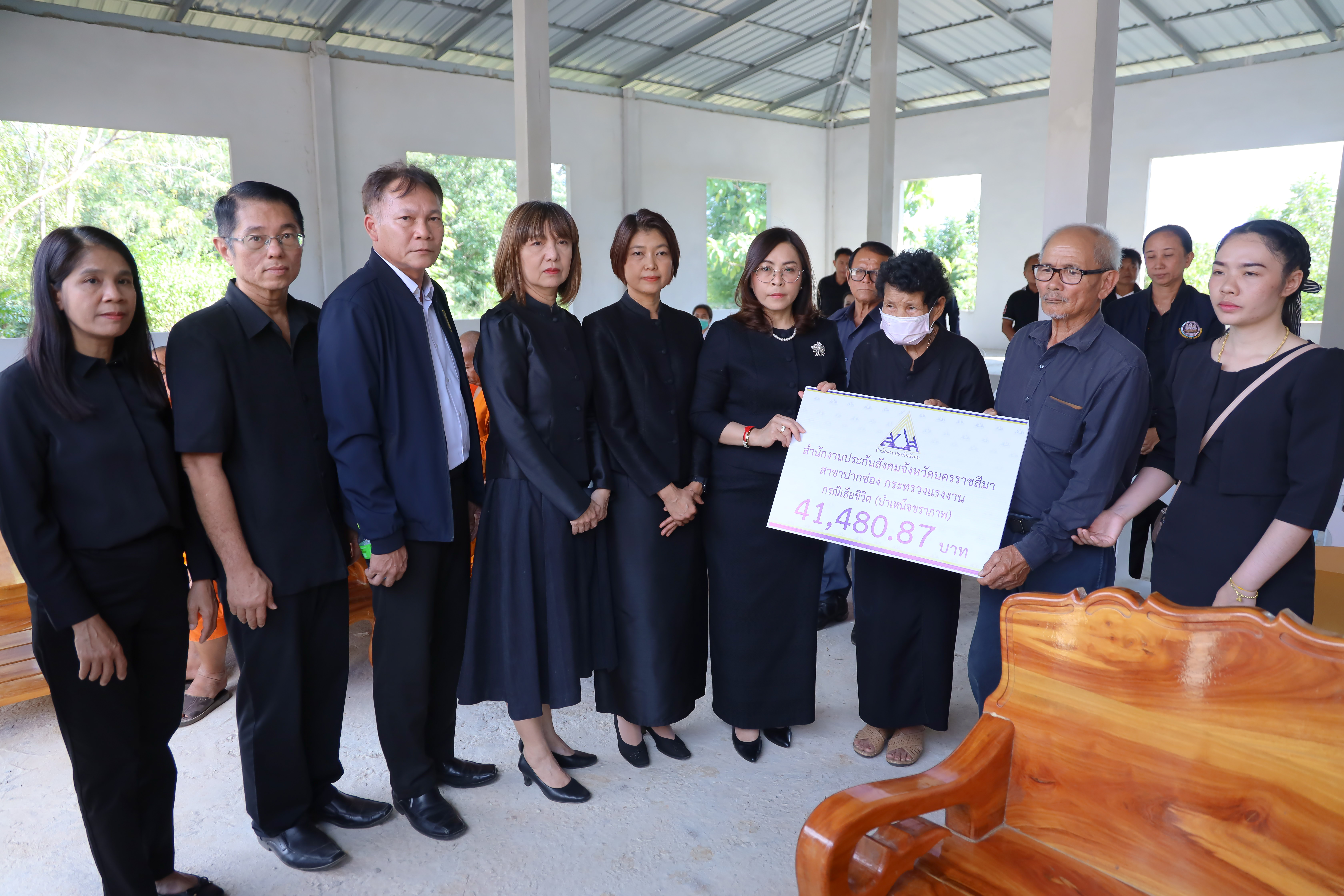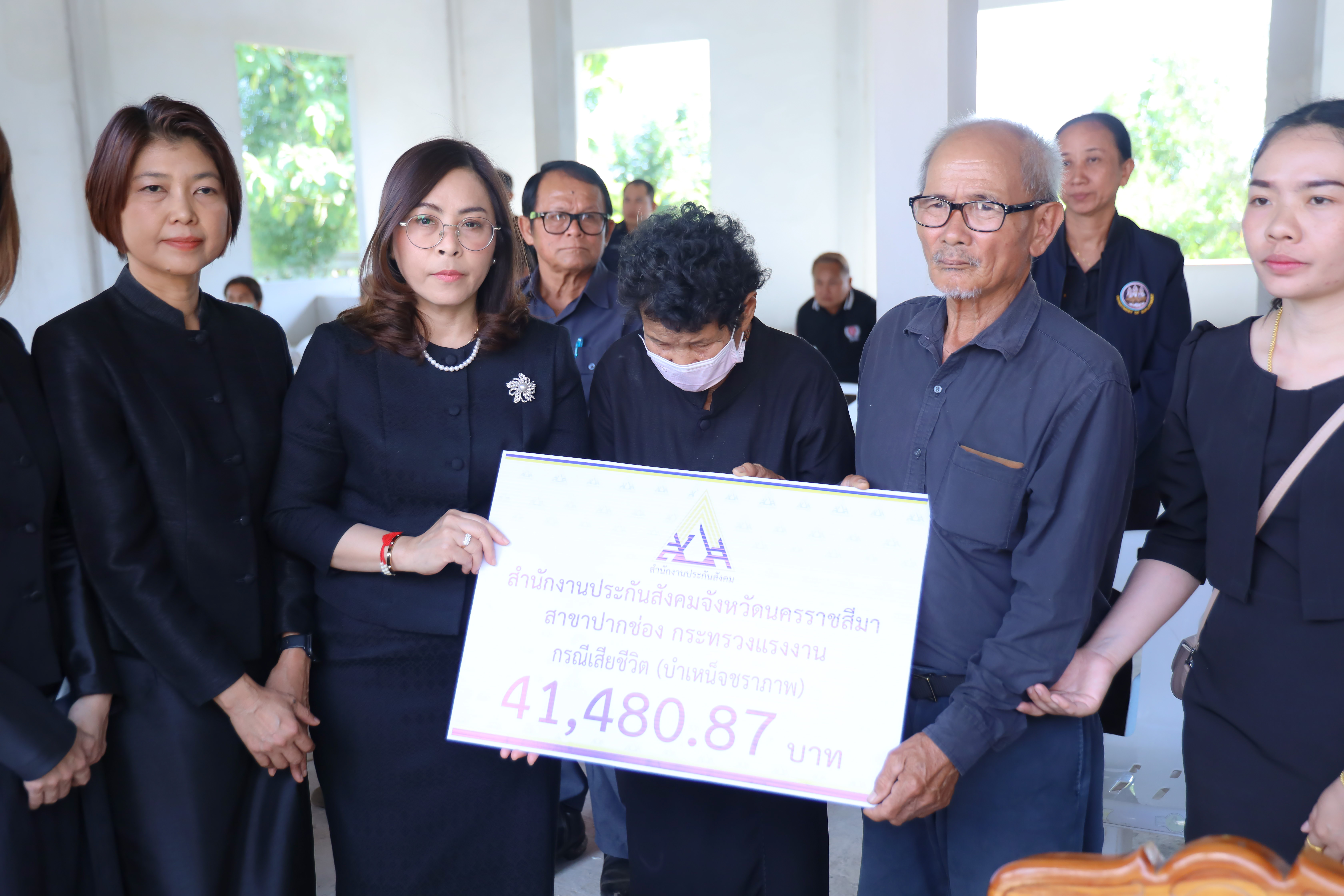 ในการนี้ น.ส.บุปผา รักษาราชการแทน รองปลัดกระทรวงแรงงาน ได้เป็นผู้แทนกระทรวงแรงงานมอบสิทธิประโยชน์จากสำนักงานประกันสังคมจังหวัดนครราชสีมา สาขาปากช่อง เป็นเงินบำเหน็จชราภาพ กรณีเสียชีวิต จำนวน 41,480.87 บาท ให้แก่ทายาทของนายธนา ตลอดจนมอบเงินช่วยเหลือปลอบขวัญกำลังใจ และฝากความห่วงใยจากรัฐมนตรีว่าการกระทรวงแรงงาน และปลัดกระทรวงแรงงานมายังครอบครัวแรงงานไทยที่เสียชีวิตด้วย