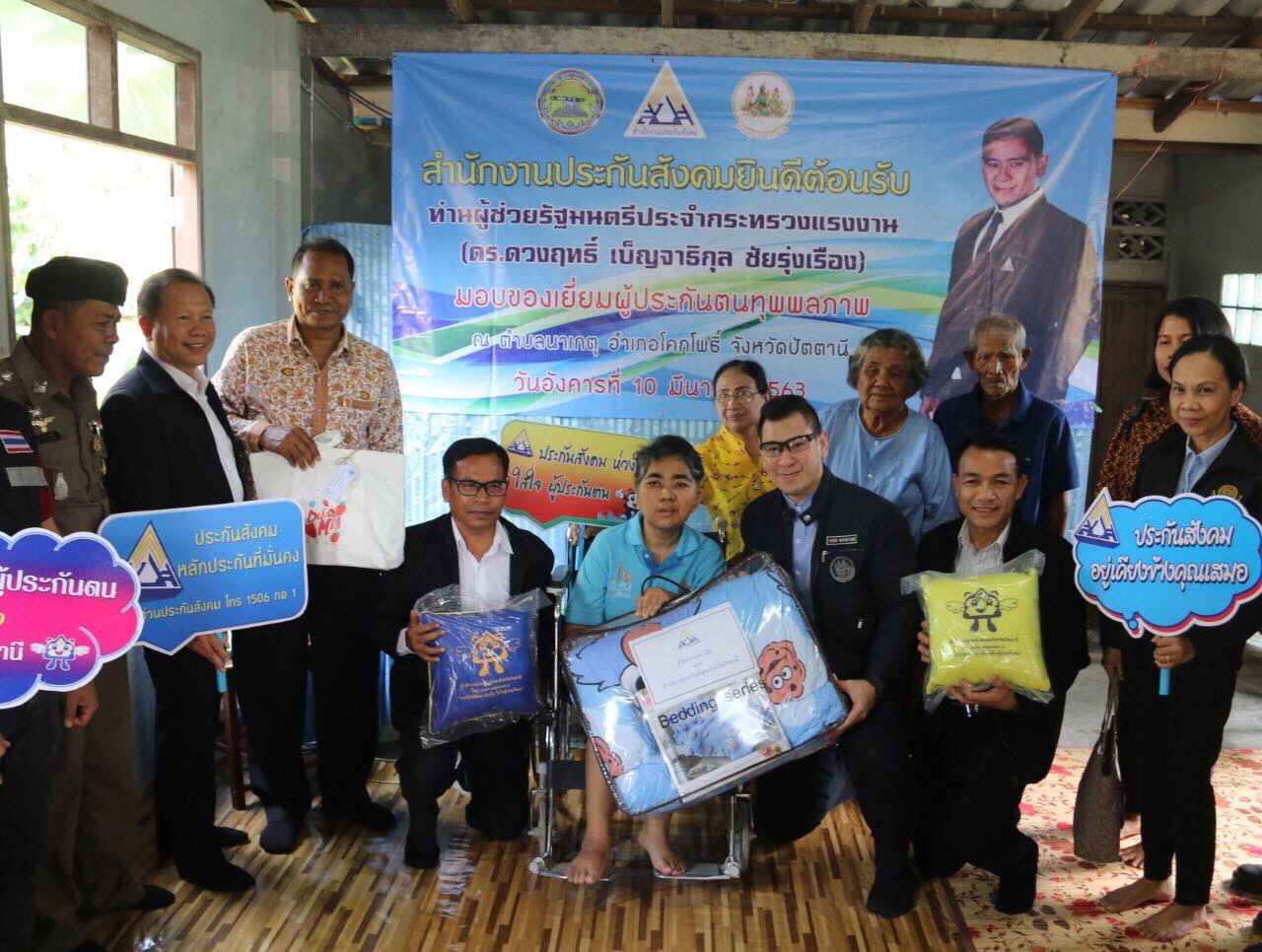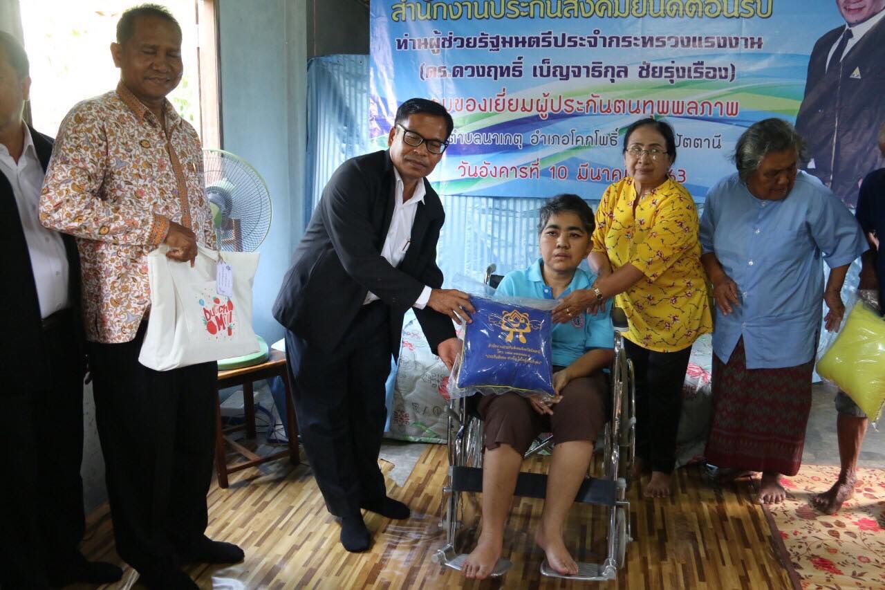 และเวลา 15.30. น. มอบของเยี่ยมผู้ประกันกันตนทุพพลภาพ จำนวน 2 ราย ณ พื้นที่อำเภอโคกโพธิ์ จังหวัดปัตตานี