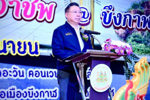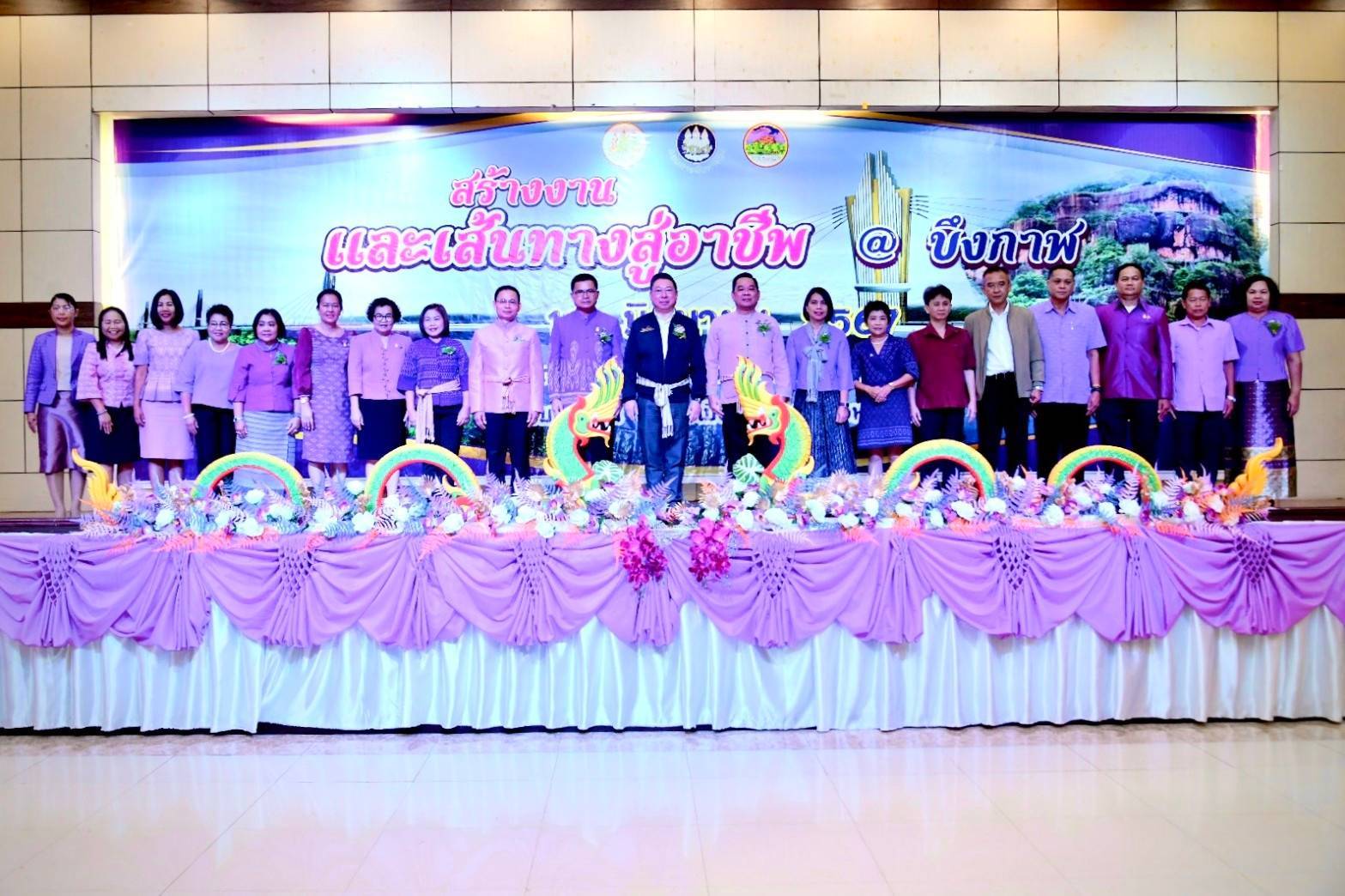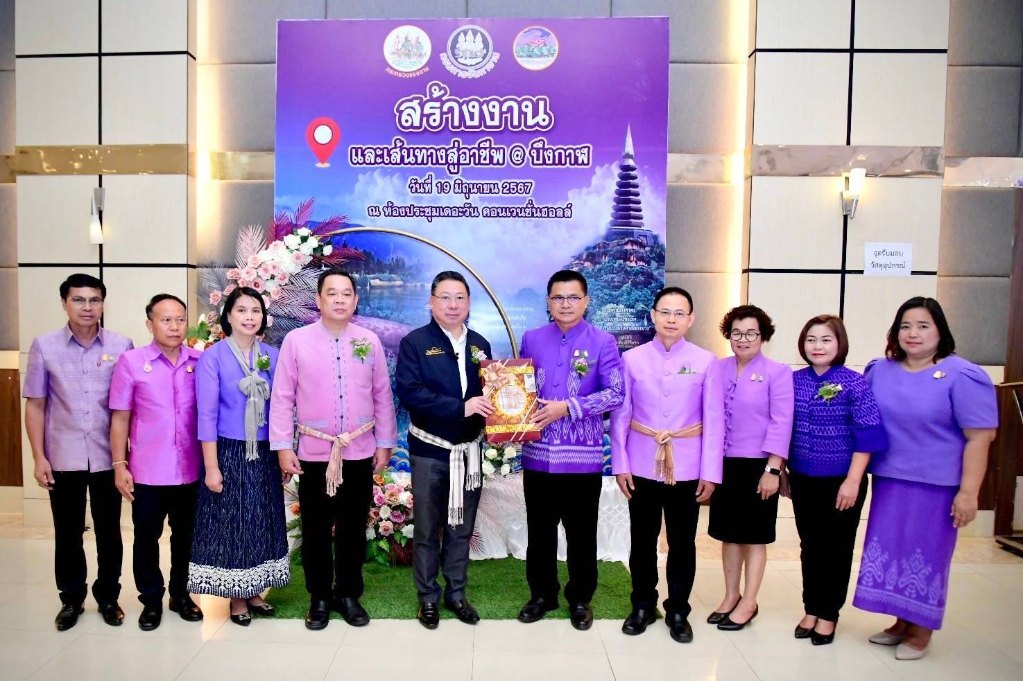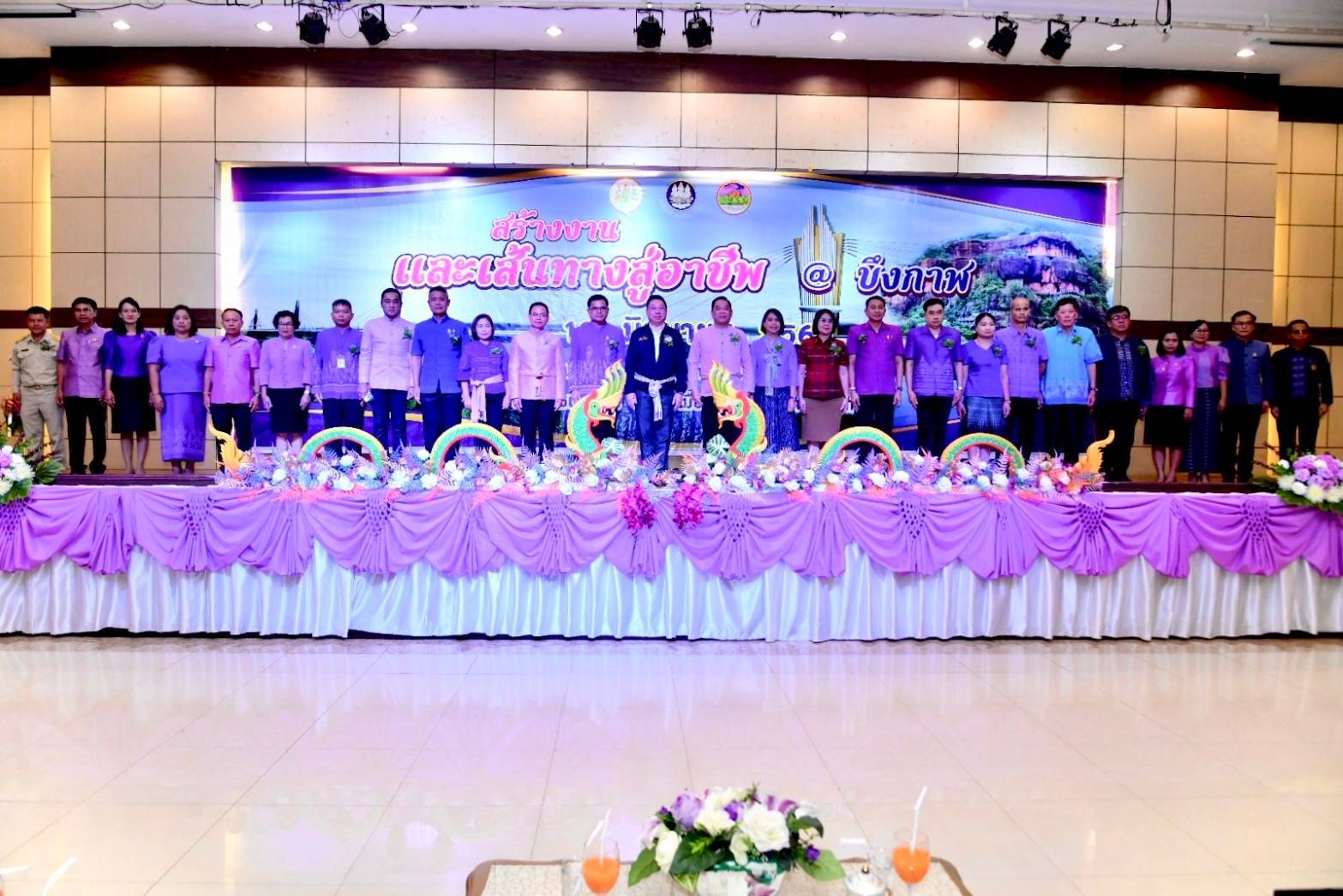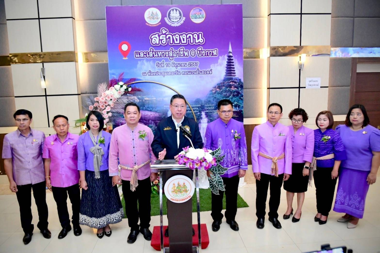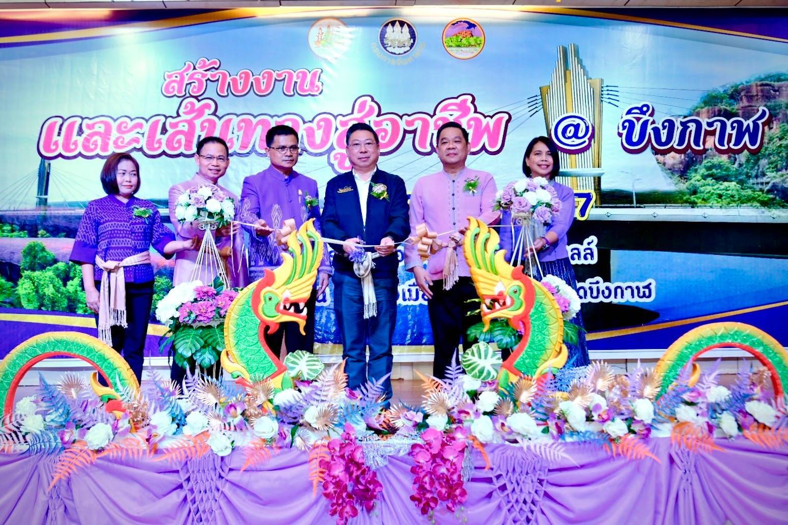 นายธนัสถ์ ทวีเกื้อกูลกิจ ที่ปรึกษารัฐมนตรีว่าการกระทรวงแรงงาน เปิดเผยว่า งาน “สร้างงาน และเส้นทางสู่อาชีพ @บึงกาฬ” ในวันนี้เกิดจากความร่วมมือร่วมใจขับเคลื่อนนโยบายรัฐบาล โดยกระทรวงแรงงาน เพื่อส่งเสริมการมีงานทำให้ประชาชนทุกกลุ่มเป้าหมาย มีอาชีพ มีงานทำ มีรายได้ สร้างโอกาสให้คนหางานและนายจ้าง/สถานประกอบการที่มารับสมัครงาน ได้พบและคัดเลือกกันโดยตรง พร้อมเปิดโลกอาชีพ เพื่อเตรียมความพร้อมให้แก่นักเรียน นักศึกษา ได้เรียนรู้อาชีพ และทักษะที่ใช้เทคโนโลยีดิจิทัล รวมถึงการประกอบอาชีพยุคใหม่ ซึ่งเป็นประโยชน์ต่อประชาชนทุกกลุ่ม นอกจากนี้กระทรวงแรงงาน ร่วมกับกระทรวงพาณิชย์ ยังจัดโครงการธงฟ้าราคาประหยัด นำสินค้าราคาต่ำกว่าท้องตลาด ให้บริการพี่น้องแรงงาน โดยมีการจำหน่ายสินค้าอุปโภคบริโภคกว่า 100 รายการ ลดสูงสุด 55% โดยเฉพาะสินค้าที่จำเป็นต่อการครองชีพ เช่น บะหมี่กึ่งสำเร็จรูป ข้าวสาร ไข่ไก่ น้ำตาลทราย น้ำมันพืช รวมทั้งผลไม้ตามฤดูกาล