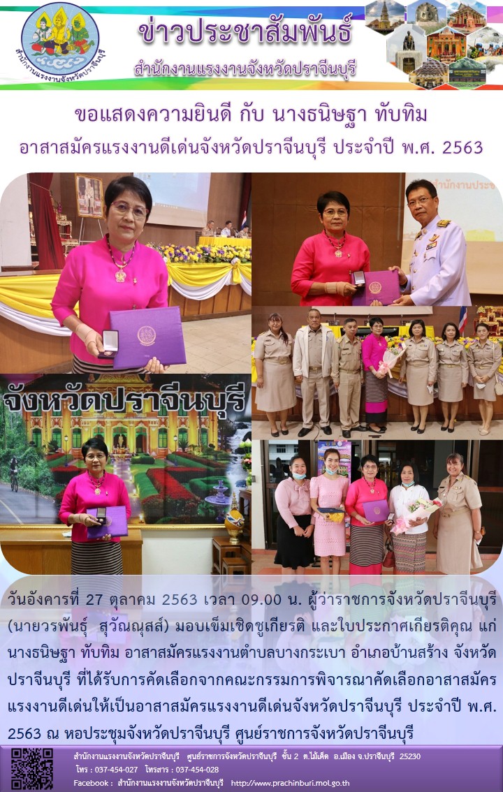แรงานจังหวัดปราจีนบุรี (นางชลอศรี บุญแก้วสุข) ประชาสัมพันธ์ให้ทราบโดยทั่วกันว่า สืบเนื่องจากกระทรวงแรงงานได้ดำเนินงานตามนโยบายของรัฐบาลในการขจัดปัญหาความยากจนด้านการส่งเสริมอาชีพและการมีงานทำในประชากรวัยแรงงานทั้งในภาคอุตสาหกรรม และภาคเกษตรกรรม ดังนั้น เพื่อให้เกิดผลเป็นรูปธรรมในการแปลงนโยบายให้เกิดผลในระดับการปฏิบัติ ย่อมต้องมีเครือข่ายที่สามารถกระจายบริการ และสิทธิประโยชน์ ลงสู่ประชาชนในแนวกว้าง กระทรวงแรงงานจึงจัดตั้ง “อาสาสมัครแรงงาน” เพื่อสร้างเครือข่ายในรูปแบบของงาน “อาสาสมัคร” นับว่าเป็นการเปิดโอกาสให้ประชาชนเข้ามามีส่วนร่วมในการดำเนินงานของกระทรวงแรงงานมากขึ้น ซึ่งตามระเบียบกระทรวงแรงงานว่าด้วย อาสาสมัครแรงงาน พ.ศ. 2548 ประกาศ ณ วันที่ 2 ธันวาคม 2548 กำหนดให้อาสาสมัครแรงงาน มีบทบาทในฐานะเป็นสื่อกลาง และผู้ประสานงานข้อมูลข่าวสารด้านแรงงาน ระหว่างประชาชนในพื้นที่ กับกระทรวงแรงงาน และเพื่อเป็นการสร้างขวัญ และกำลังใจ ระเบียบกำหนดให้อาสาสมัครแรงงานมีสิทธิประโยชน์ ที่ควรจะได้รับอันเนื่องมาจากการปฏิบัติหน้าที่ 2 กรณี คือ 1. อาจได้รับค่าใช้จ่ายที่จำเป็นในการปฏิบัติหน้าที่ และสิทธิประโยชน์อย่างอื่นตามที่ปลัดกระทรวงแรงานกำหนด 2. อาสาสมัครแรงงานที่ปฏิบัติงานดีเด่นอย่างต่อเนื่อง และเสมอให้ปลัดกระทรวงแรงงาน ผู้ว่าราชการจังหวัดคัดเลือกเพื่อเข้ารับโล่ และเข็มประกาศเกียรติคุณอาสาสมัครแรงงานดีเด่น ซึ่งในปีนี้ คณะกรรมการพิจารณาคัดเลือกอาสาสมัครแรงานดีเด่นระดับจังหวัด ซึ่งประกอบด้วย หัวหน้าส่วนราชการในสังกัดกระทรวงแรงงาน ทุกหน่วยได้พิจารณาตามเกณฑ์ที่กระทรวงกำหนด มีมติพิจารณาให้ นางธนิษฐา ทับทิม อาสาสมัครแรงงานตำบลบางกระบา อำเภอบ้านสร้าง ได้รับการคัดเลือกเป็น “อาสาสมัครแรงงานดีเด่นระดับจังหวัดปราจีนบุรี ประจำปี พ.ศ. 2563 “